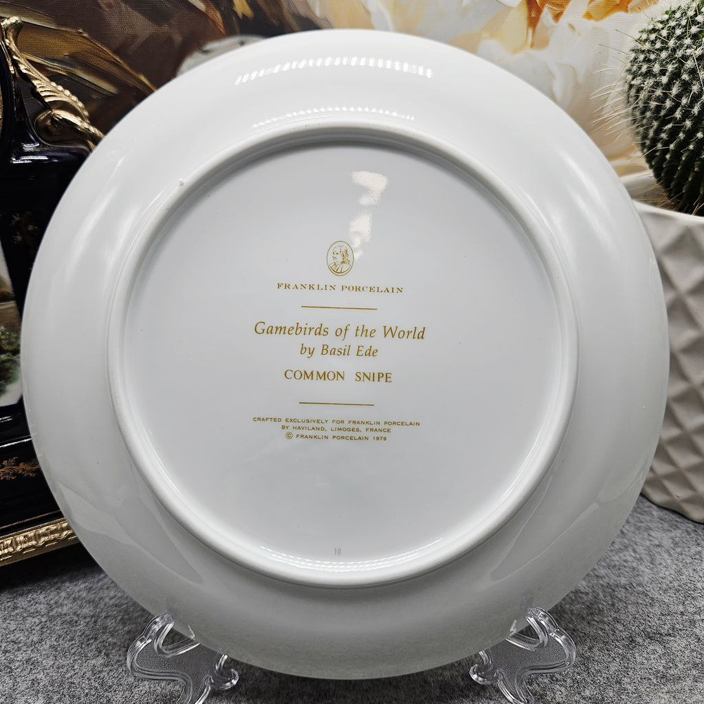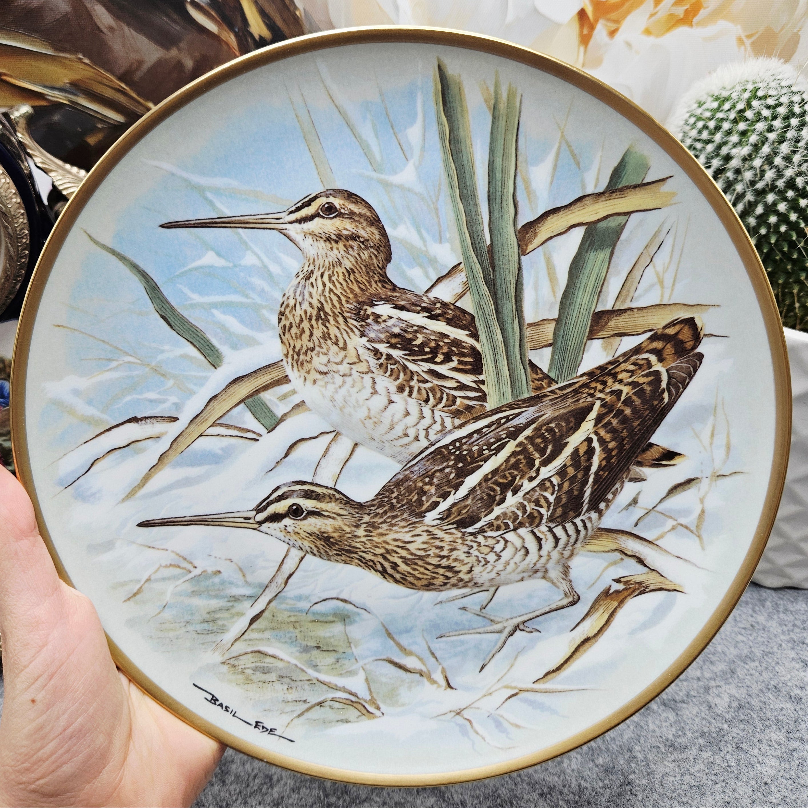 Kolekcinė Franklin Porcelain dekoratyvinė lėkštė iš serijos „Gamebirds of the World“, 1979 m., su garsaus britų gamtos dailininko Basil Ede piešiniu „Common Snipe“ (perkūno oželis). Kompozicija vaizduoja du paukščius žiemos peizaže – subtilios pastelės, tikslios detalės, natūralus sniego, žolių ir plunksnų tekstūriškumas kuria tikro, gyvo gamtos kadro įspūdį.