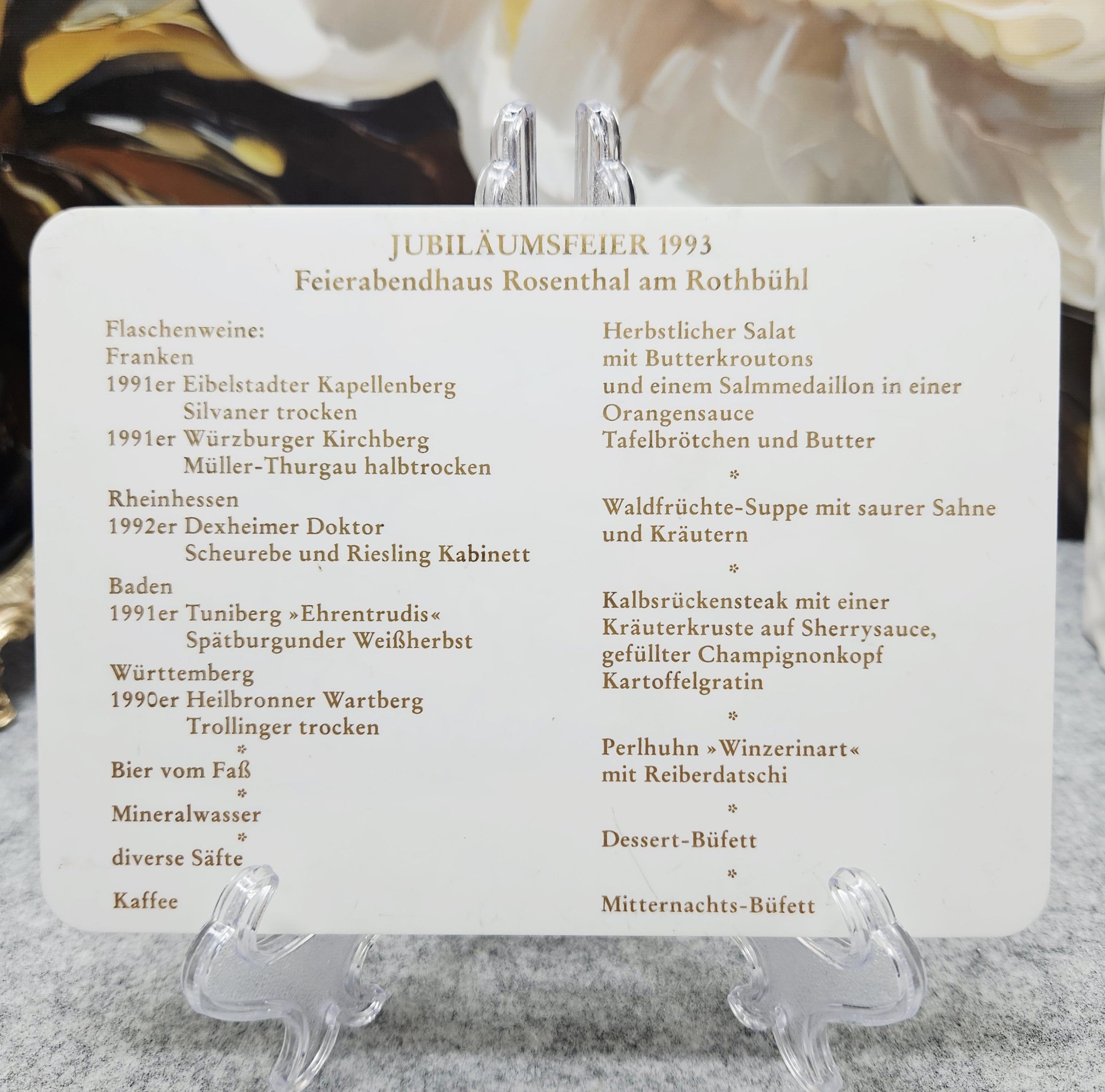 Kitoje atvirutės pusėje yra meniu iš 1993 m. vykusios „Feierabendhaus Rosenthal am Rothbühl“ jubiliejaus šventės. Čia galima rasti tikrų vokiškos virtuvės šedevrų – įvairių vokiškų vynų (Frankeno, Reino hesseno, Badeno, Viurtembergo regionų), salotų su lašiša ar veršienos kepsnį.