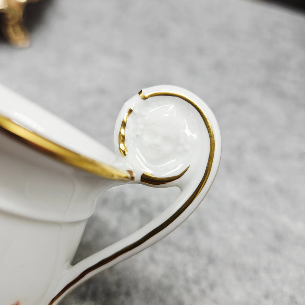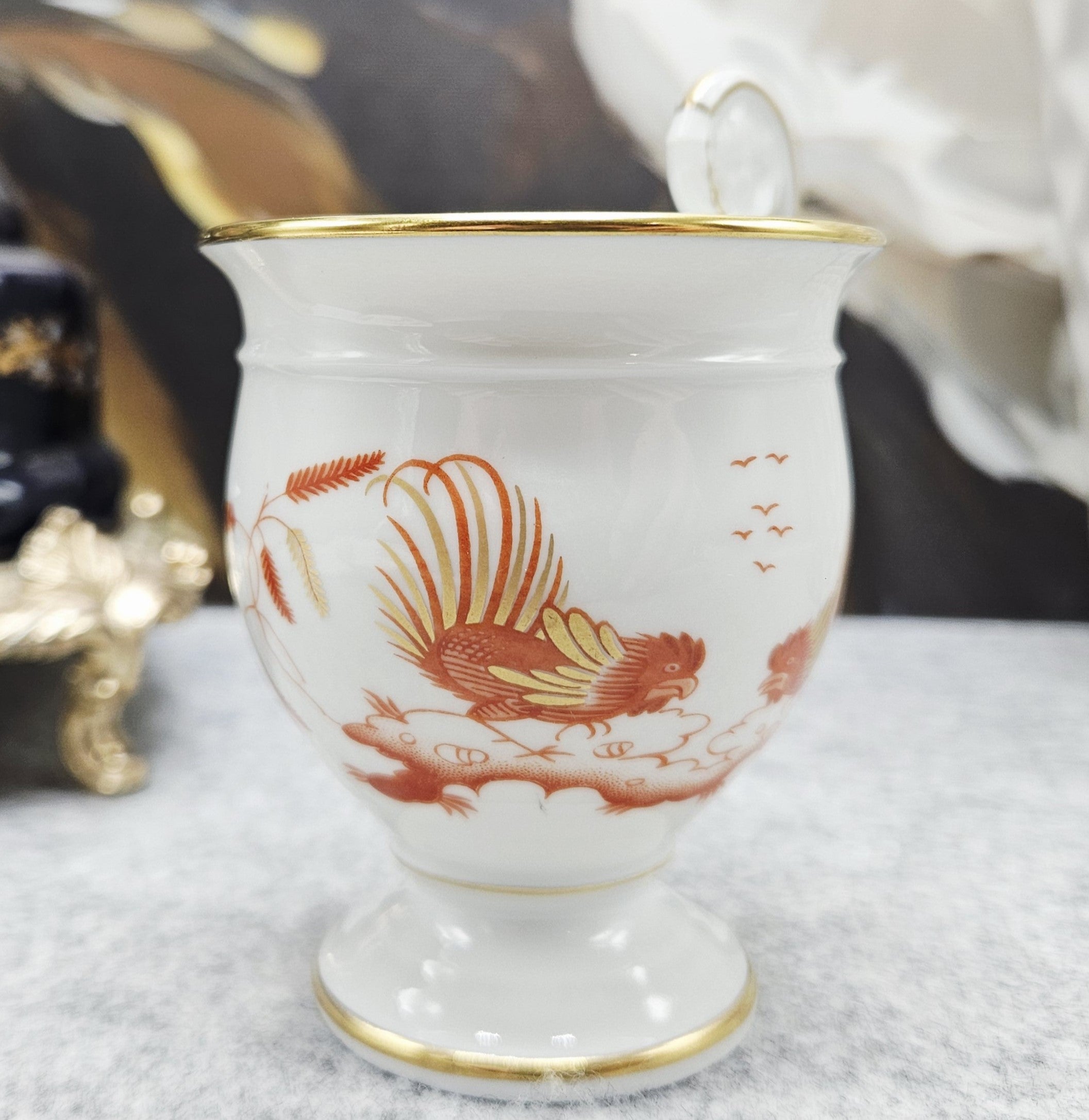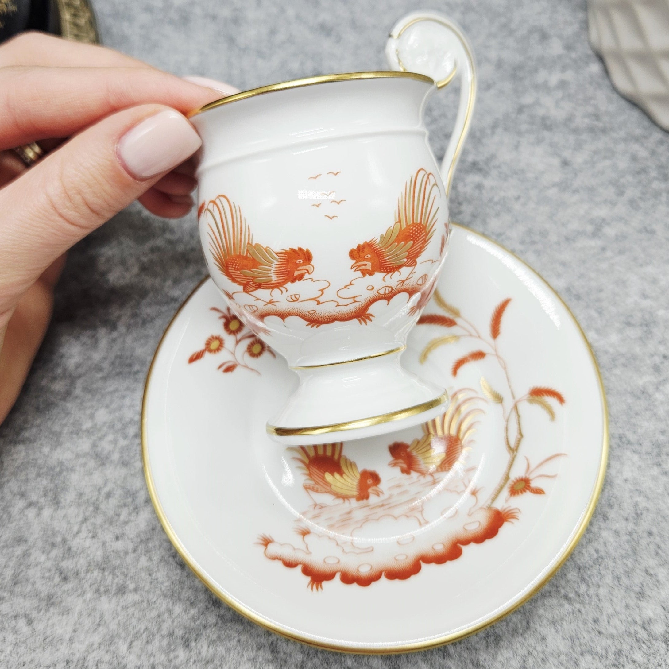 Išskirtinio dizaino "Richard Ginori Italy" porceliano espresso kavos puodelis, dekoruotas gaidžių peštynių scena ir aukso detalėmis. Puodelio akcentas – itin puošni rankenėlė su reljefiniu veido atvaizdu.