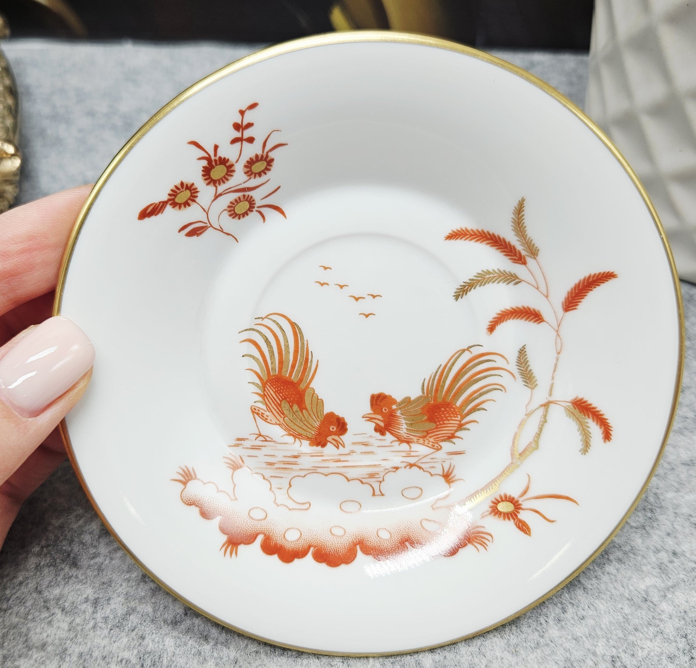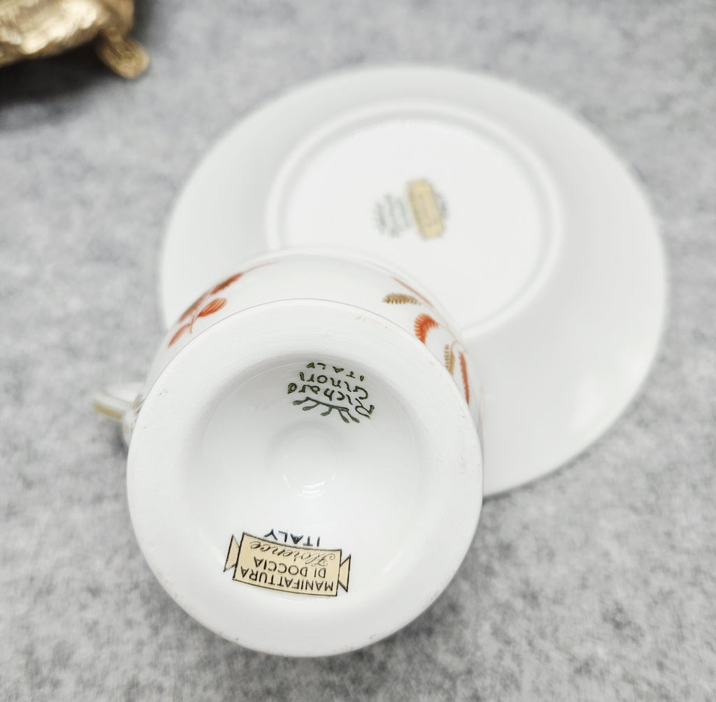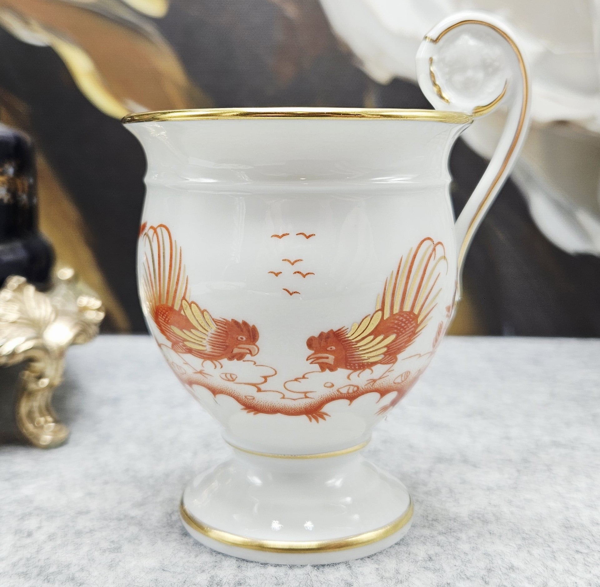 Išskirtinio dizaino "Richard Ginori Italy" porceliano espresso kavos puodelis, dekoruotas gaidžių peštynių scena ir aukso detalėmis. Puodelio akcentas – itin puošni rankenėlė su reljefiniu veido atvaizdu.