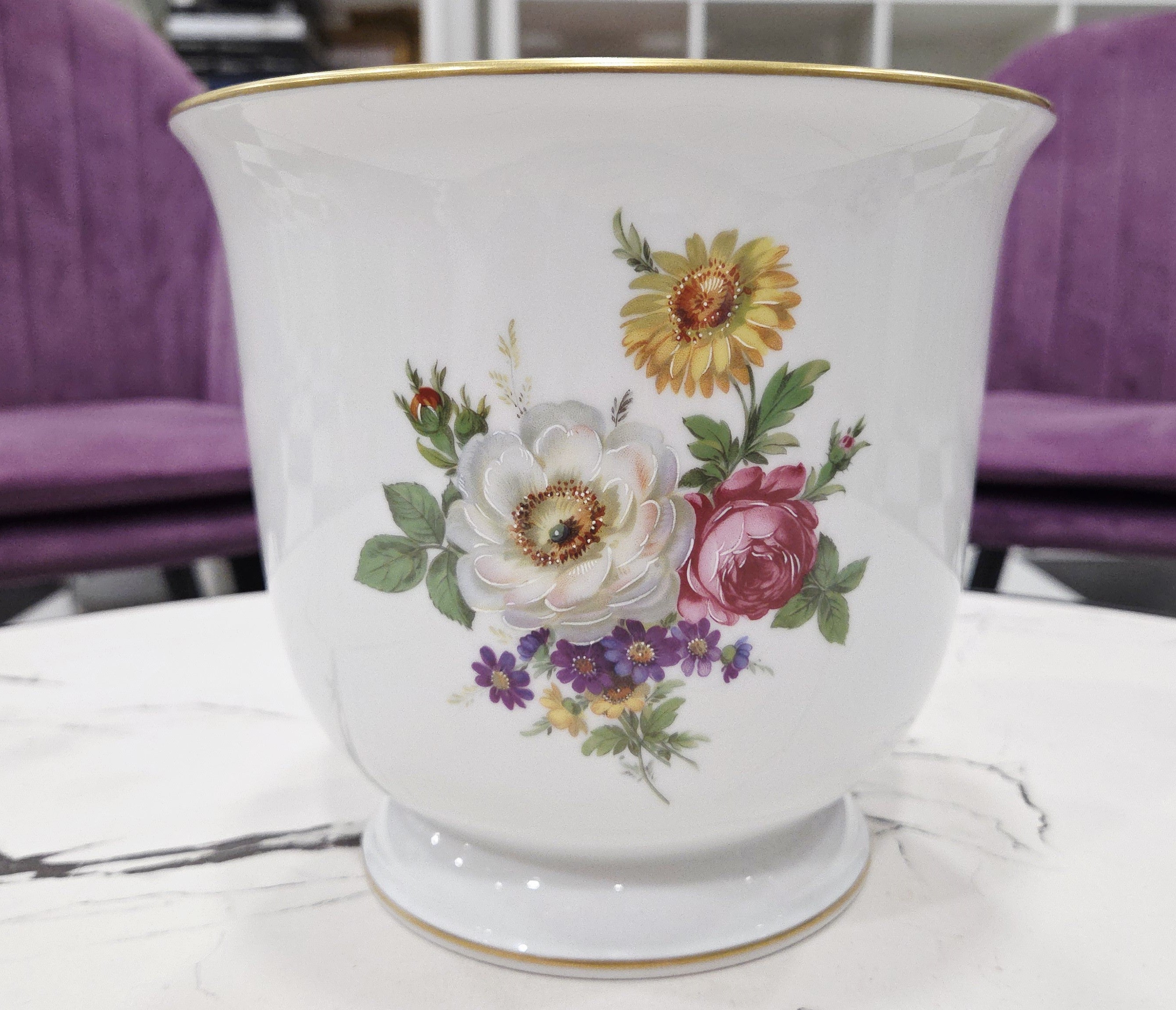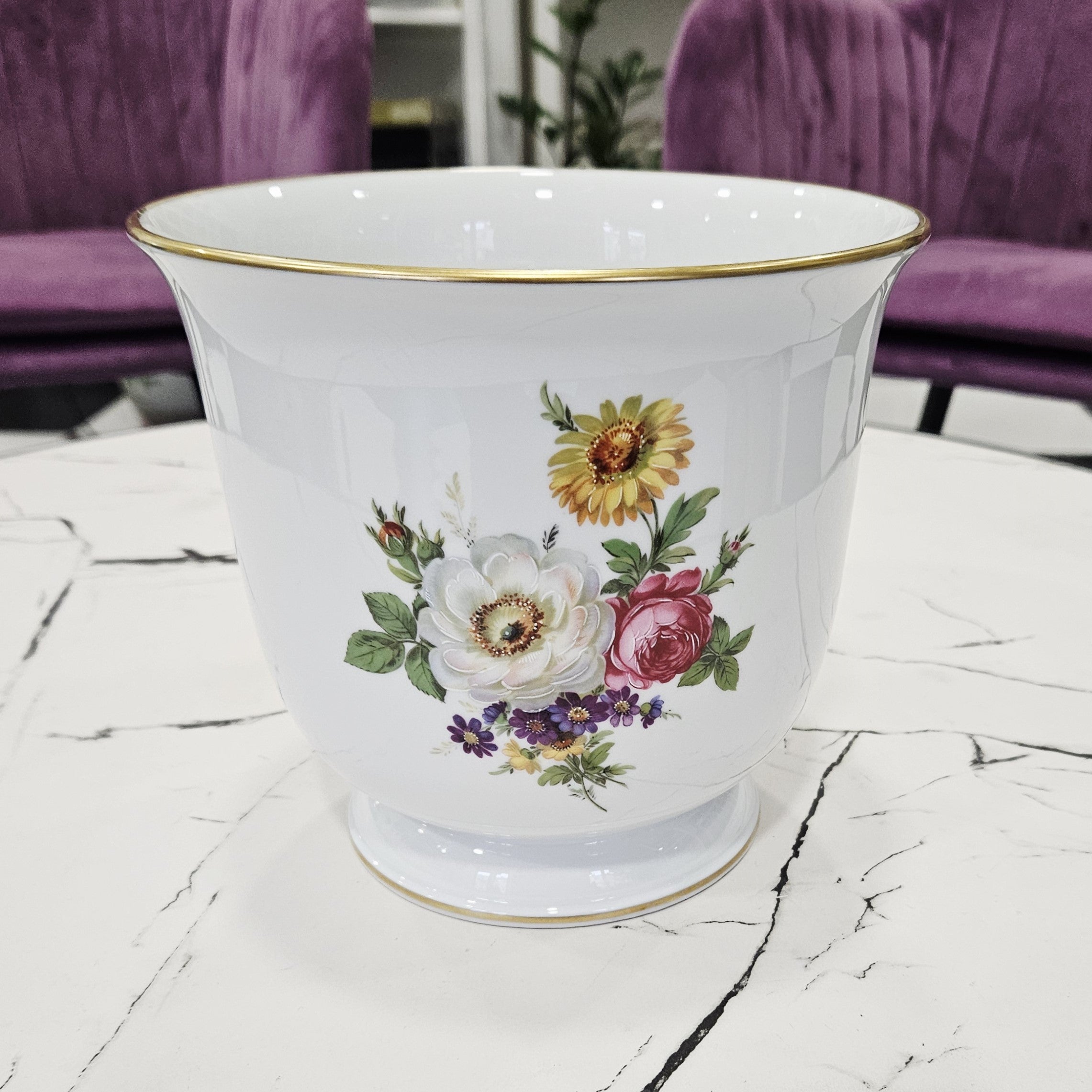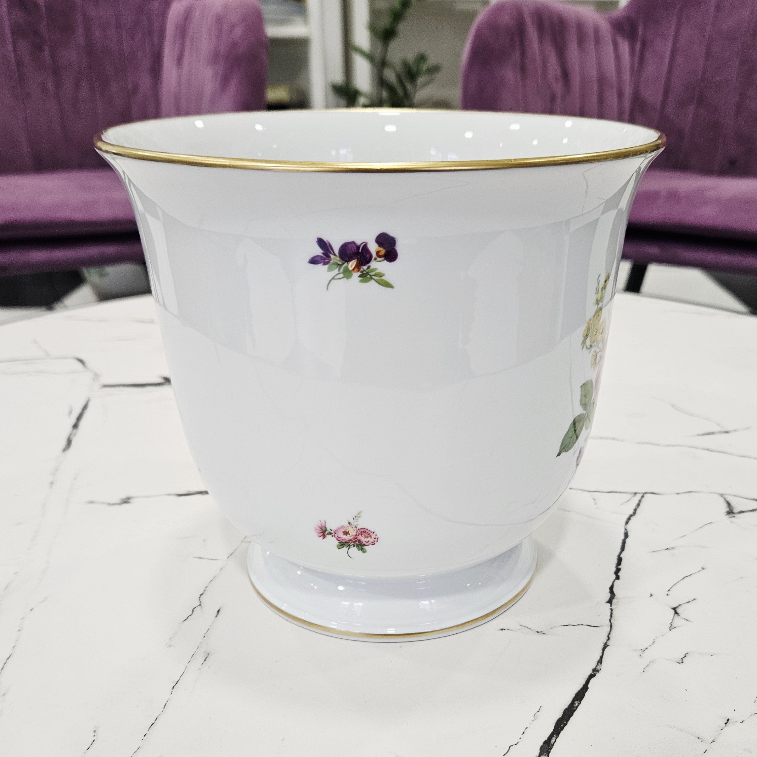 Išskirtinis, didelis „AK Kaiser“ porceliano vazonas iš serijos „Gloria“, dekoruotas sodo gėlių kompozicijomis ir aukso linijomis.