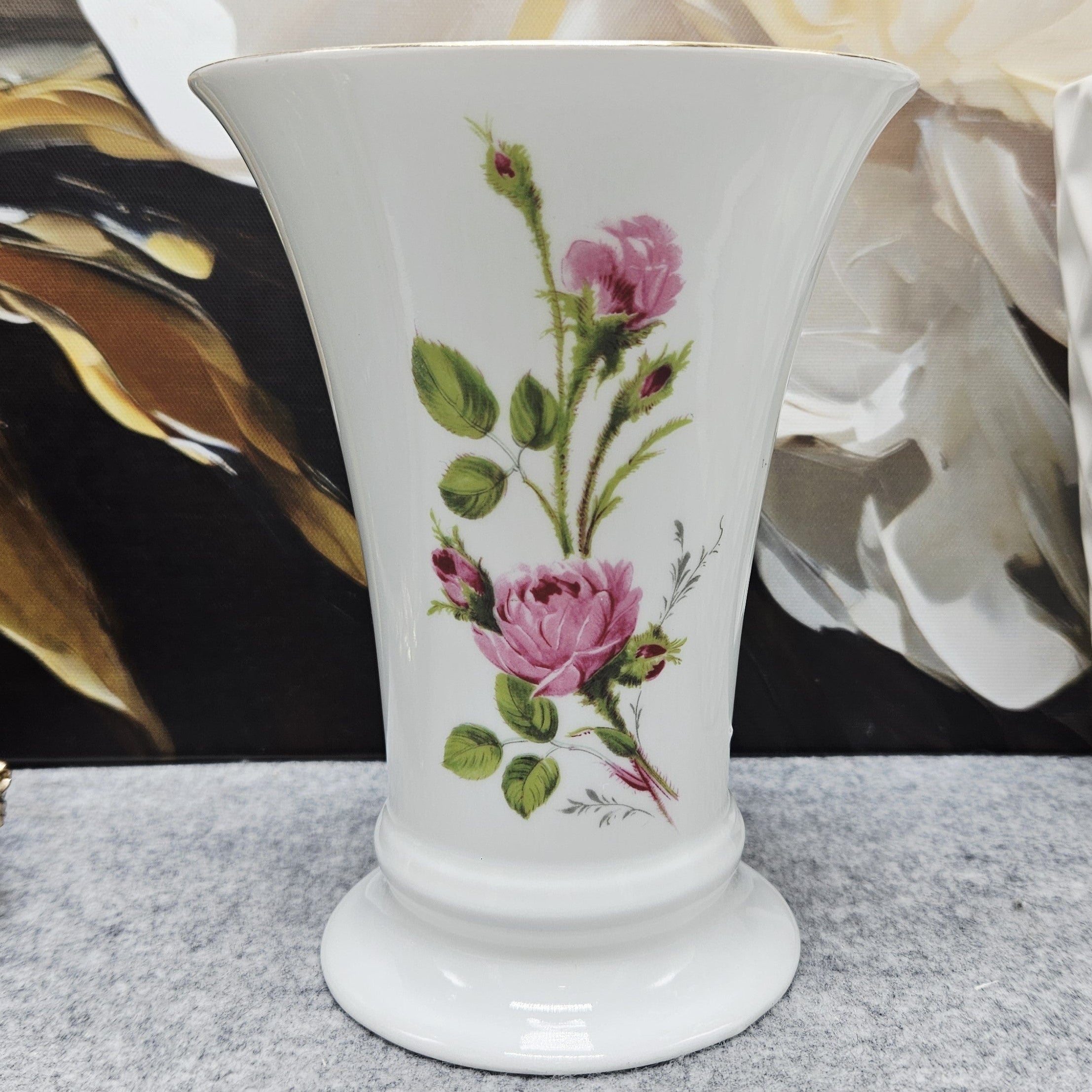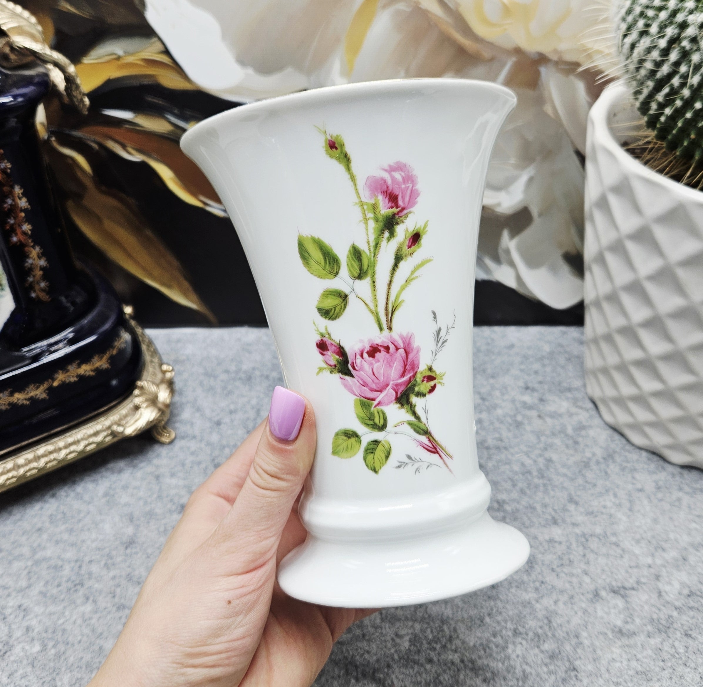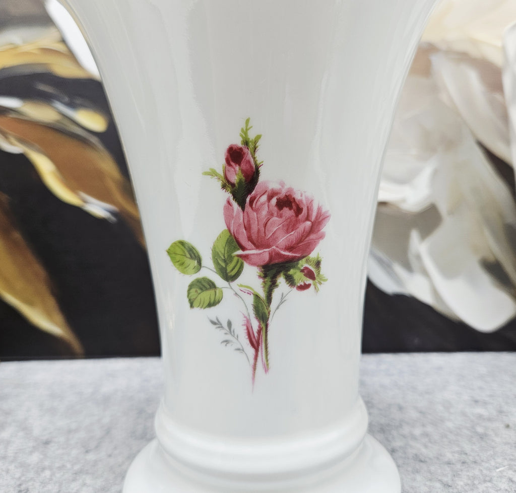 Labai patogios formos, rankų darbo "Royal Porzellan Bavaria KPM" balto porceliano vaza, dekoruota rankomis tapytais rožių žiedais. Švelniai platėjanti forma suteikia jai grakštumo, o ryškiai rožinės gėlės akcentuoja klasikinį, išdirbtą dizainą. Puikiai tinka tiek gėlėms, tiek subtiliai interjero puošybai.