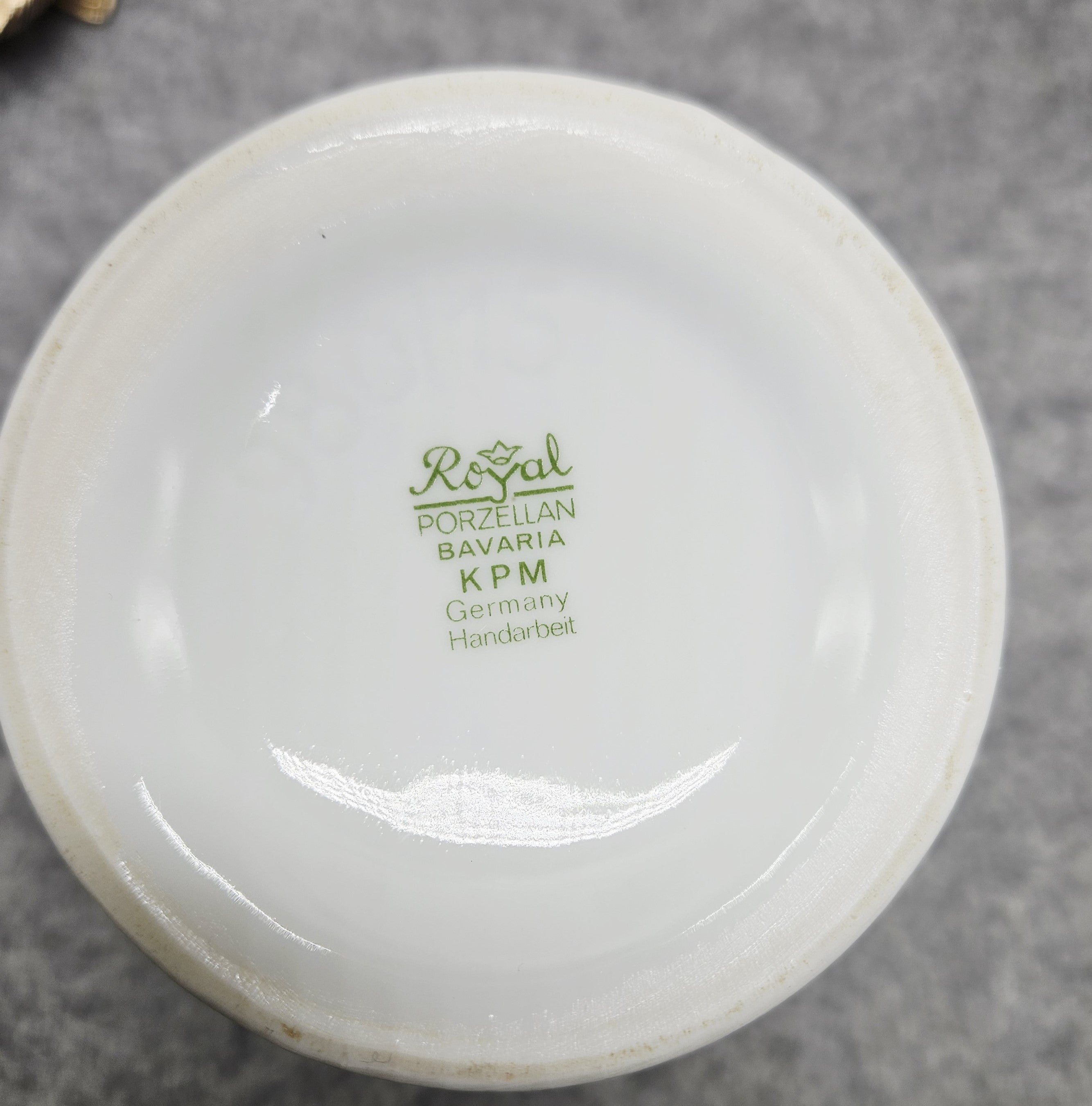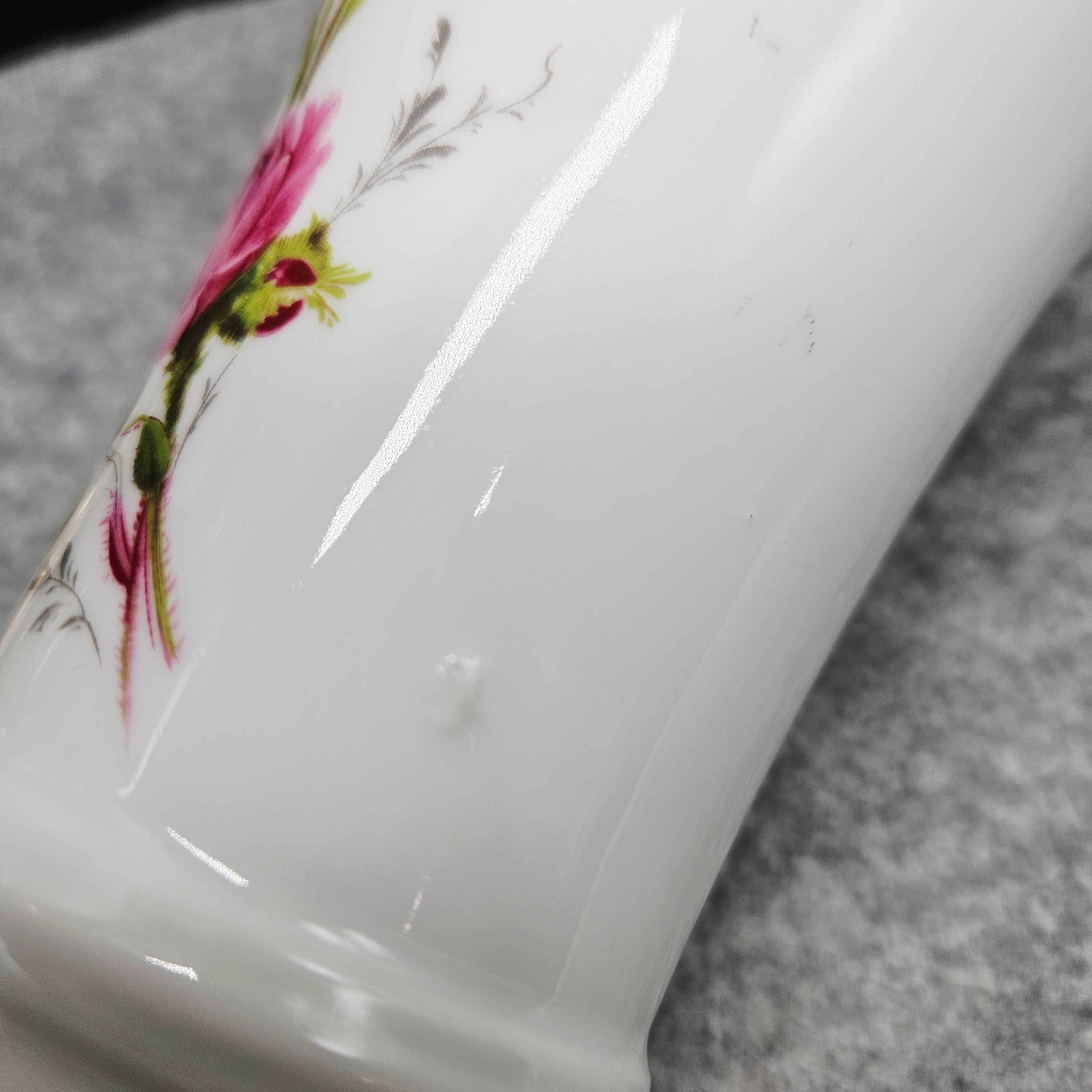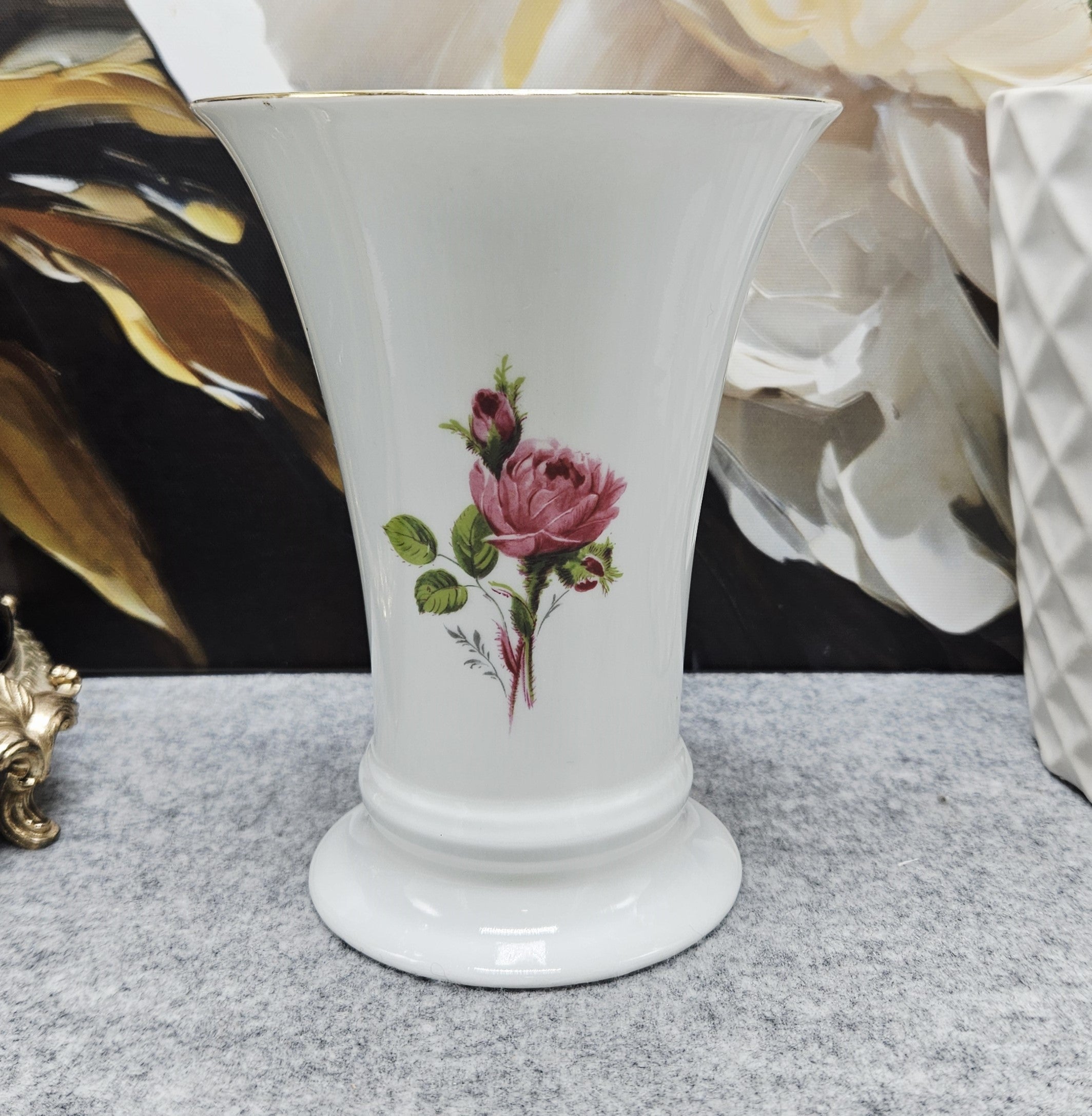 Labai patogios formos, rankų darbo "Royal Porzellan Bavaria KPM" balto porceliano vaza, dekoruota rankomis tapytais rožių žiedais. Švelniai platėjanti forma suteikia jai grakštumo, o ryškiai rožinės gėlės akcentuoja klasikinį, išdirbtą dizainą. Puikiai tinka tiek gėlėms, tiek subtiliai interjero puošybai.