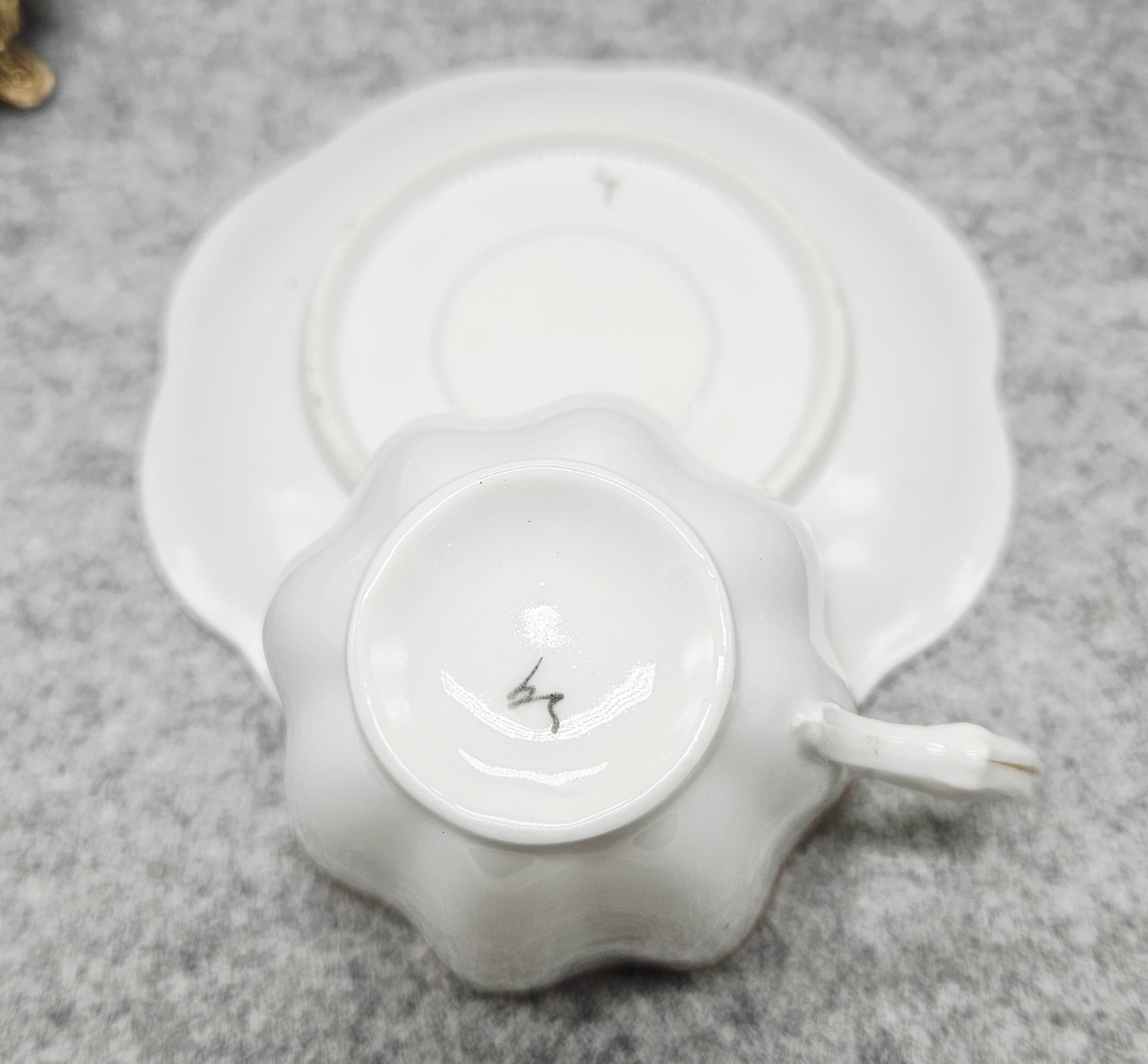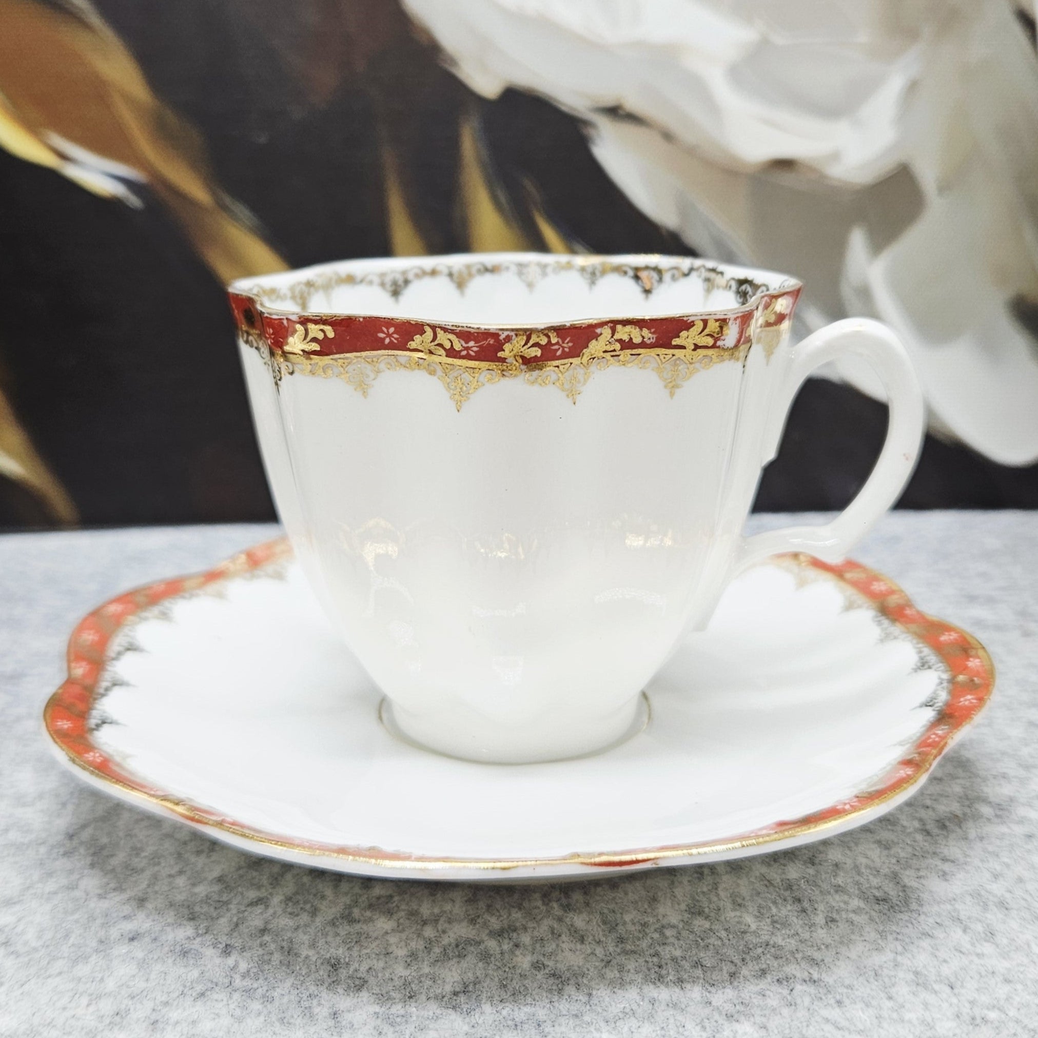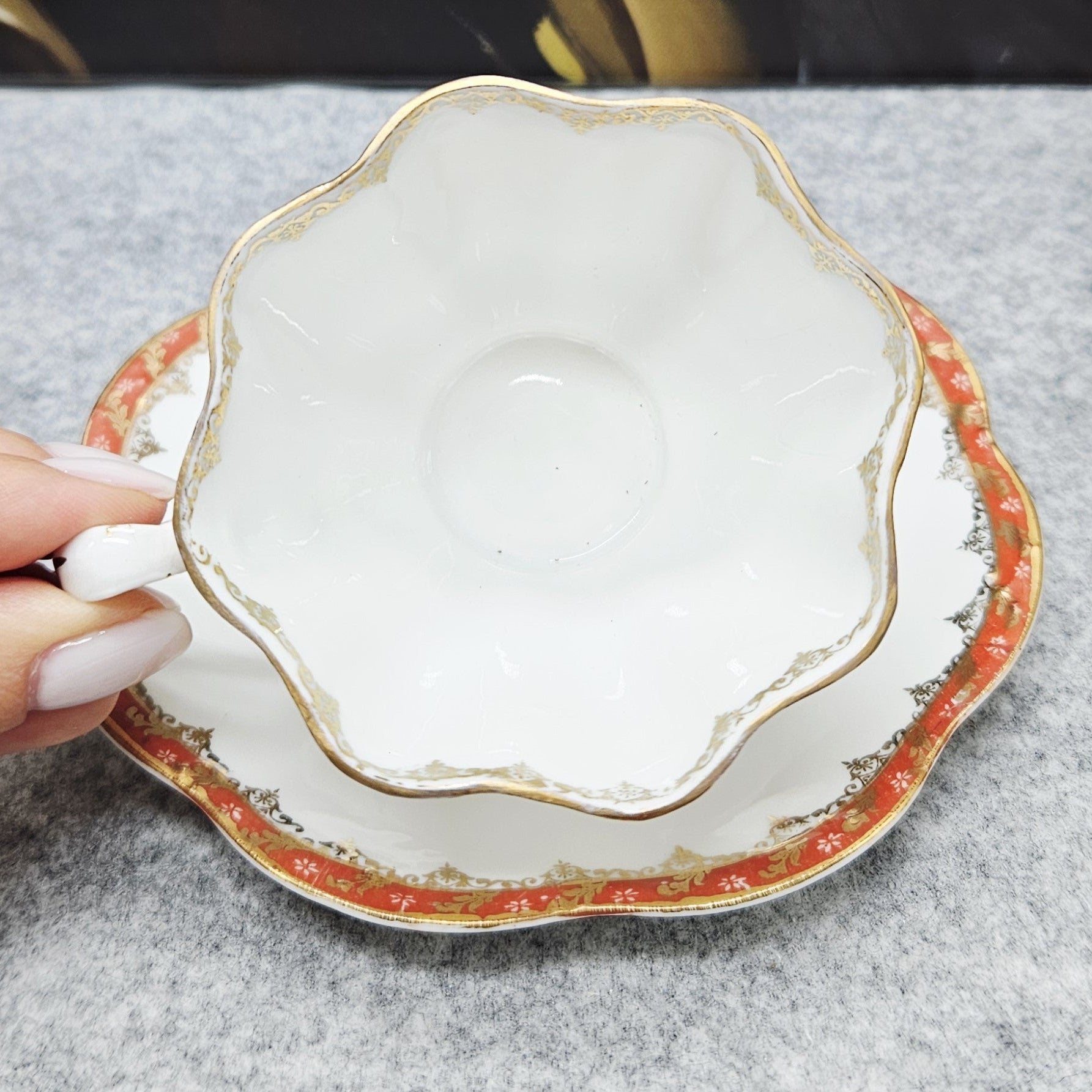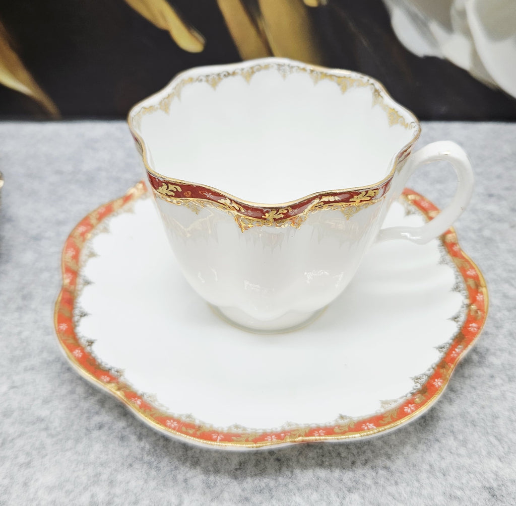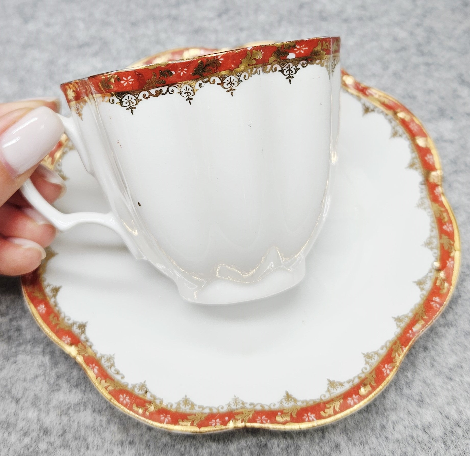 Elegantiškas antikvarinis porceliano kavos puodelis su lėkštute, dekoruotas sodria oranžinės spalvos juosta, subtiliais auksiniais ornamentais. Banguotos formos kraštai pabrėžti auksu, suteikiantys išskirtinį rafinuotumą. Komplektas pasižymi itin grakščia forma bei puošniu, klasikiniu dekoro stiliumi.