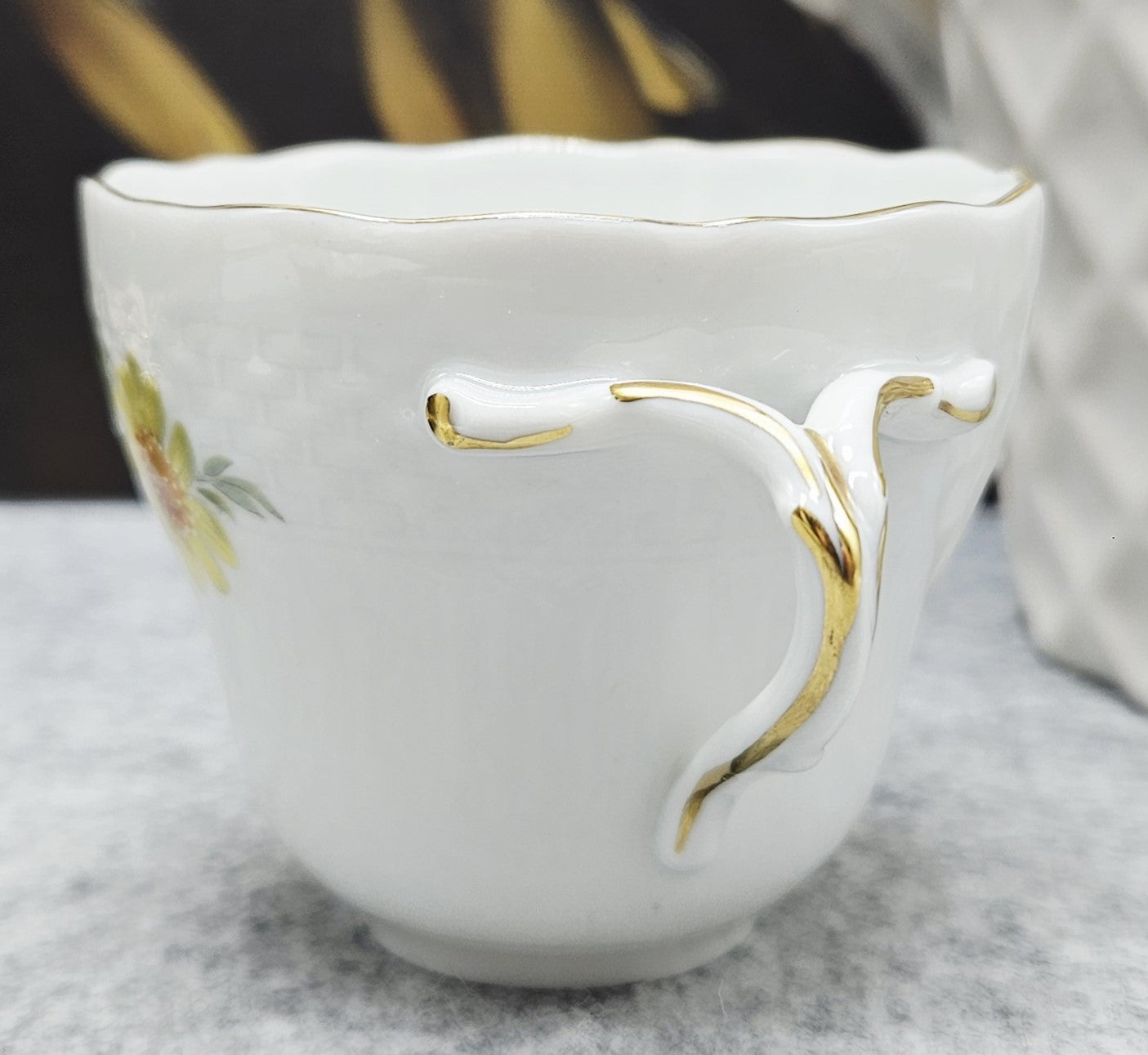 Ant šio puodelio matyti ryški rožė, geltonasis saulutės žiedas ir smulkūs violetiniai žiedeliai, suteikiantys jam romantiško bei klasikinio žavesio. Paviršiuje iškilus lengvas reljefas, o bangotu krašteliu einantis auksavimas suteikia papildomos prabangos.