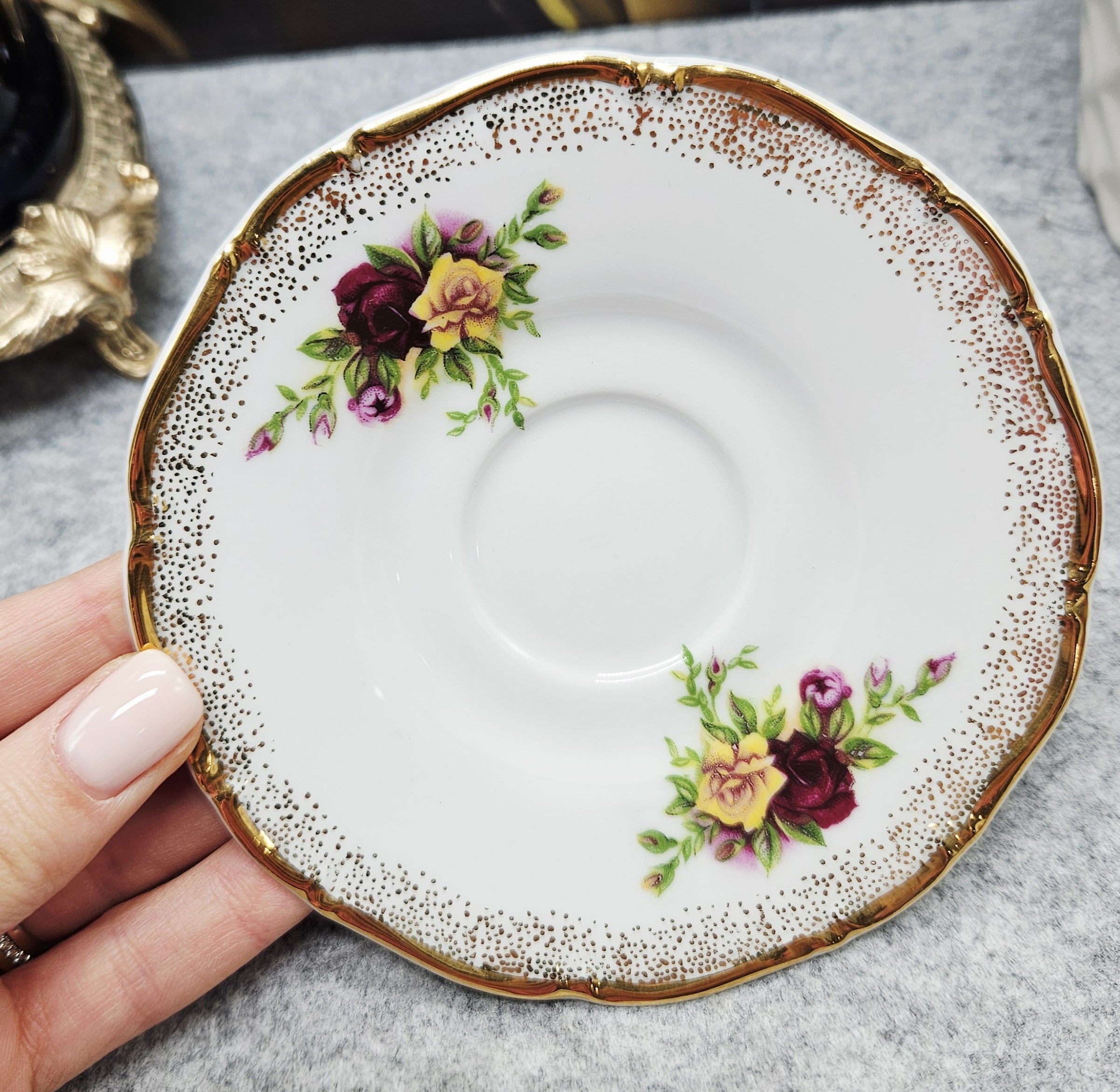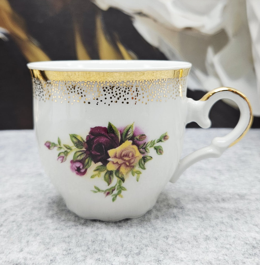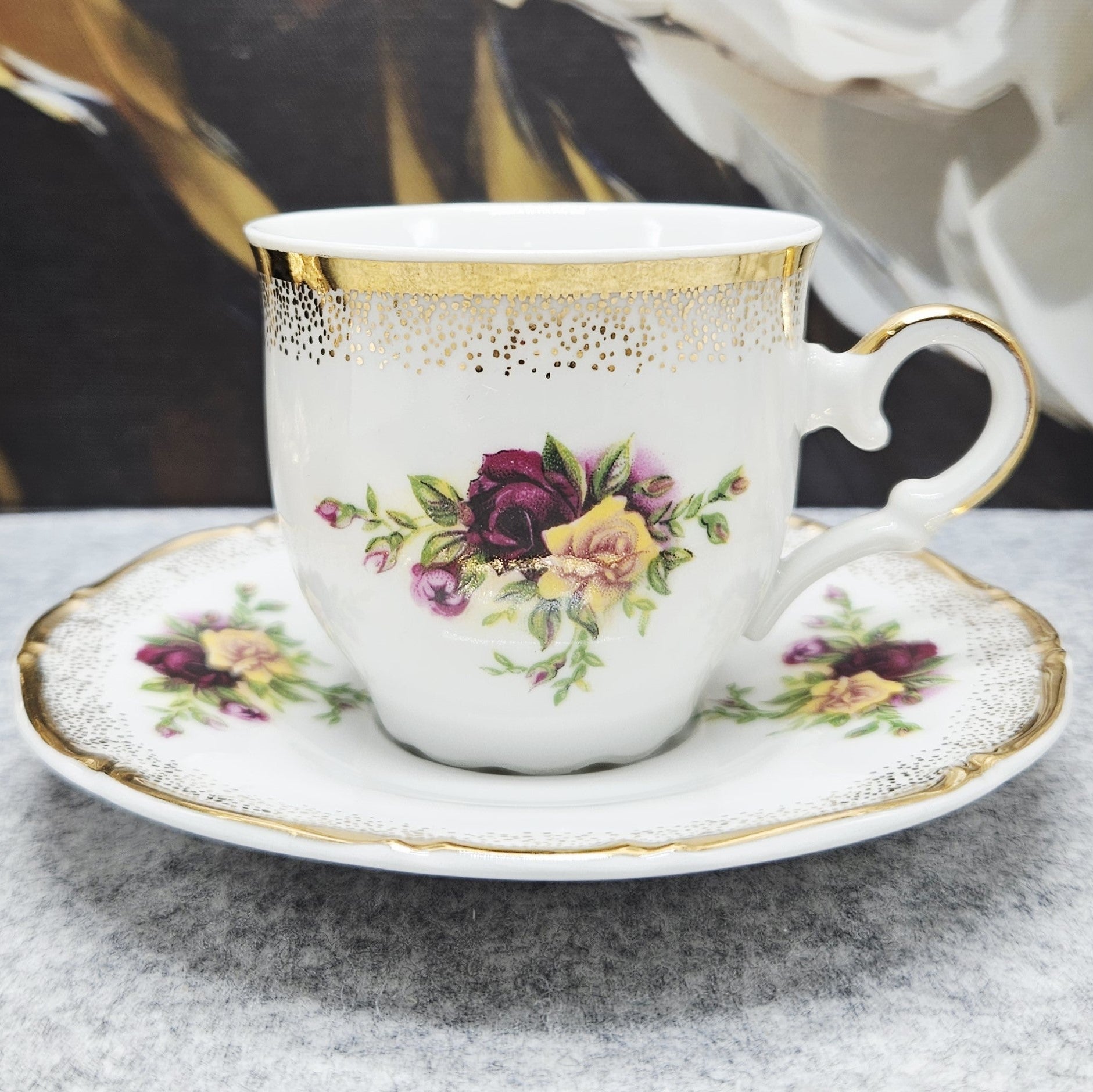 Šis elegantiškas porceliano puodelio ir lėkštutės rinkinys dvelkia klasikiniu romantišku stiliumi. Rinkinio dizainą puošia ryškios rožių puokštelės, derinančios sodrią burgundišką, rausvą ir gelsvą spalvas. Tiek puodelio, tiek lėkštutės kraštai dekoruoti auksuotu, taškuotu ornamentu, kuris pereina į subtiliai reljefuotą formą – tai suteikia rinkiniui prabangos ir švelnaus rafinuotumo.