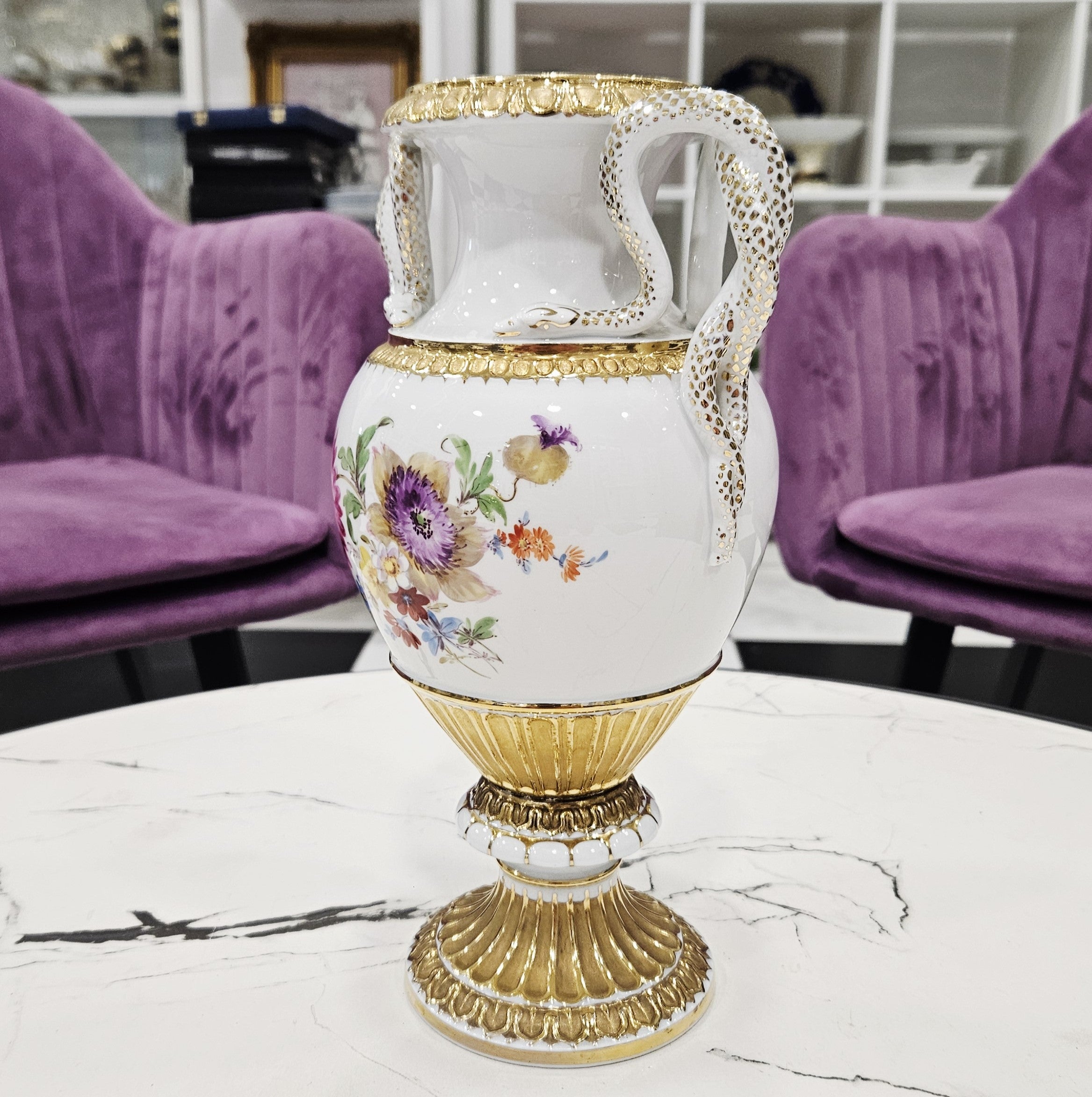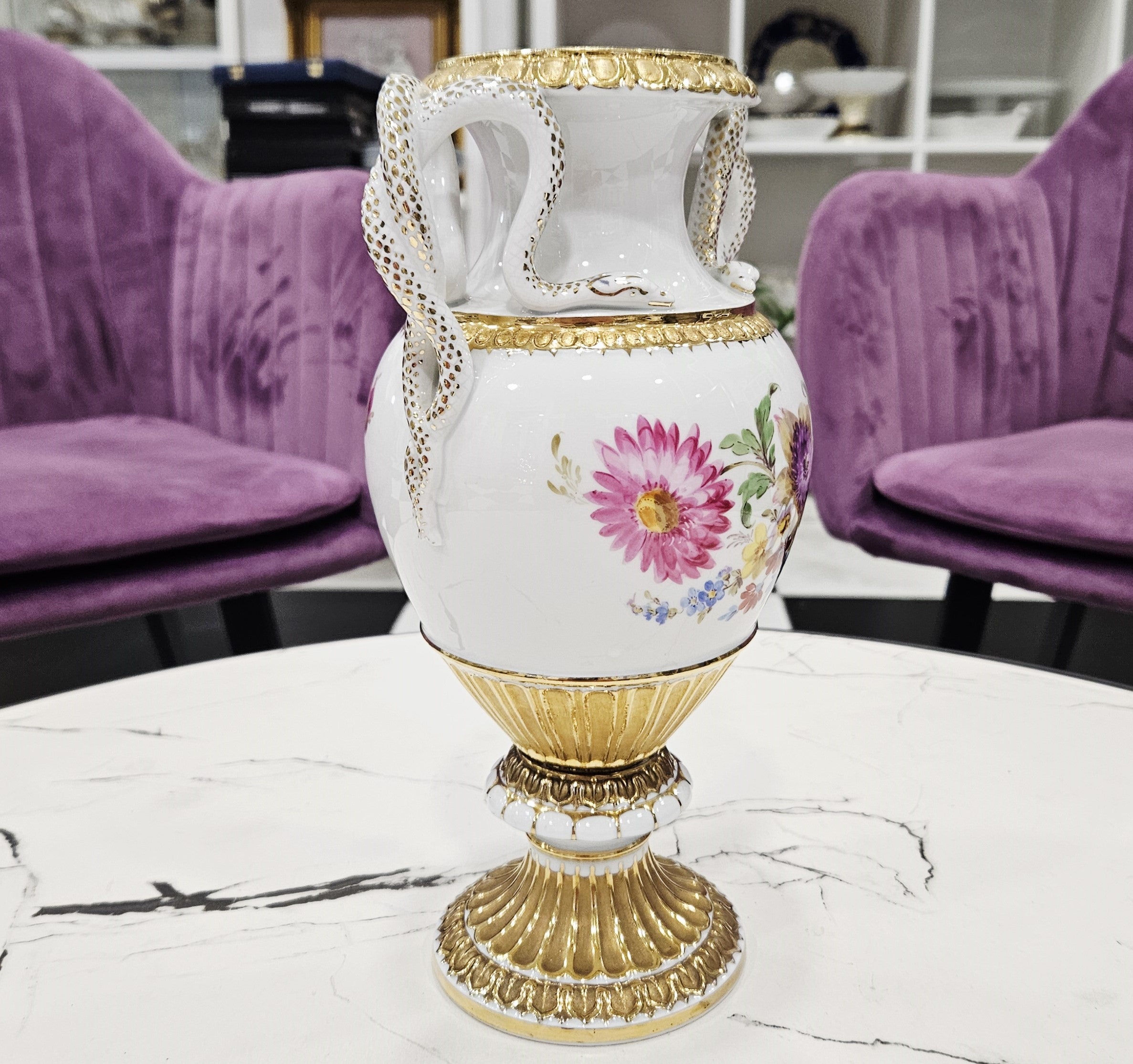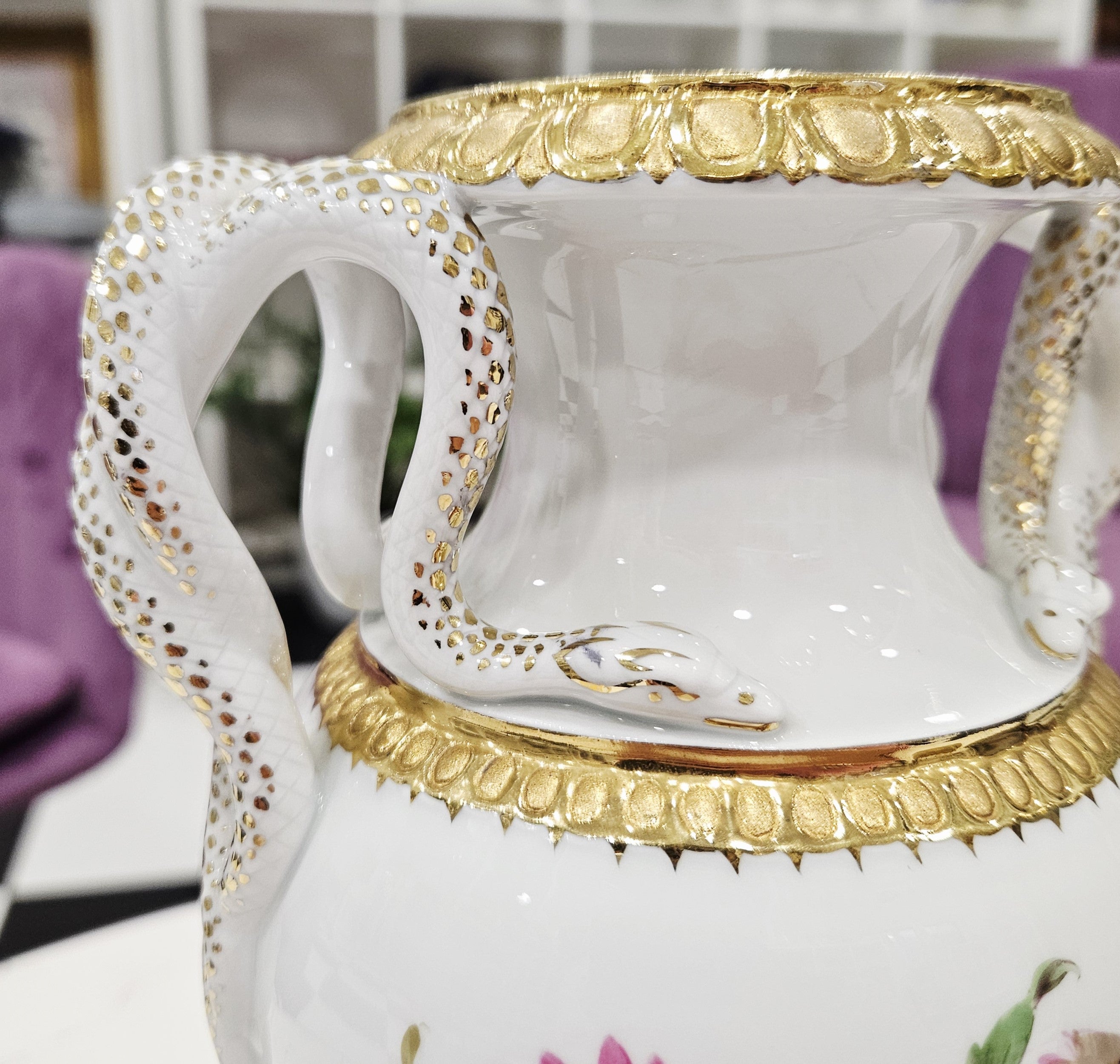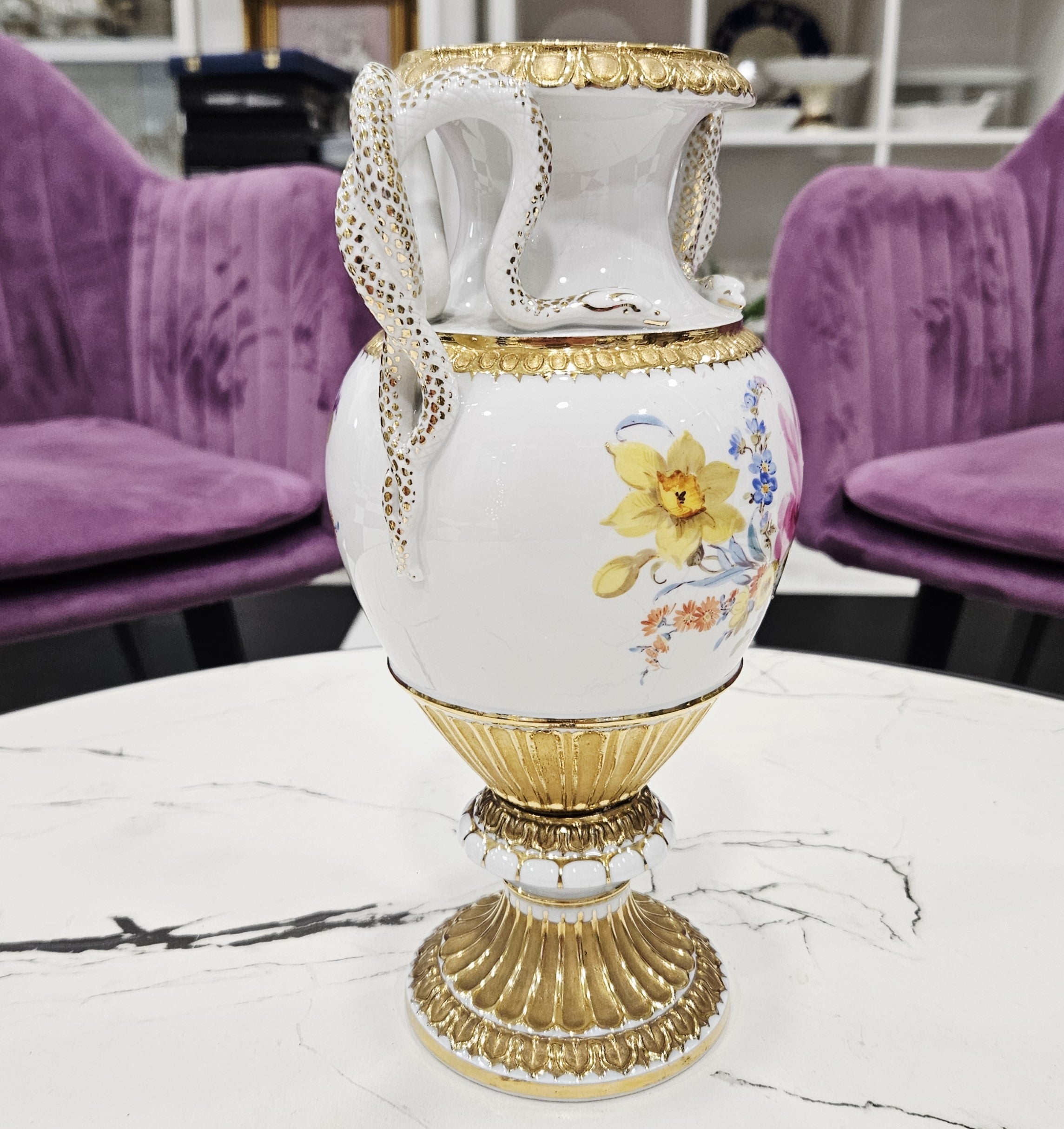 Ypatingą dėmesį traukia įmantrios gyvačių formos rankenos, simbolizuojančios išmintį ir amžinybę. Jos dekoruotos subtiliu tinklelio raštu ir aukso detalėmis, pabrėžiančiomis formos dinamiką. Vazą puošia rankomis tapytas gėlių ansamblis, sukuriantis harmoningą spalvų simfoniją baltame porceliano fone.