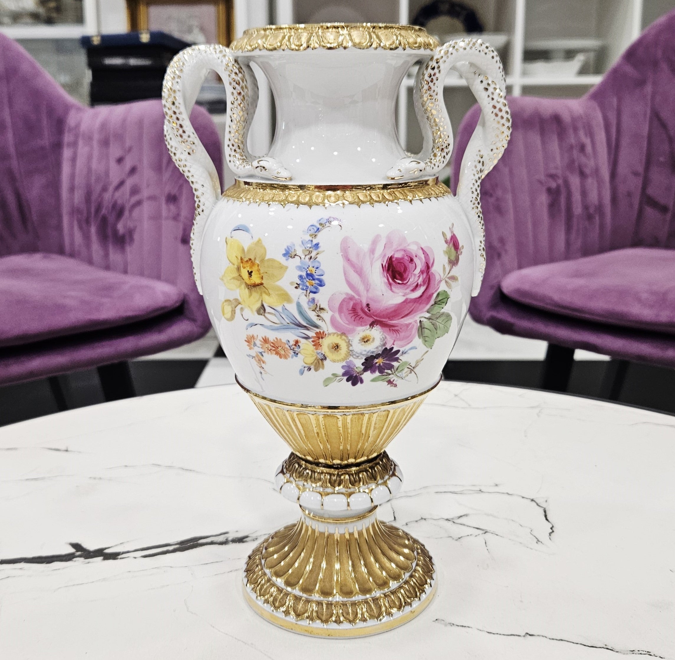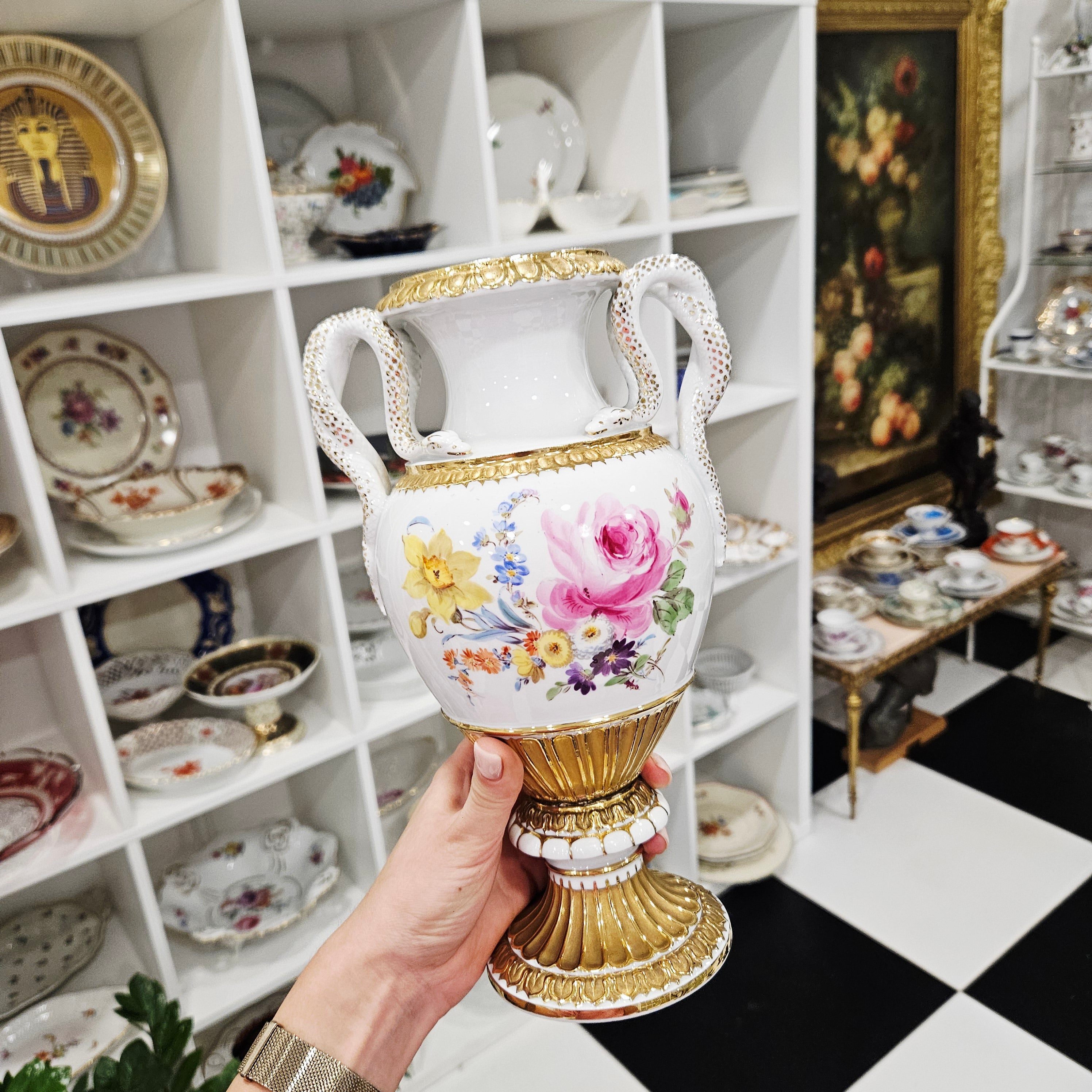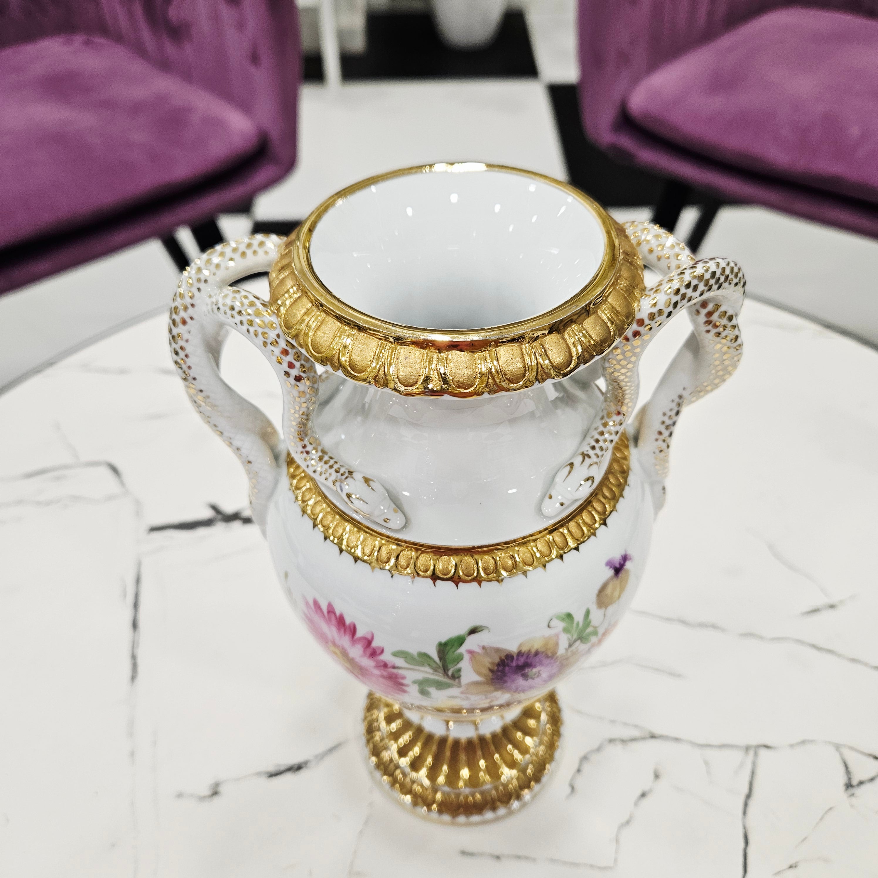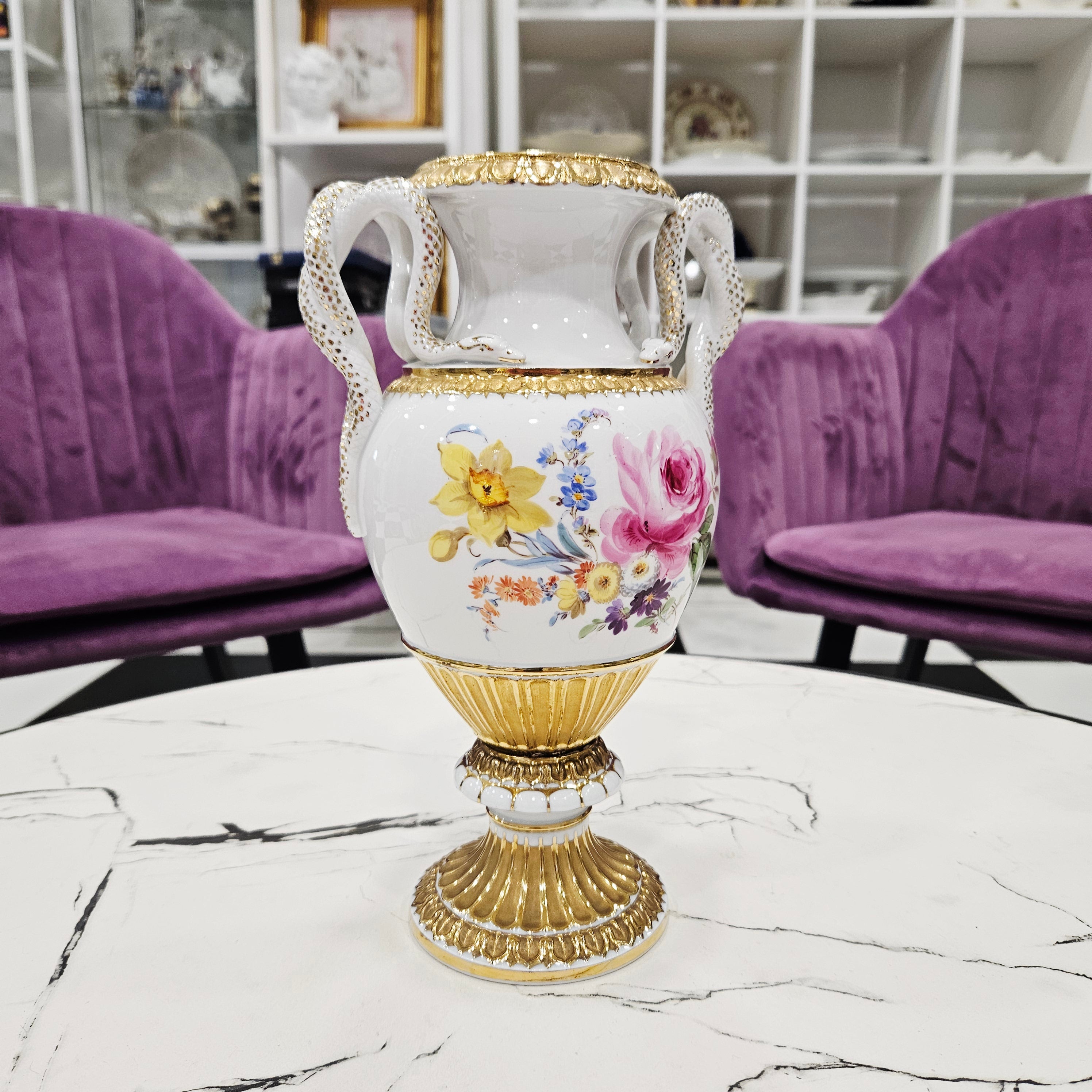 Ypatingą dėmesį traukia įmantrios gyvačių formos rankenos, simbolizuojančios išmintį ir amžinybę. Jos dekoruotos subtiliu tinklelio raštu ir aukso detalėmis, pabrėžiančiomis formos dinamiką. Vazą puošia rankomis tapytas gėlių ansamblis, sukuriantis harmoningą spalvų simfoniją baltame porceliano fone.