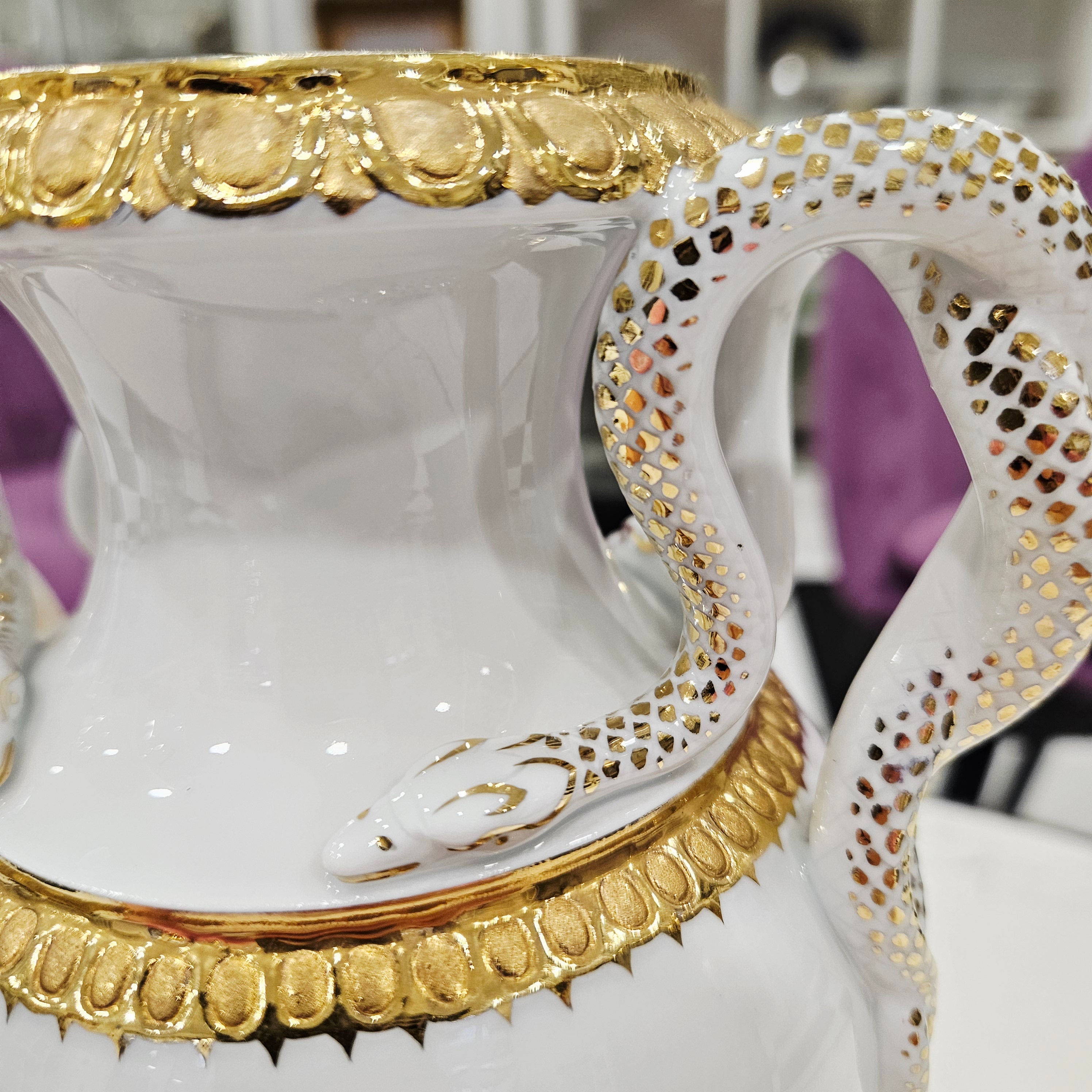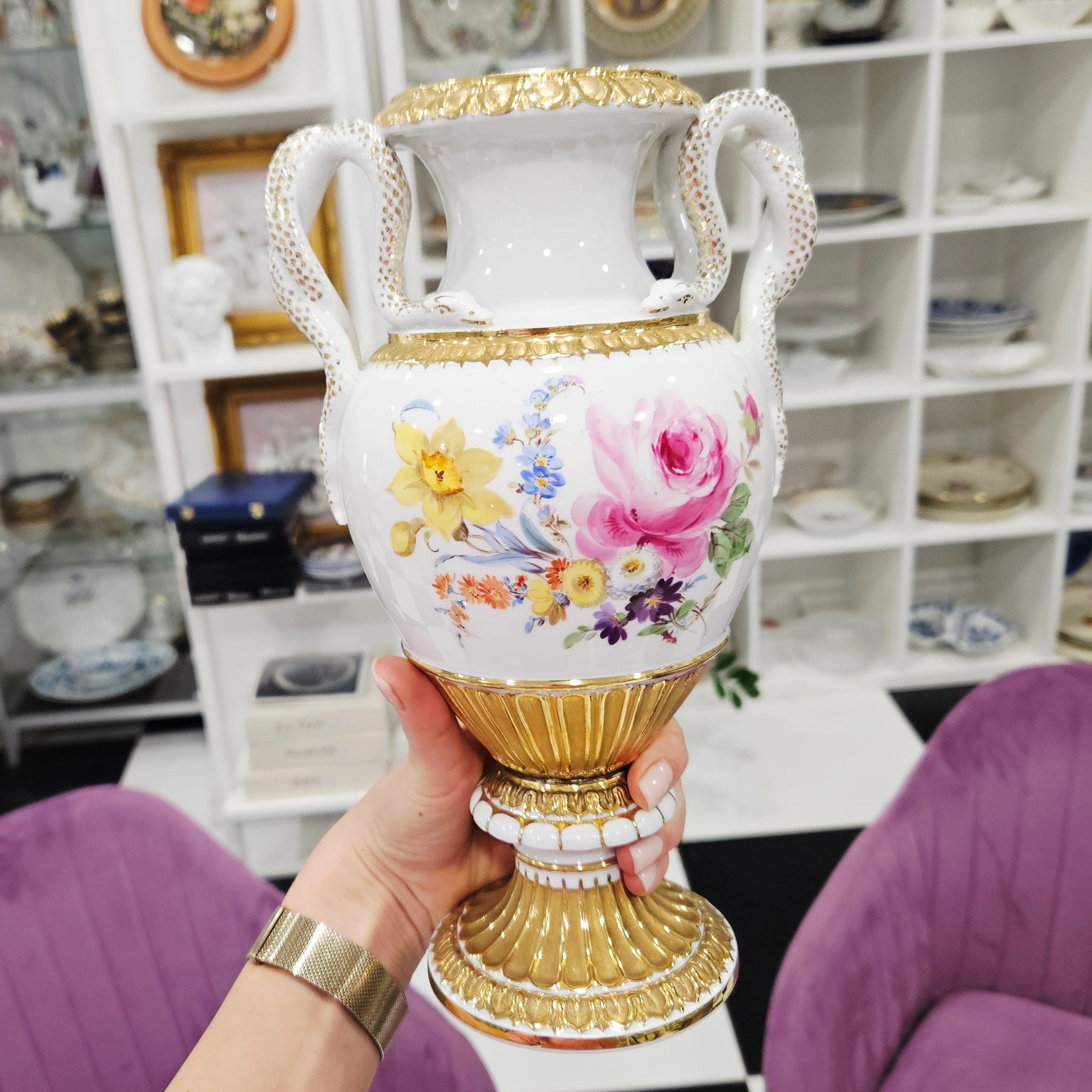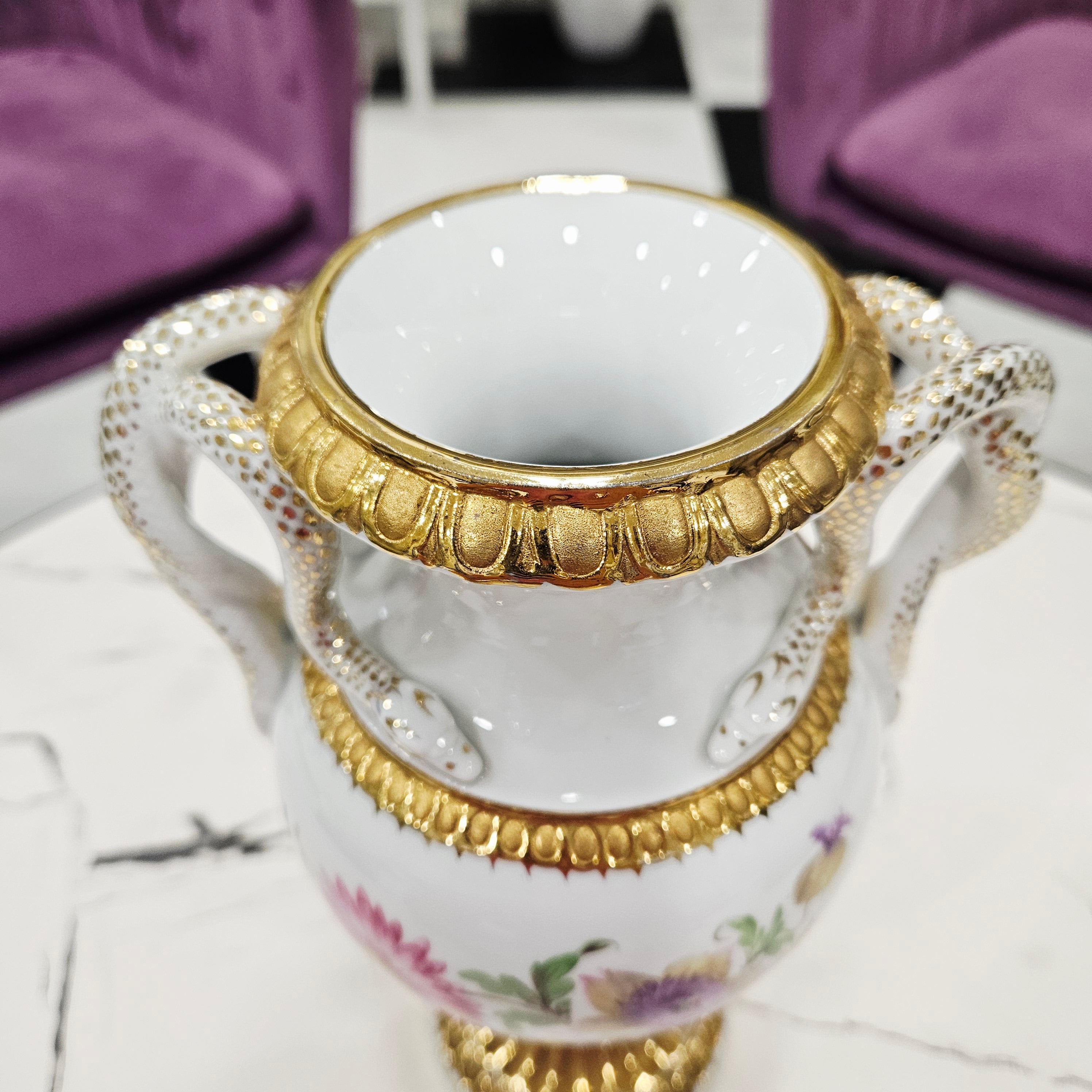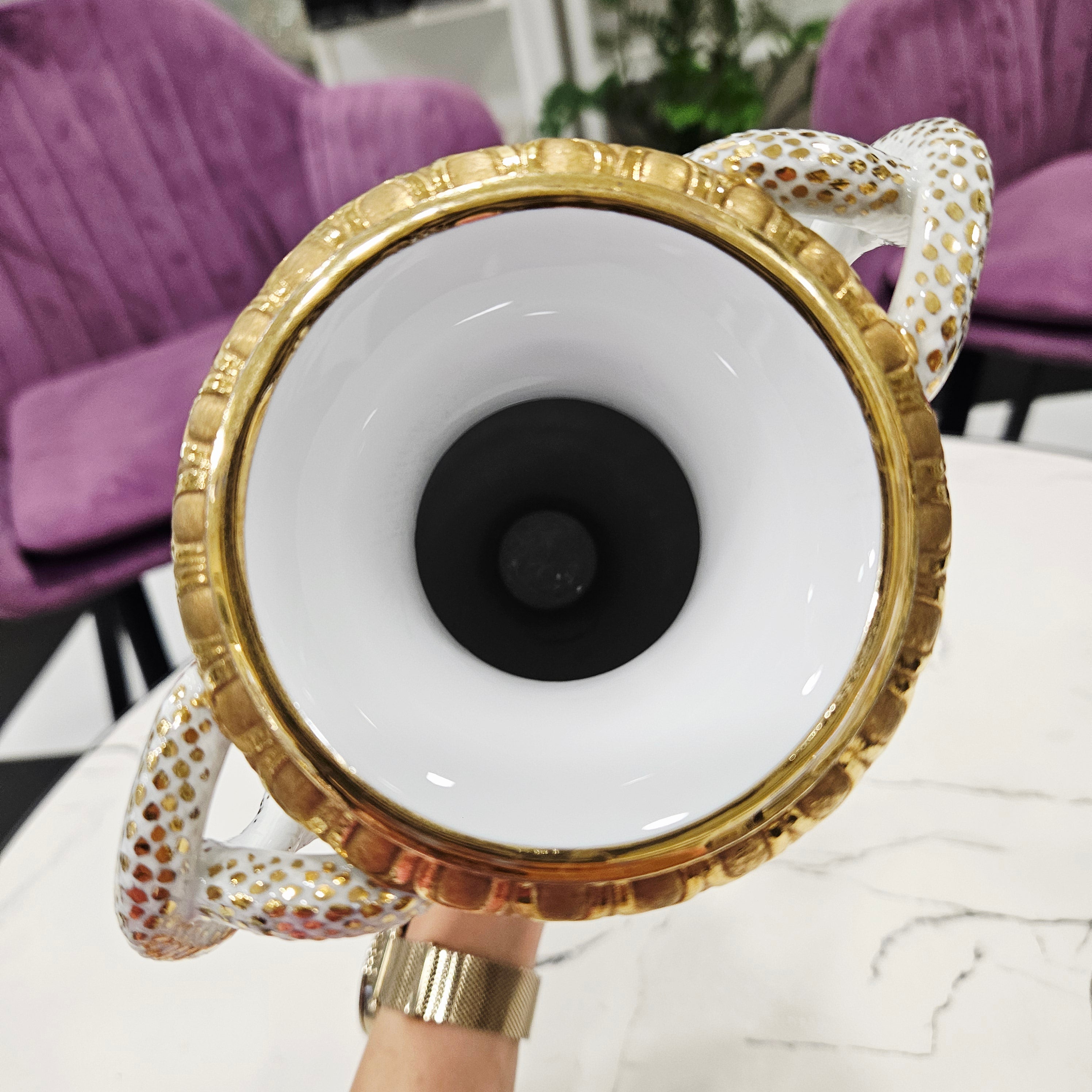 Ypatingą dėmesį traukia įmantrios gyvačių formos rankenos, simbolizuojančios išmintį ir amžinybę. Jos dekoruotos subtiliu tinklelio raštu ir aukso detalėmis, pabrėžiančiomis formos dinamiką. Vazą puošia rankomis tapytas gėlių ansamblis, sukuriantis harmoningą spalvų simfoniją baltame porceliano fone.