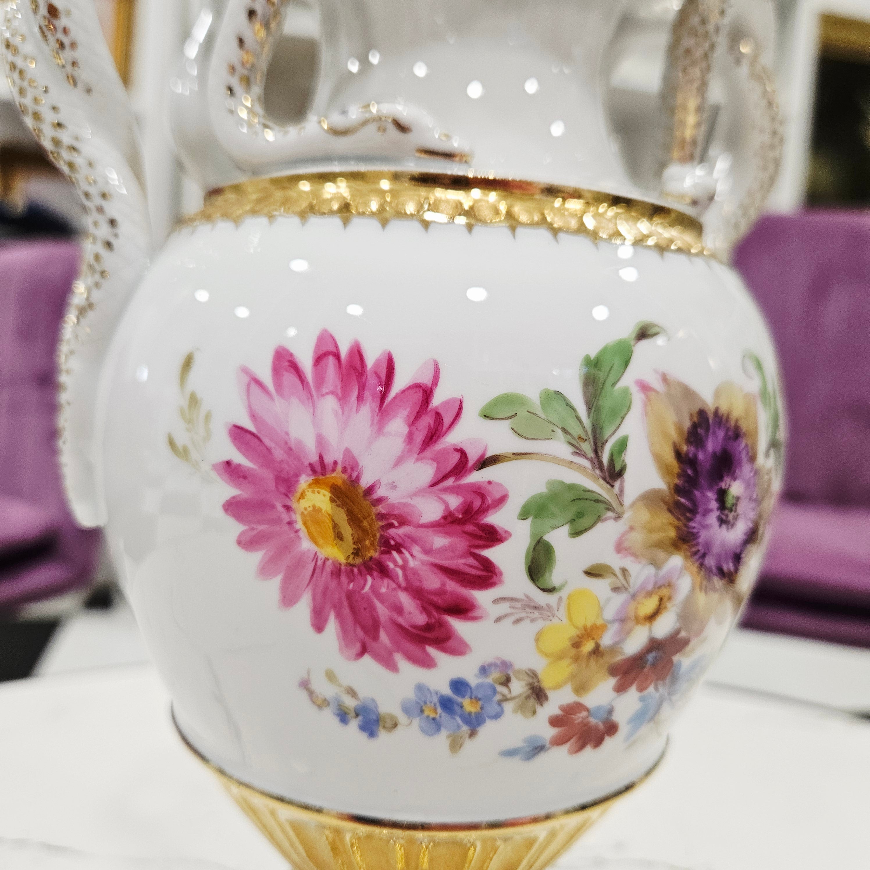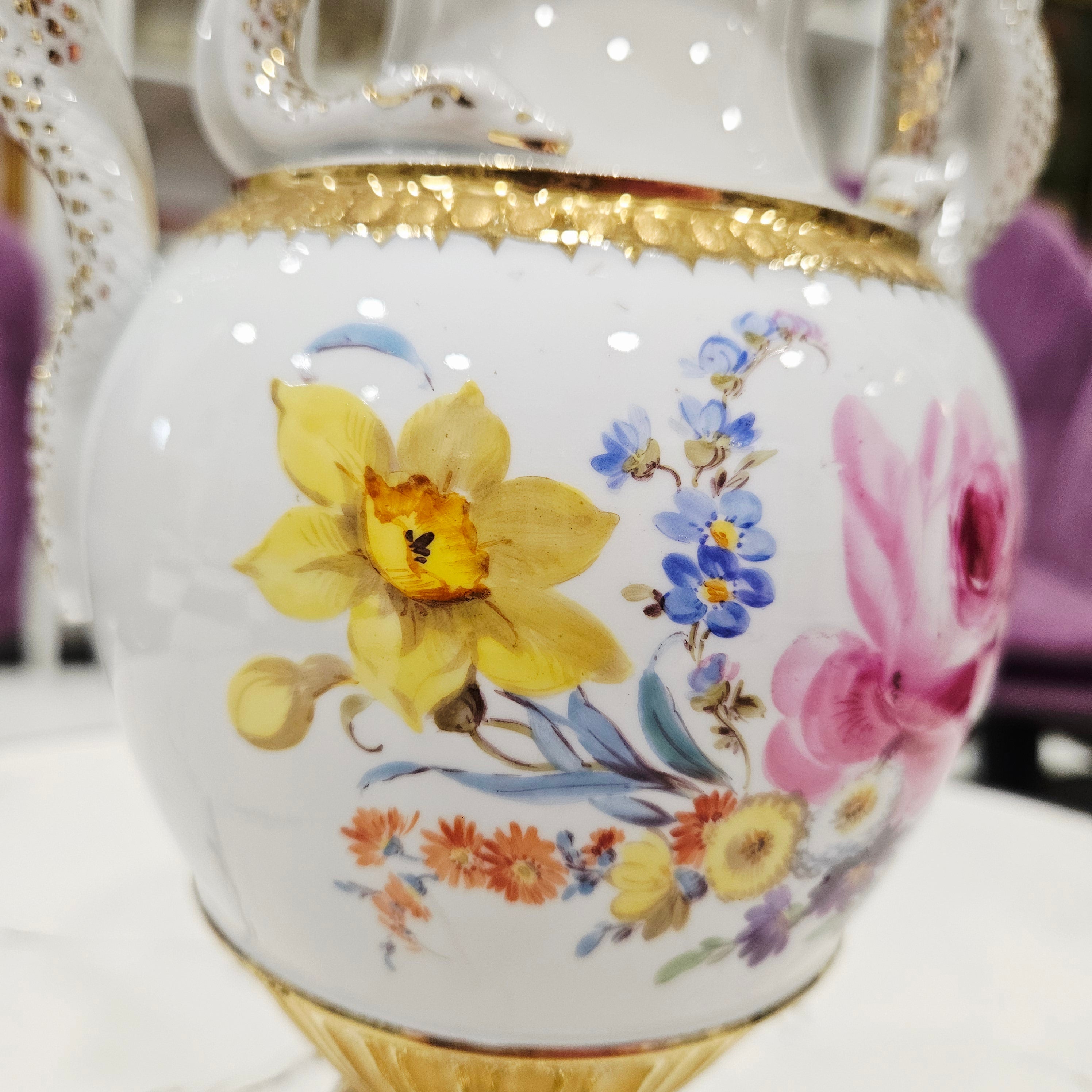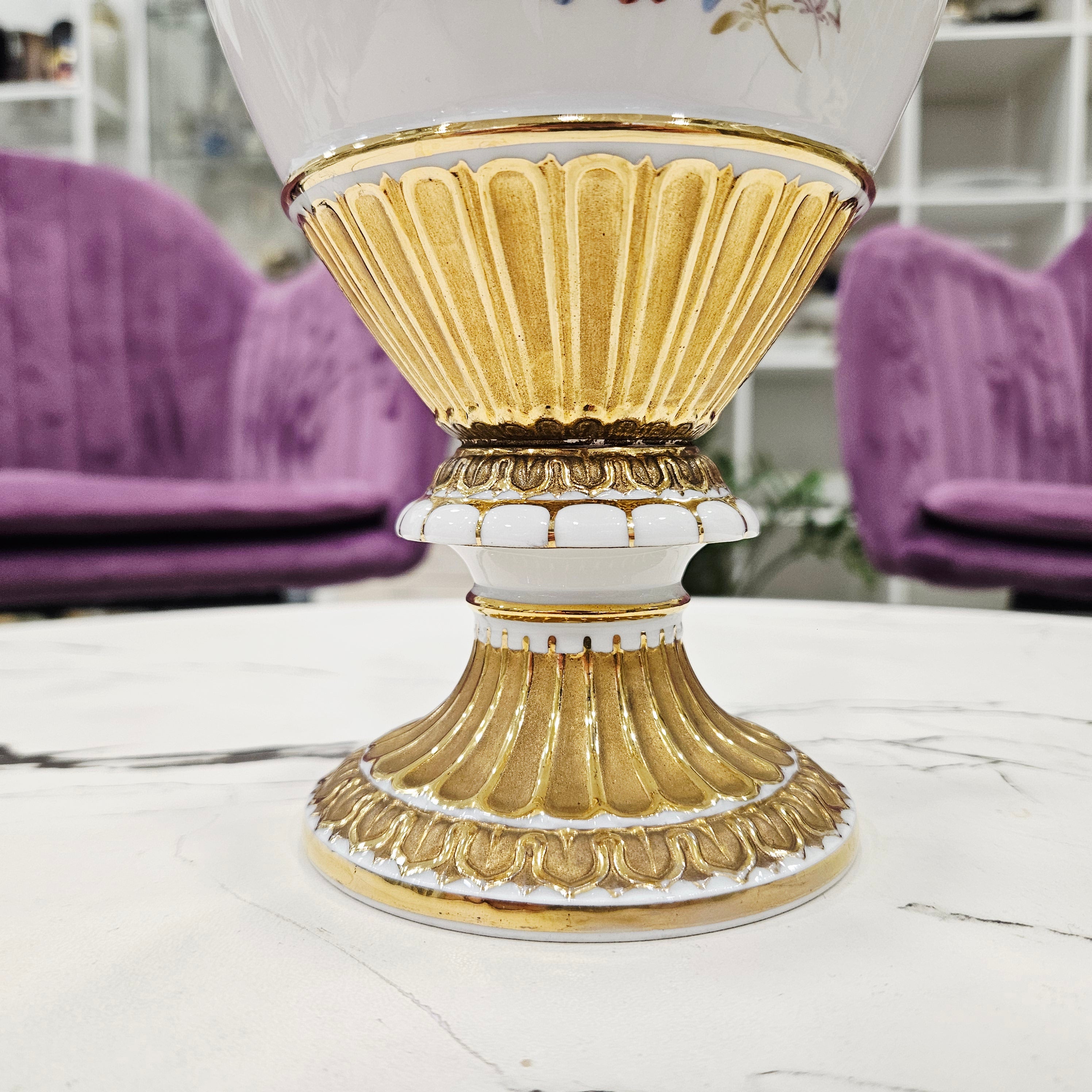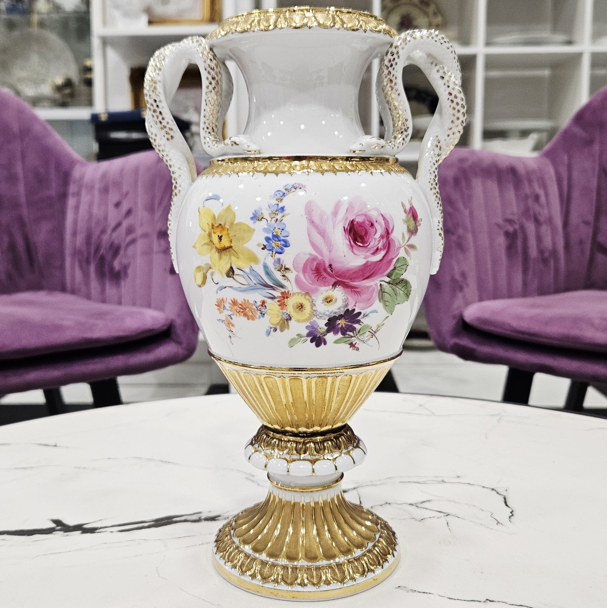Ypatingą dėmesį traukia įmantrios gyvačių formos rankenos, simbolizuojančios išmintį ir amžinybę. Jos dekoruotos subtiliu tinklelio raštu ir aukso detalėmis, pabrėžiančiomis formos dinamiką. Vazą puošia rankomis tapytas gėlių ansamblis, sukuriantis harmoningą spalvų simfoniją baltame porceliano fone.