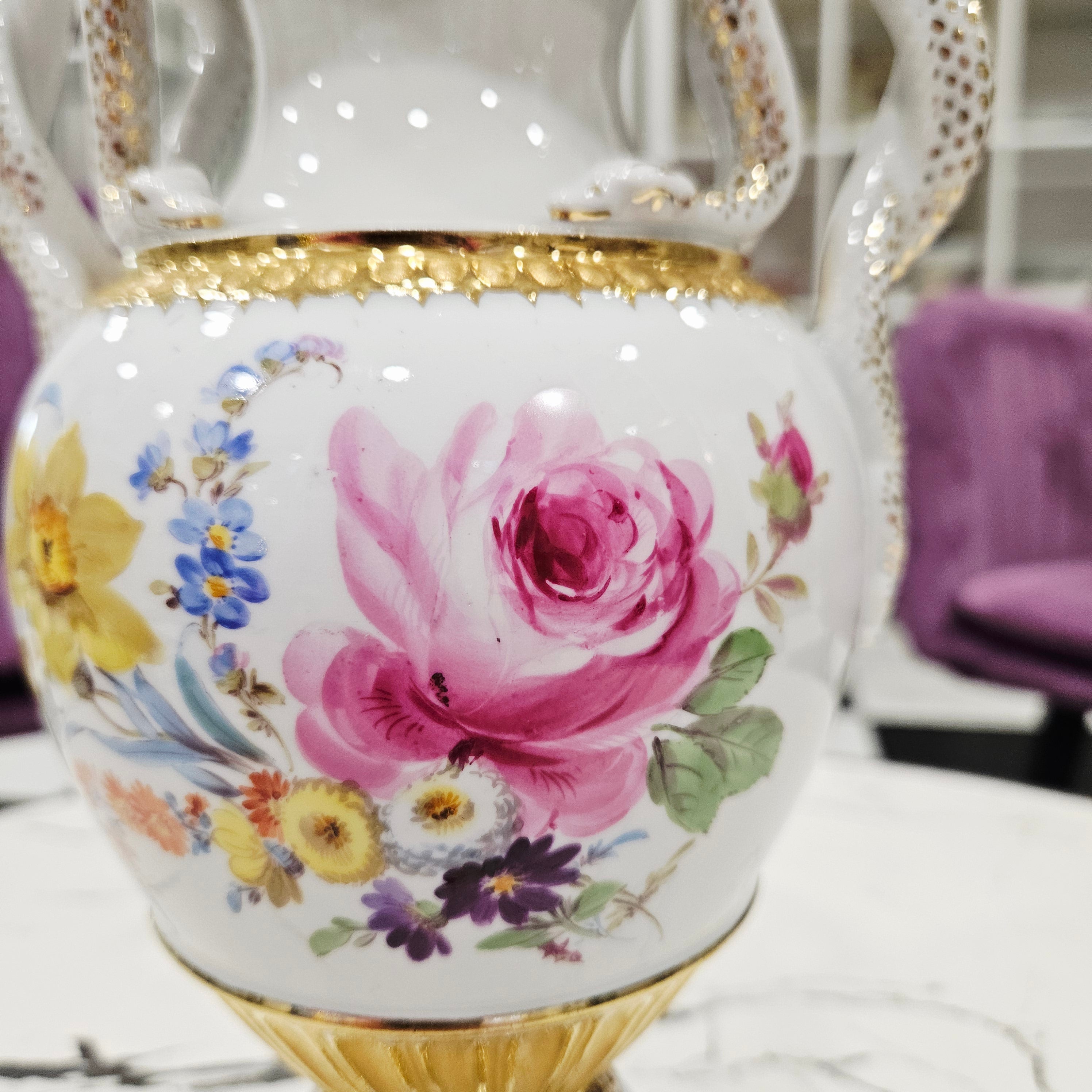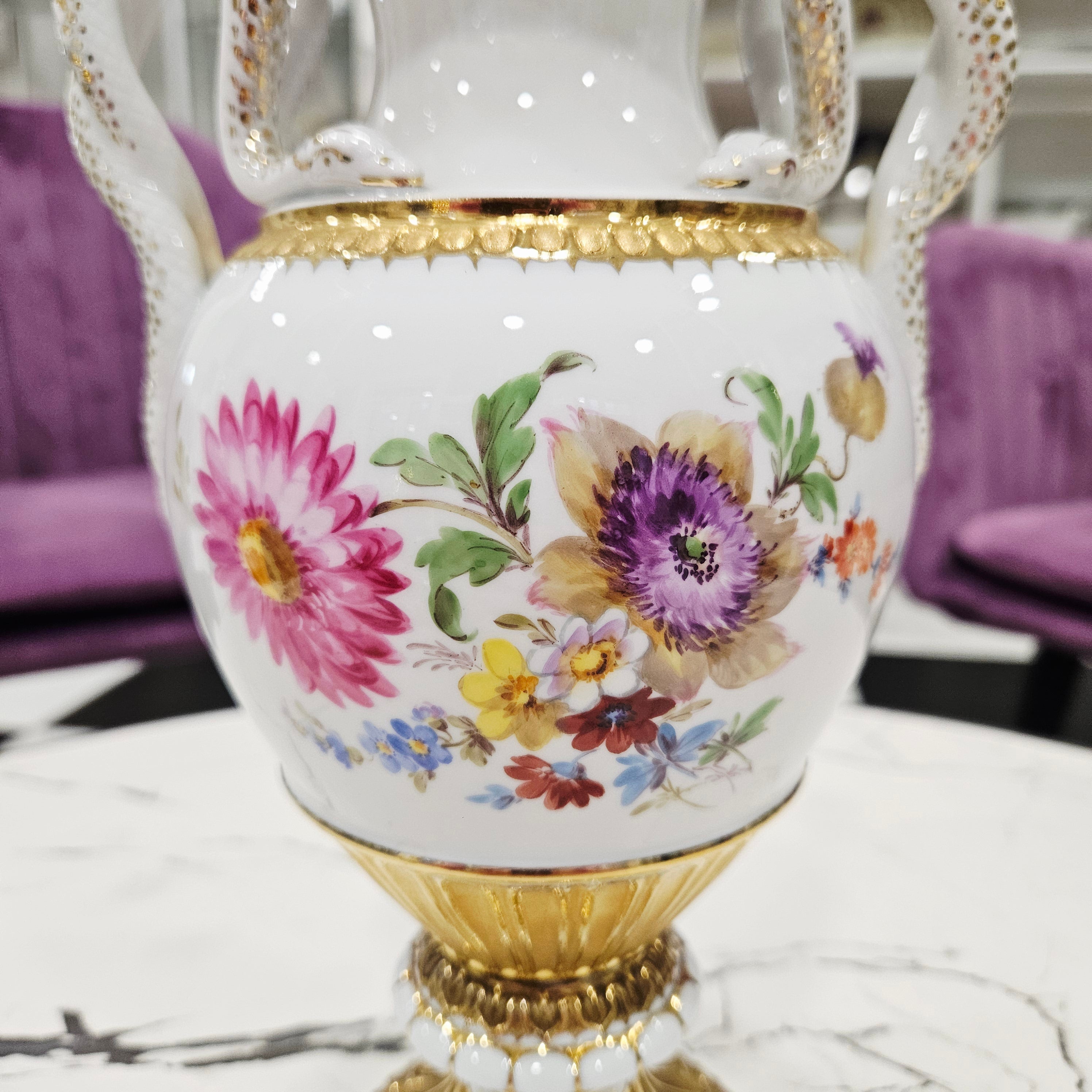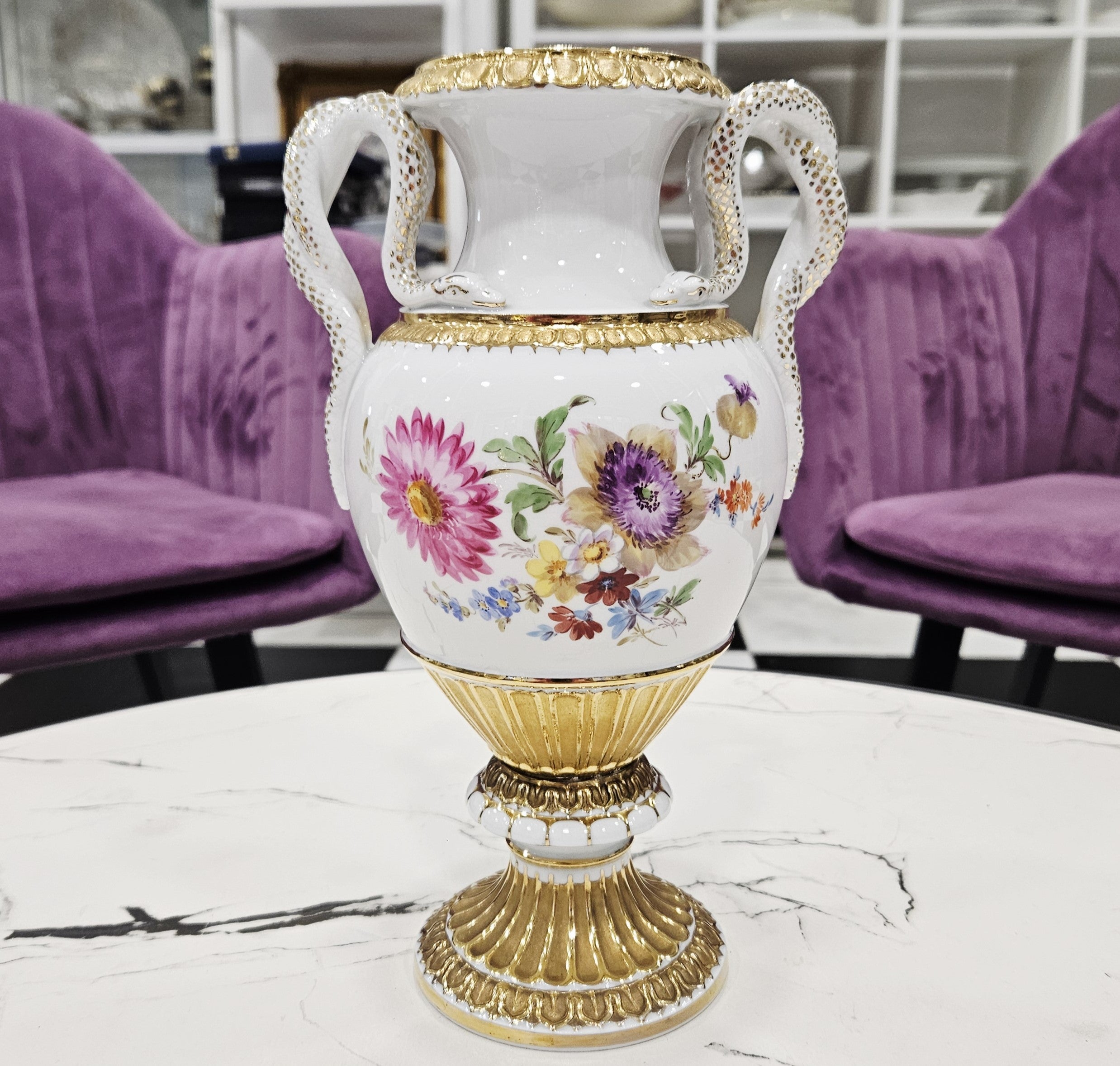 Išskirtinio meistriškumo Meissen porceliano vaza – tikras meno kūrinys, atspindintis aukščiausio lygio vokiškąją porceliano tradiciją ir rafinuotą estetiką. Ši prabangi vaza, puošta rankomis tapytais gėlių motyvais ir 24 karatų auksu dengtais ornamentais, spinduliuoja eleganciją bei išskirtinumą.