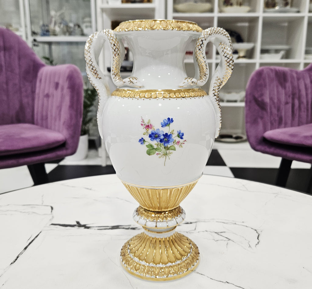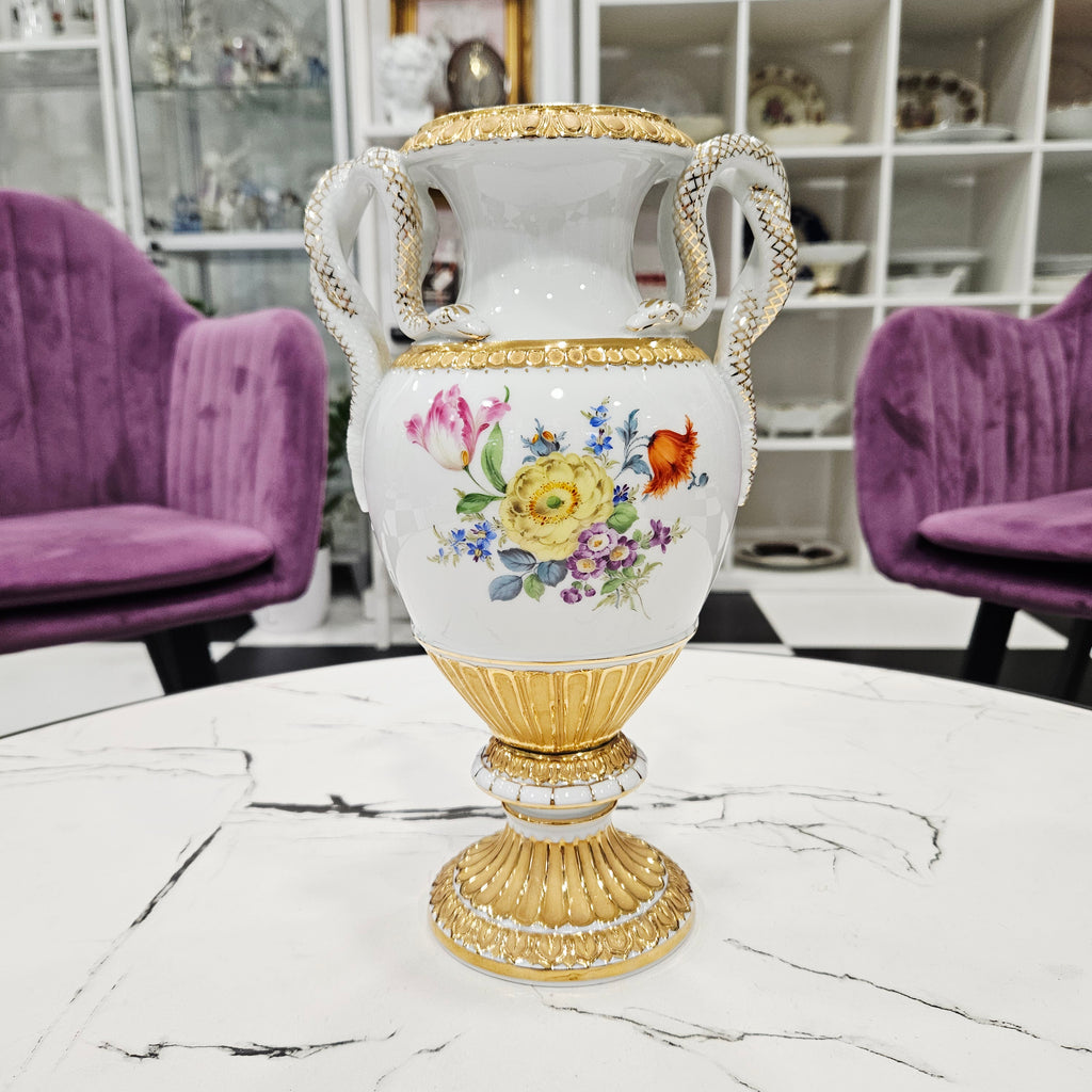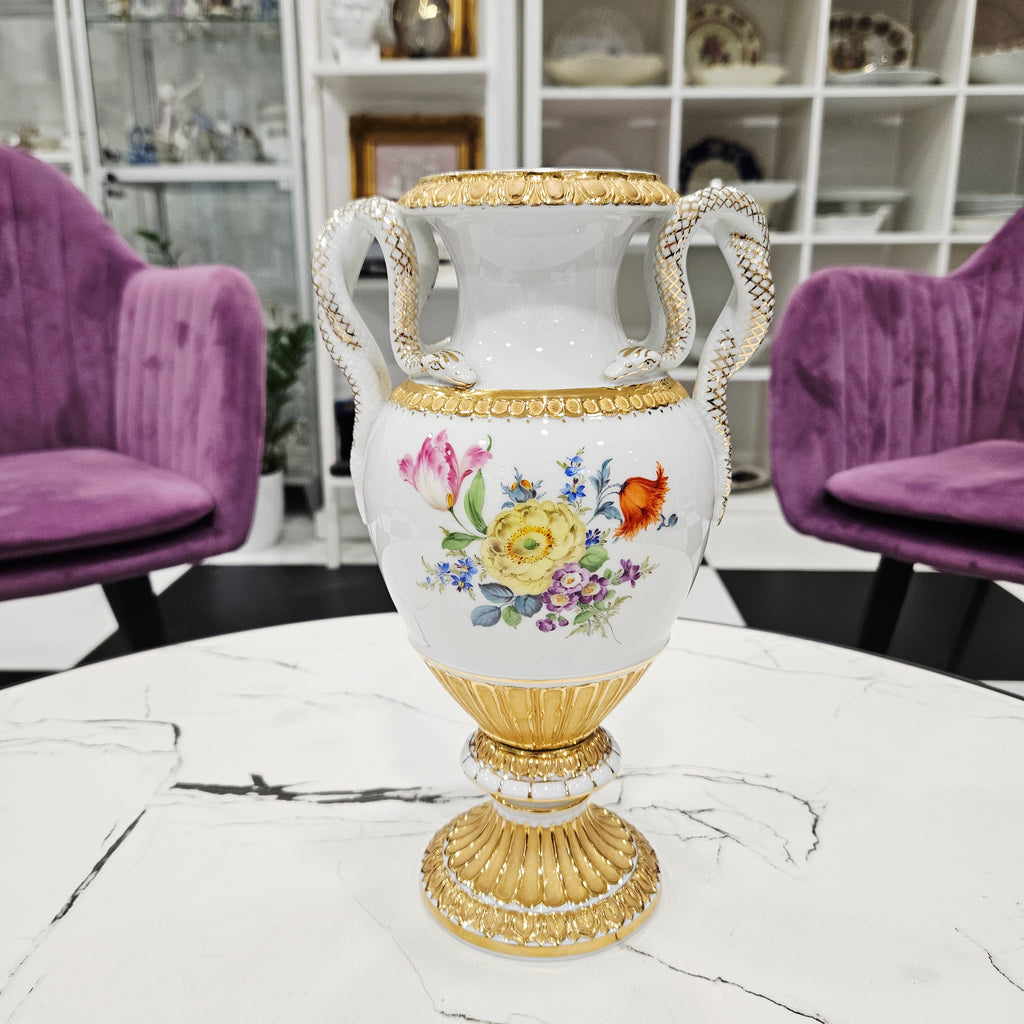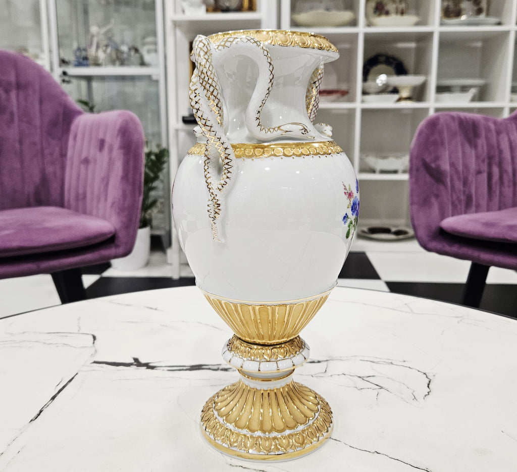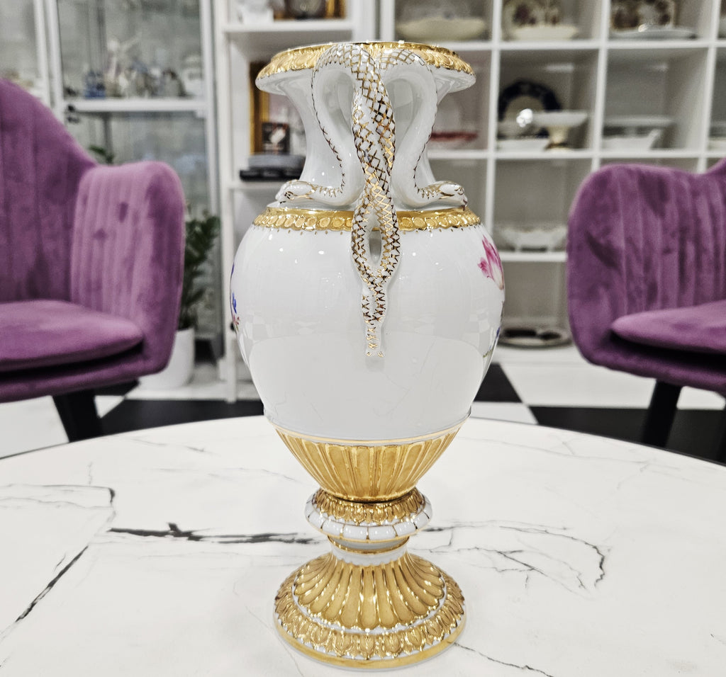 Nuostabaus grožio, labai reta, prabangi, gausiai auksu dengta "Meissen" porcelianinė dekoratyvinė gėlių vaza su išskirtinėmis gyvatės formos rankenėlėmis. (27.5cm.)
