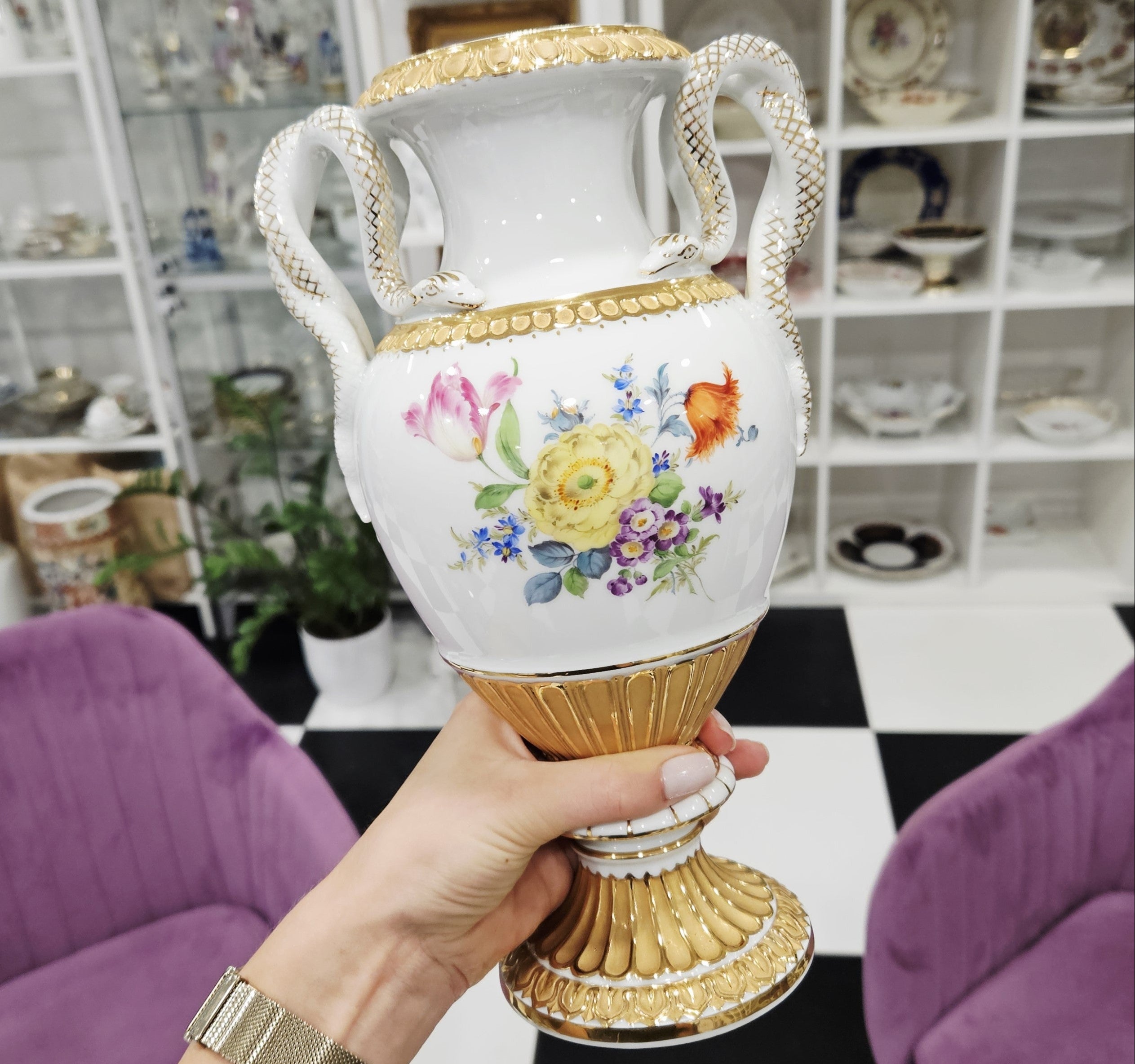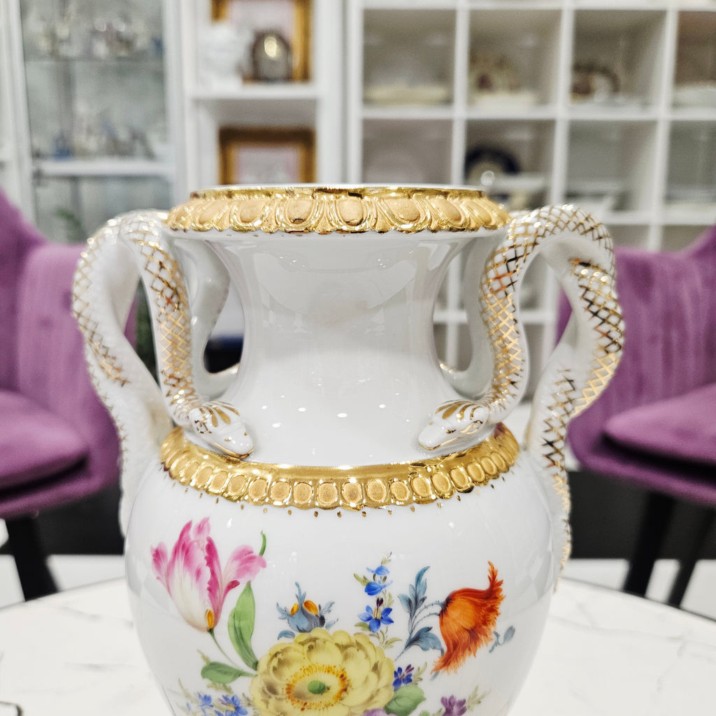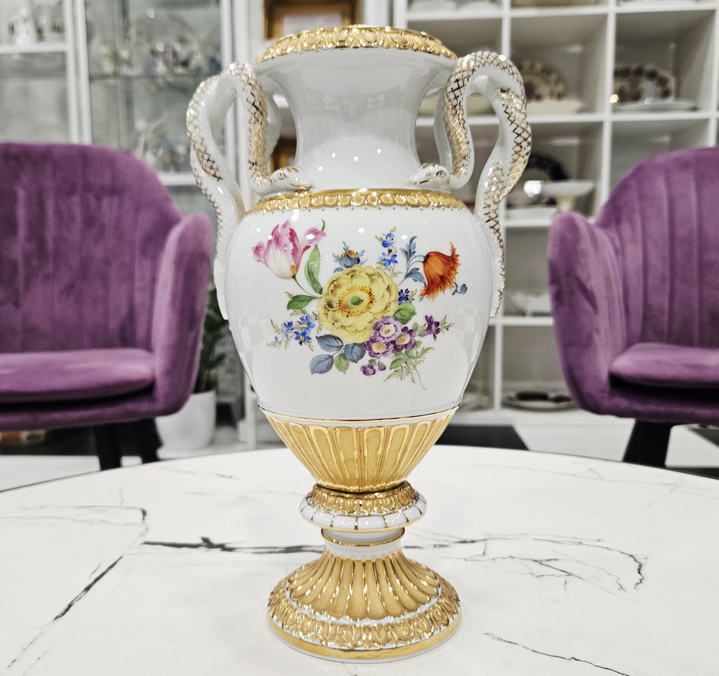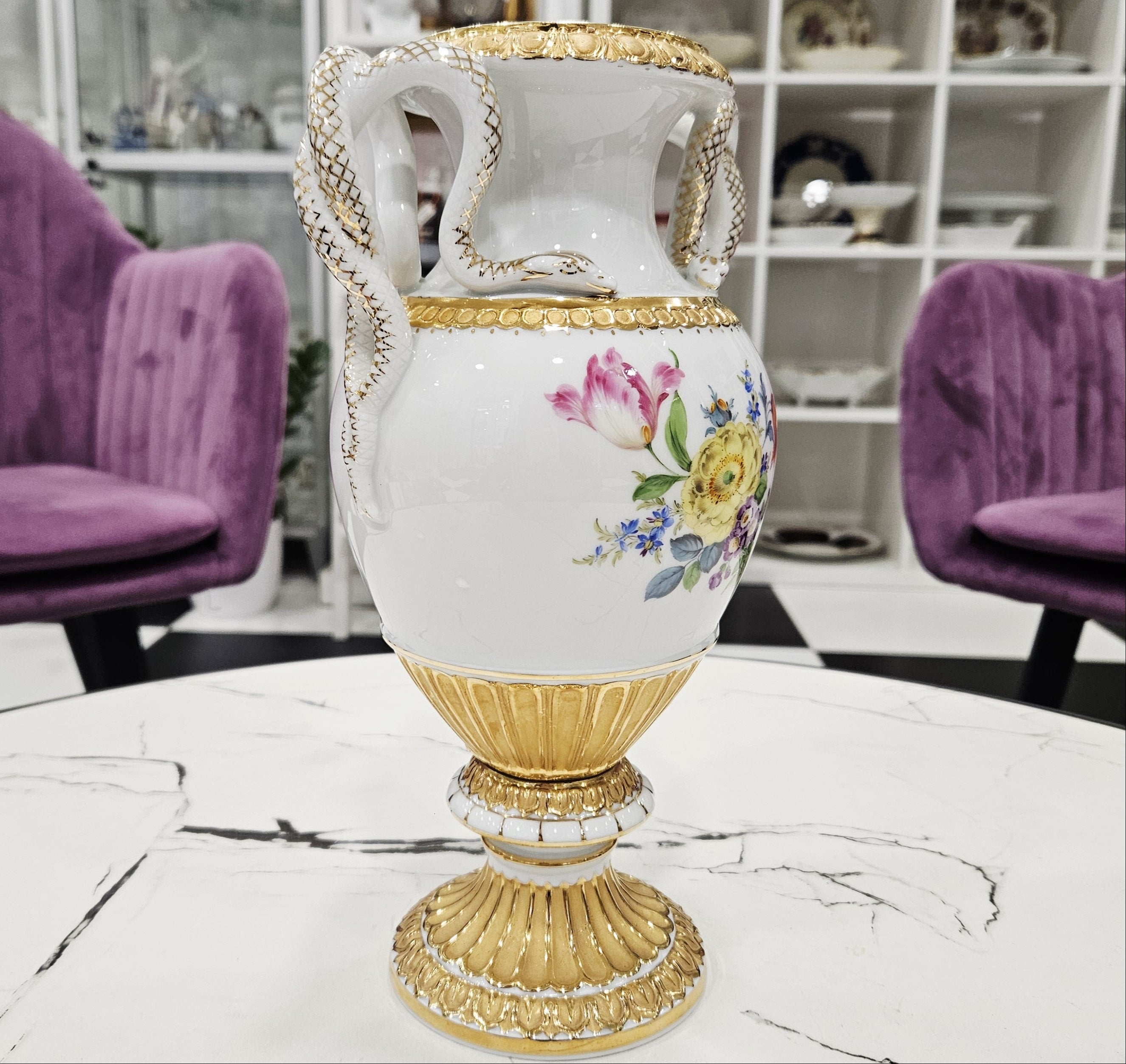 Nuostabaus grožio, labai reta, prabangi, gausiai auksu dengta "Meissen" porcelianinė dekoratyvinė gėlių vaza su išskirtinėmis gyvatės formos rankenėlėmis. (27.5cm.)
