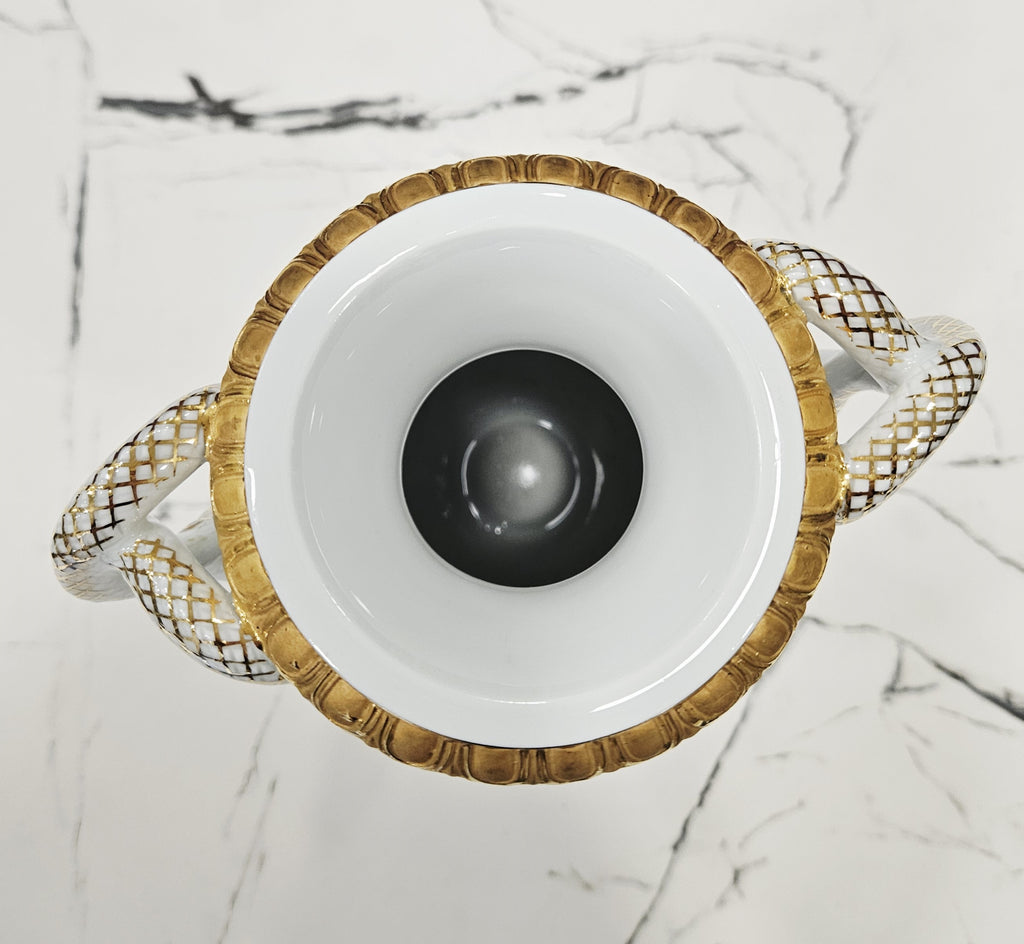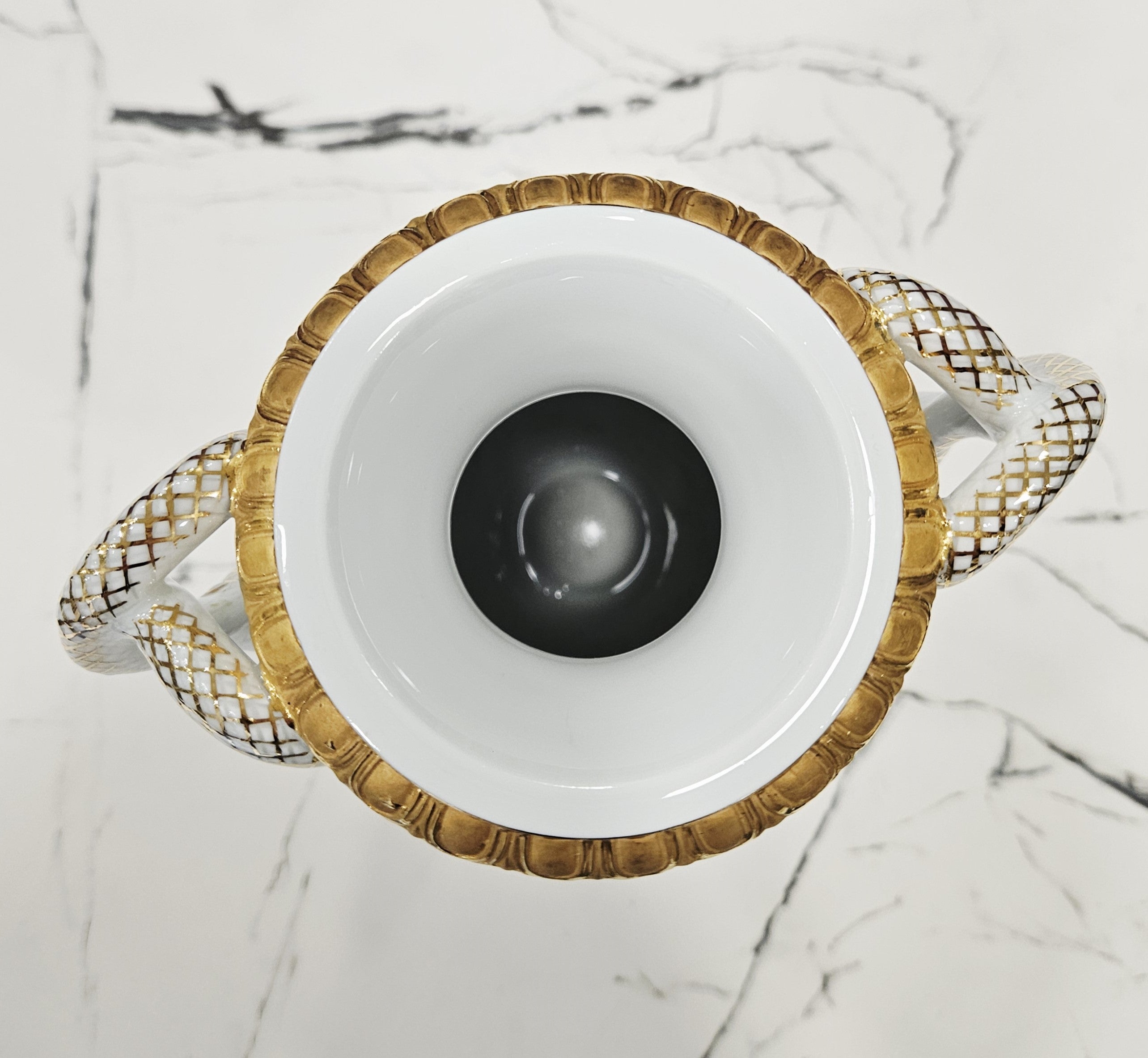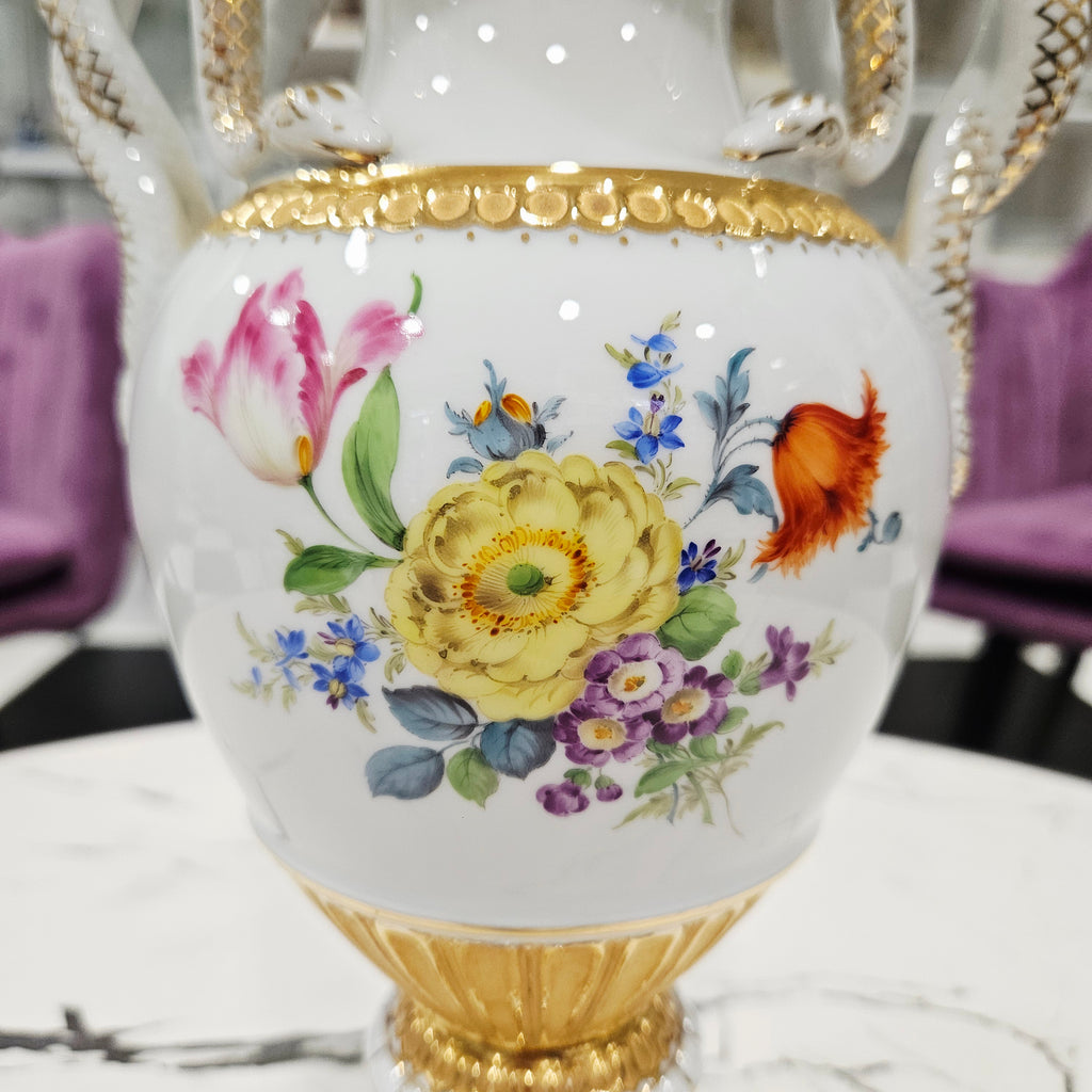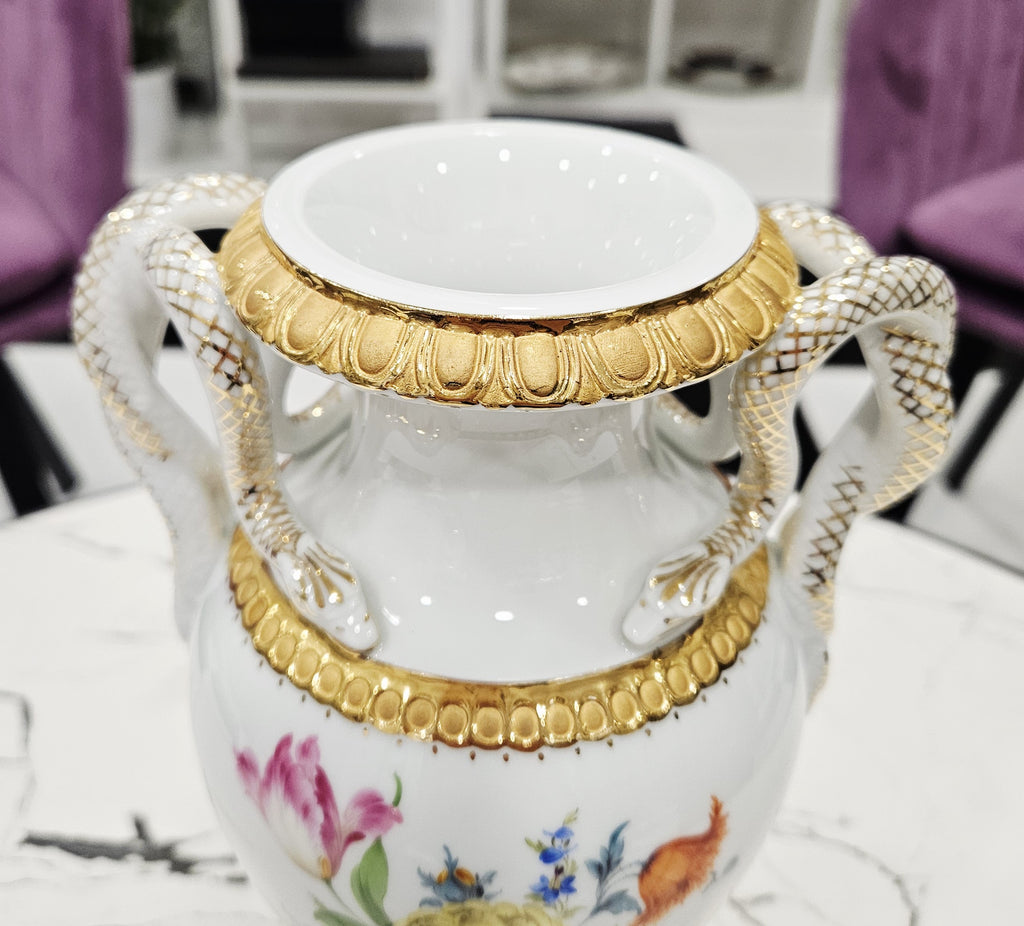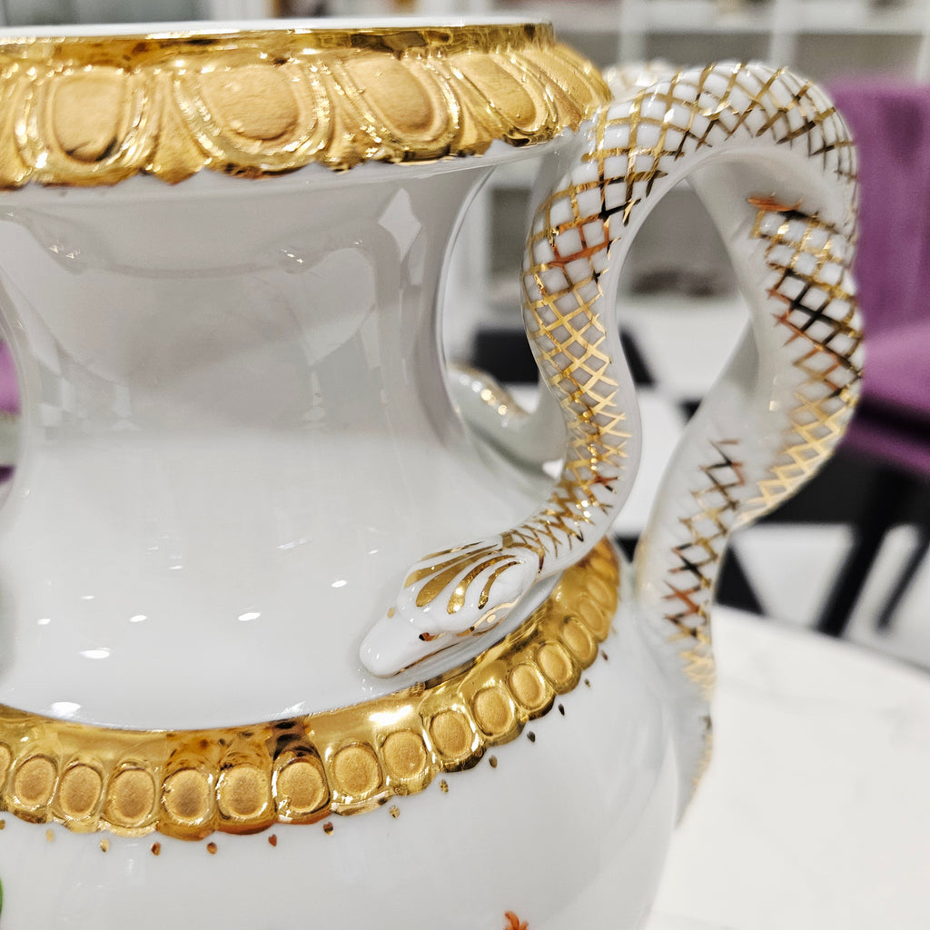 Ypatingą dėmesį traukia įmantrios gyvačių formos rankenos, simbolizuojančios išmintį ir amžinybę. Jos dekoruotos subtiliu tinklelio raštu ir aukso detalėmis, pabrėžiančiomis formos dinamiką. Vazą puošia rankomis tapytas gėlių ansamblis – tulpės, rožės, našlaitės ir rugiagėlės – sukuriantis harmoningą spalvų simfoniją baltame porceliano fone.