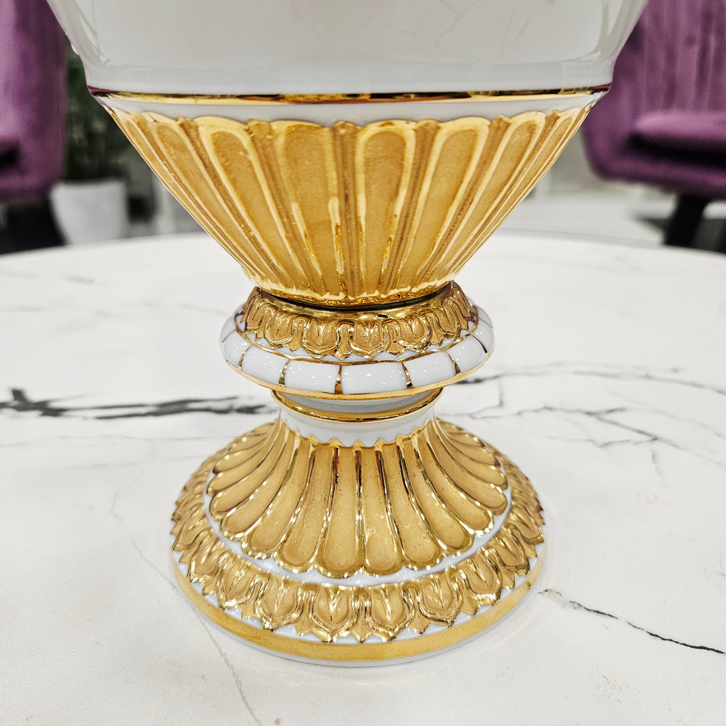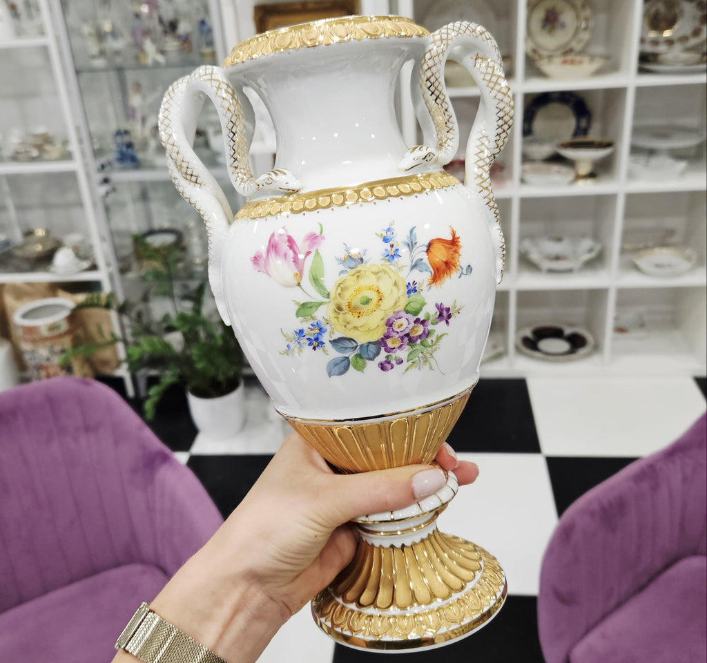 Išskirtinio meistriškumo Meissen porceliano vaza – tikras meno kūrinys, atspindintis aukščiausio lygio vokiškąją porceliano tradiciją ir rafinuotą estetiką. Ši prabangi vaza, puošta rankomis tapytais gėlių motyvais ir 24 karatų auksu dengtais ornamentais, spinduliuoja eleganciją bei išskirtinumą.