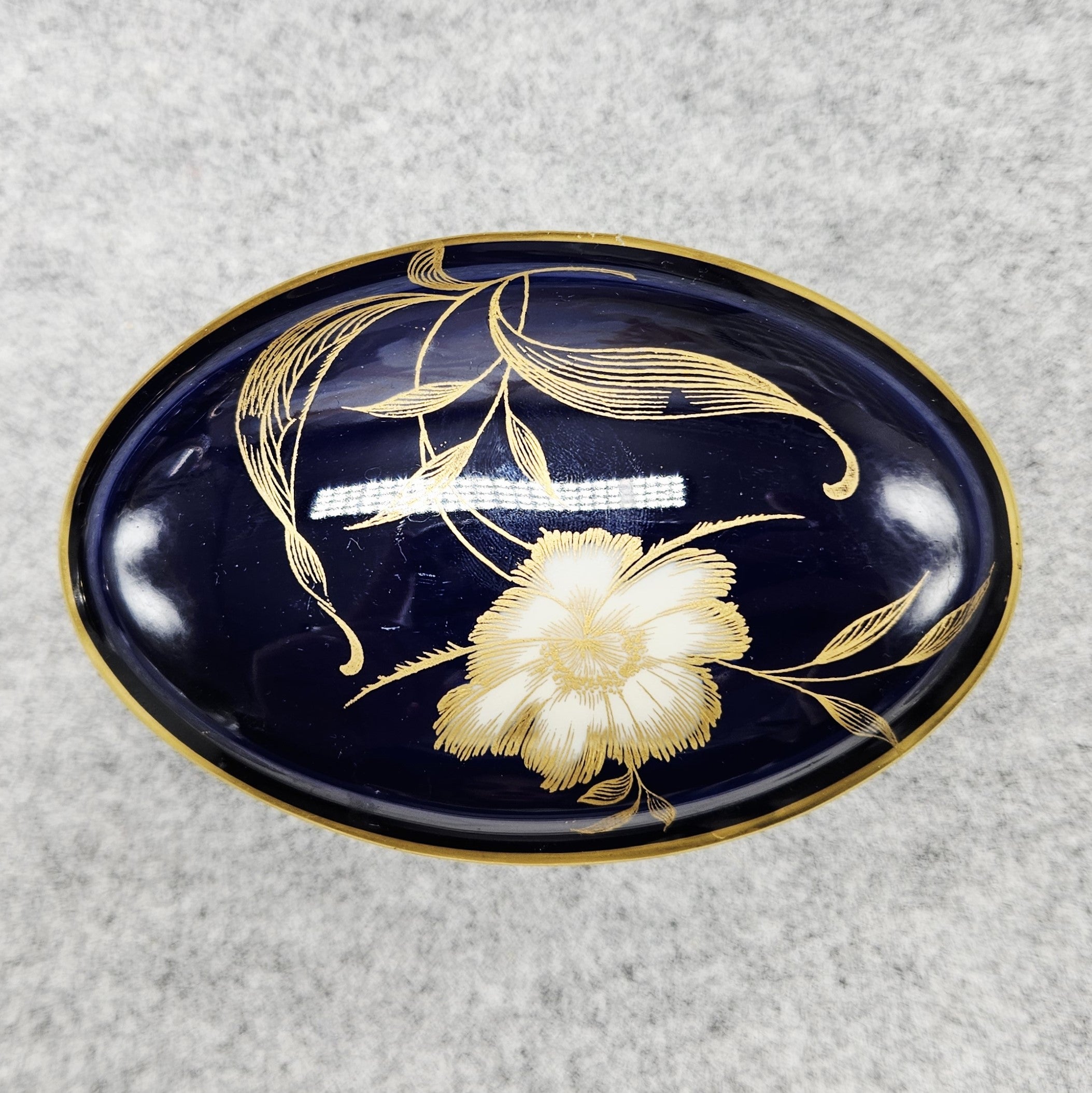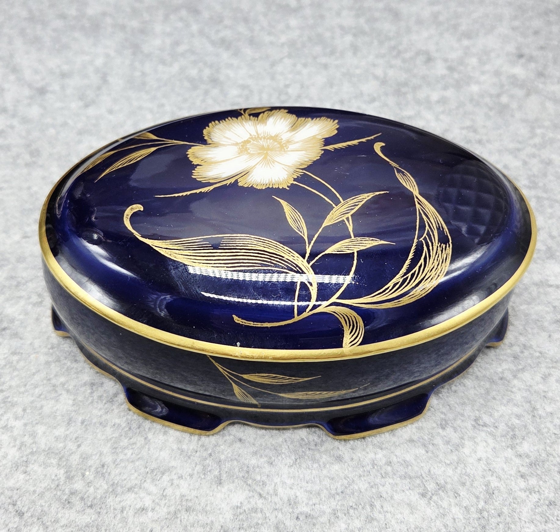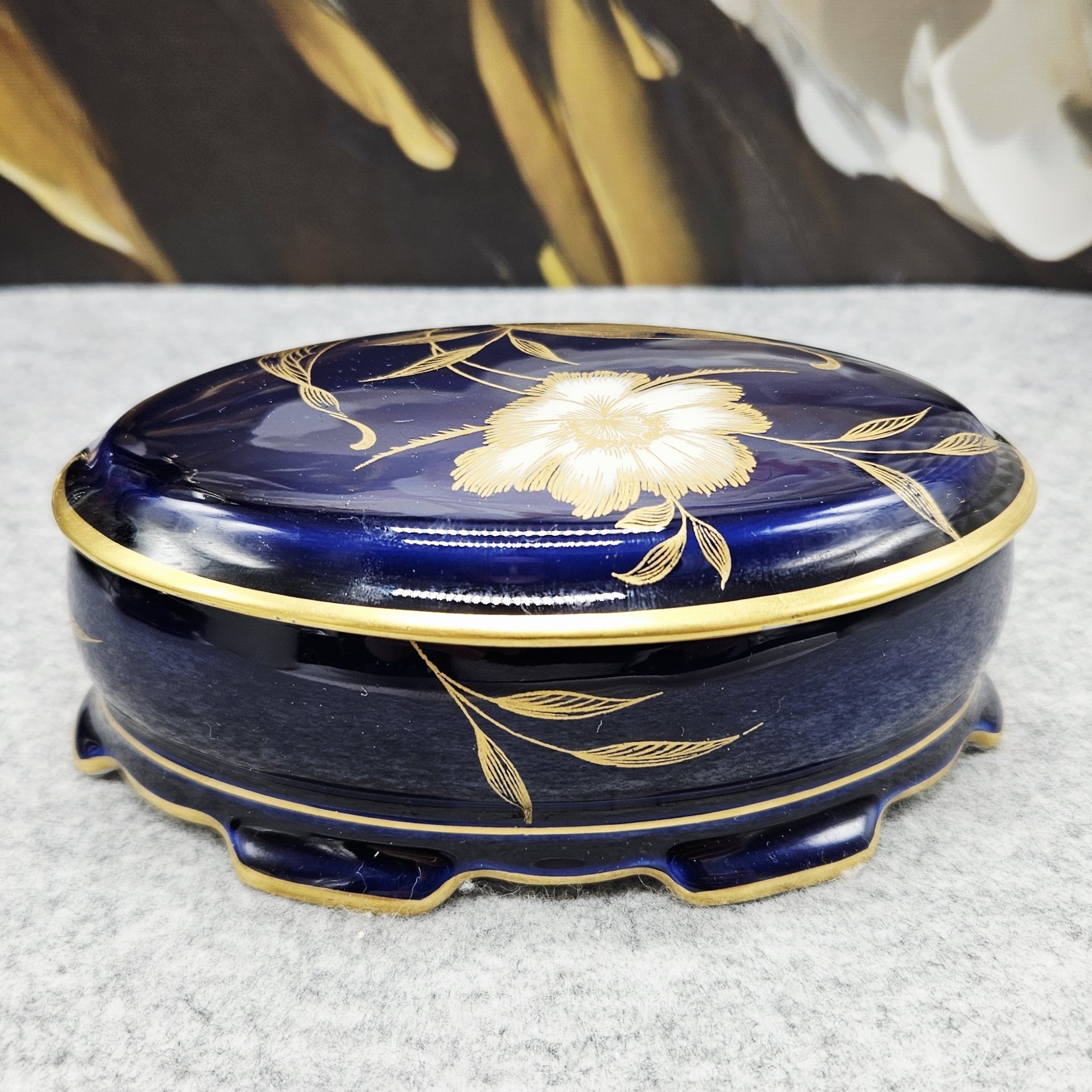 Nuostabi „Rosenthal“ porcelianinė dėžutė. Klasikinės apvalios formos, padengta kobalto mėlynumo glazūra ir dekoruota balta gėle su gausiais auksiniais motyvais bei aukso detalėmis. Tai itin prabangus nesenstančios klasikos akcentas, papuošiantis kiekvienus namus.