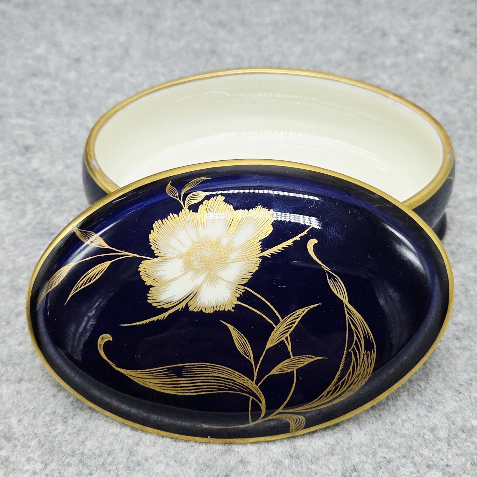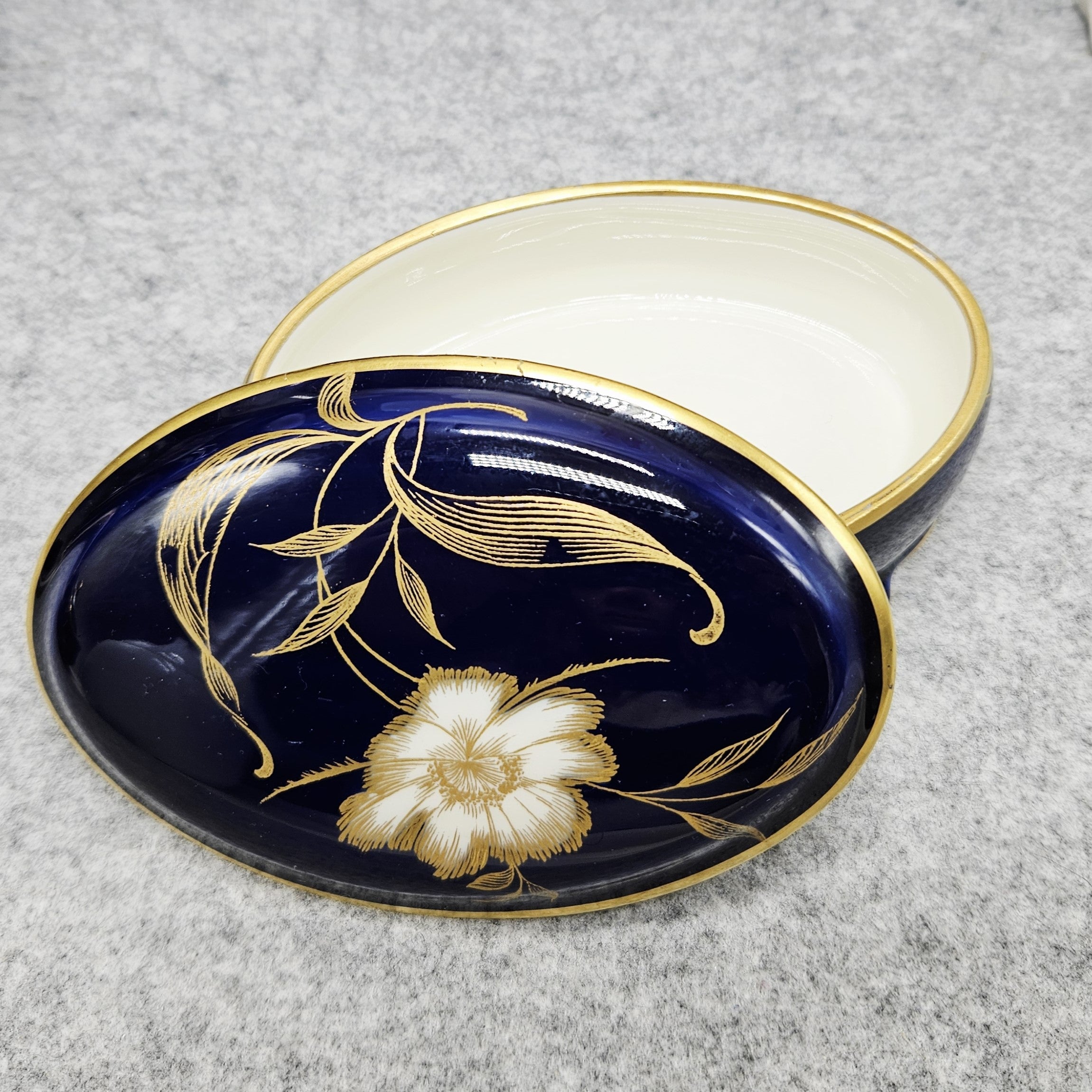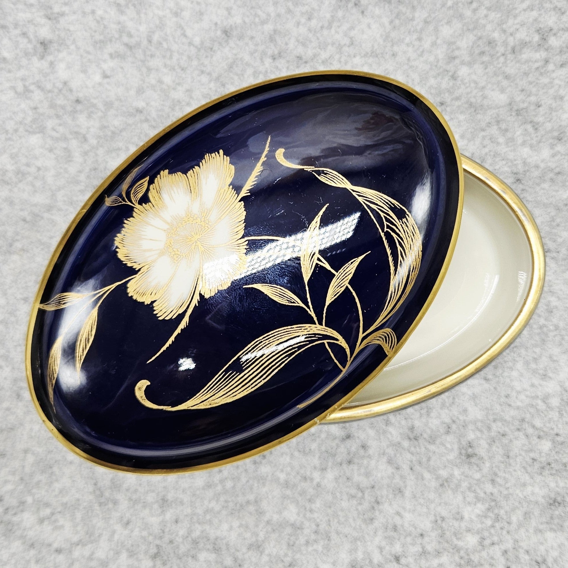 Nuostabi „Rosenthal“ porcelianinė dėžutė. Klasikinės apvalios formos, padengta kobalto mėlynumo glazūra ir dekoruota balta gėle su gausiais auksiniais motyvais bei aukso detalėmis. Tai itin prabangus nesenstančios klasikos akcentas, papuošiantis kiekvienus namus.