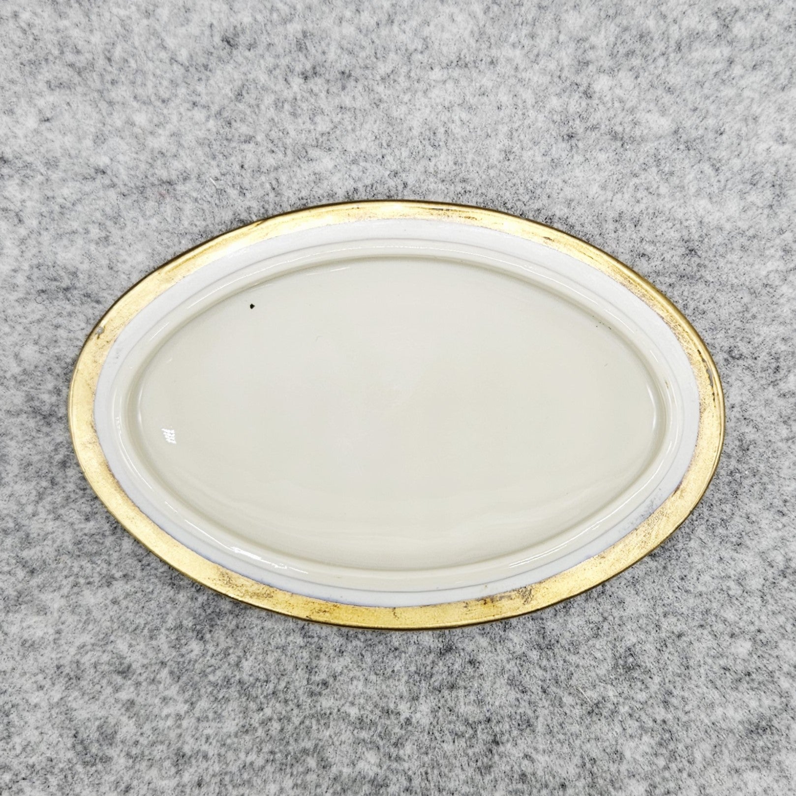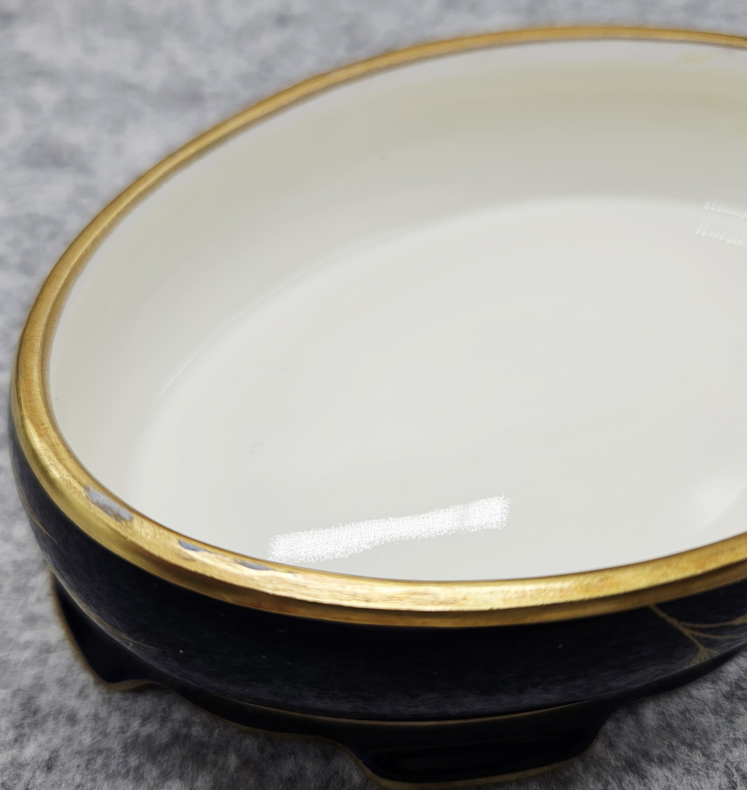 Kadangi tai yra antikvaras (daugiau nei 50+ m amžiaus), turi natūralių naudojimo žymių, nežymiai pabraižytas aukso dekoras. (vadovautis nuotraukomis)