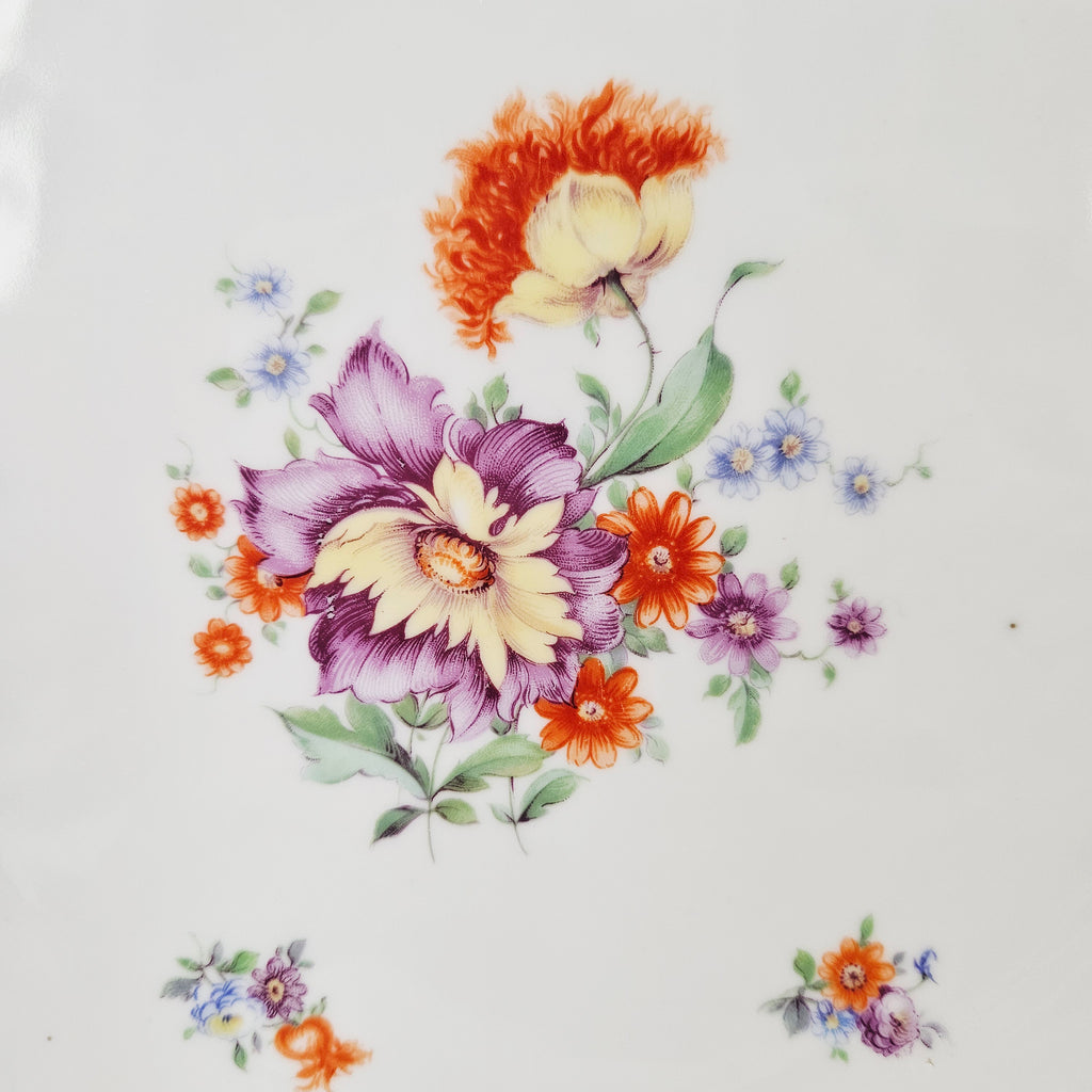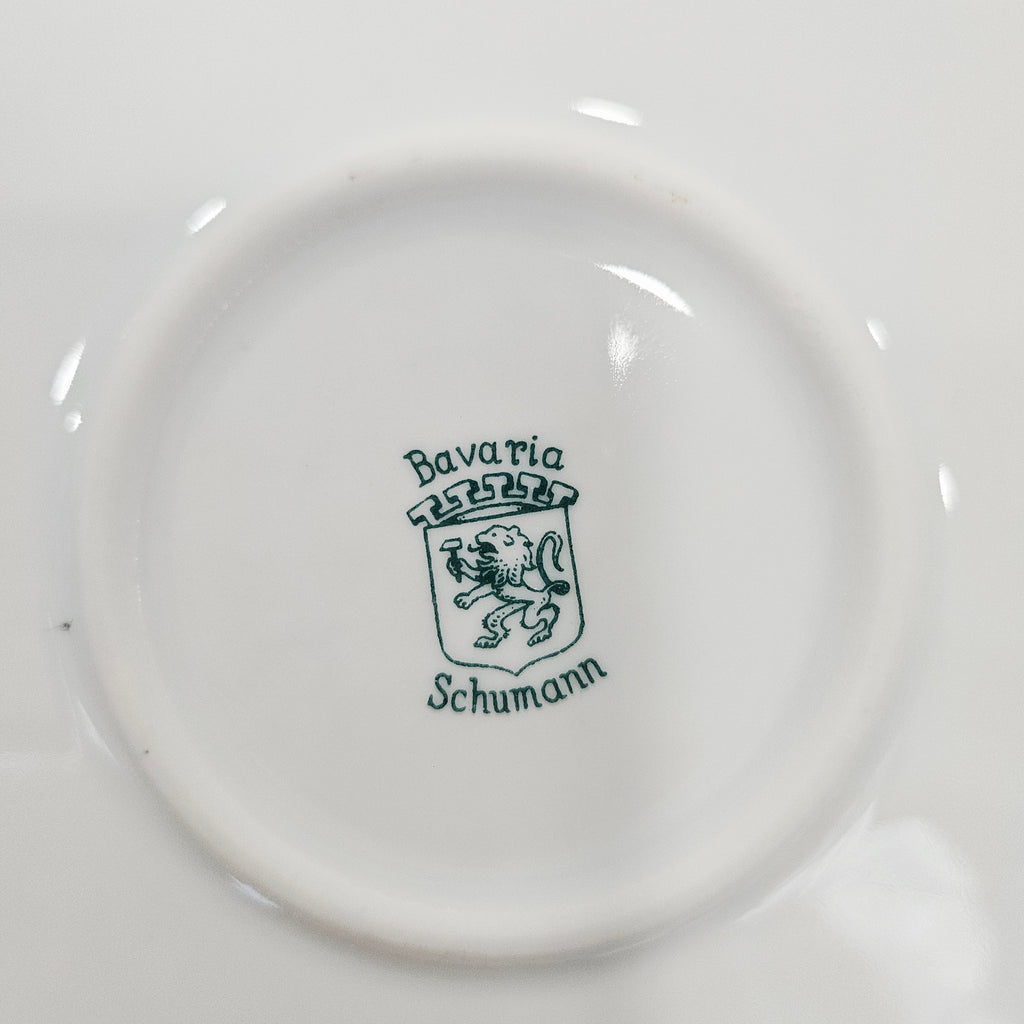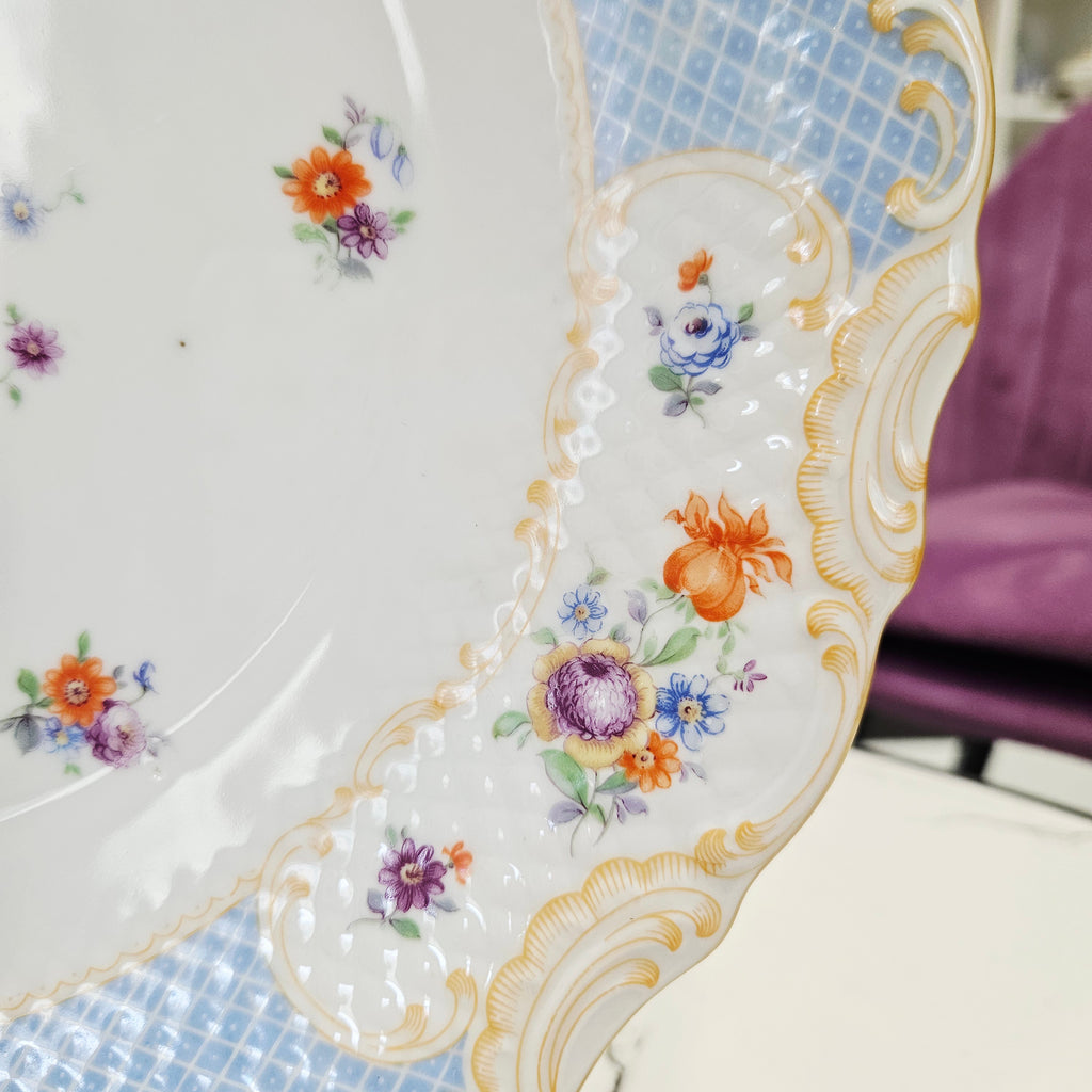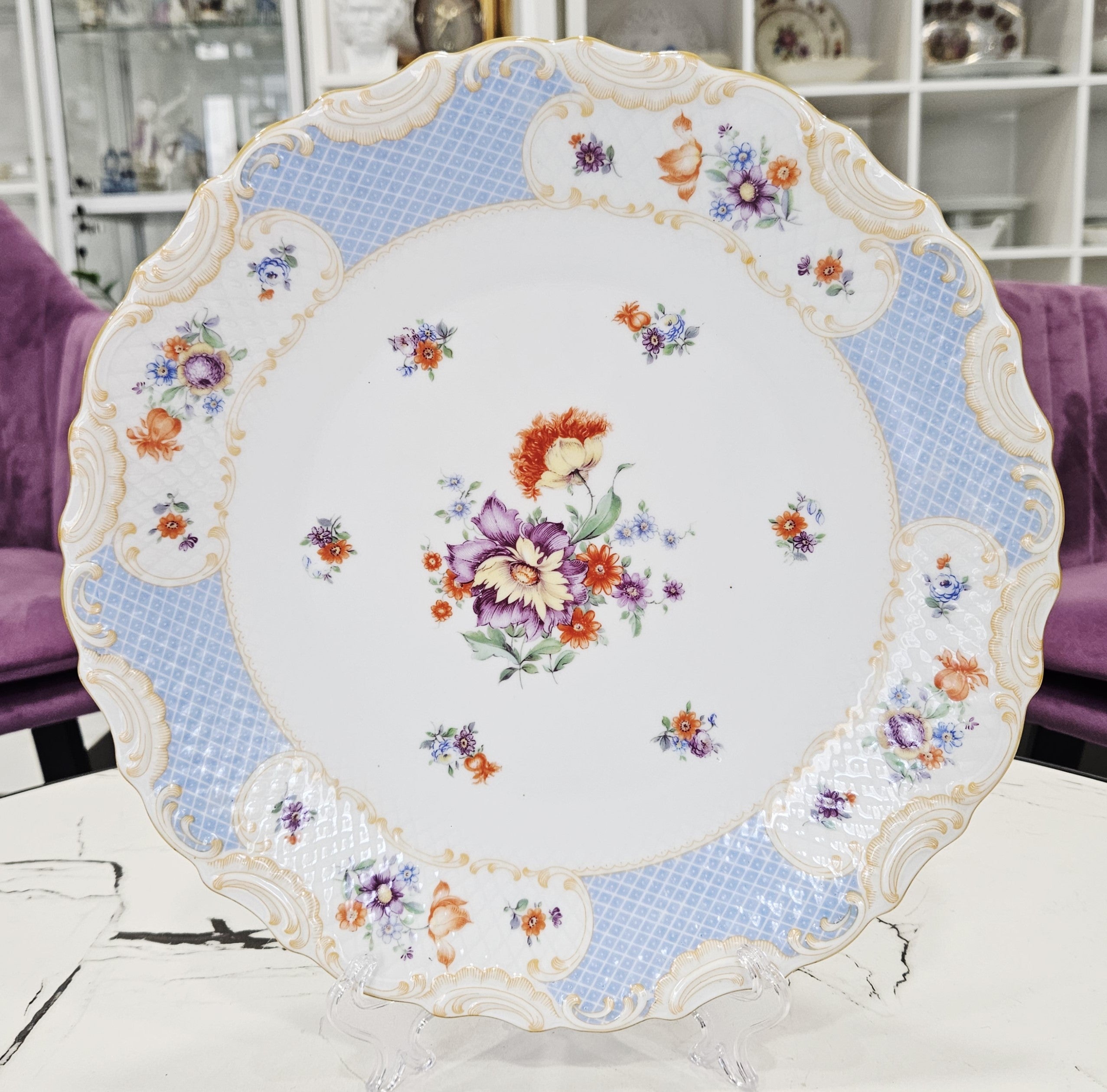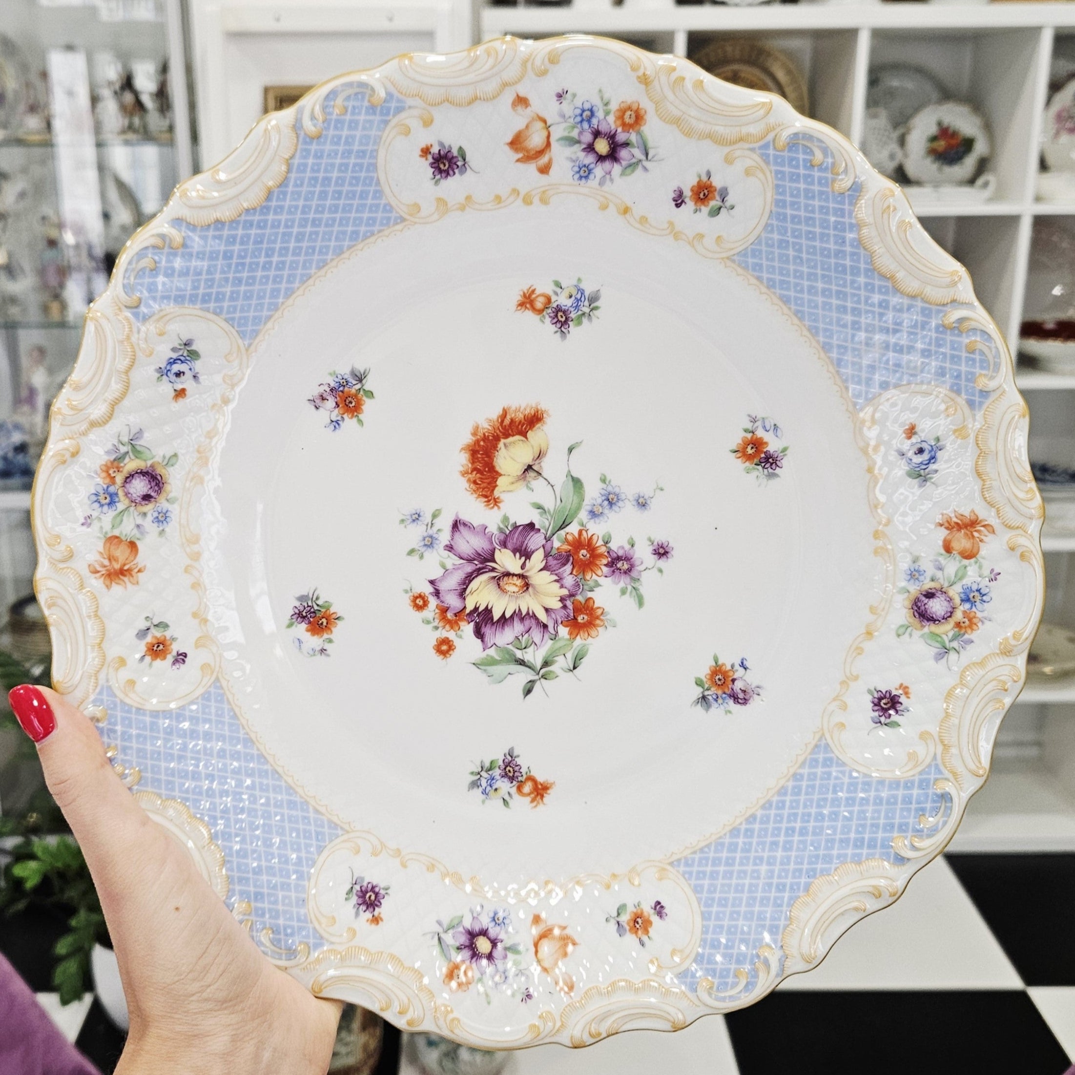 Vokiška Schumann Bavaria porceliano lėkštė – subtilios klasikos ir elegancijos derinys. Dekoruota gėlių puokštės motyvu centre ir švelniai mėlynos spalvos geometriniu fonu, puošta gelsvais ornamentais bei reljefiniais kraštais. Ši lėkštė išsiskiria kruopščiu piešiniu, švelniomis spalvomis ir preciziška meistryste, būdinga Bavariškam porcelianui. Puikus kolekcinis ar interjero akcentas, spinduliuojantis vokiško porceliano tradiciją ir kokybę.