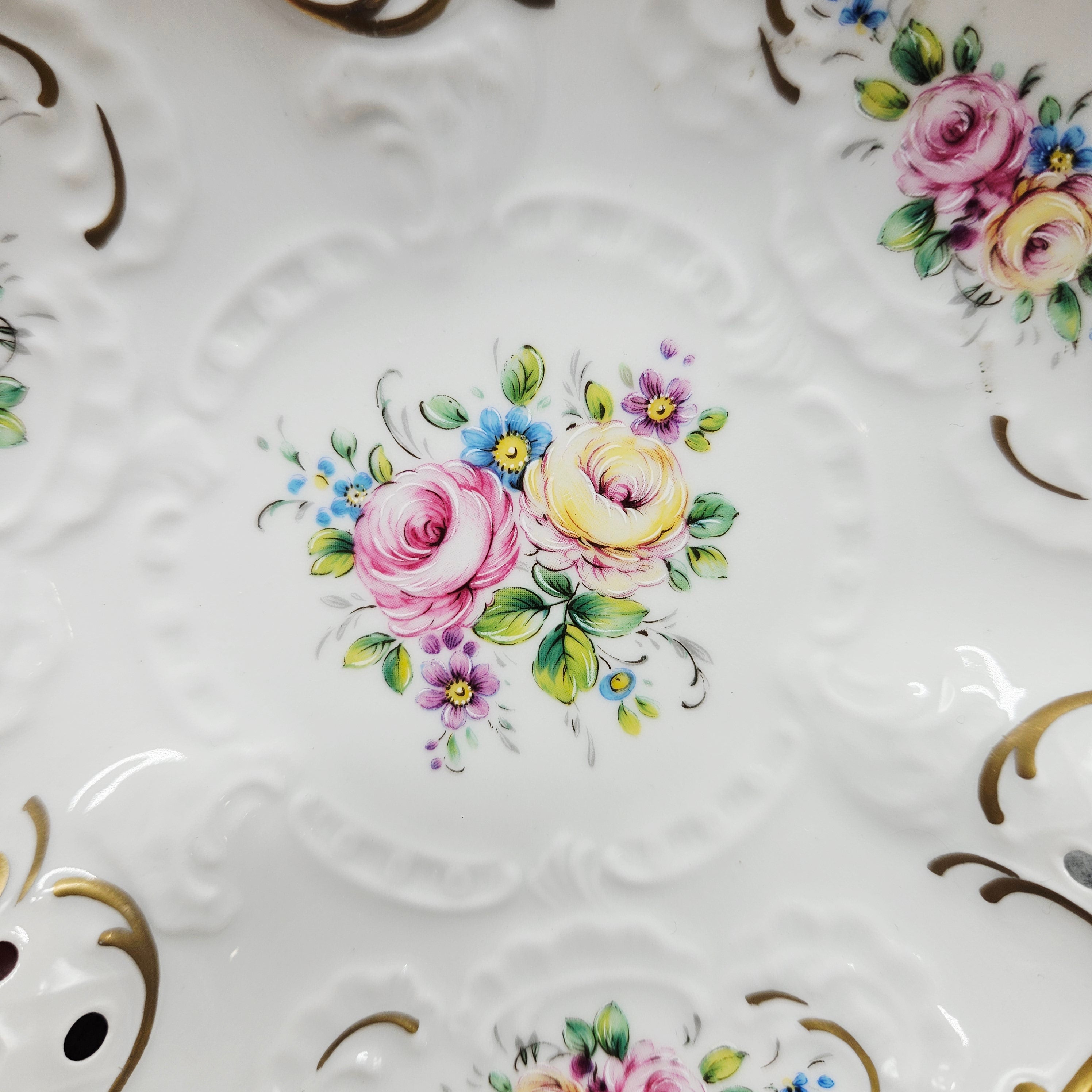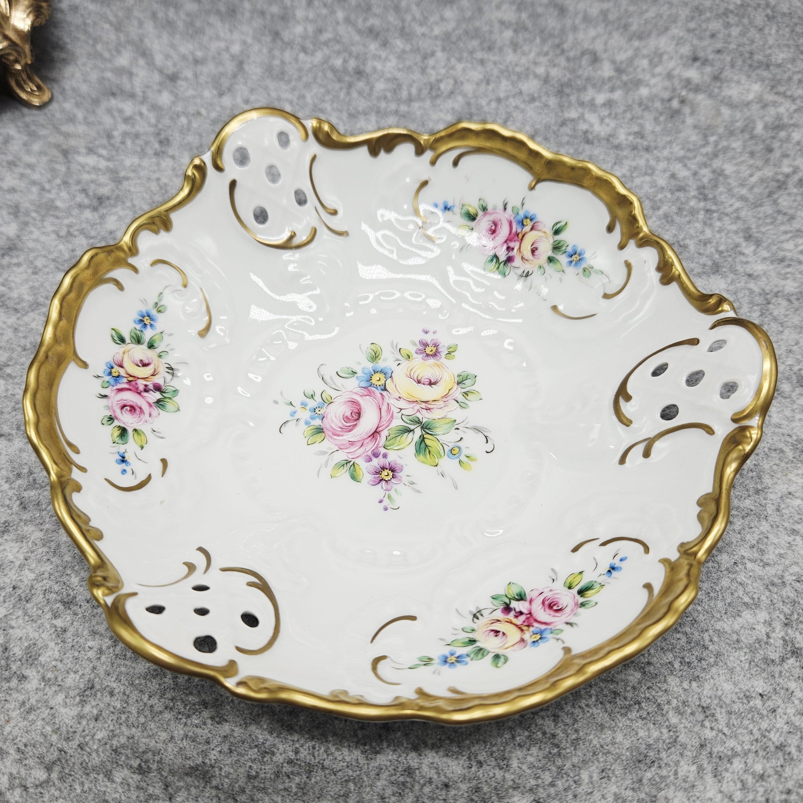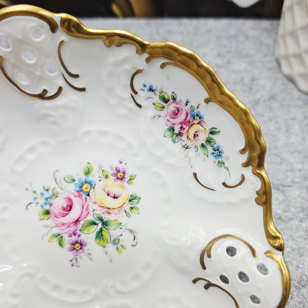 Elegantiška vokiška „Lindner Porzellan“ lėkštė, dekoruota rankomis tapytais rožių žiedais ir subtiliais mėlynais bei geltonais gėlių akcentais. Kraštai puošti prabangiu 24K aukso apvadu ir ažūriniais iškarpymais, suteikiančiais lengvumo ir rafinuotumo.