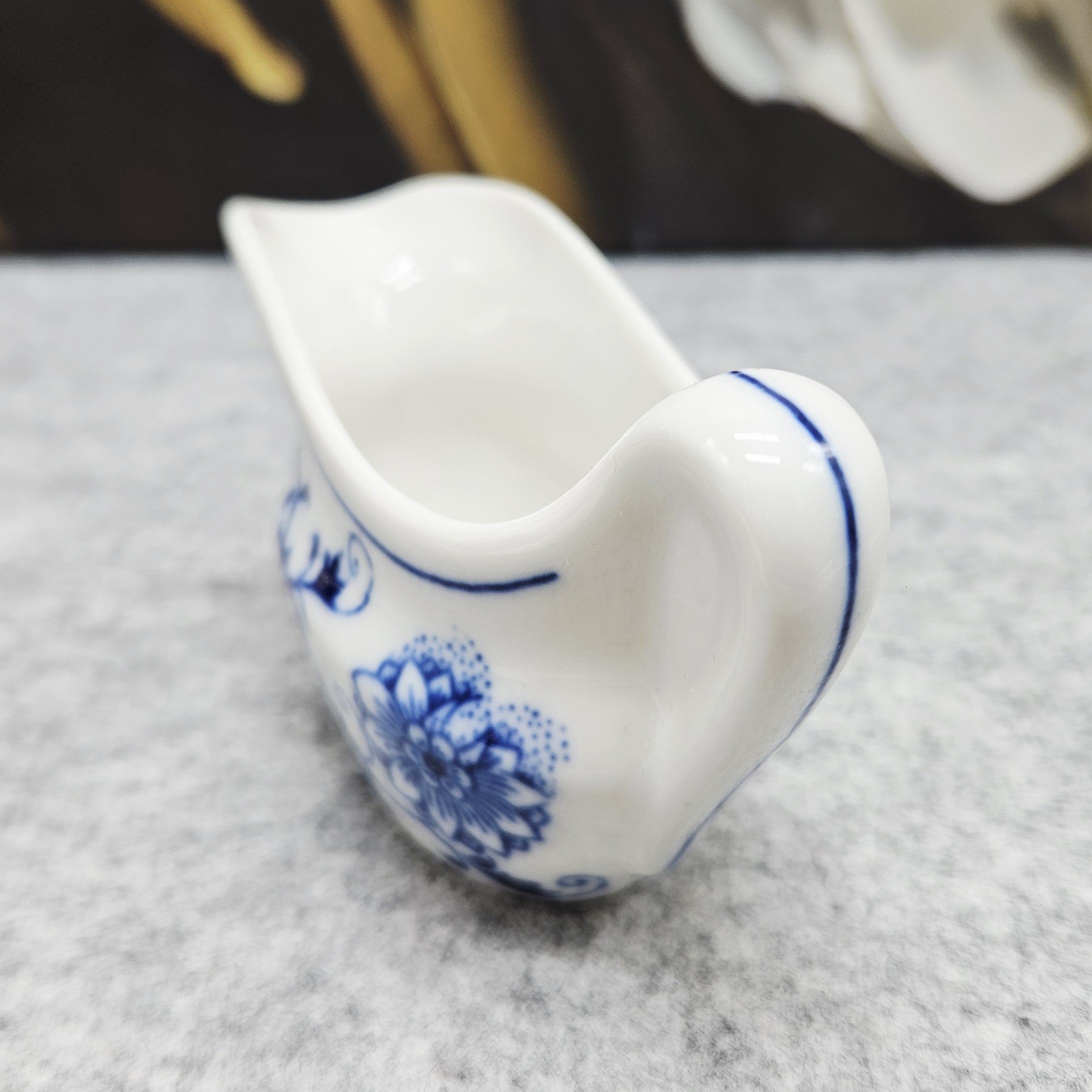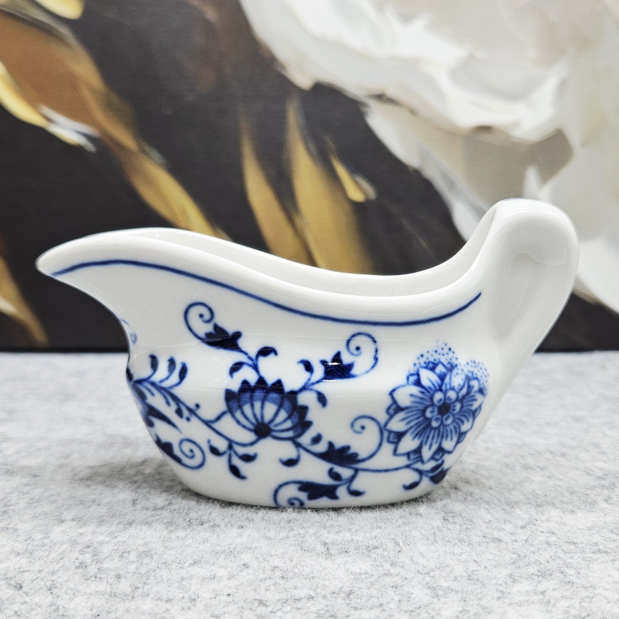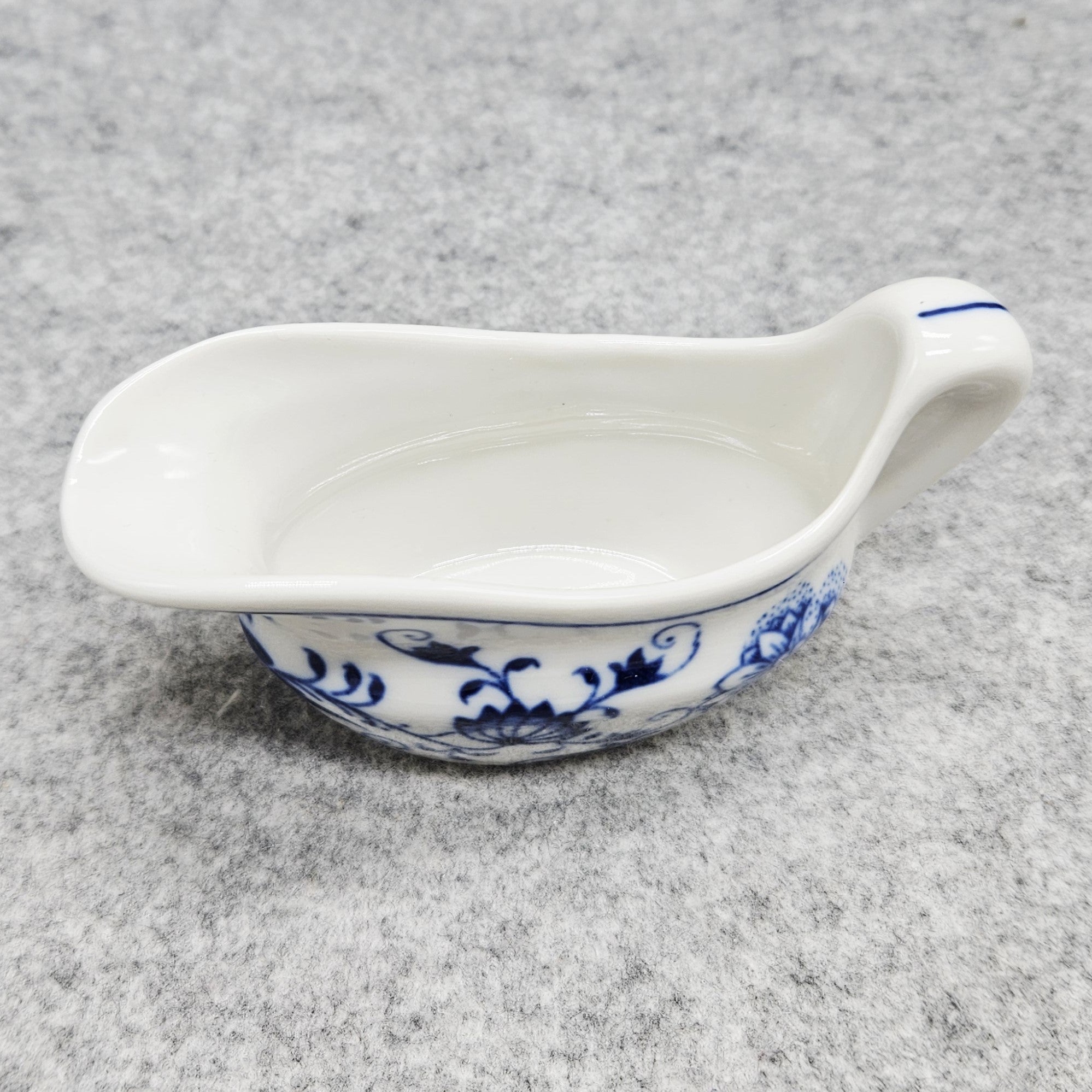 Nedidelis „D Czechoslovakia“ „Zwiebelmuster“ dizaino (mėlyno svogūno rašto) indelis padažui. Tai ne tik funkcionalus indas, bet ir tikra stalo puošmena, suteiksianti ypatingo žavesio kiekvienai progai!