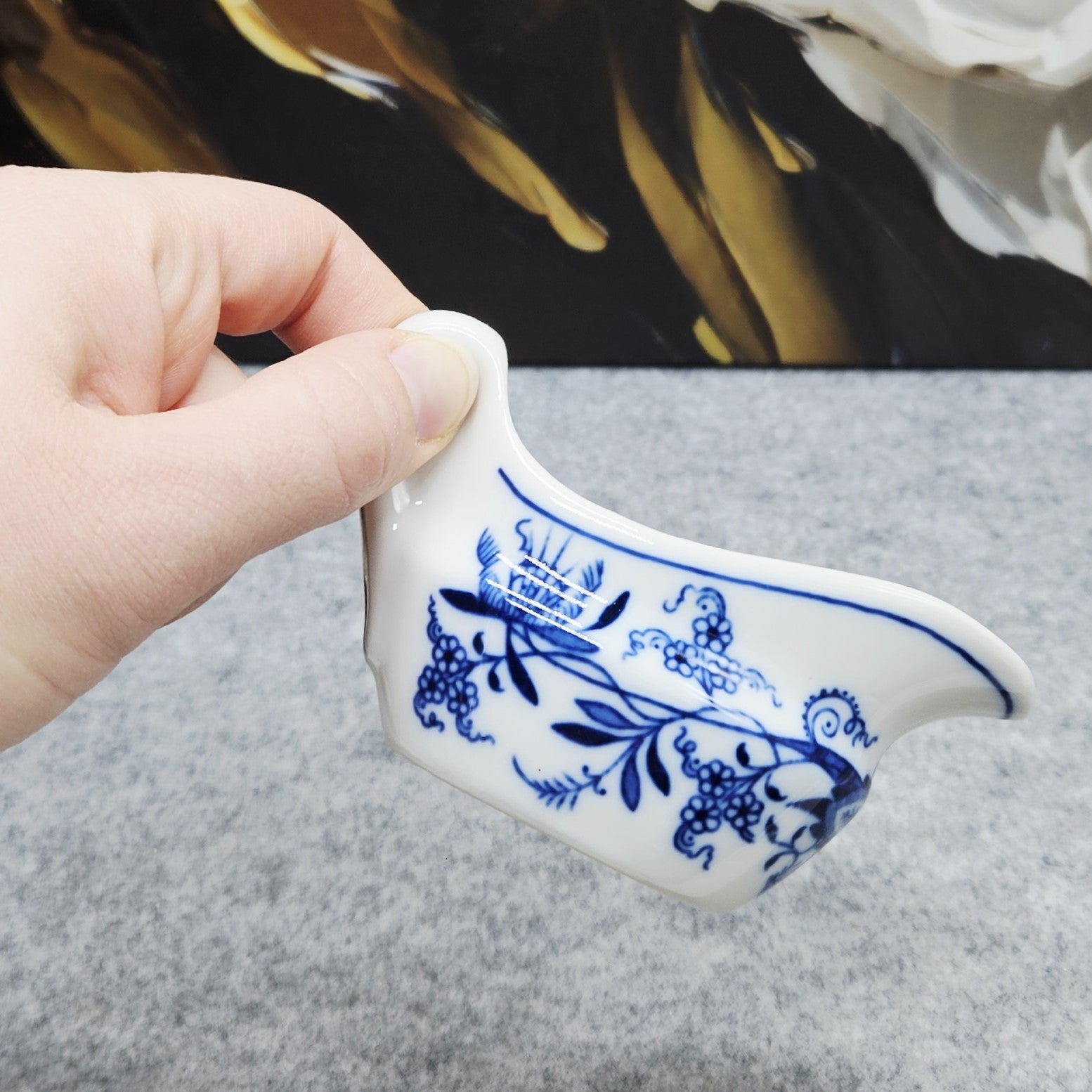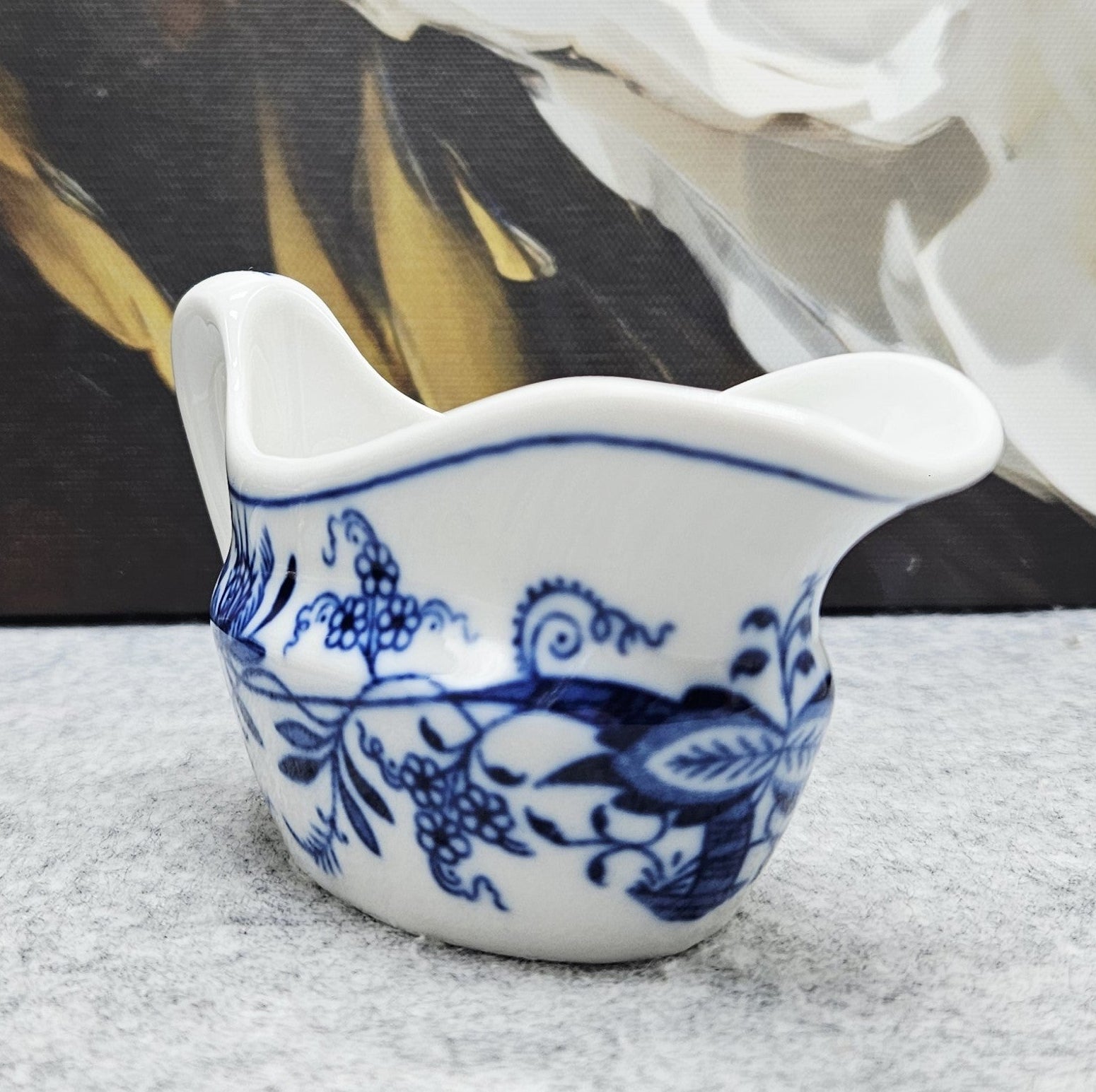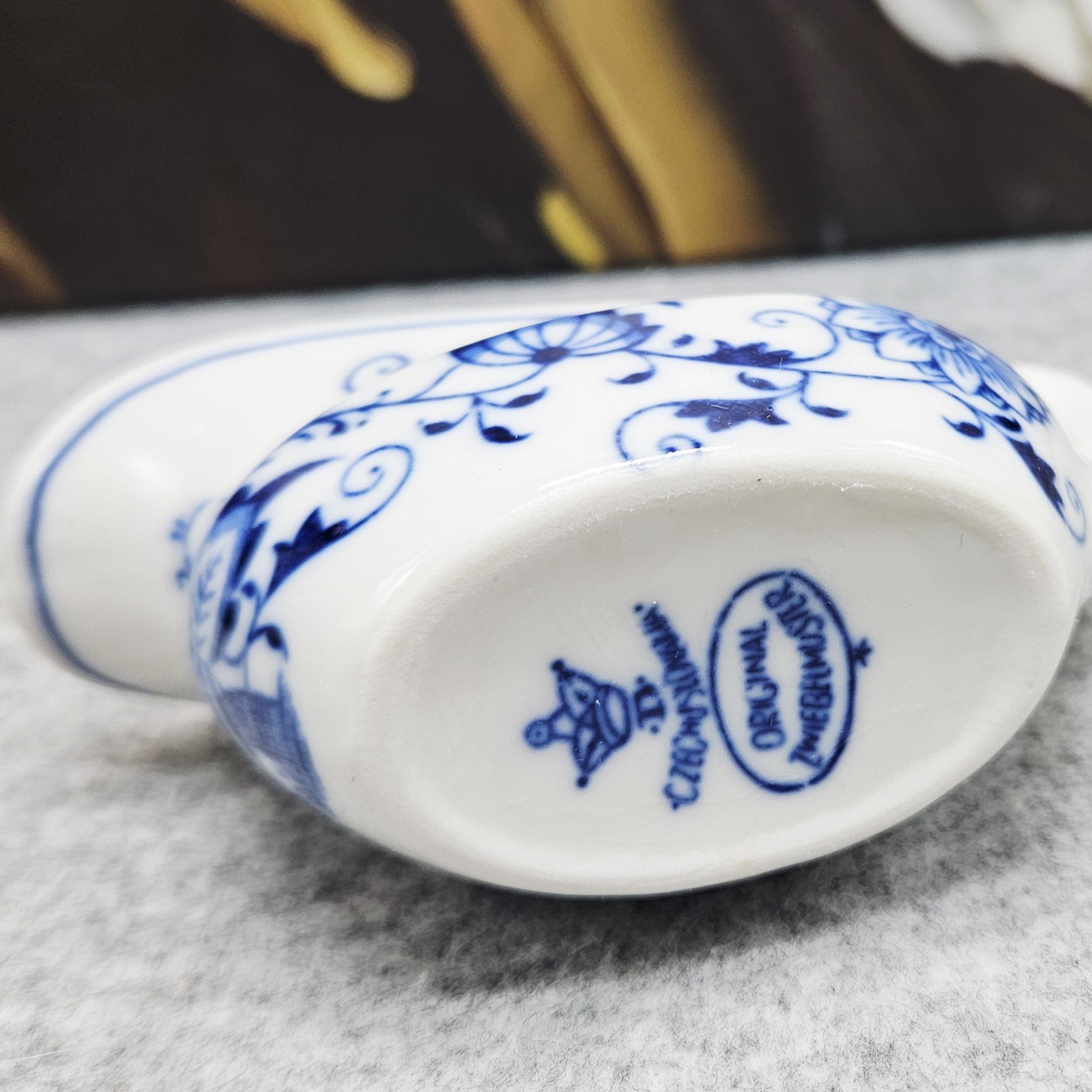 Nedidelis „D Czechoslovakia“ „Zwiebelmuster“ dizaino (mėlyno svogūno rašto) indelis padažui. Tai ne tik funkcionalus indas, bet ir tikra stalo puošmena, suteiksianti ypatingo žavesio kiekvienai progai!