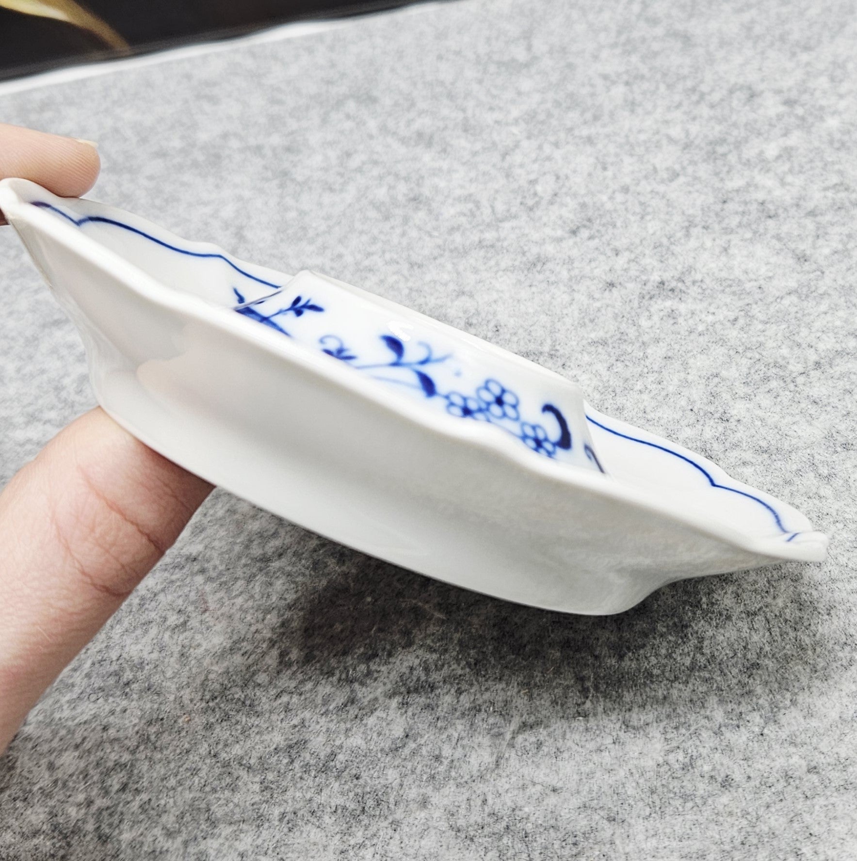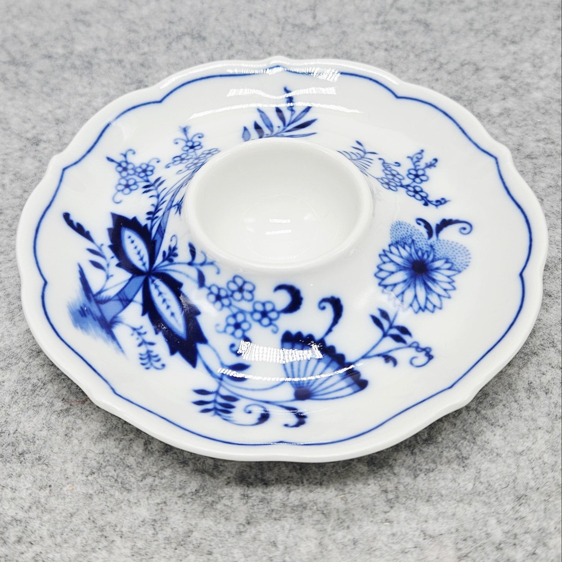 Nuostabus porceliano kiaušinio laikiklis/ lėkštute, dekoruota „Blau Zwiebelmuster“ (mėlynojo svogūno) raštu.