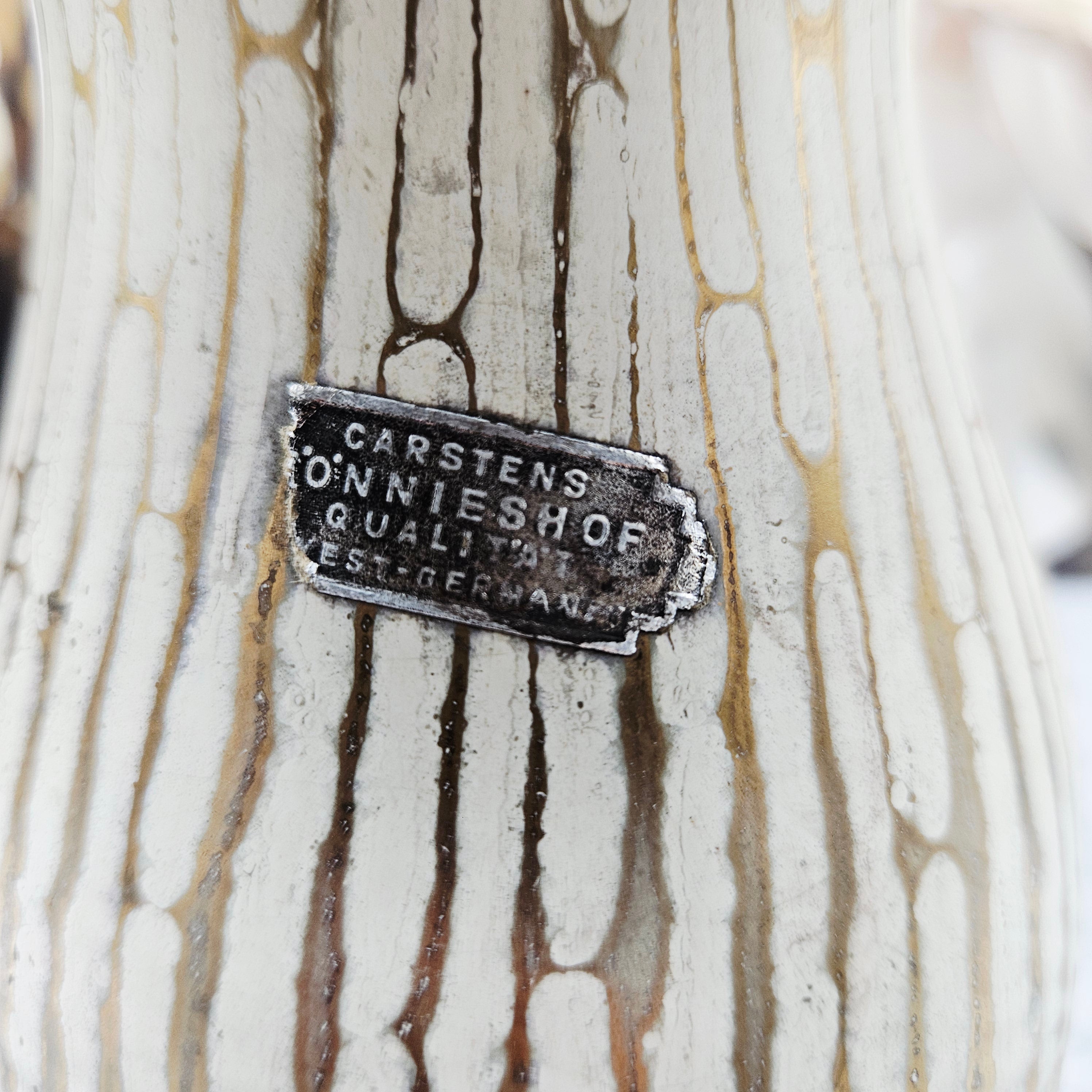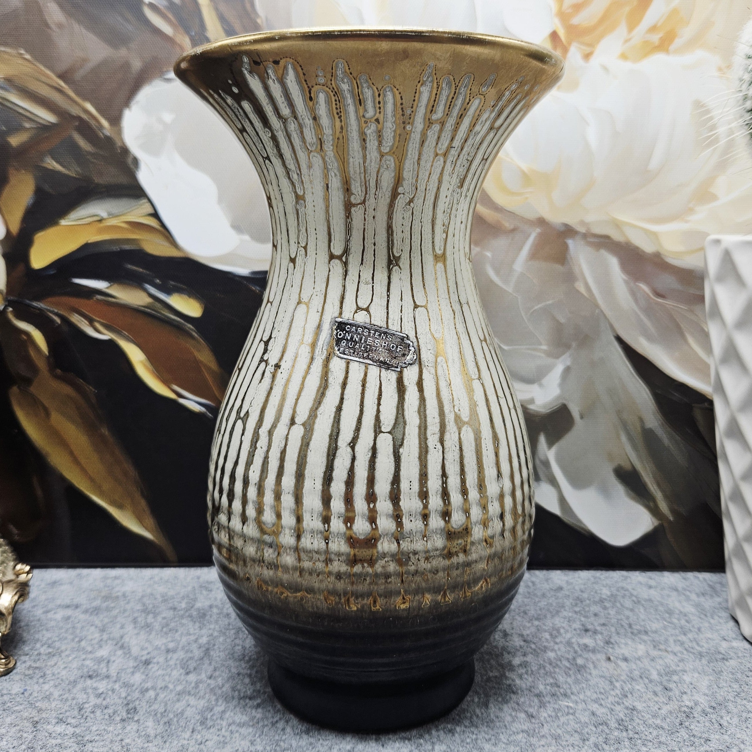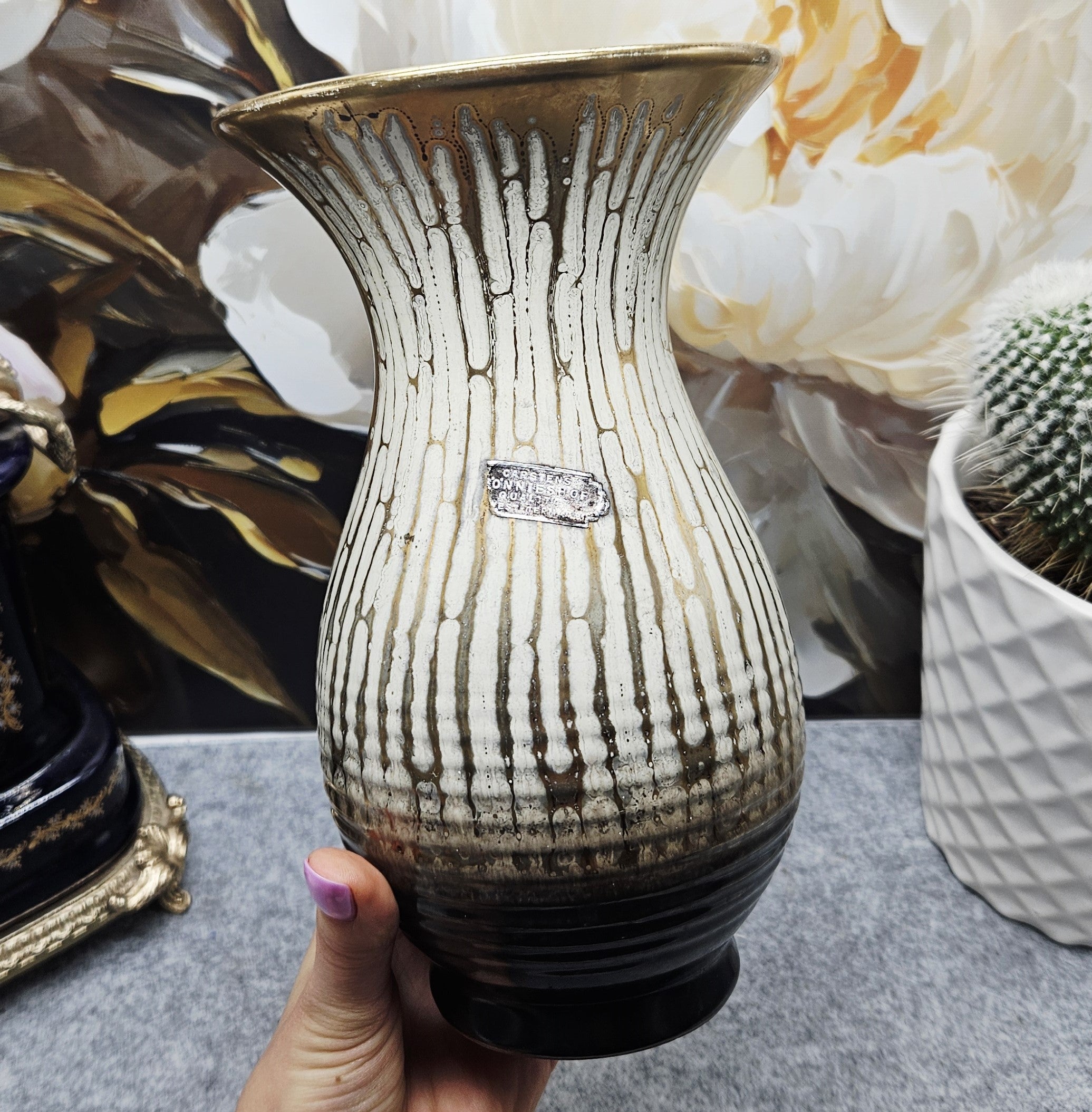 Įspūdinga vintažinė „Carstens Tönnieshof“ keraminė vaza – išraiškingos, organiškos formos ir subtilaus glazūros rašto kūrinys. Paviršių dengia lašančios, vertikalios glazūros linijos, pereinančios iš šviesaus smėlinio atspalvio į sodrų rudai-juodą toną, sukuriantį natūralų spalvų perėjimą ir gylį. Viršuje – šiltas auksinio molio atspalvis, suteikiantis elegancijos ir šilumos pojūtį.