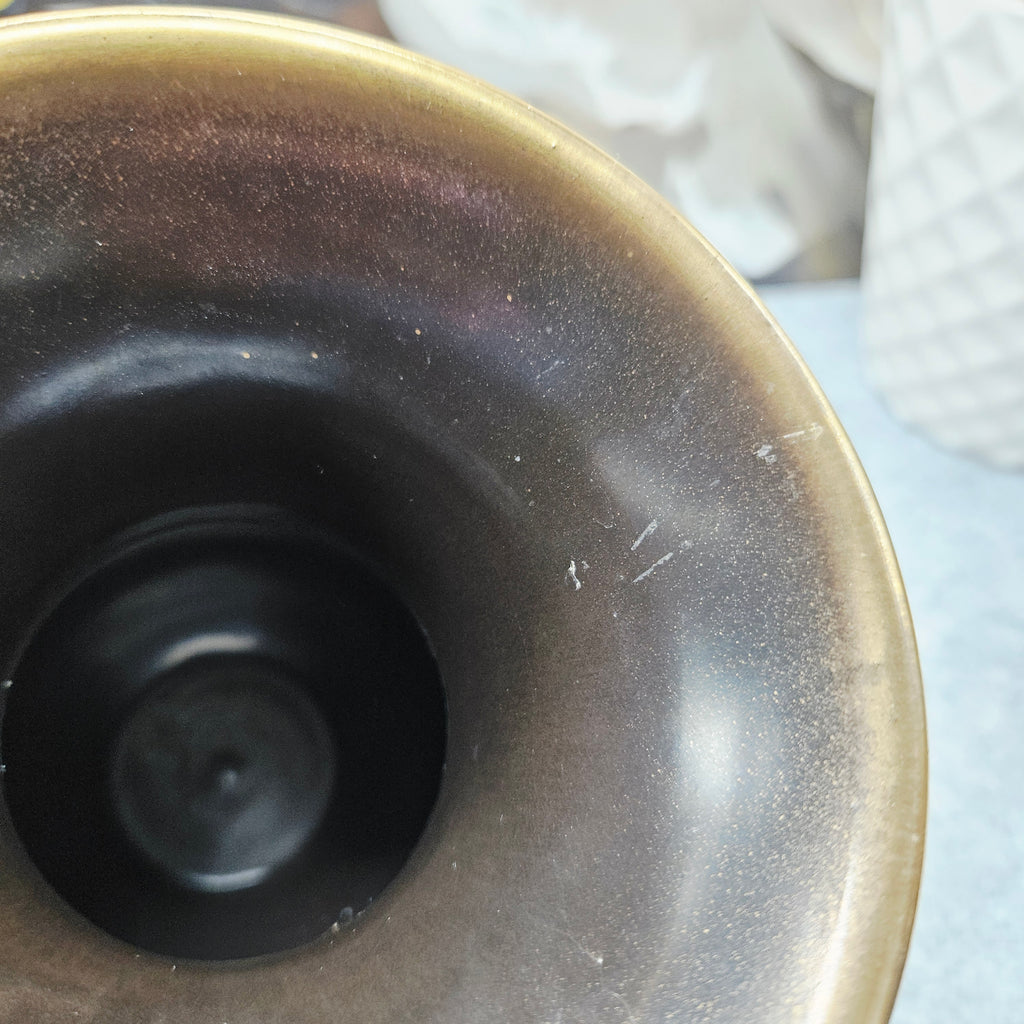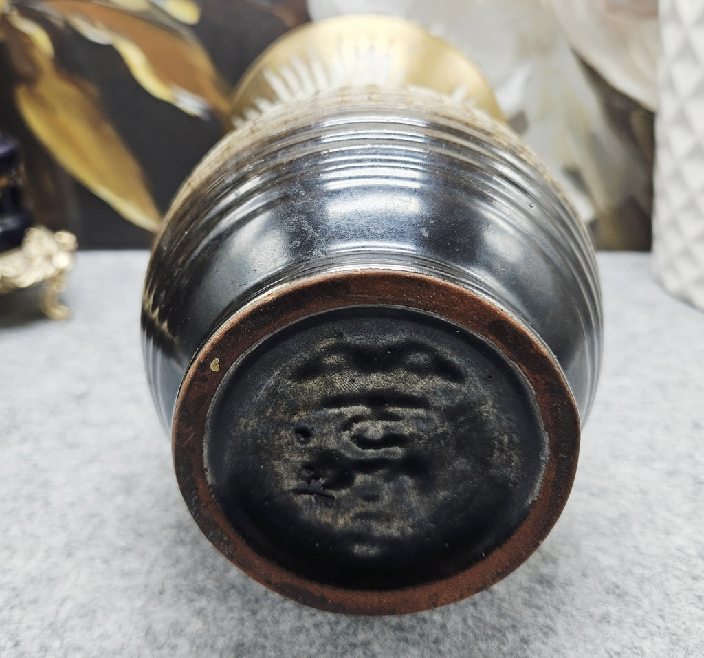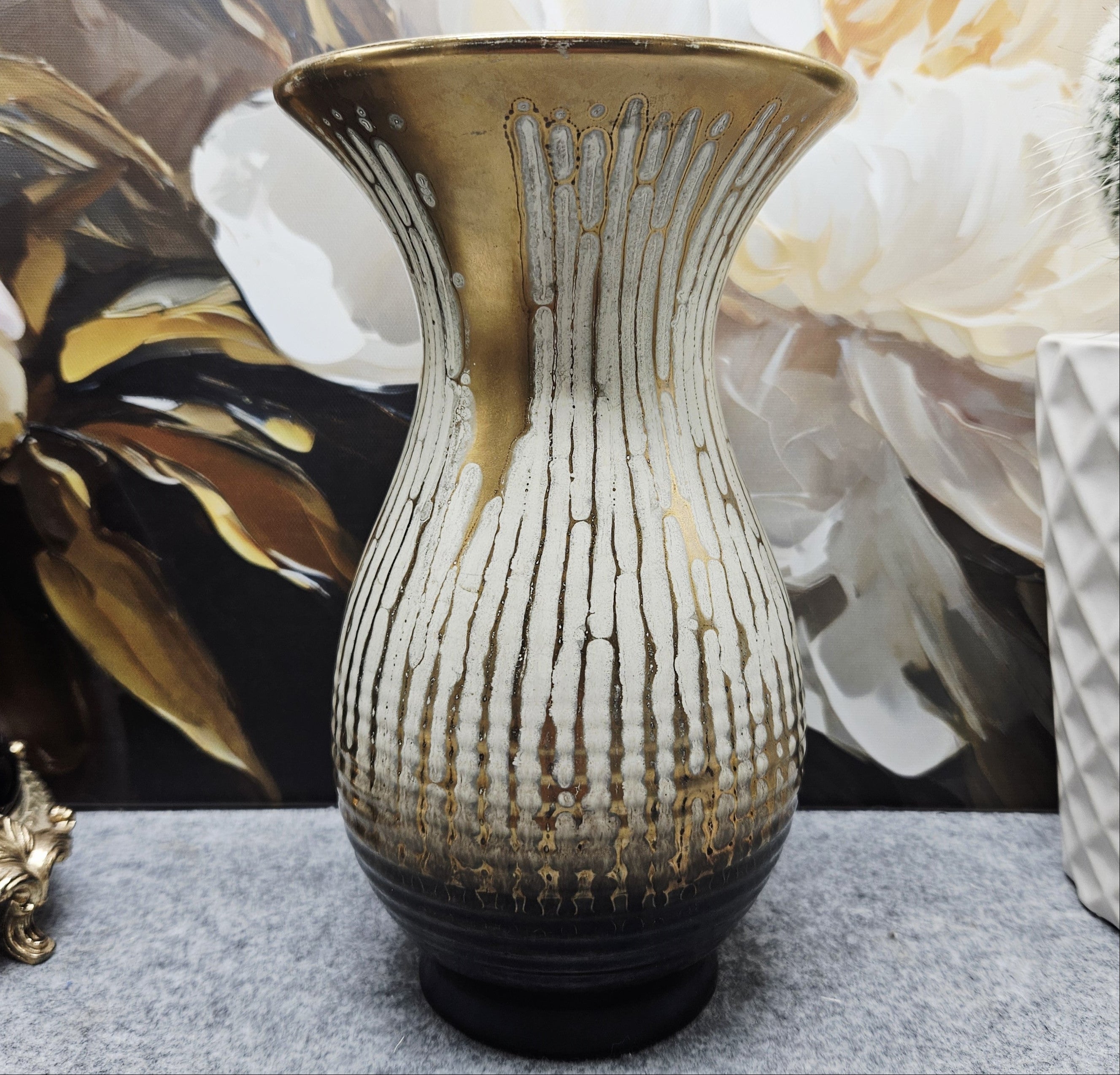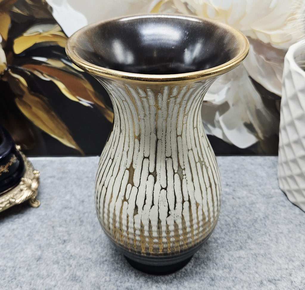 Įspūdinga vintažinė „Carstens Tönnieshof“ keraminė vaza – išraiškingos, organiškos formos ir subtilaus glazūros rašto kūrinys. Paviršių dengia lašančios, vertikalios glazūros linijos, pereinančios iš šviesaus smėlinio atspalvio į sodrų rudai-juodą toną, sukuriantį natūralų spalvų perėjimą ir gylį. Viršuje – šiltas auksinio molio atspalvis, suteikiantis elegancijos ir šilumos pojūtį.