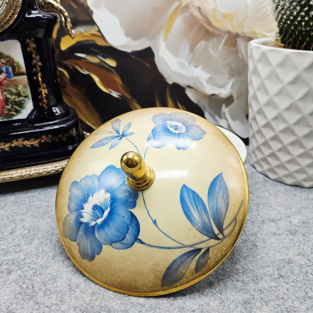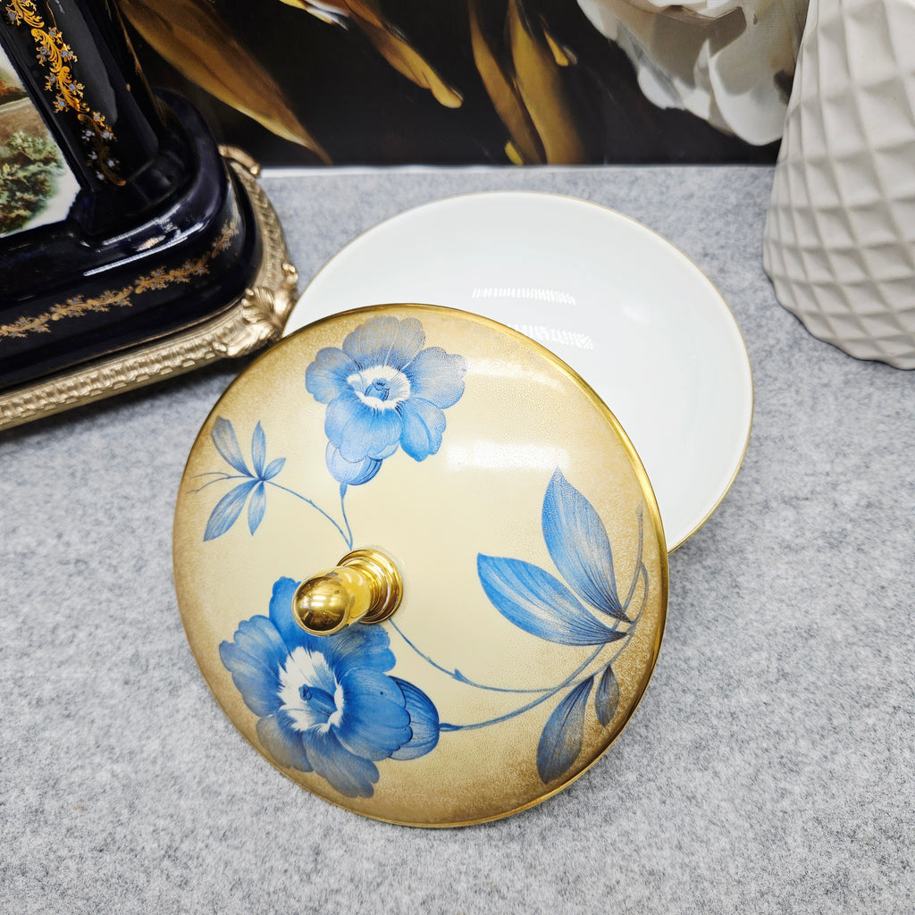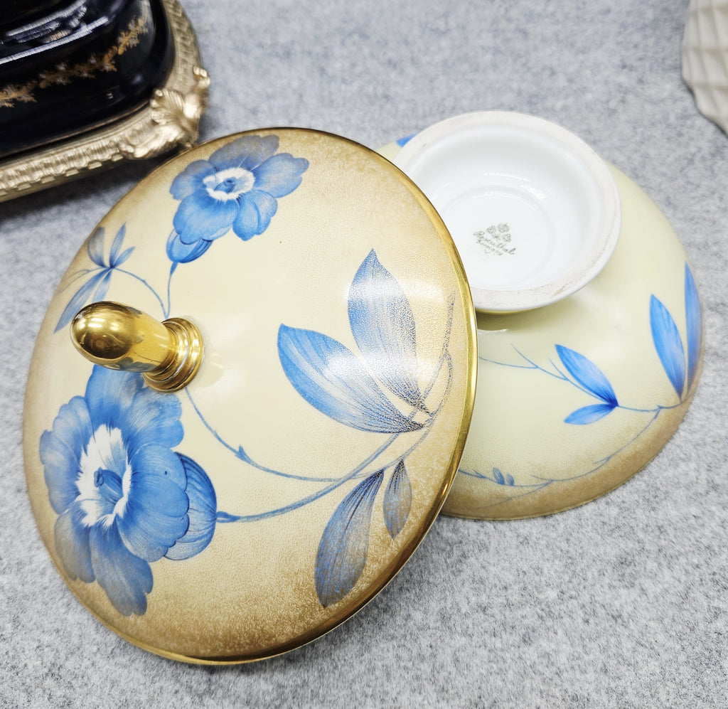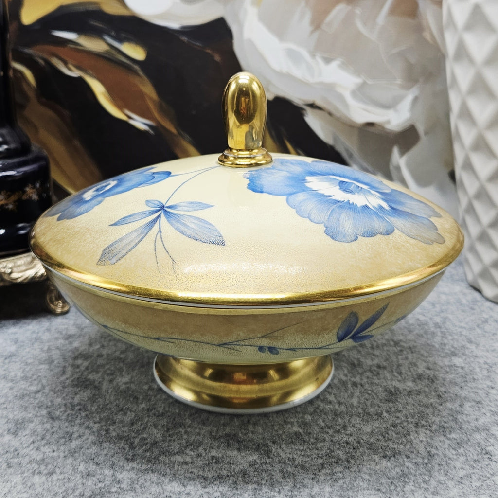Išskirtinė vokiško porceliano Rosenthal saldaininė su dangteliu. Indas dekoruotas mėlynomis gėlėmis ant švelniai gelsvo fono, pereinančio į auksinį atspalvį. Kraštai, pagrindas ir dangtelio rankenėlė auksuoti.