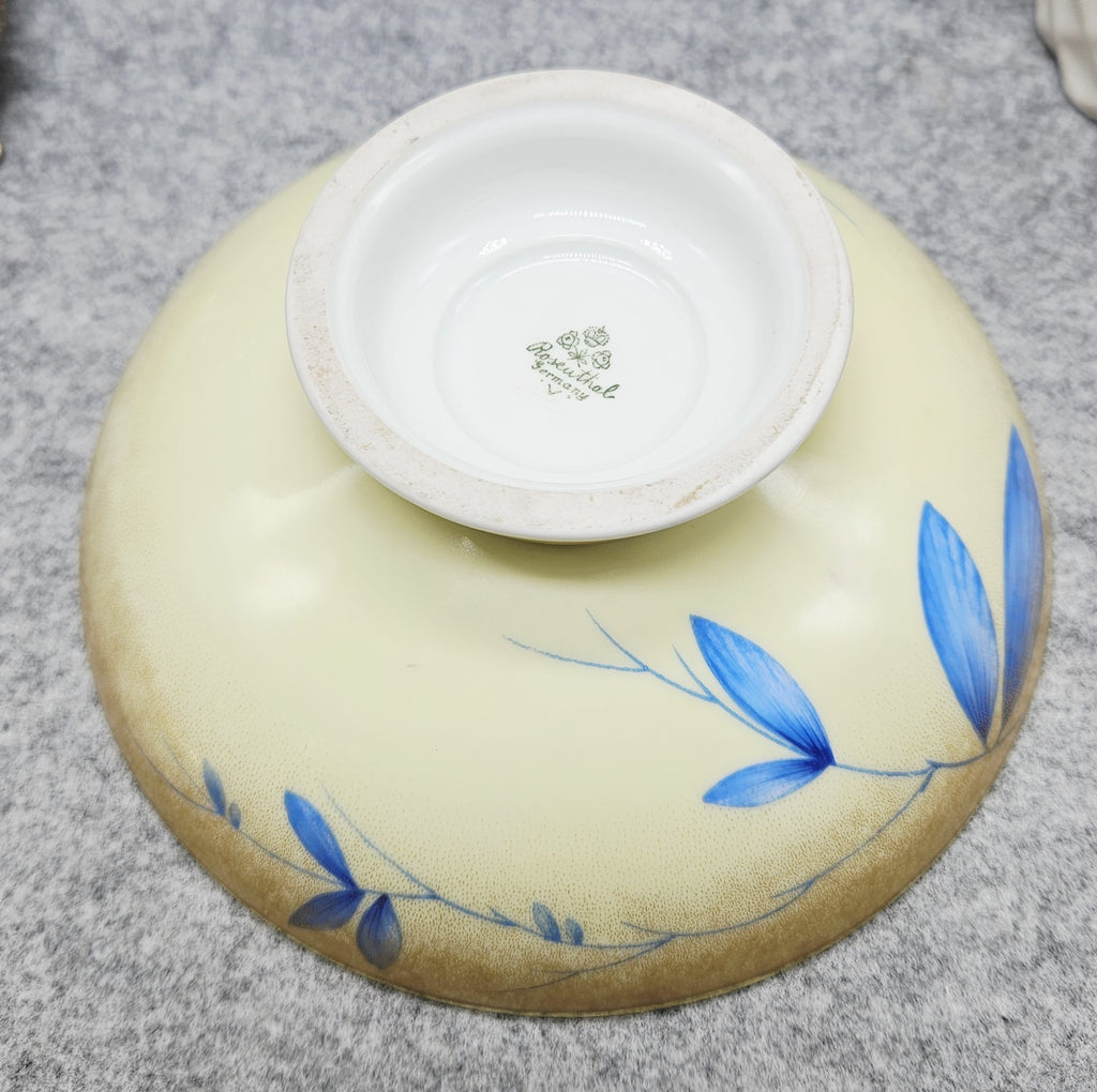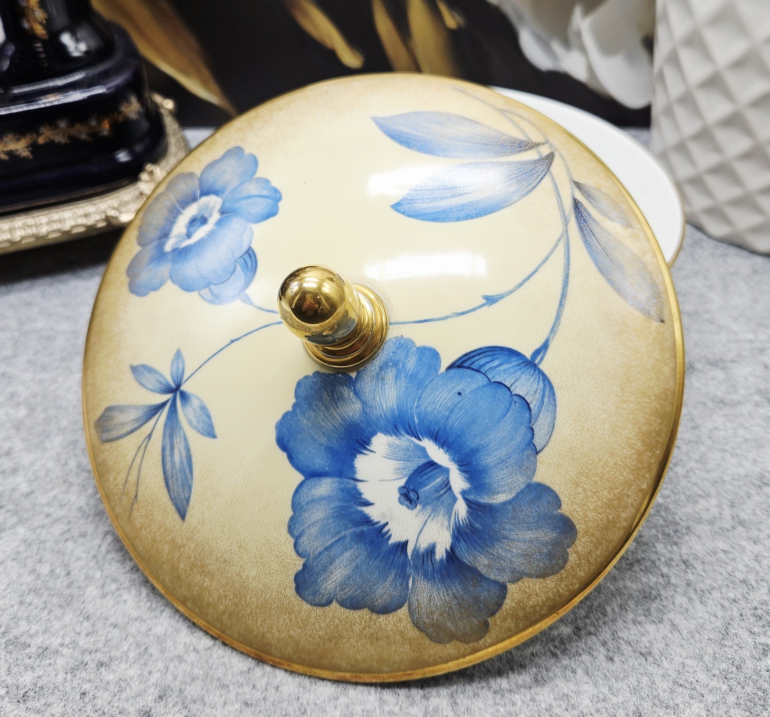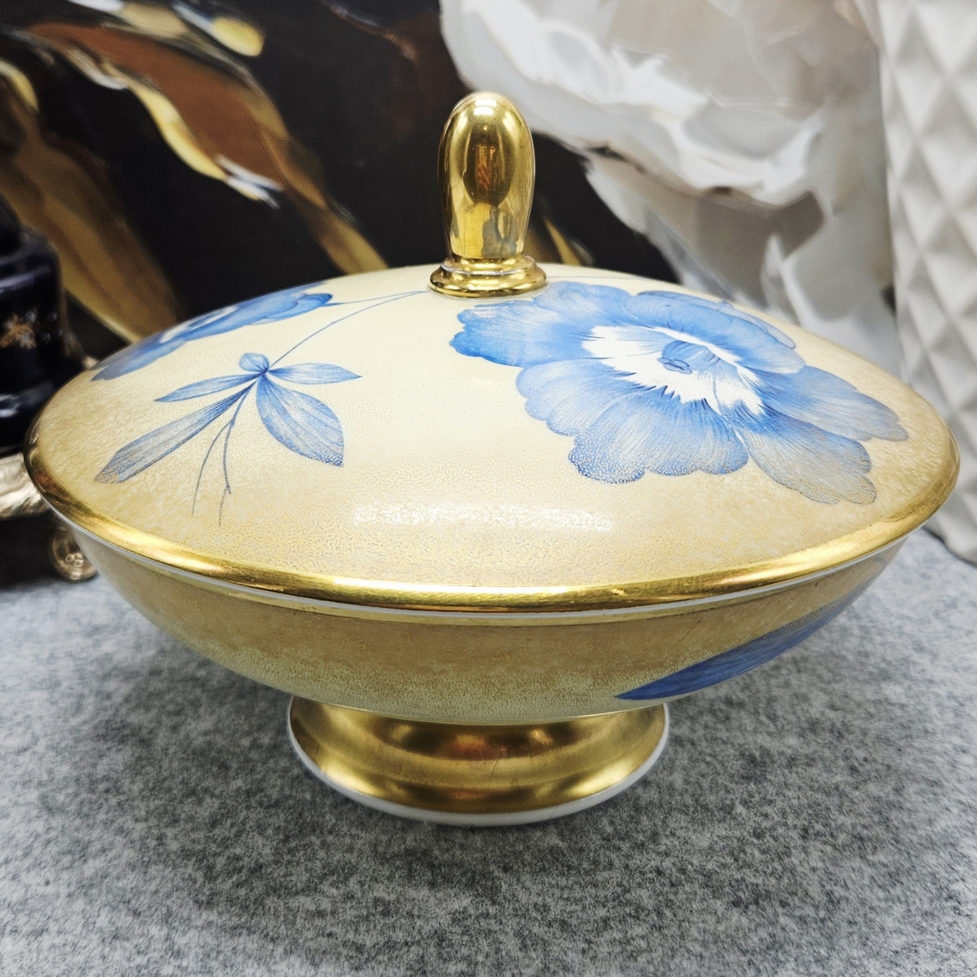 Išskirtinė vokiško porceliano Rosenthal saldaininė su dangteliu. Indas dekoruotas mėlynomis gėlėmis ant švelniai gelsvo fono, pereinančio į auksinį atspalvį. Kraštai, pagrindas ir dangtelio rankenėlė auksuoti.