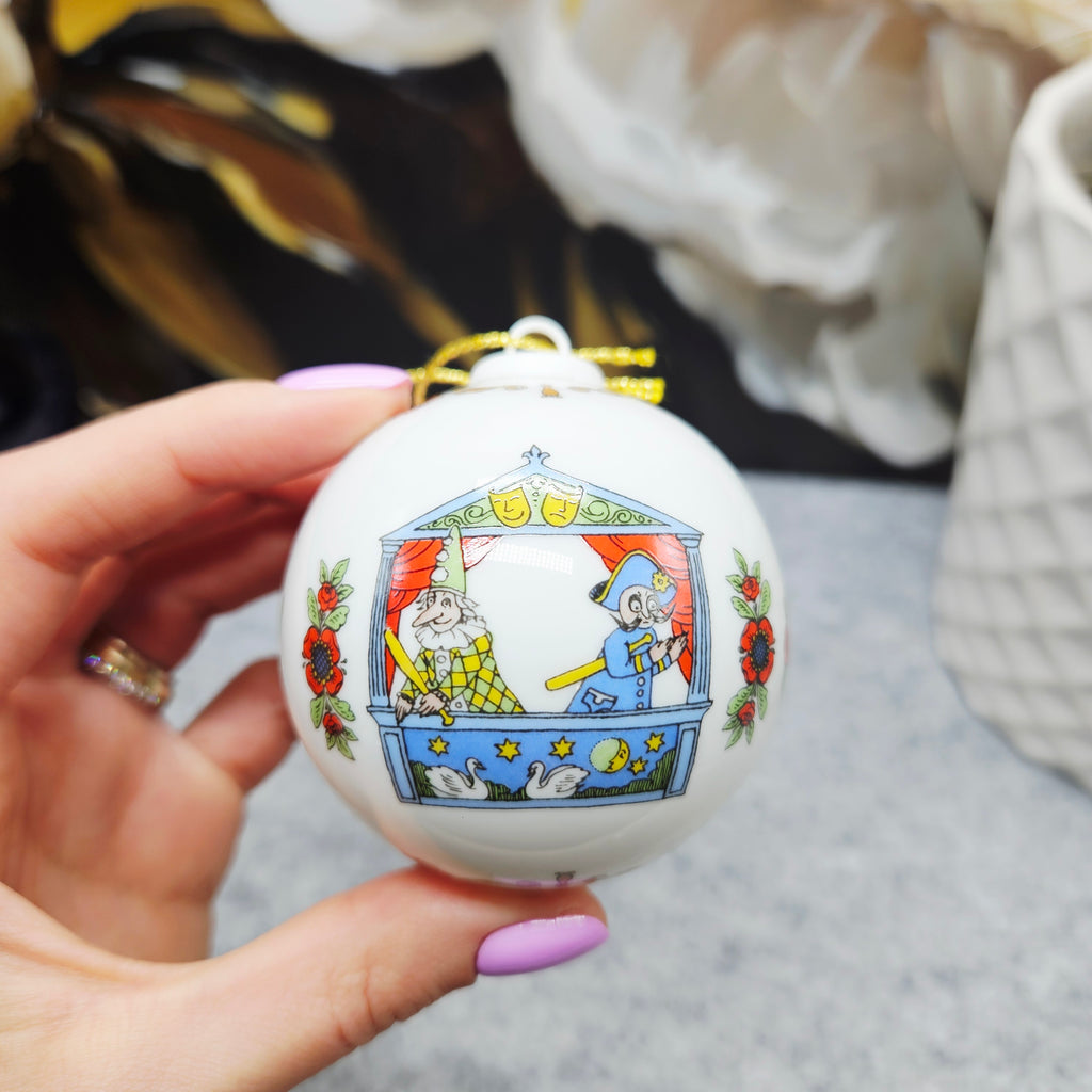 Kolekcinis Hutschenreuther kalėdinis burbulas iš 1987 m., sukurtas menininko Ole Winther. Dekoruotas švelniomis, pasakiškomis iliustracijomis – vaikystės teatro ir žaislų motyvais. Pagamintas iš aukštos kokybės porceliano, puoštas auksinėmis detalėmis.