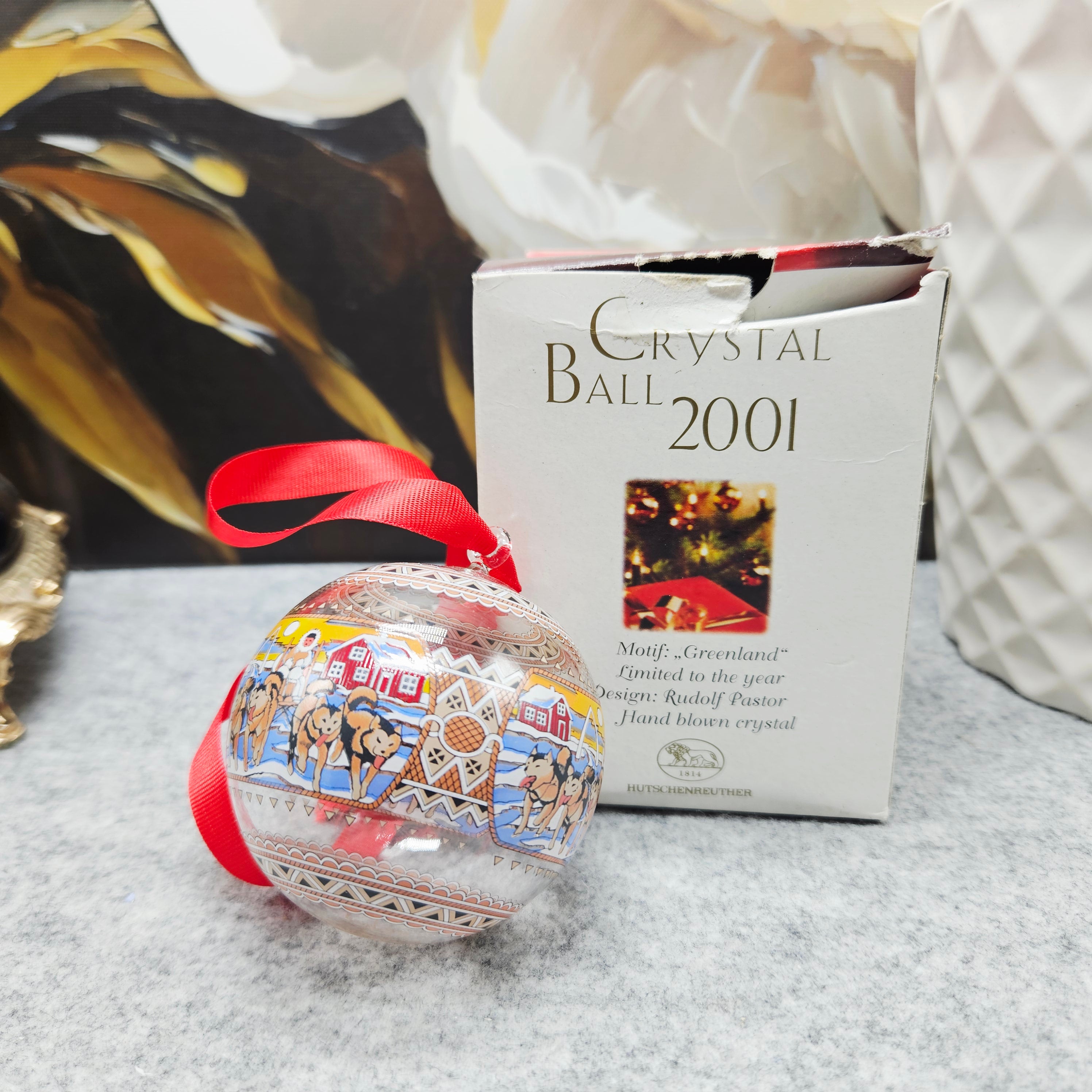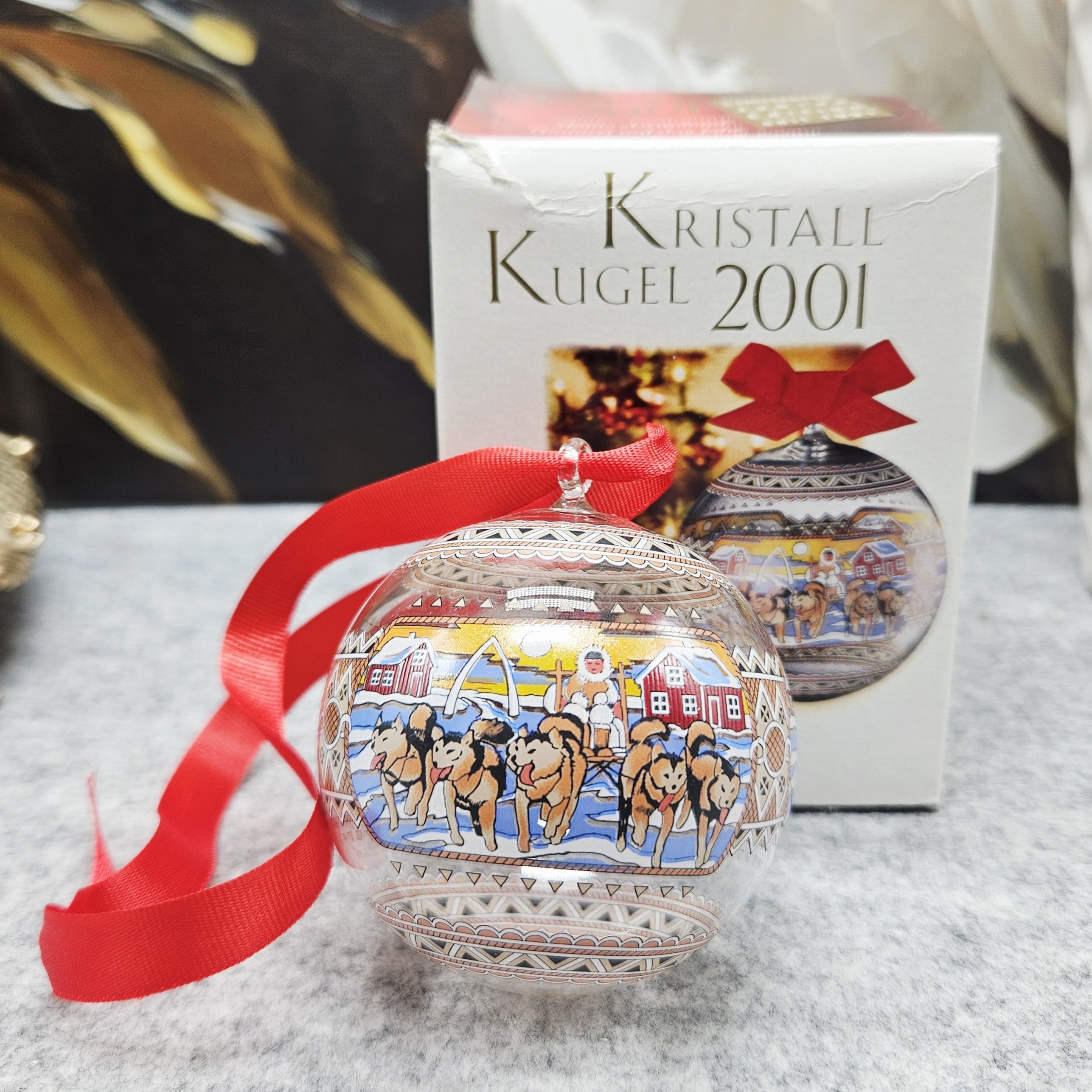 Išskirtinė „Hutschenreuther“ 2001 m. kolekcinė krištolinė Kalėdinė dekoracija su originalia dėžute. Motyvas „Greenland / Grenlandija“, dizainas Rudolf Pastor – rankų darbo pūstas krištolas dekoruotas šiaurietiška žiemos scena su šunų kinkiniais, spalvingais nameliais ir tradiciniais ornamentais. Ryškūs, gyvi piešiniai ir detalus dekoro atlikimas perteikia autentišką Grenlandijos kultūros ir žiemos atmosferos nuotaiką. Tai limituoto leidimo, kolekcionierių vertinamas akcentas – puikus pasirinkimas Kalėdinei kolekcijai papildyti arba ypatingai, šventinei dovanai.