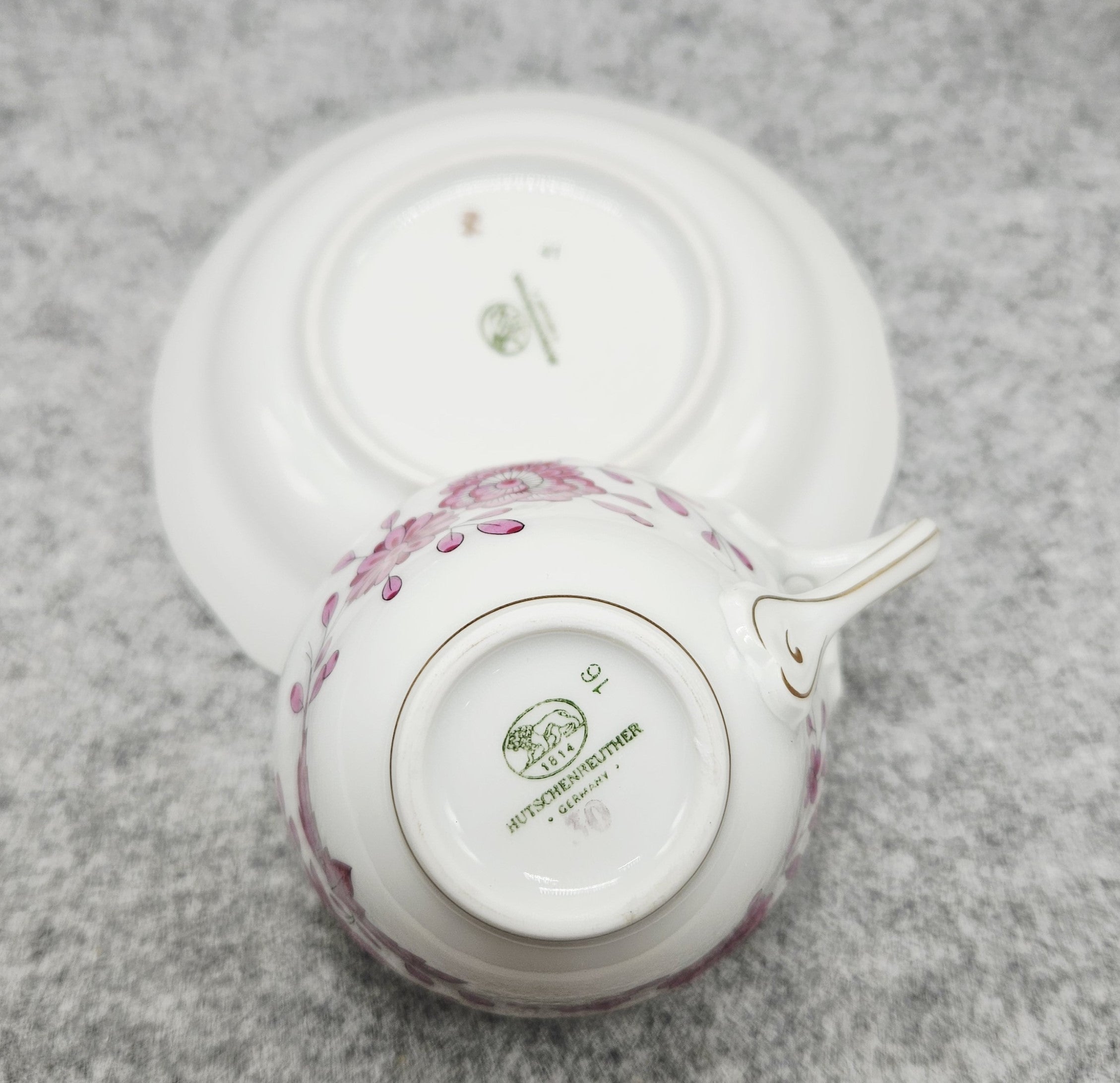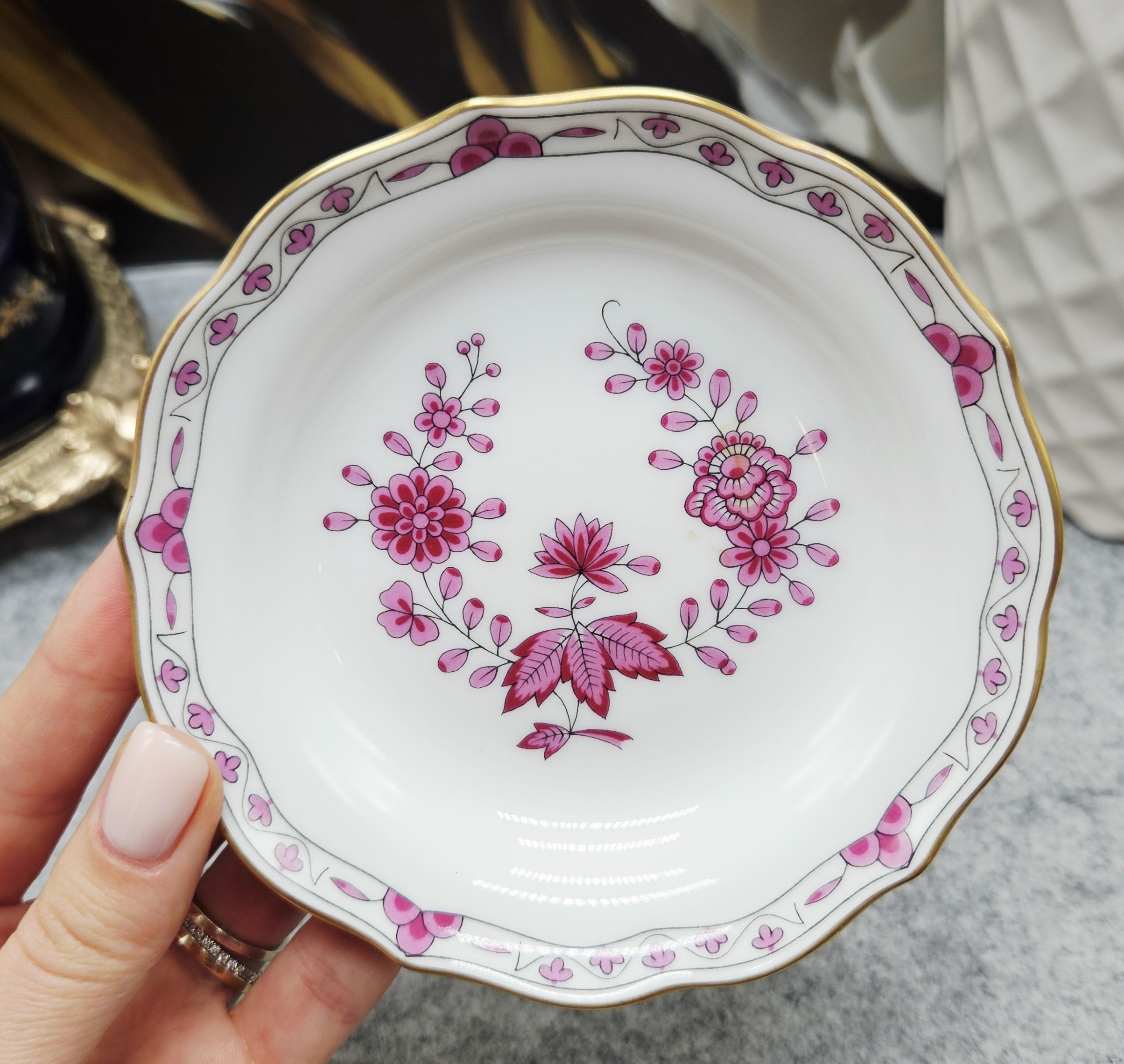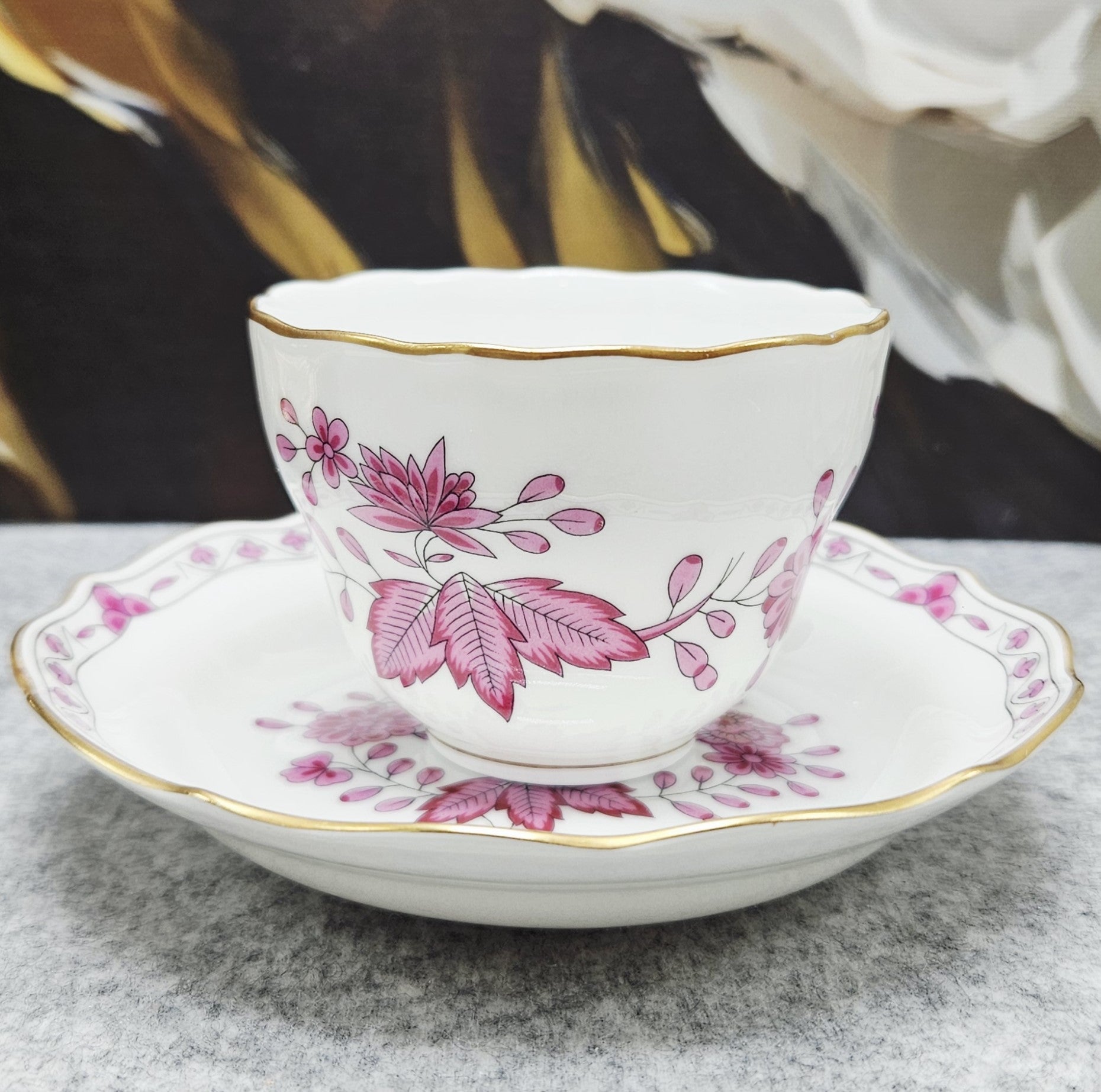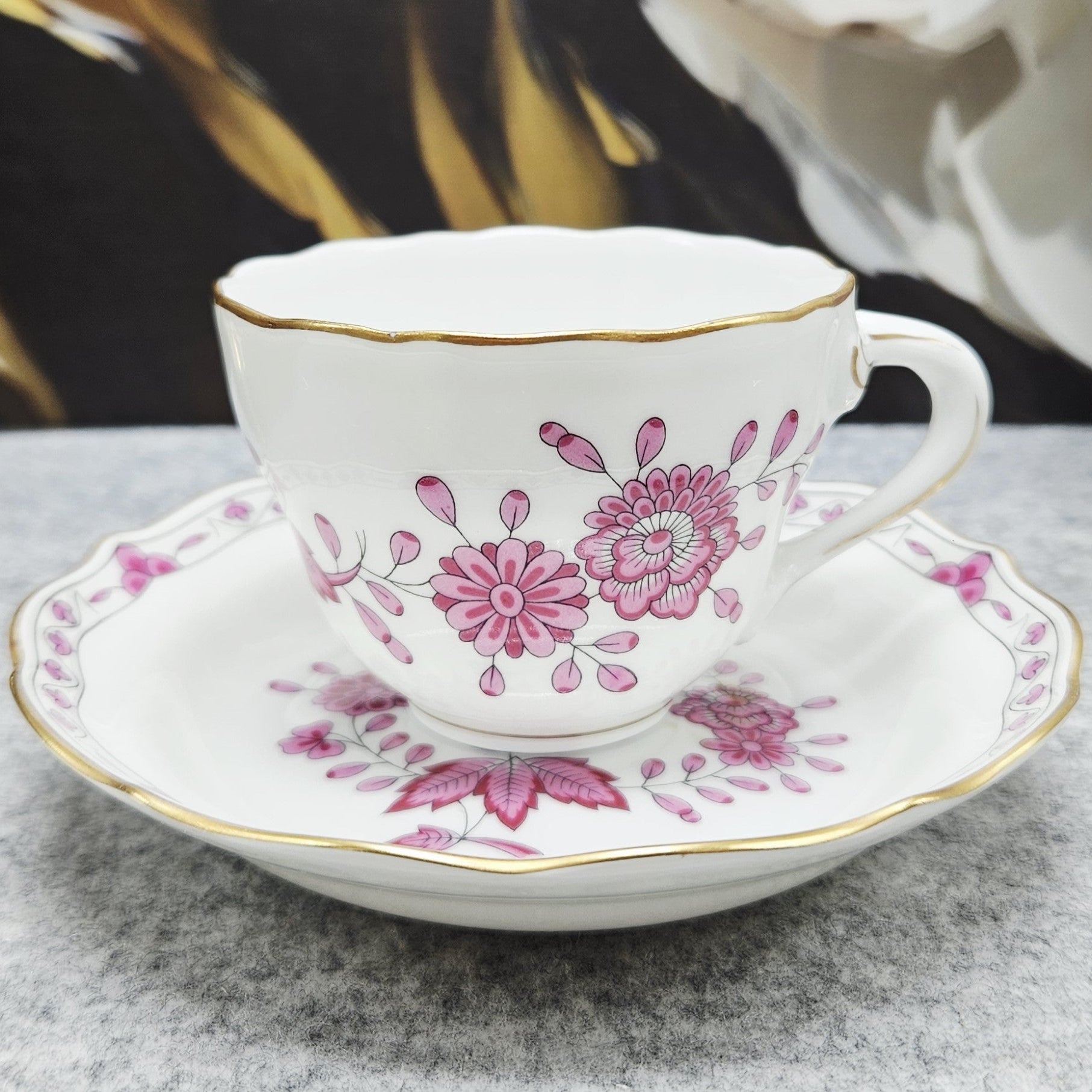 Puikus, balto porceliano puodelis, dekoruotas rožinių gėlių ir lapelių ornamentais, o paauksuoti krašteliai suteikia dar daugiau elegancijos ir rafinuotumo. Puodelio puošmena – išskirtinė, auksuota rankenėlė.