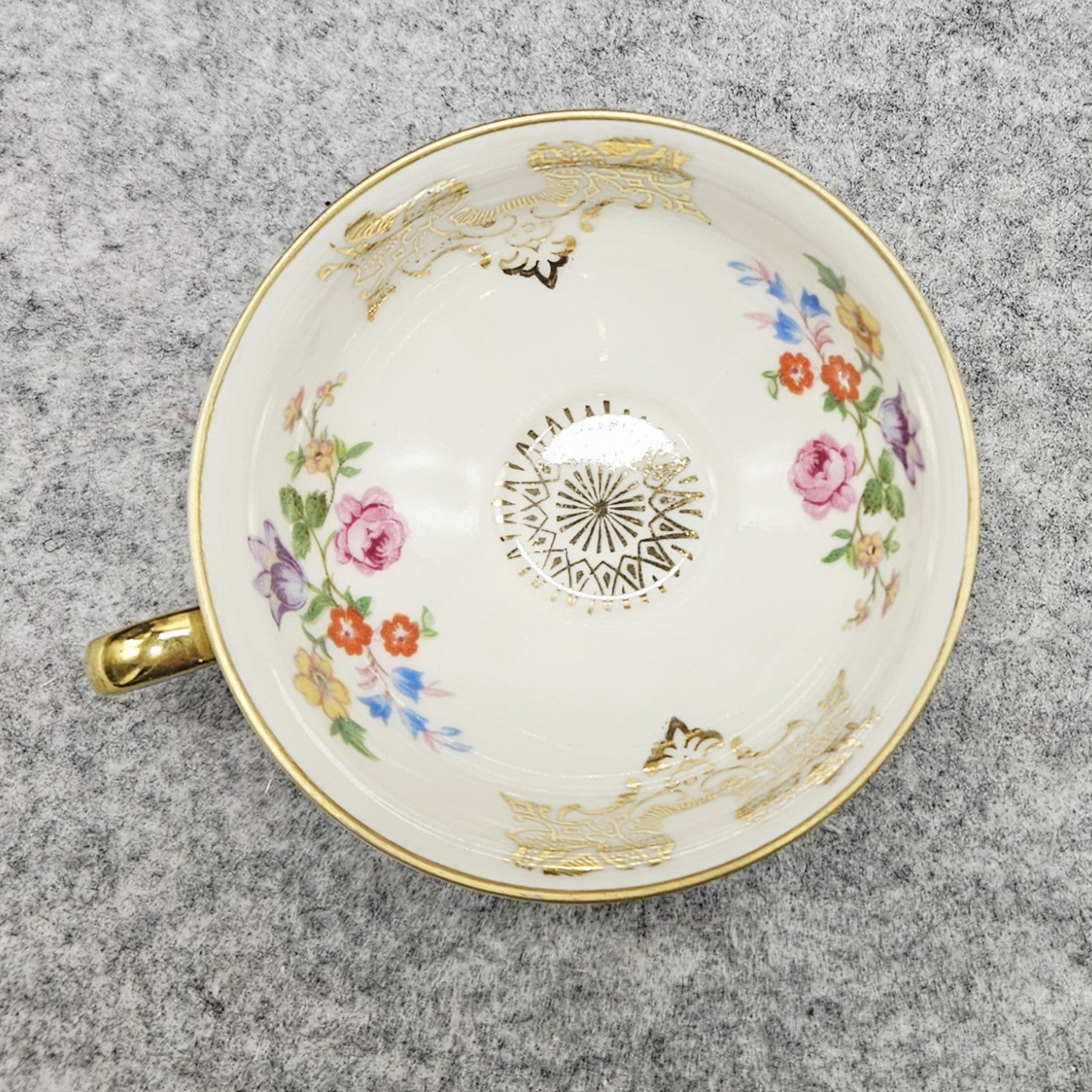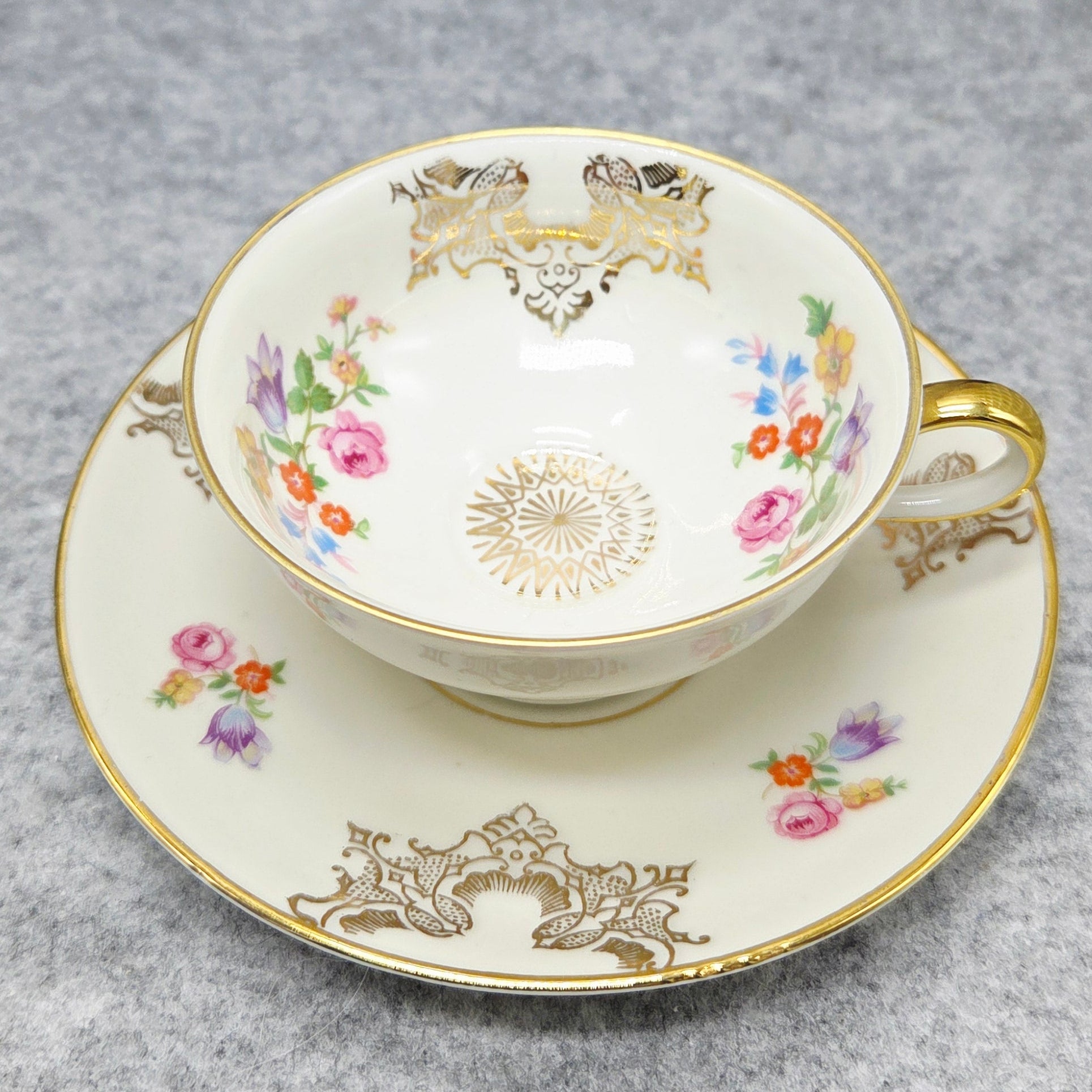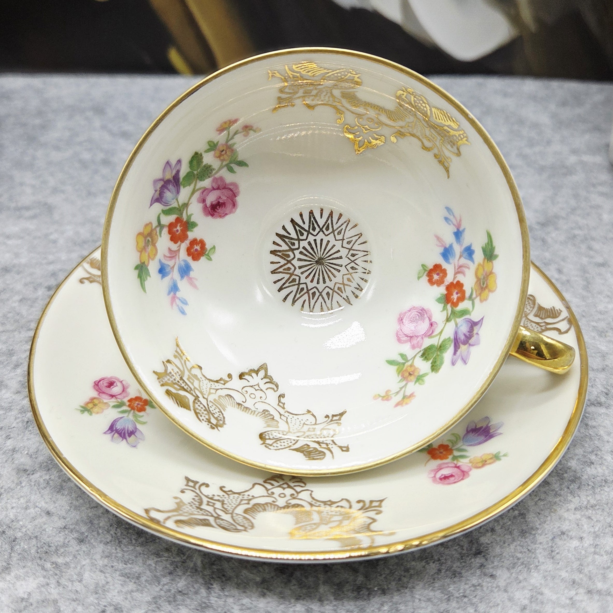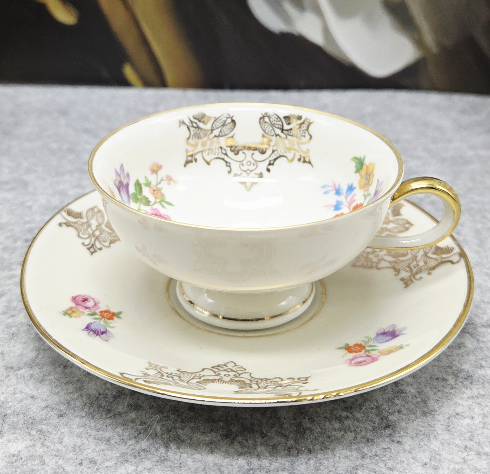 Tai rafinuotas „Johann Seltmann Vohenstrauss“ espresso kavos puodelis su lėkštute, išsiskiriantis švelniu kreminiu atspalviu, gėlių kompozicijų ir auksinių ornamentų dekoru. Klasikinė forma, elegantiška auksu dengta rankenėlė ir dailus kraštų apvadas suteikia šiam rinkiniui išskirtinį, aristokratišką charakterį.