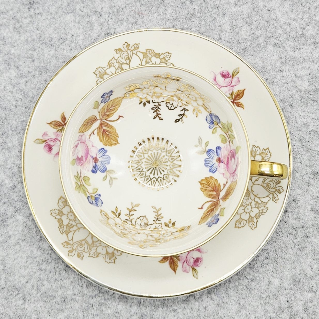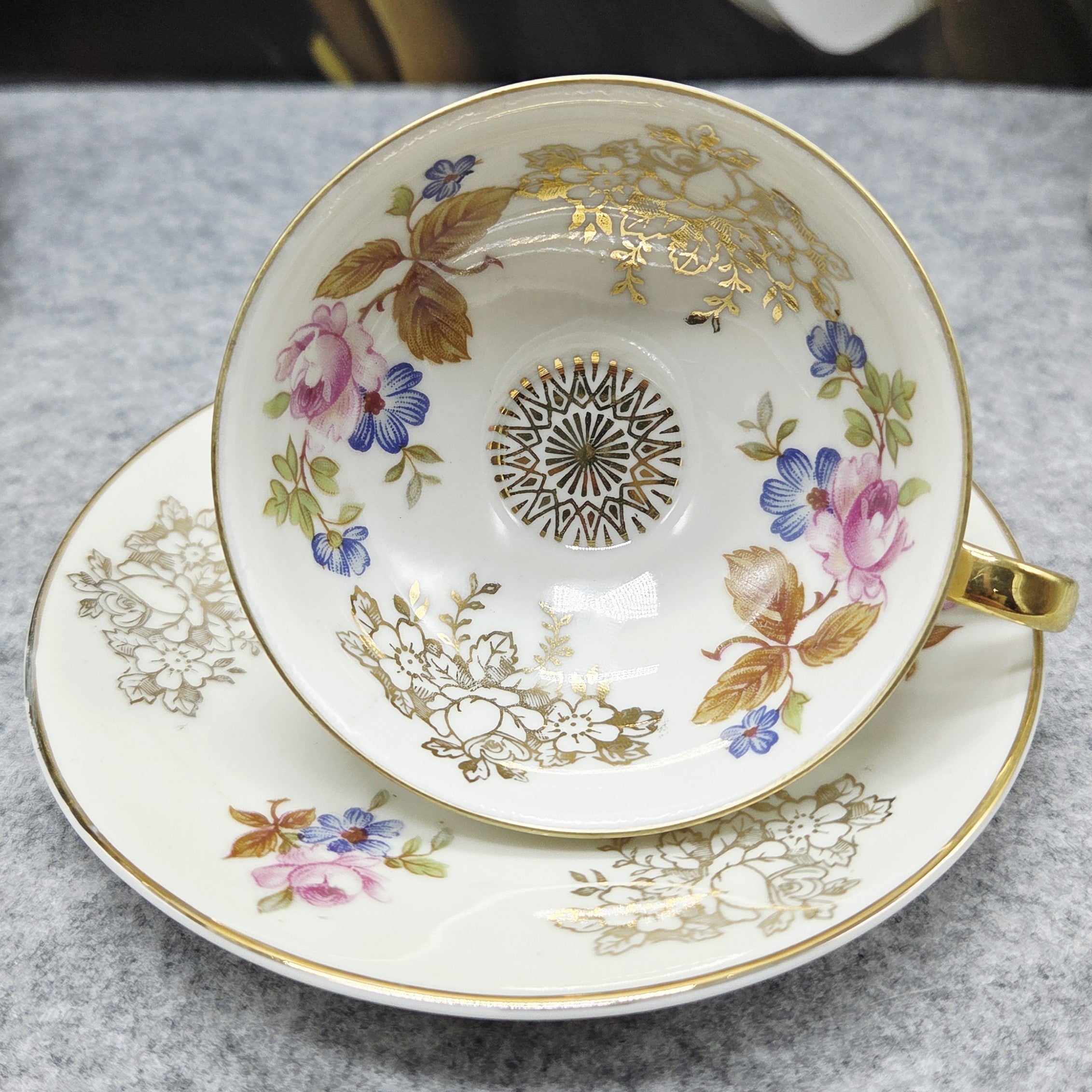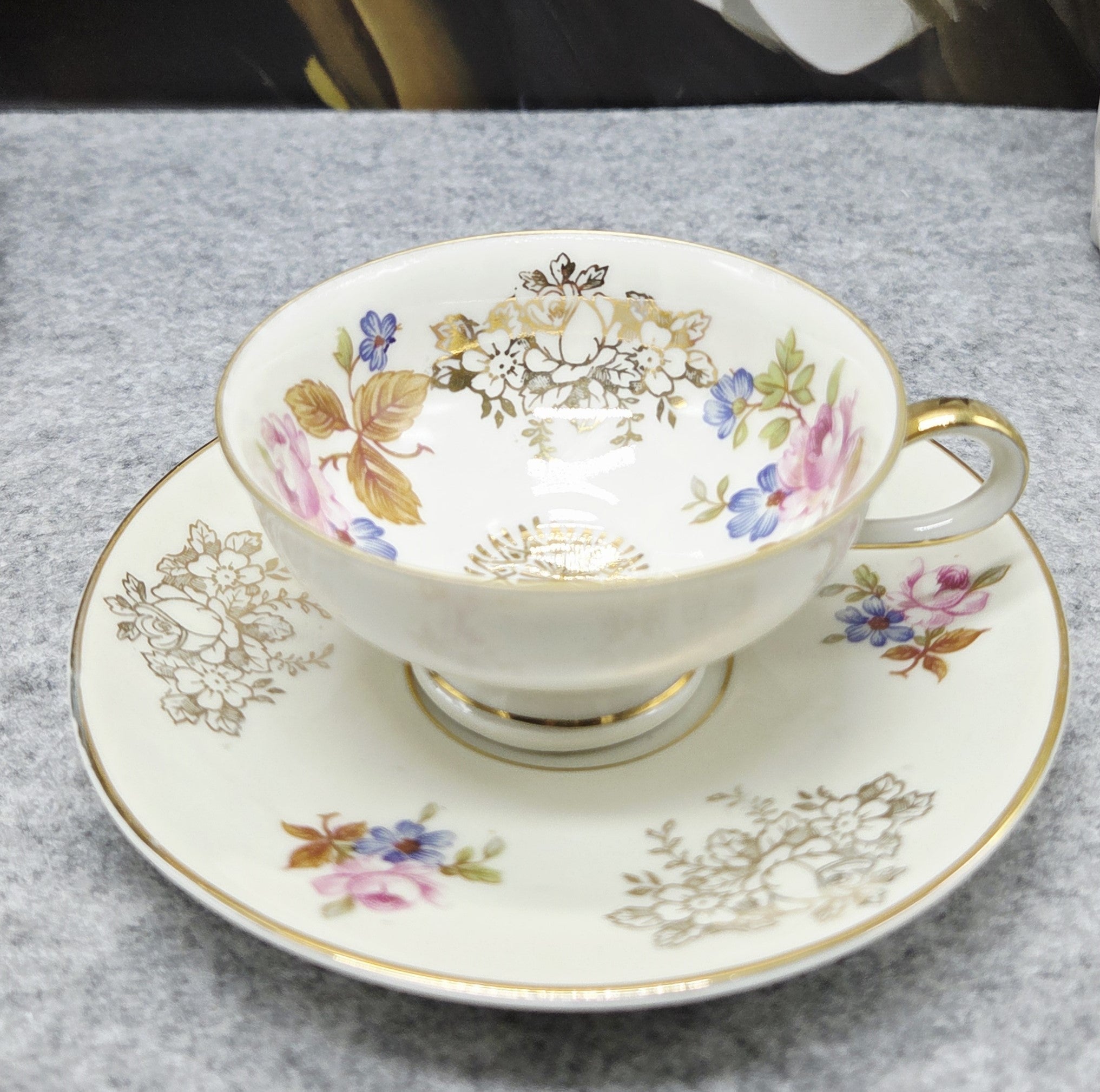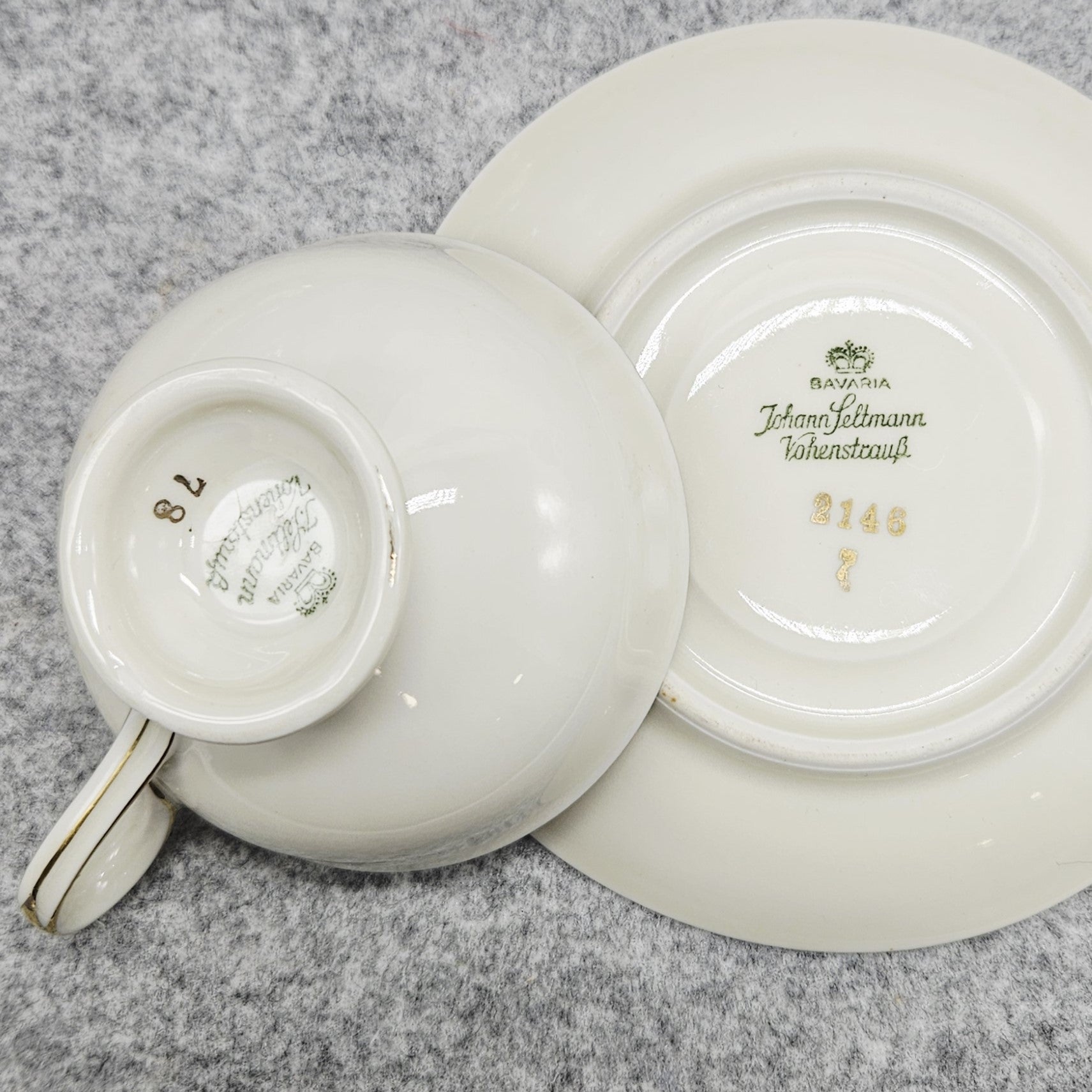 Tai rafinuotas „Johann Seltmann Vohenstrauss“ espresso kavos puodelis su lėkštute, išsiskiriantis švelniu kreminiu atspalviu, gėlių kompozicijų ir auksinių ornamentų dekoru. Klasikinė forma, elegantiška auksu dengta rankenėlė ir dailus kraštų apvadas suteikia šiam rinkiniui išskirtinį, aristokratišką charakterį.