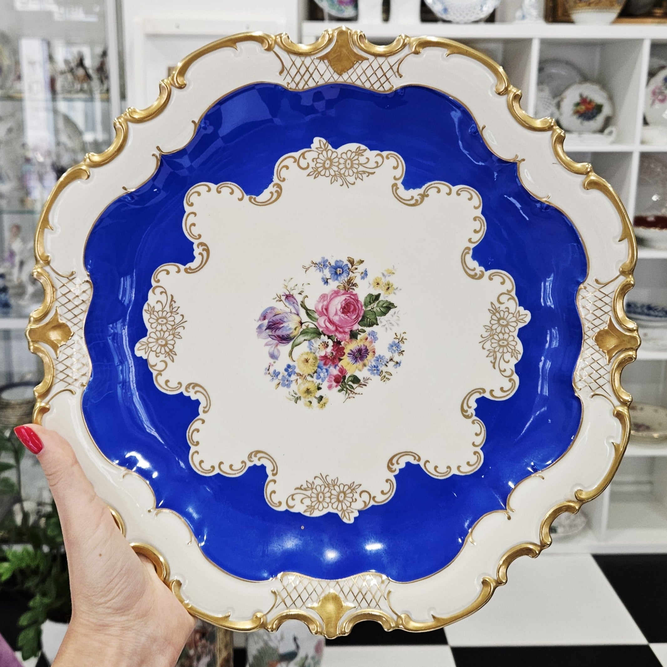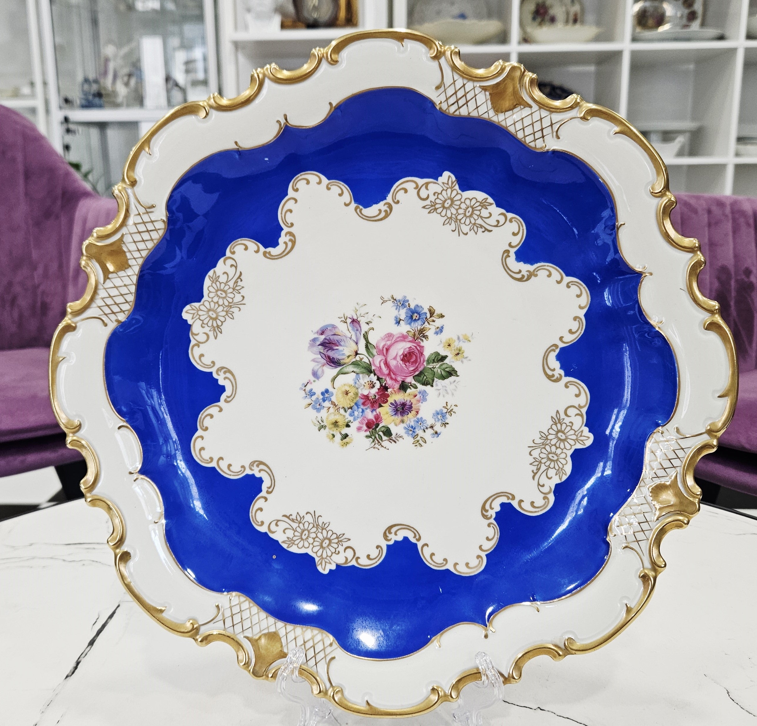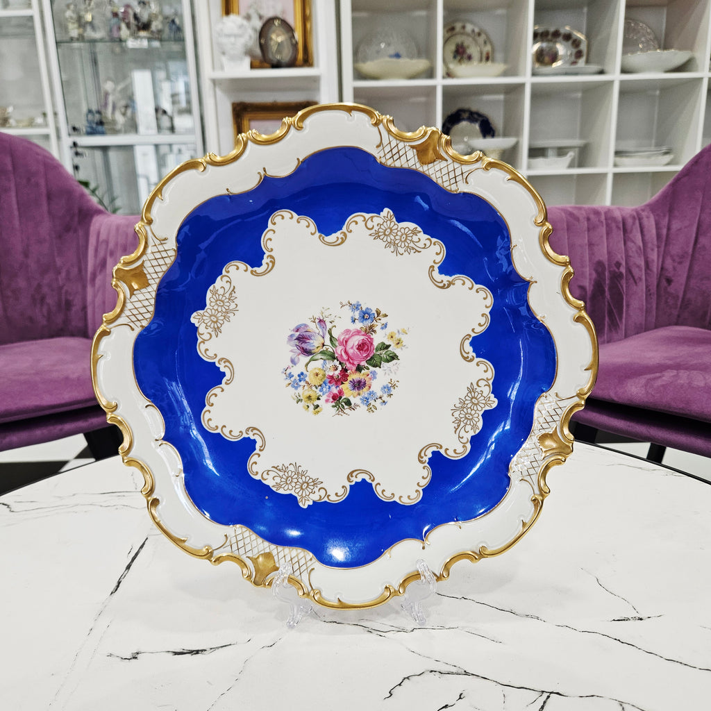 Prabangi antikvarinė porceliano lėkštė iš Vokietijos – tikras klasikinės estetikos pavyzdys. Kreminės spalvos fonas puoštas sodriu mėlynumu, aukso ornamentais ir subtiliu gėlių puokštės dekoru centre. Reljefiniai, banguoti kraštai pabrėžti 24 k aukso puošyba suteikia lėkštei ypatingo rafinuotumo. Gamintojo žymėjimas „Reichenbach“ nurodo aukštos kokybės europietišką meistrystę. Idealiai tinka kolekcijai, interjero puošybai ar išskirtiniam stalo serviravimui.
