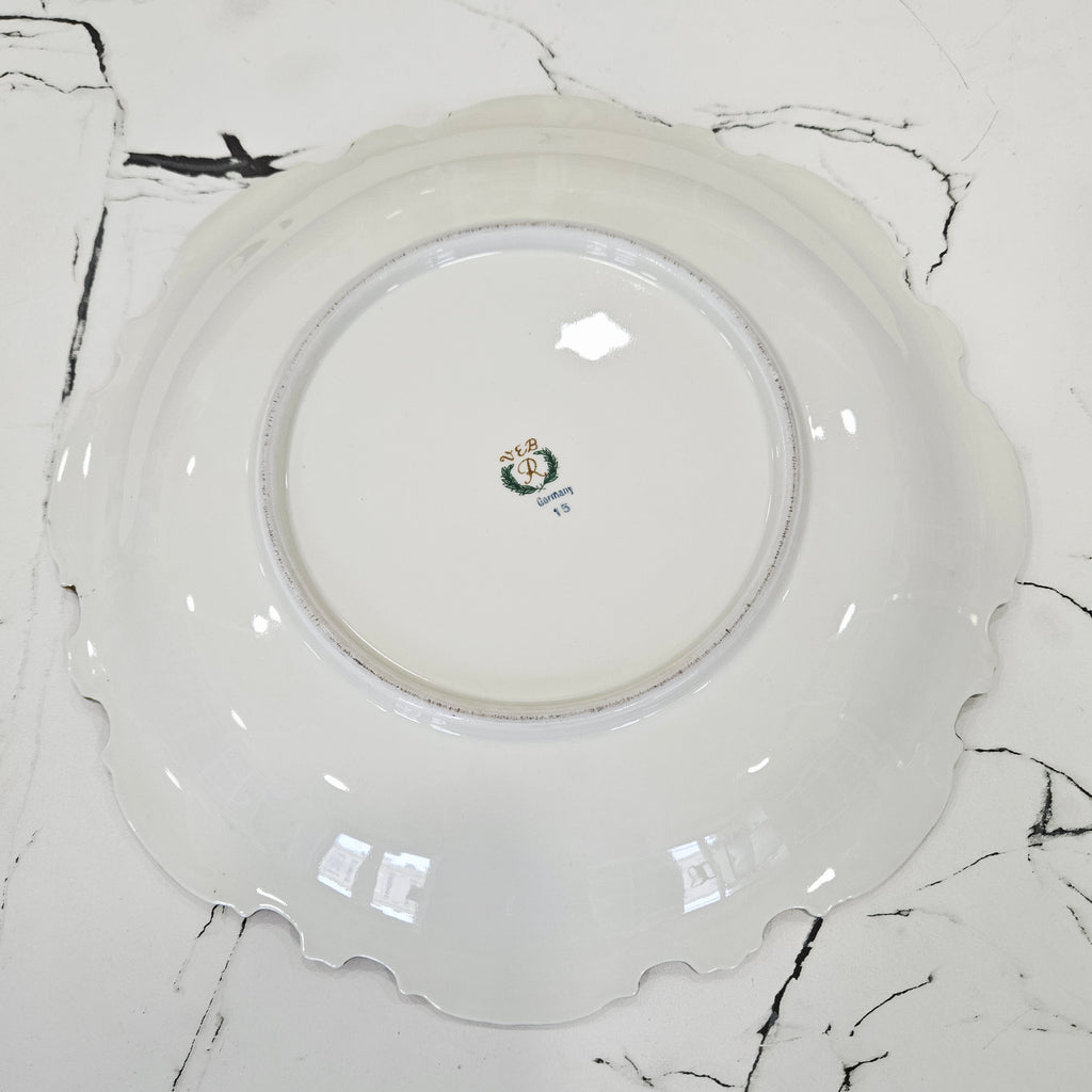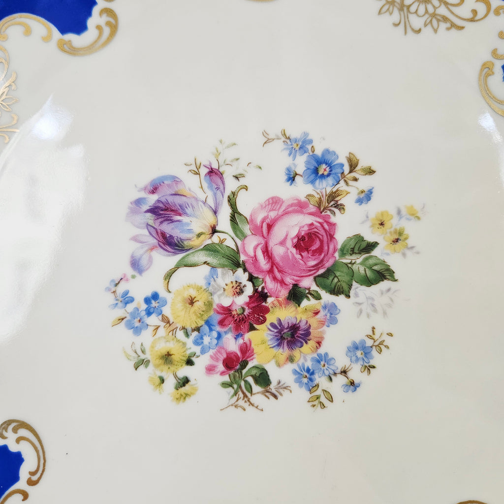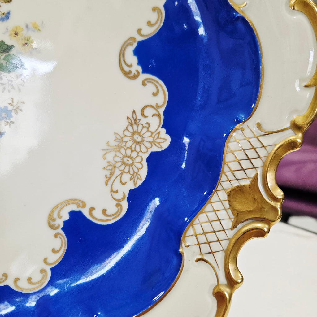 Prabangi antikvarinė porceliano lėkštė iš Vokietijos – tikras klasikinės estetikos pavyzdys. Kreminės spalvos fonas puoštas sodriu mėlynumu, aukso ornamentais ir subtiliu gėlių puokštės dekoru centre. Reljefiniai, banguoti kraštai pabrėžti 24 k aukso puošyba suteikia lėkštei ypatingo rafinuotumo. Gamintojo žymėjimas „Reichenbach“ nurodo aukštos kokybės europietišką meistrystę. Idealiai tinka kolekcijai, interjero puošybai ar išskirtiniam stalo serviravimui.