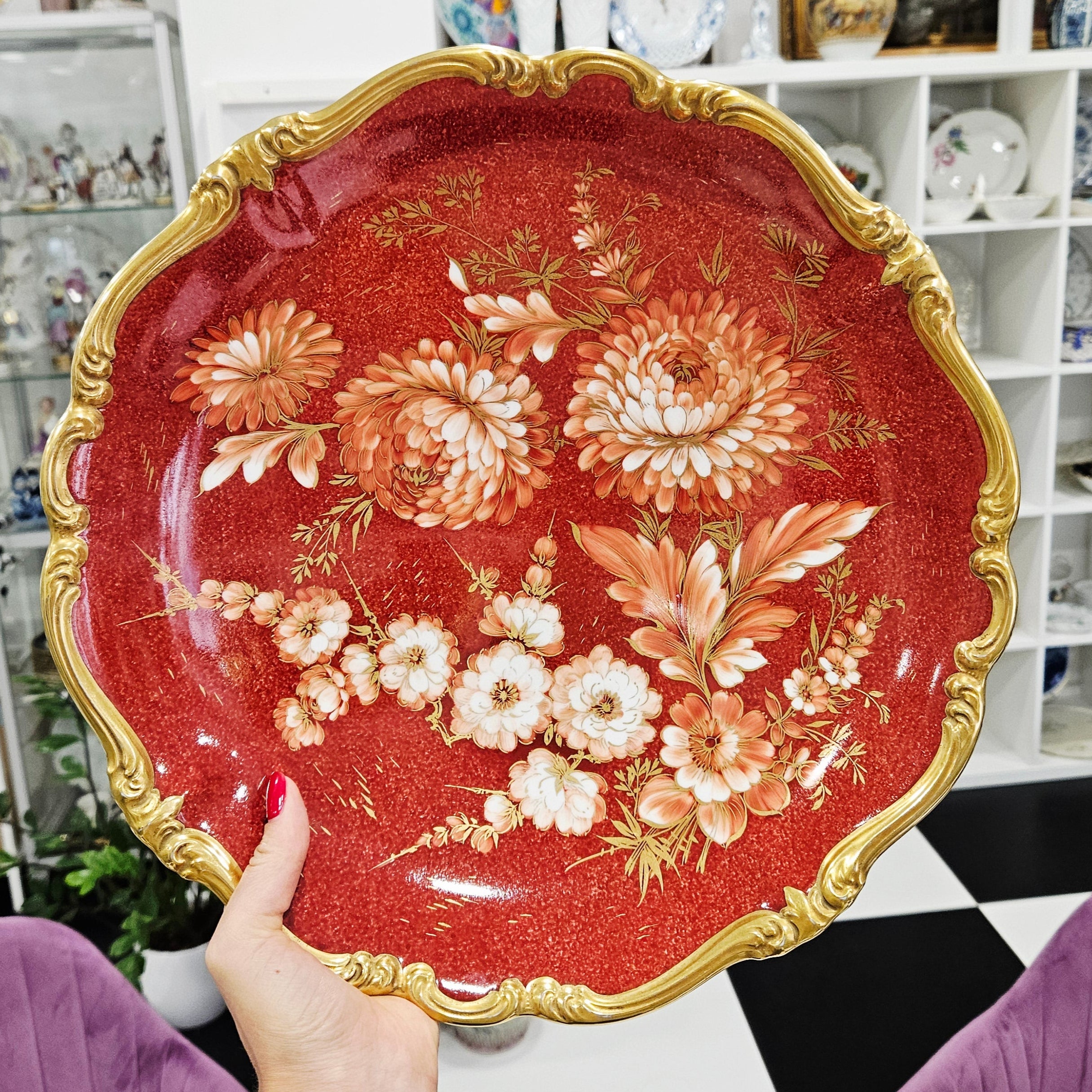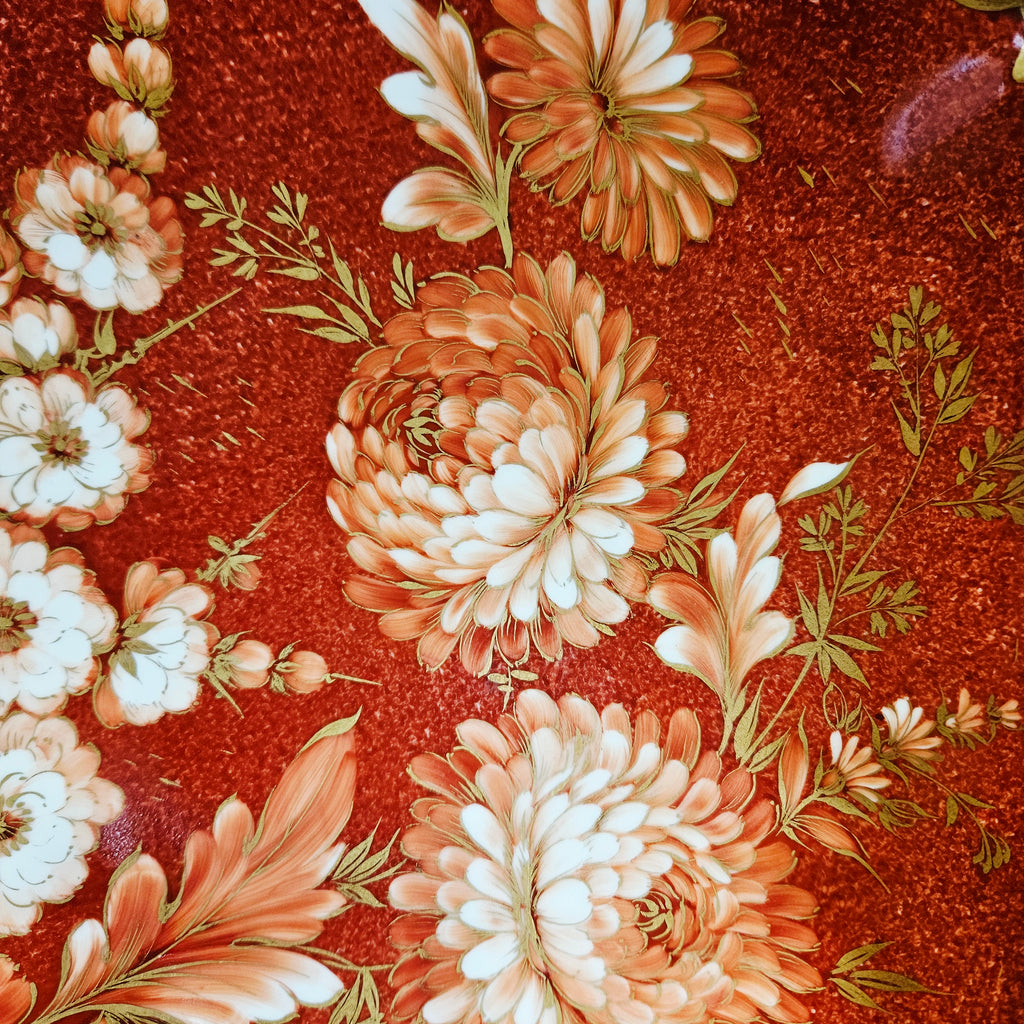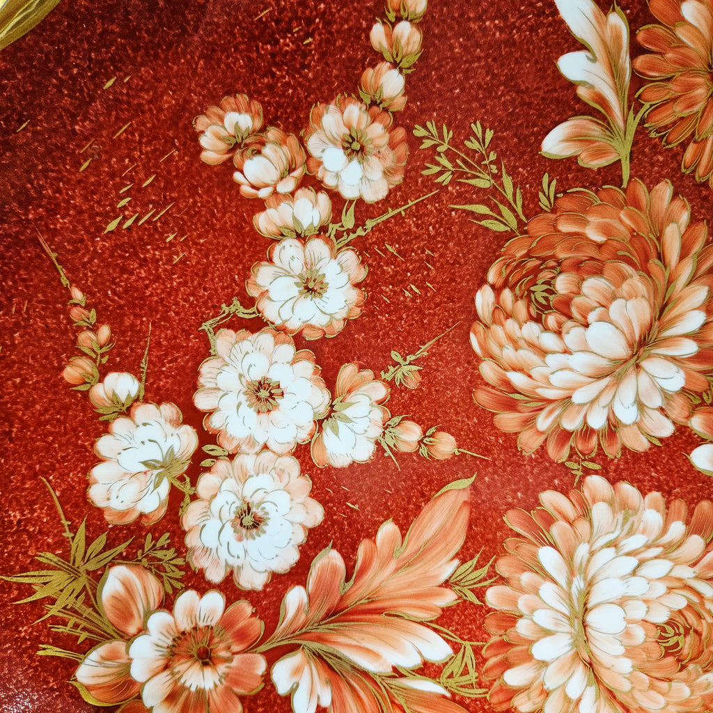 Rankomis tapyta kompozicija su sodrių tonų žiedais raudoname fone subtiliai papildyta 24 karatų aukso detalėmis ir reljefiniu auksiniu kraštu.