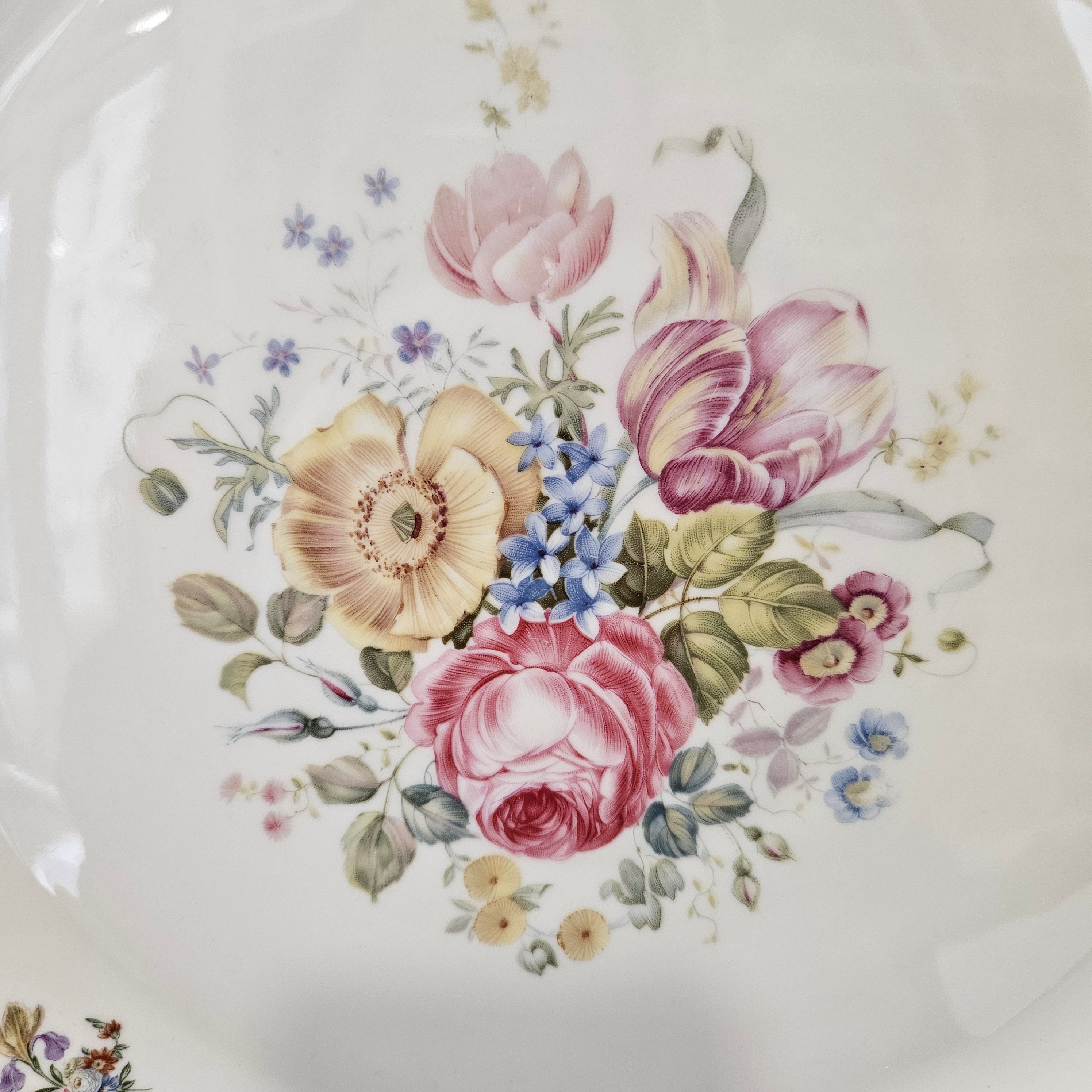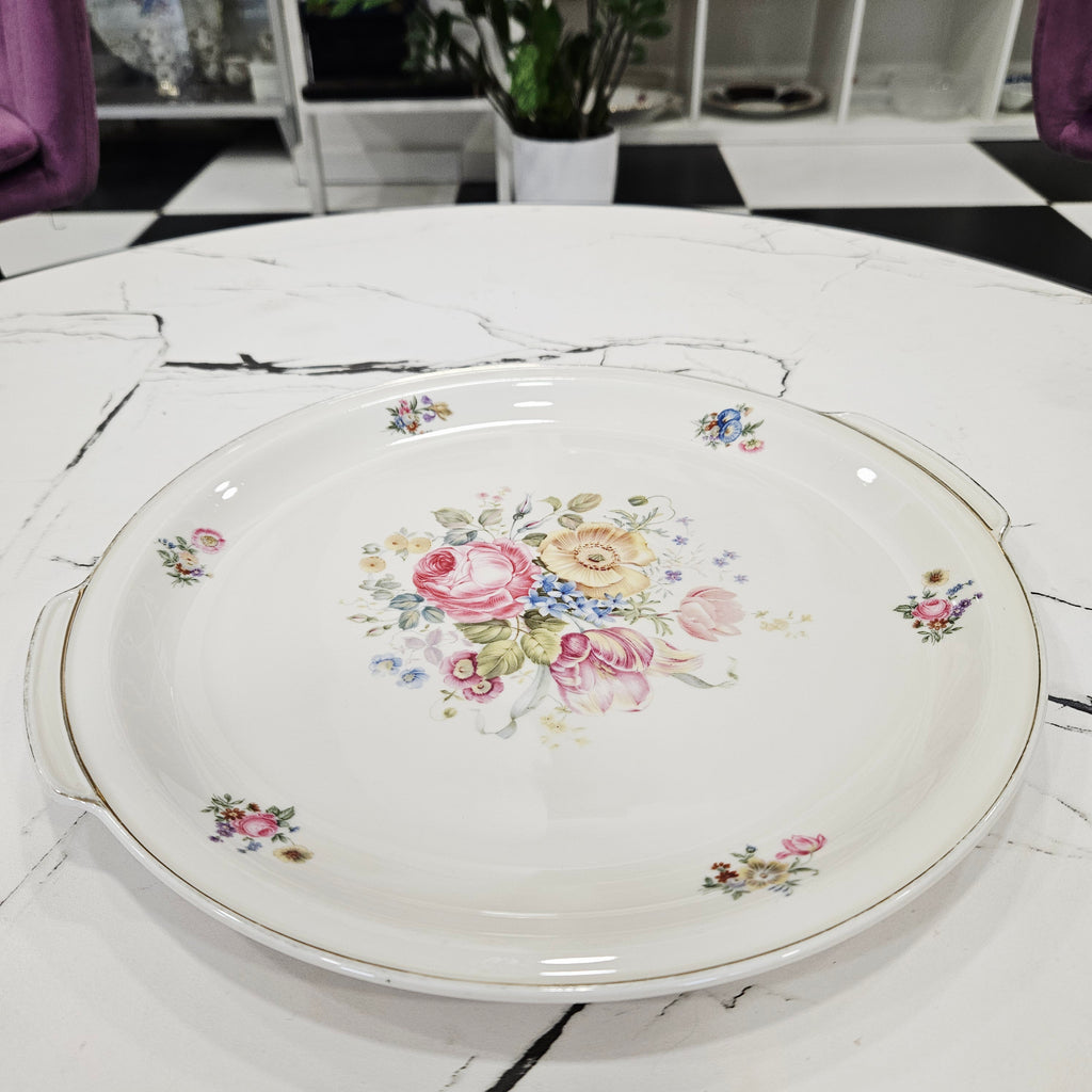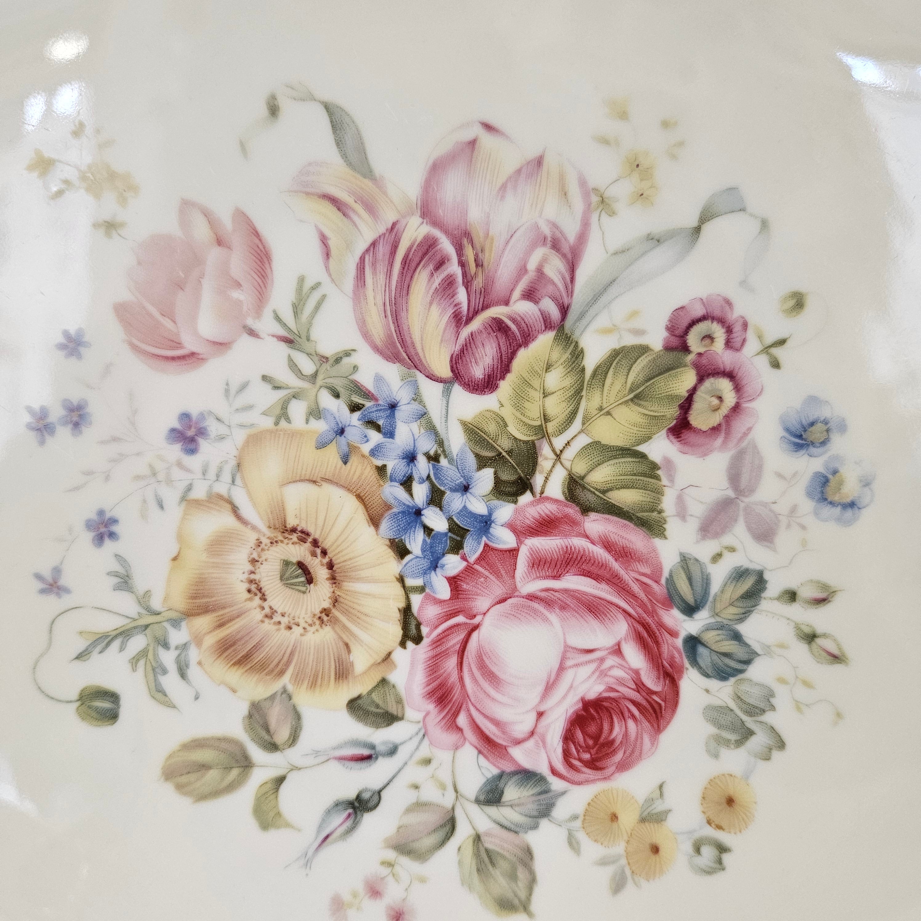 Klasikinio grožio Hutschenreuther Selb Bavaria porceliano serviravimo lėkštė, dekoruota subtilia gėlių puokšte. Kompozicijos centre išsiskiria švelni rožinė rožė, tulpės ir geltoni žiedai, perteikiantys romantinį, šviesų ir elegantišką stilių.