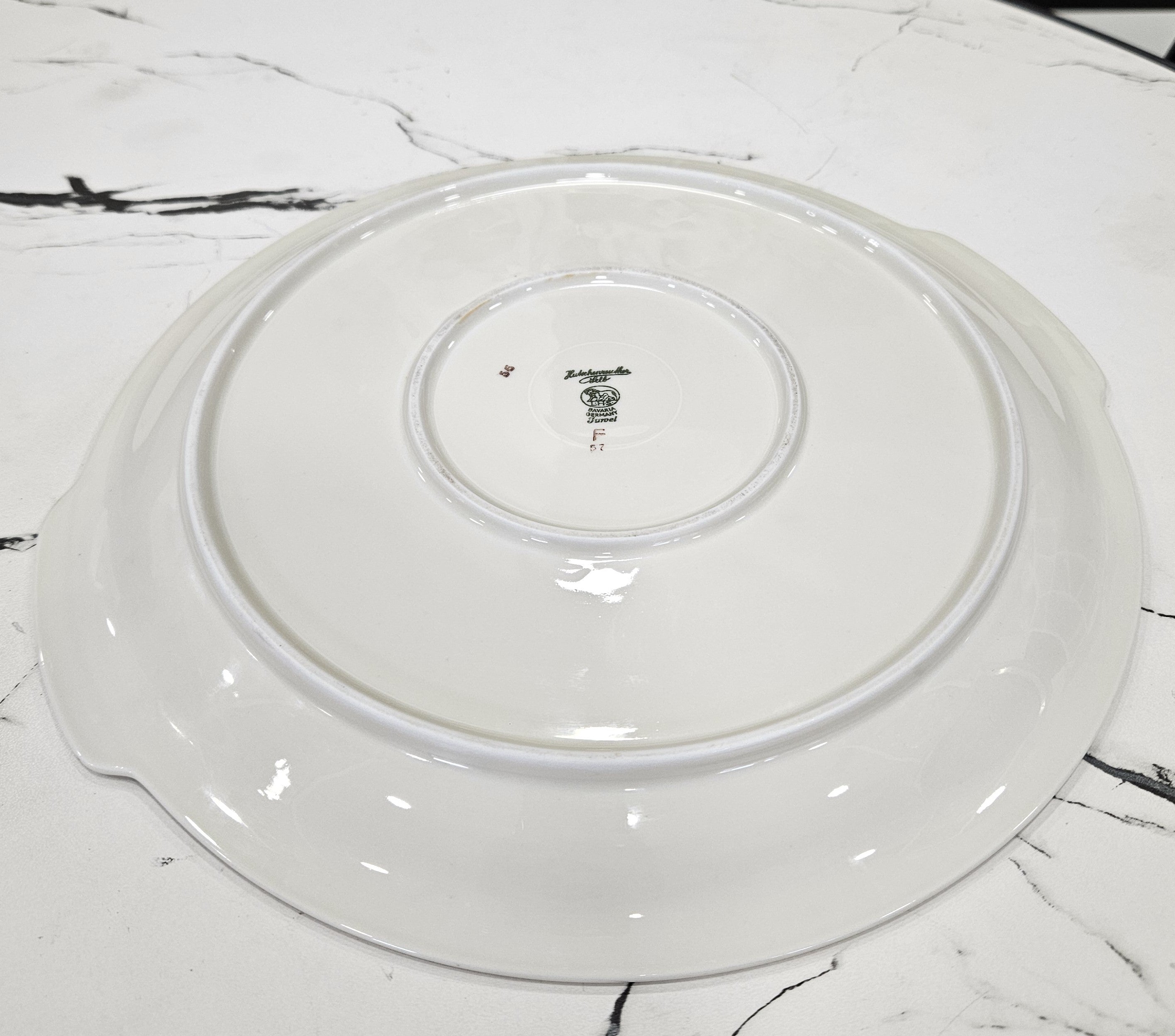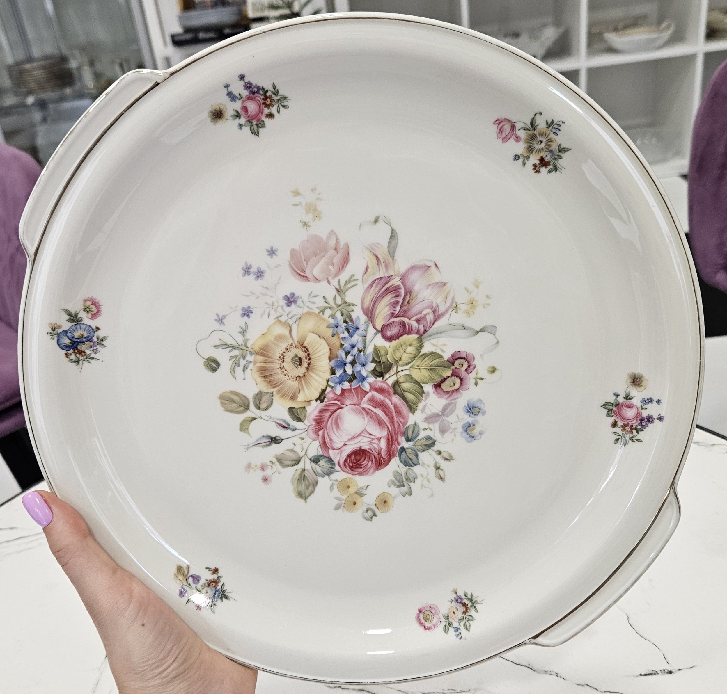 Lėkštė puošta švelniu auksiniu apvadu, o iš šonų integruotos patogios rankenėlės suteikia praktiškumo bei išlaiko grakštų siluetą. Tai puikus pavyzdys aukštos kokybės vokiško porceliano, vertinamo dėl savo meistriškumo ir ilgaamžiškumo.