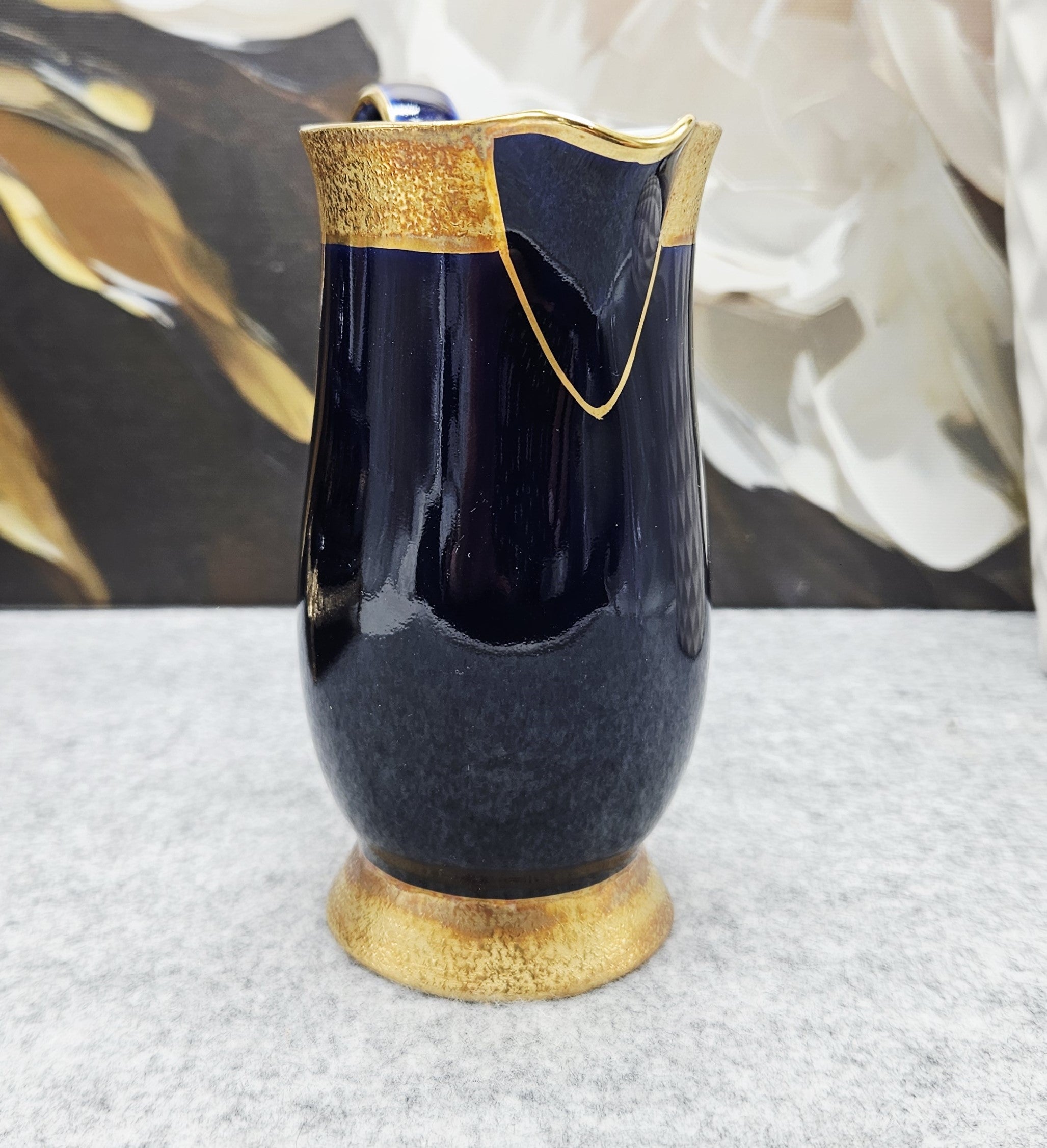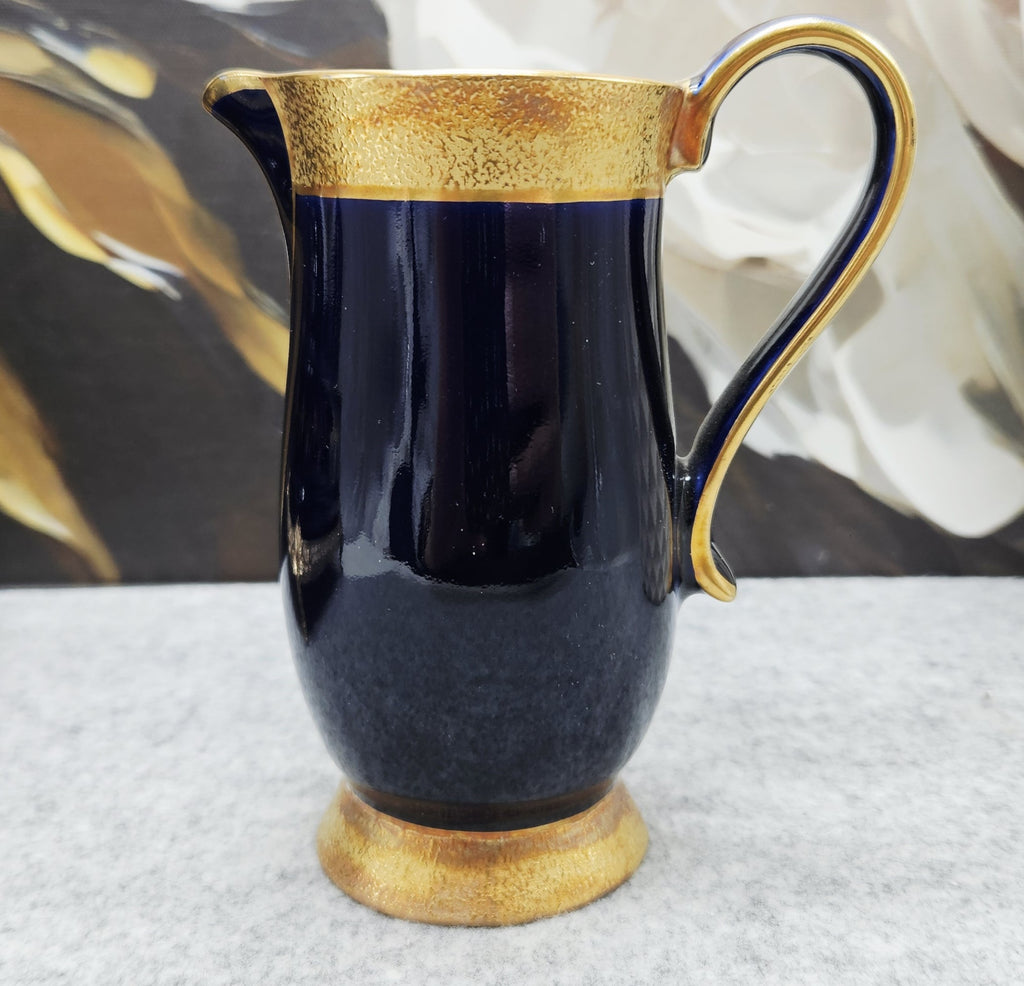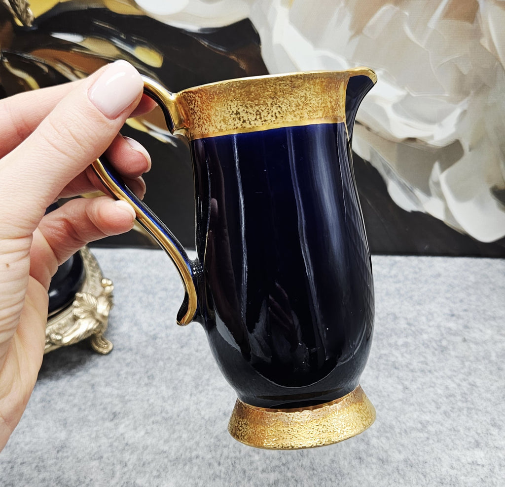 Pagamintas iš aukščiausios kokybės porceliano, padengtas tikru kobalto glazūros sluoksniu (Echt Kobalt), kuris suteikia gilų, sodrų mėlynos spalvos toną – tikrą aristokratiško skonio ženklą. Subtilūs auksuoti ornamentai elegantiškai papuošia kiekvieną detalę, suteikdami ąsotėliui išskirtinumo ir prabangos pojūtį.