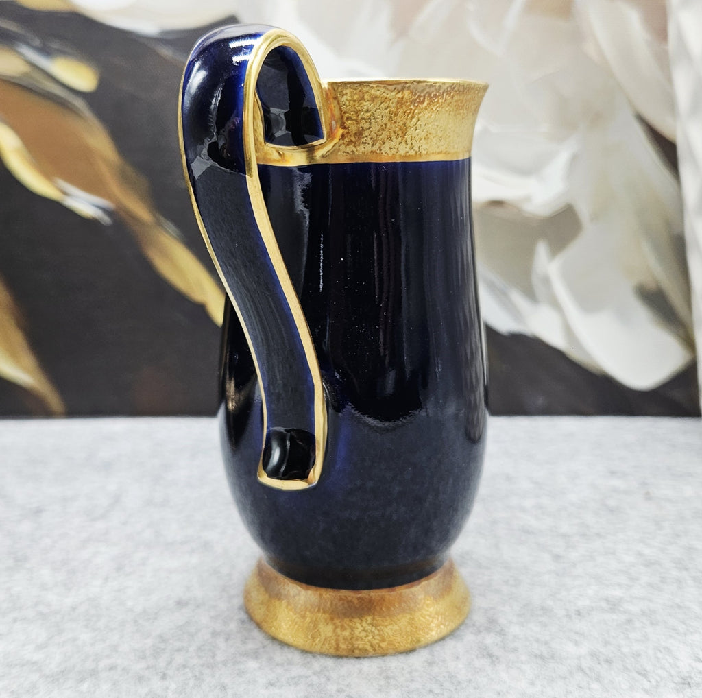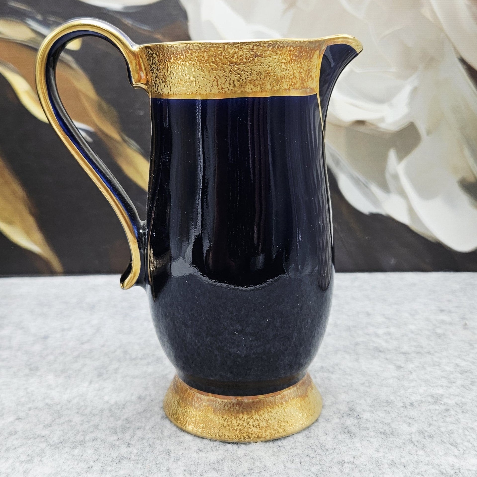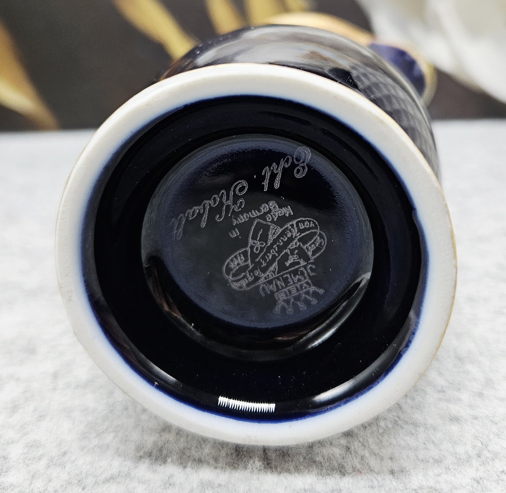 Pagamintas iš aukščiausios kokybės porceliano, padengtas tikru kobalto glazūros sluoksniu (Echt Kobalt), kuris suteikia gilų, sodrų mėlynos spalvos toną – tikrą aristokratiško skonio ženklą. Subtilūs auksuoti ornamentai elegantiškai papuošia kiekvieną detalę, suteikdami ąsotėliui išskirtinumo ir prabangos pojūtį.