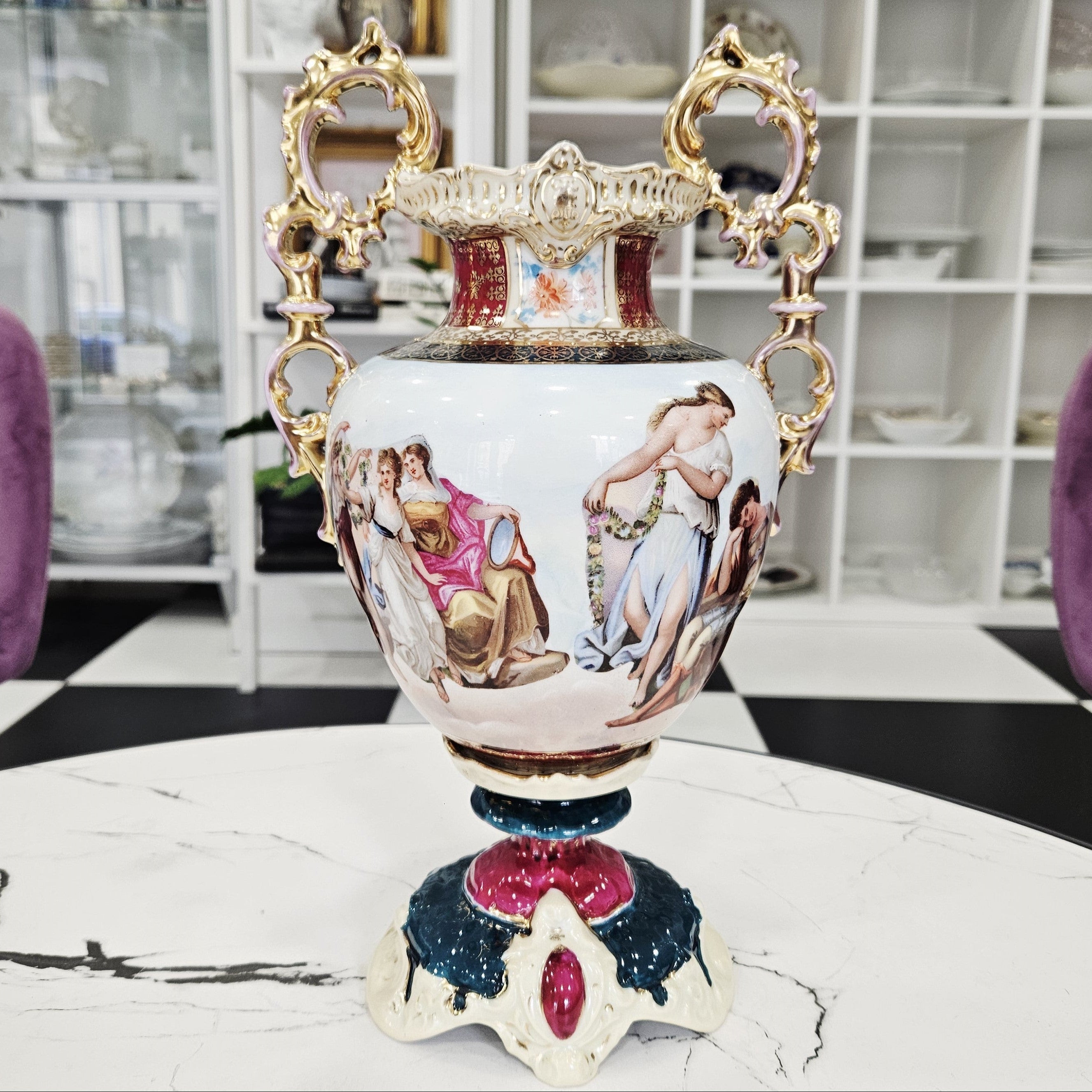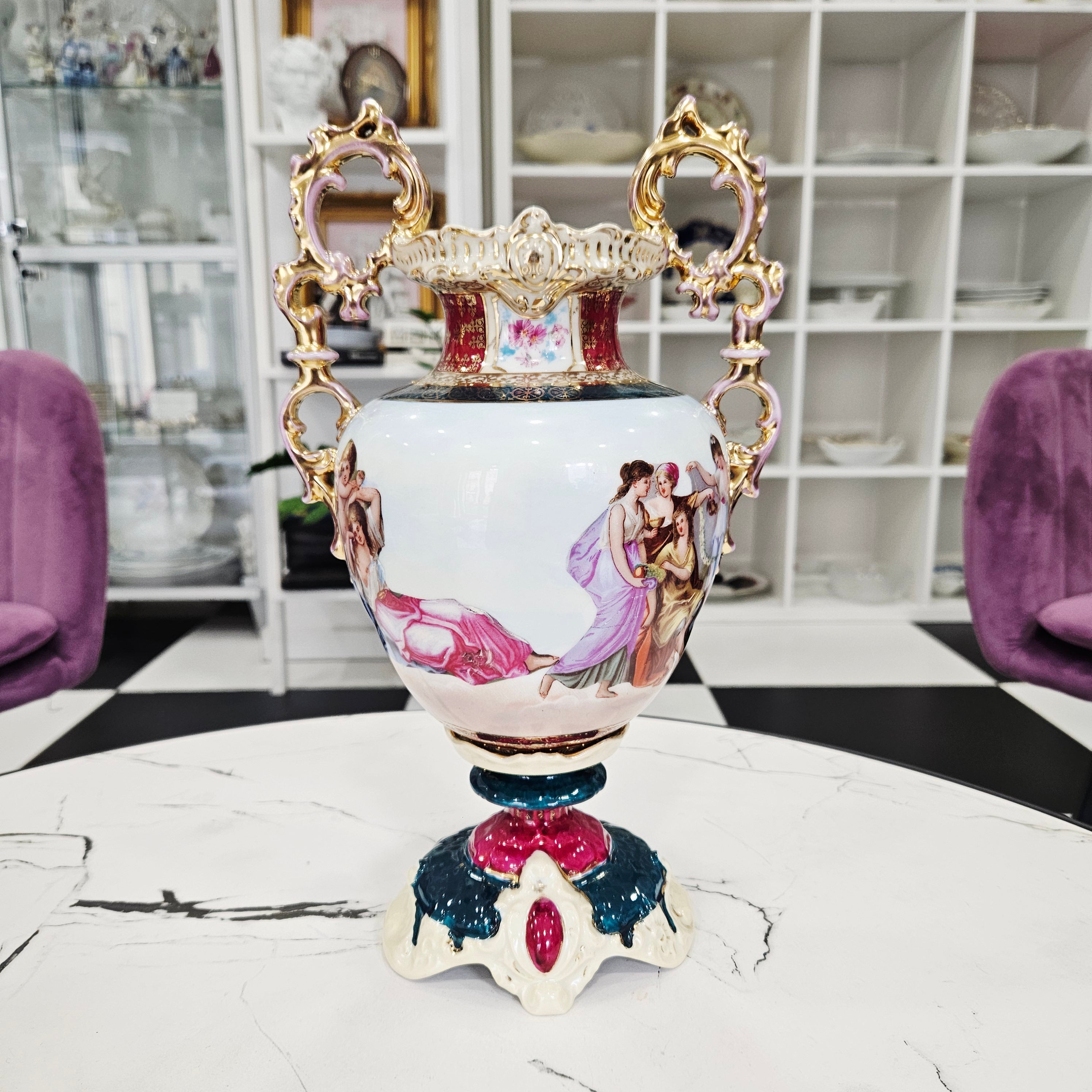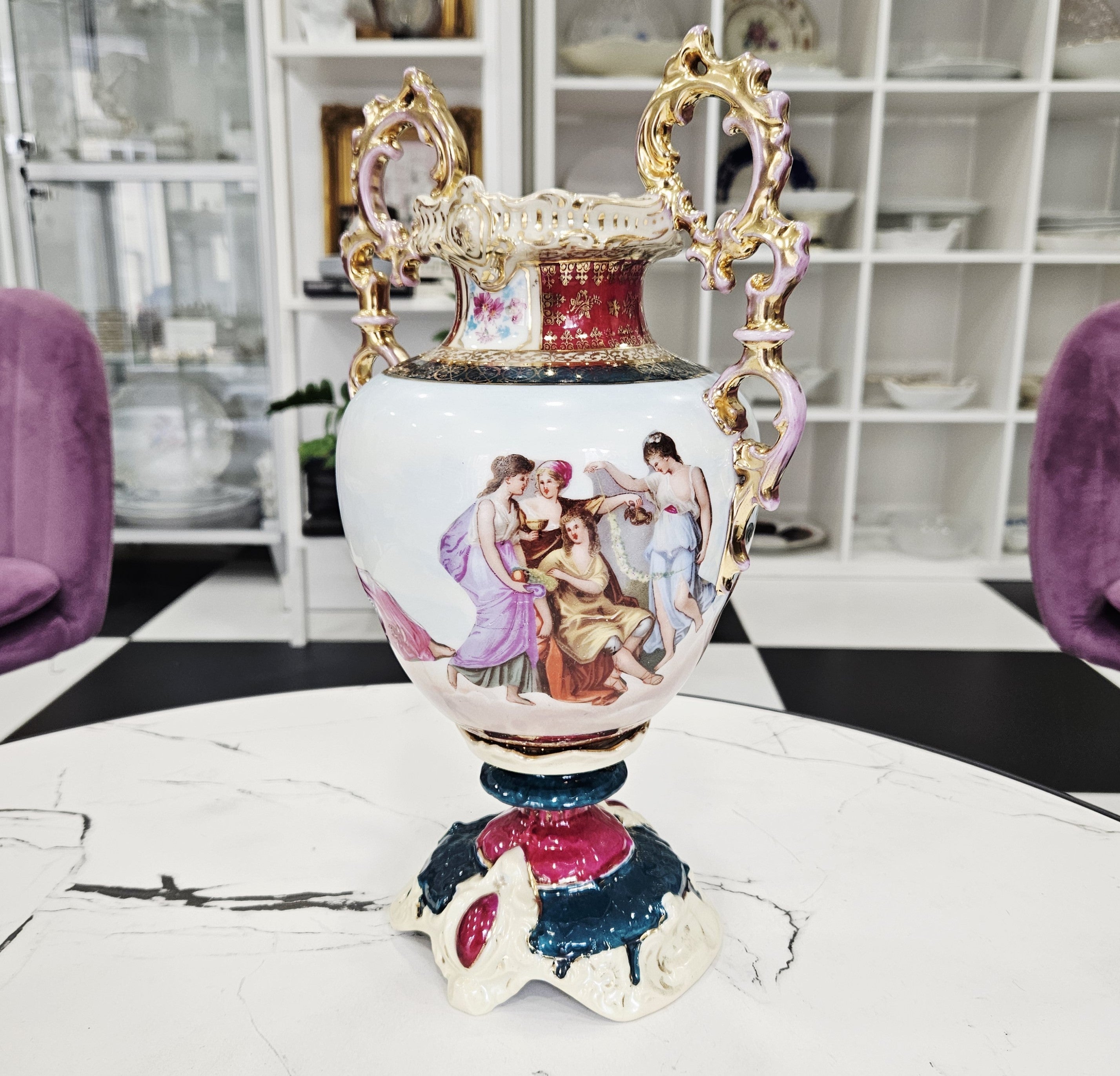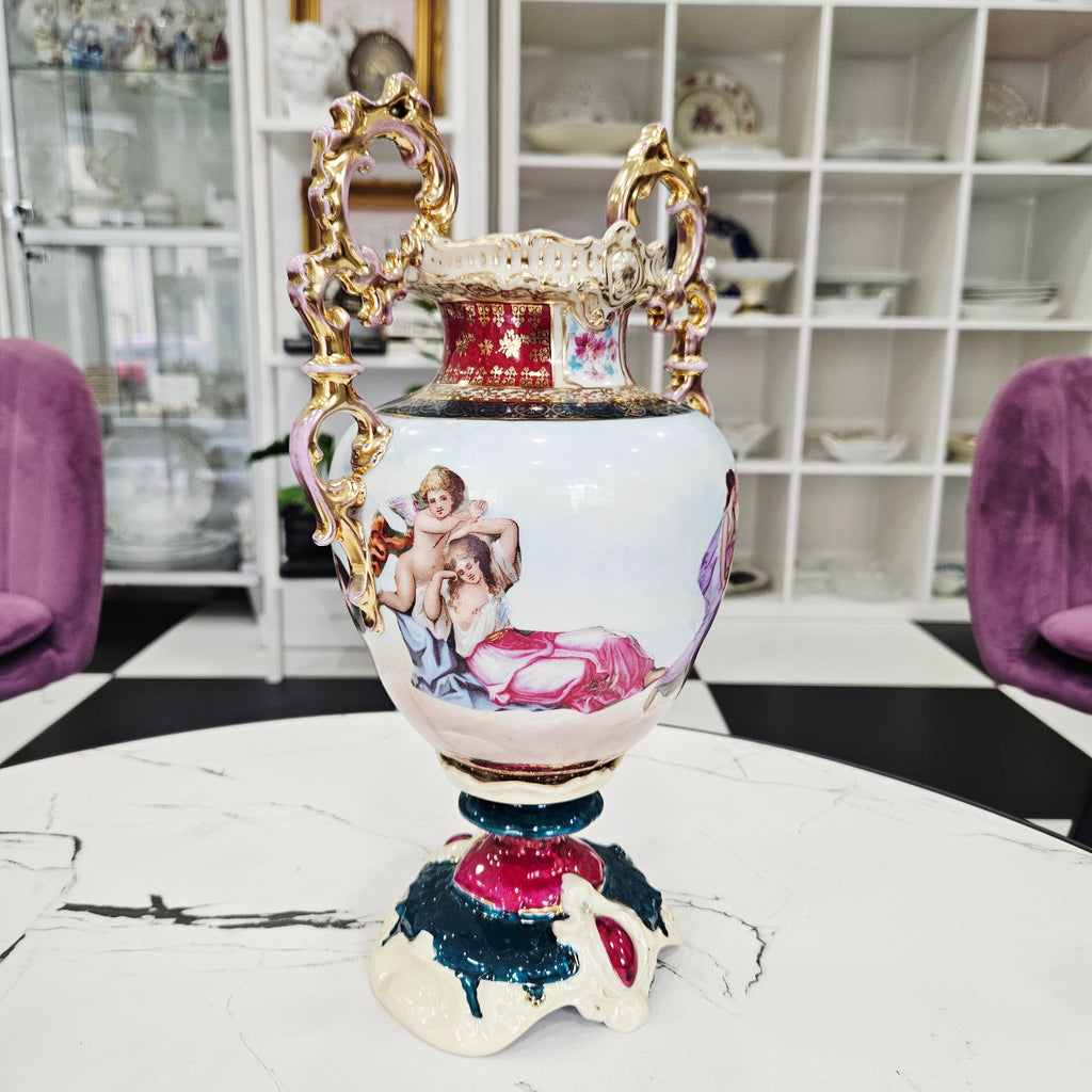 Įspūdinga Augarten amforos formos vaza – tai prabanga ir klasinė estetika viename kūrinyje. Ant porceliano korpuso puikuojasi figūrinės scenos kuria antikinės mitologijos ir romantiškų motyvų nuotaiką, o aukštos, ažūrinės, įmantrios formos rankenos suteikia dar daugiau puošnumo ir teatrališkumo. Vaza dekoruota ryškiais spalviniais akcentais bei gausia aukso dekoracija, kuri pabrėžia manufaktūros meistrystę ir išskirtinį detalumą. Dalinai montuotas pagrindas su kontrastingais tonais – papildomas dekoratyvinis elementas, pakeliantis visą kompoziciją į kolekcinio meno lygį.