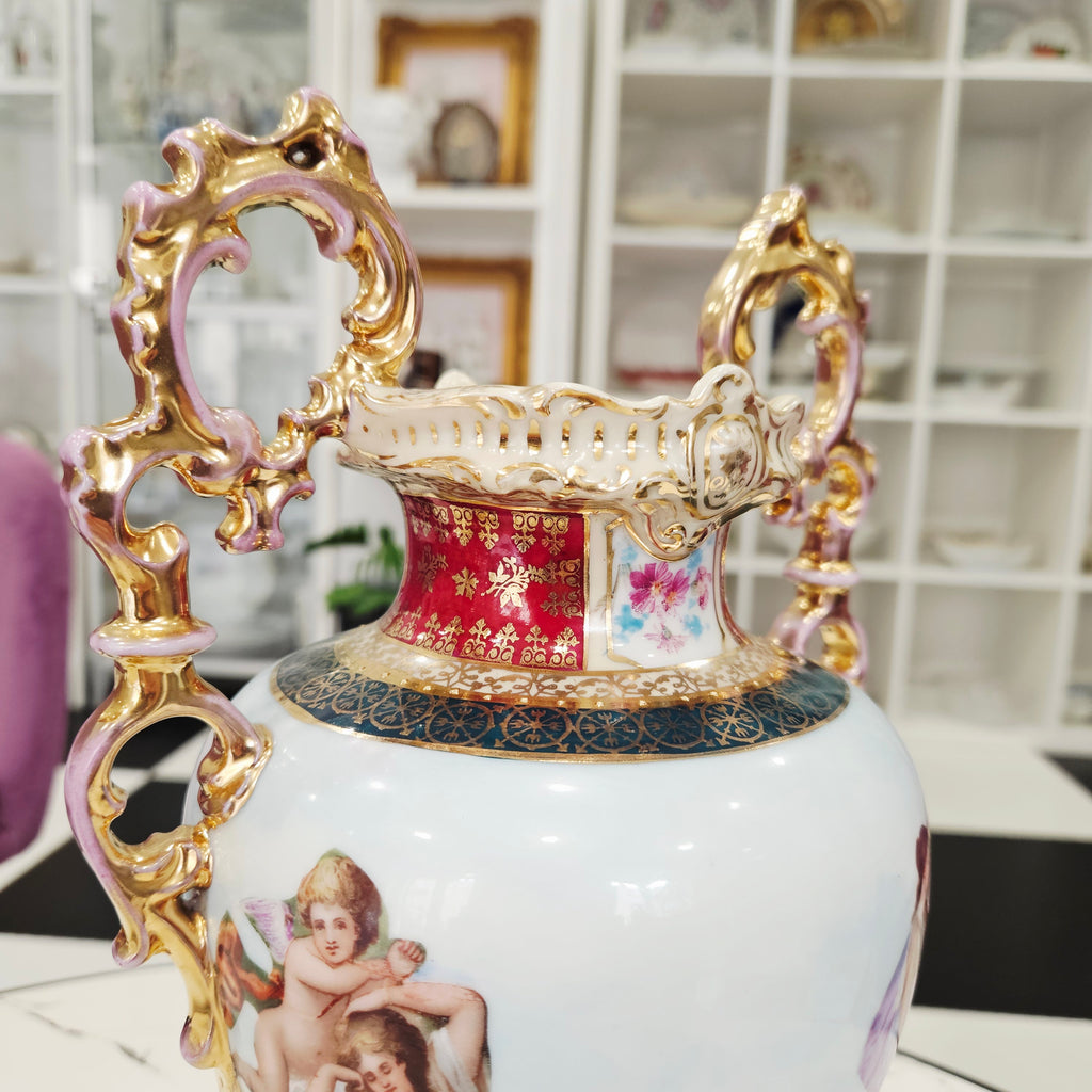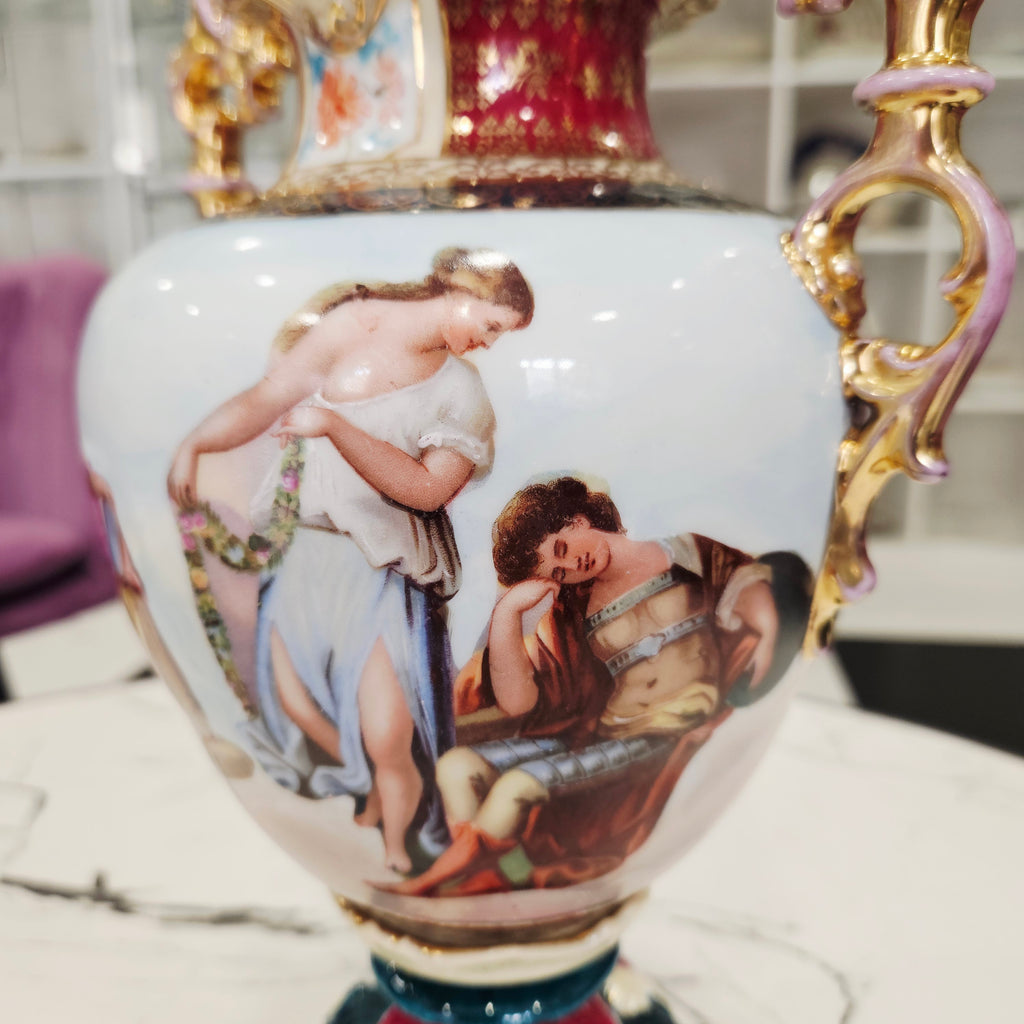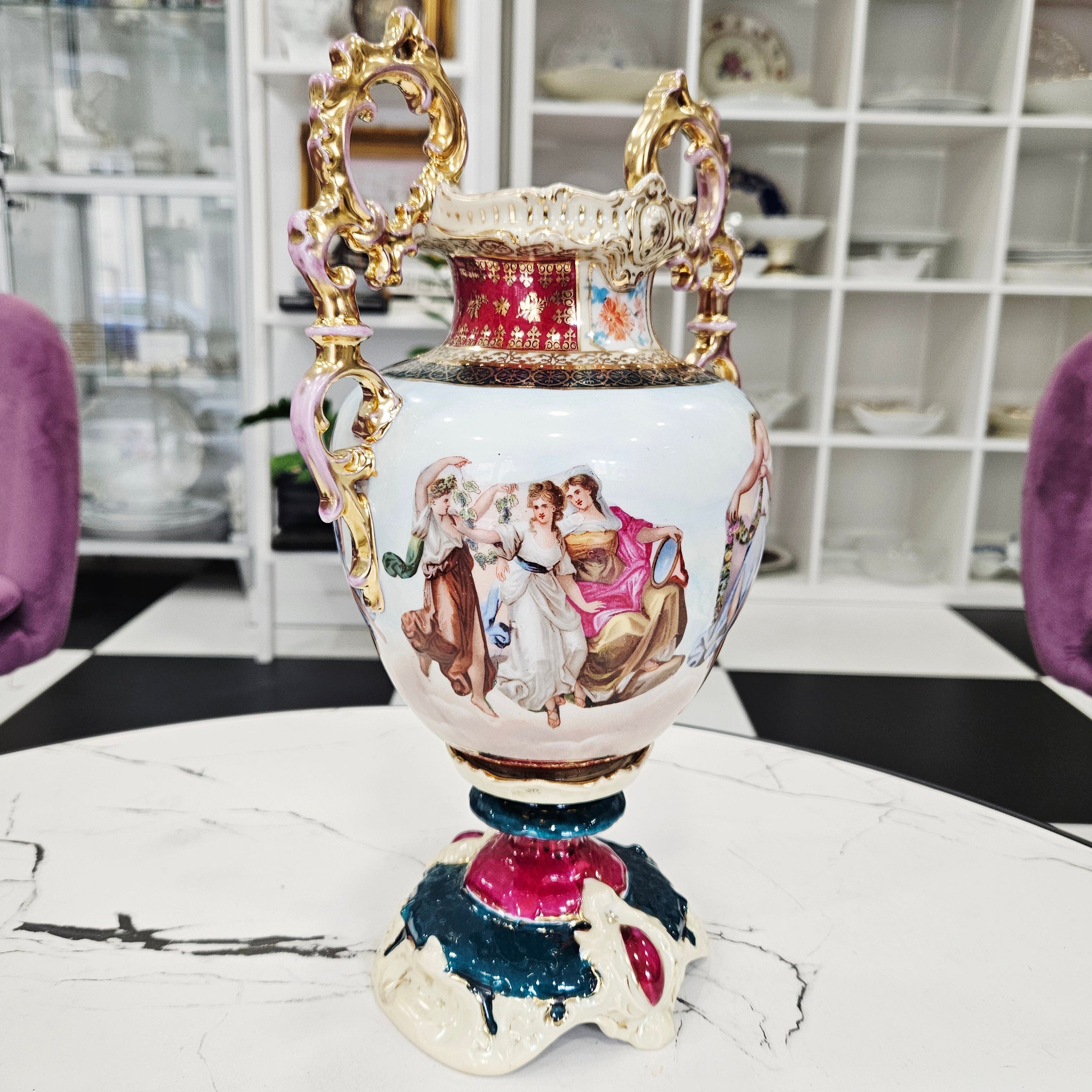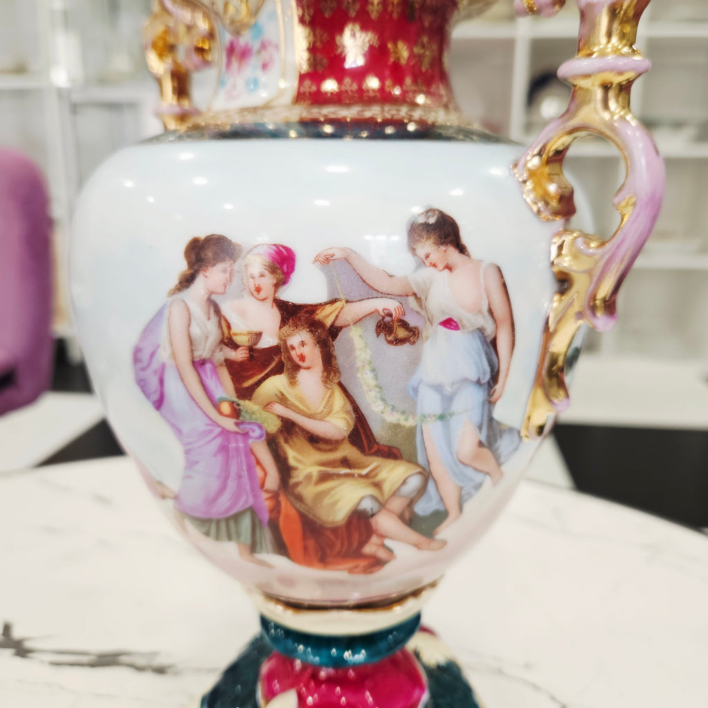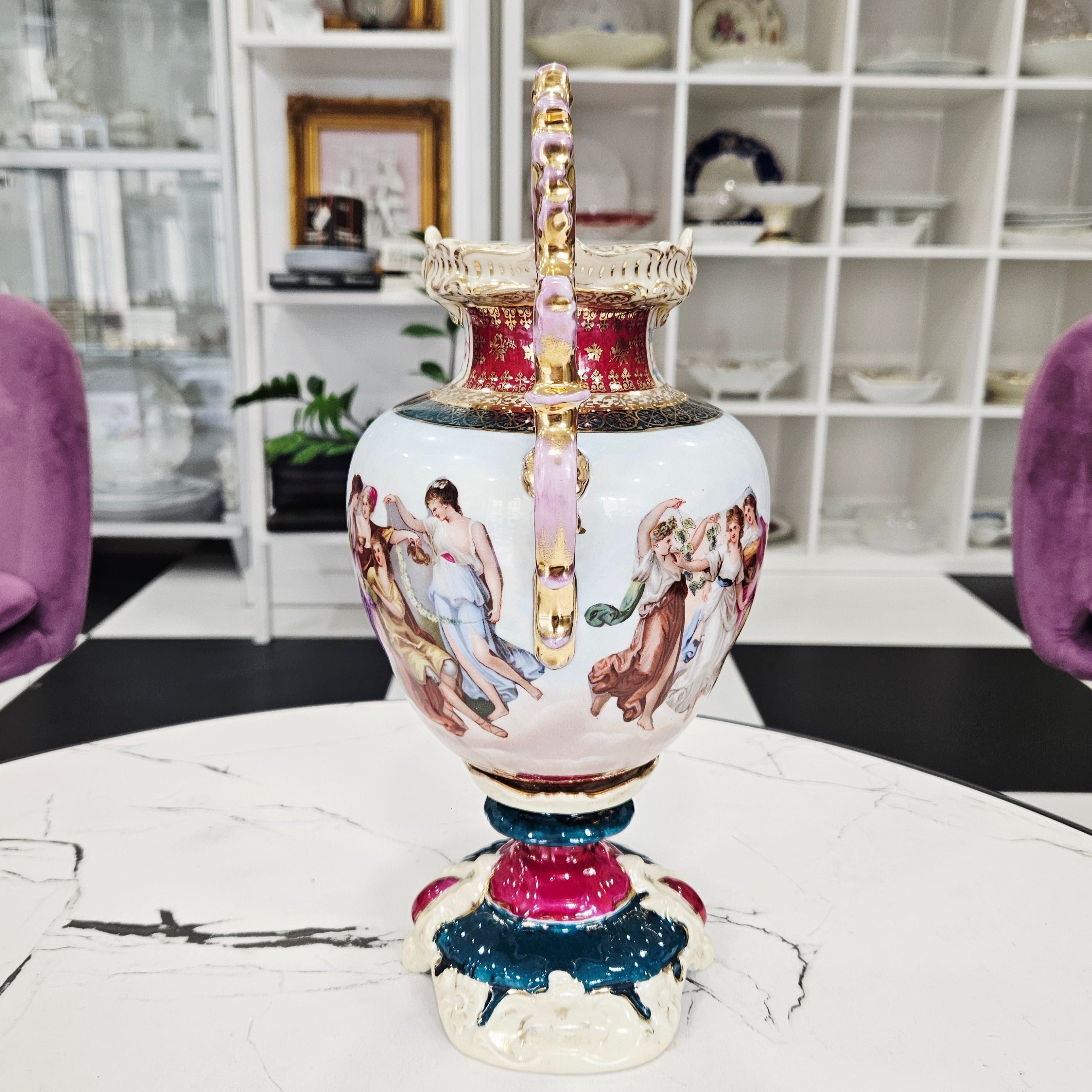 Įspūdinga Augarten amforos formos vaza – tai prabanga ir klasinė estetika viename kūrinyje. Ant porceliano korpuso puikuojasi figūrinės scenos kuria antikinės mitologijos ir romantiškų motyvų nuotaiką, o aukštos, ažūrinės, įmantrios formos rankenos suteikia dar daugiau puošnumo ir teatrališkumo. Vaza dekoruota ryškiais spalviniais akcentais bei gausia aukso dekoracija, kuri pabrėžia manufaktūros meistrystę ir išskirtinį detalumą. Dalinai montuotas pagrindas su kontrastingais tonais – papildomas dekoratyvinis elementas, pakeliantis visą kompoziciją į kolekcinio meno lygį.