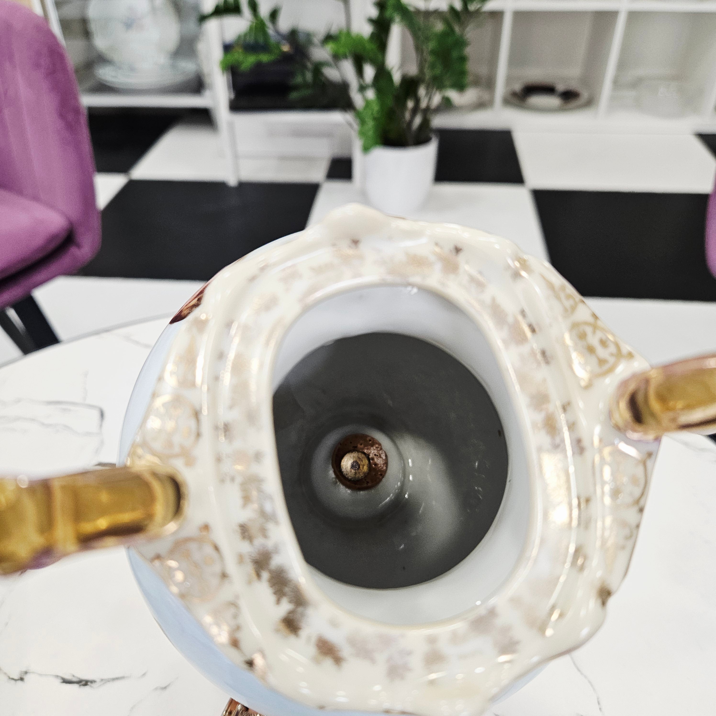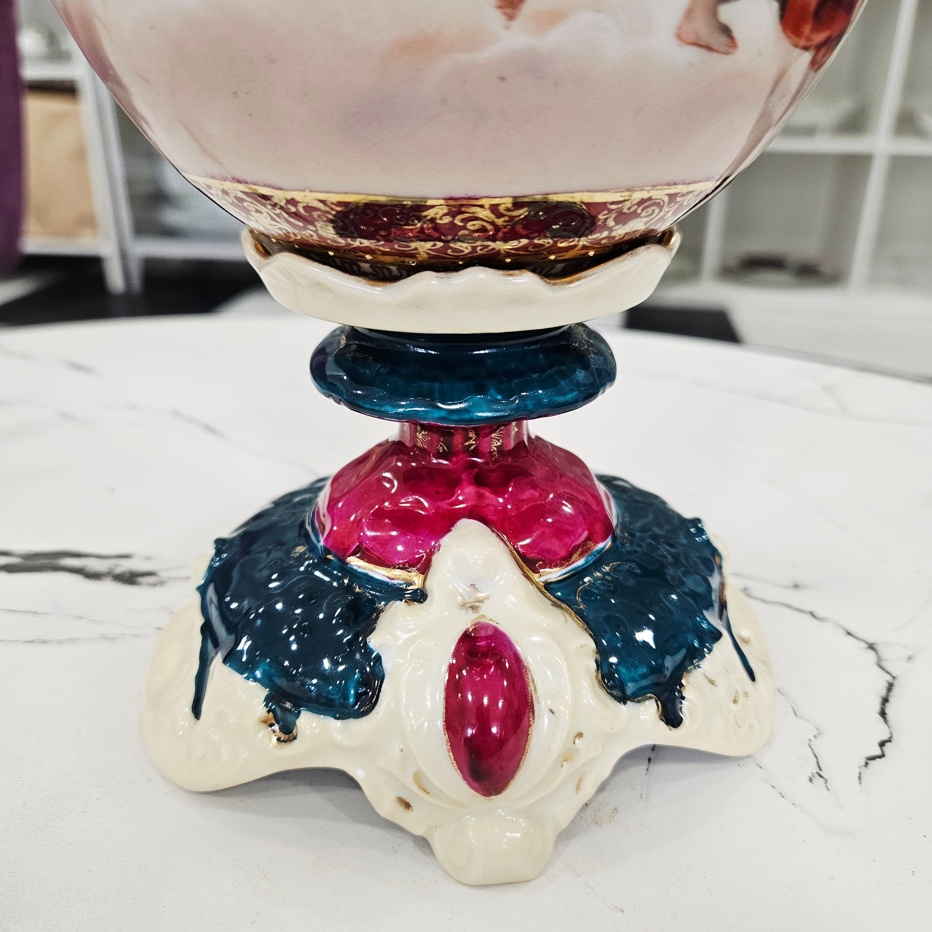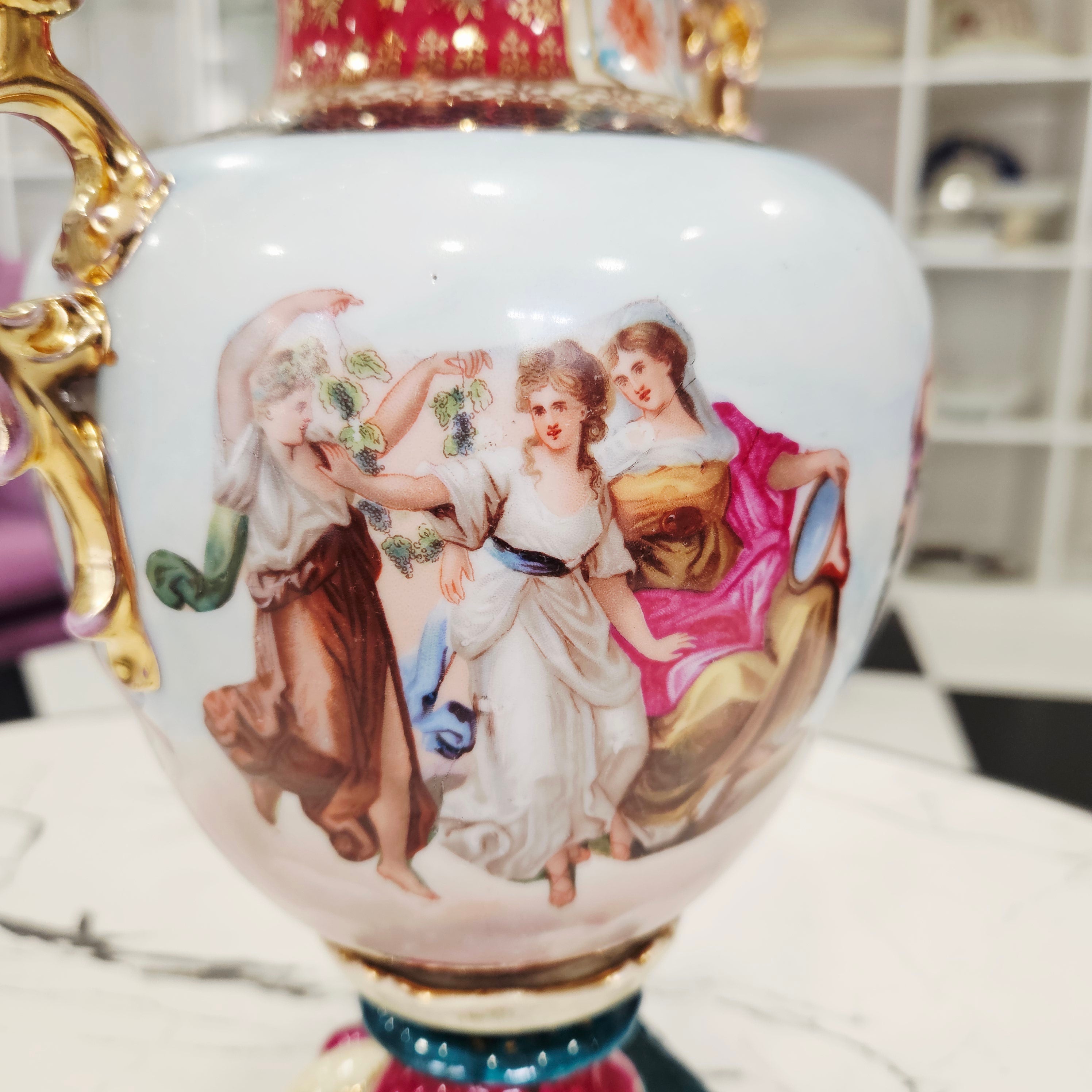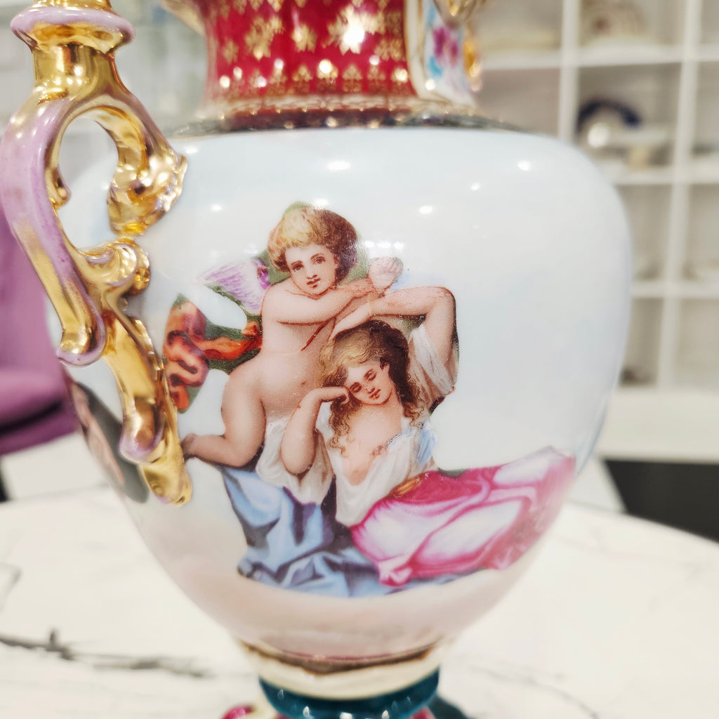 Įspūdinga Augarten amforos formos vaza – tai prabanga ir klasinė estetika viename kūrinyje. Ant porceliano korpuso puikuojasi figūrinės scenos kuria antikinės mitologijos ir romantiškų motyvų nuotaiką, o aukštos, ažūrinės, įmantrios formos rankenos suteikia dar daugiau puošnumo ir teatrališkumo. Vaza dekoruota ryškiais spalviniais akcentais bei gausia aukso dekoracija, kuri pabrėžia manufaktūros meistrystę ir išskirtinį detalumą. Dalinai montuotas pagrindas su kontrastingais tonais – papildomas dekoratyvinis elementas, pakeliantis visą kompoziciją į kolekcinio meno lygį.
