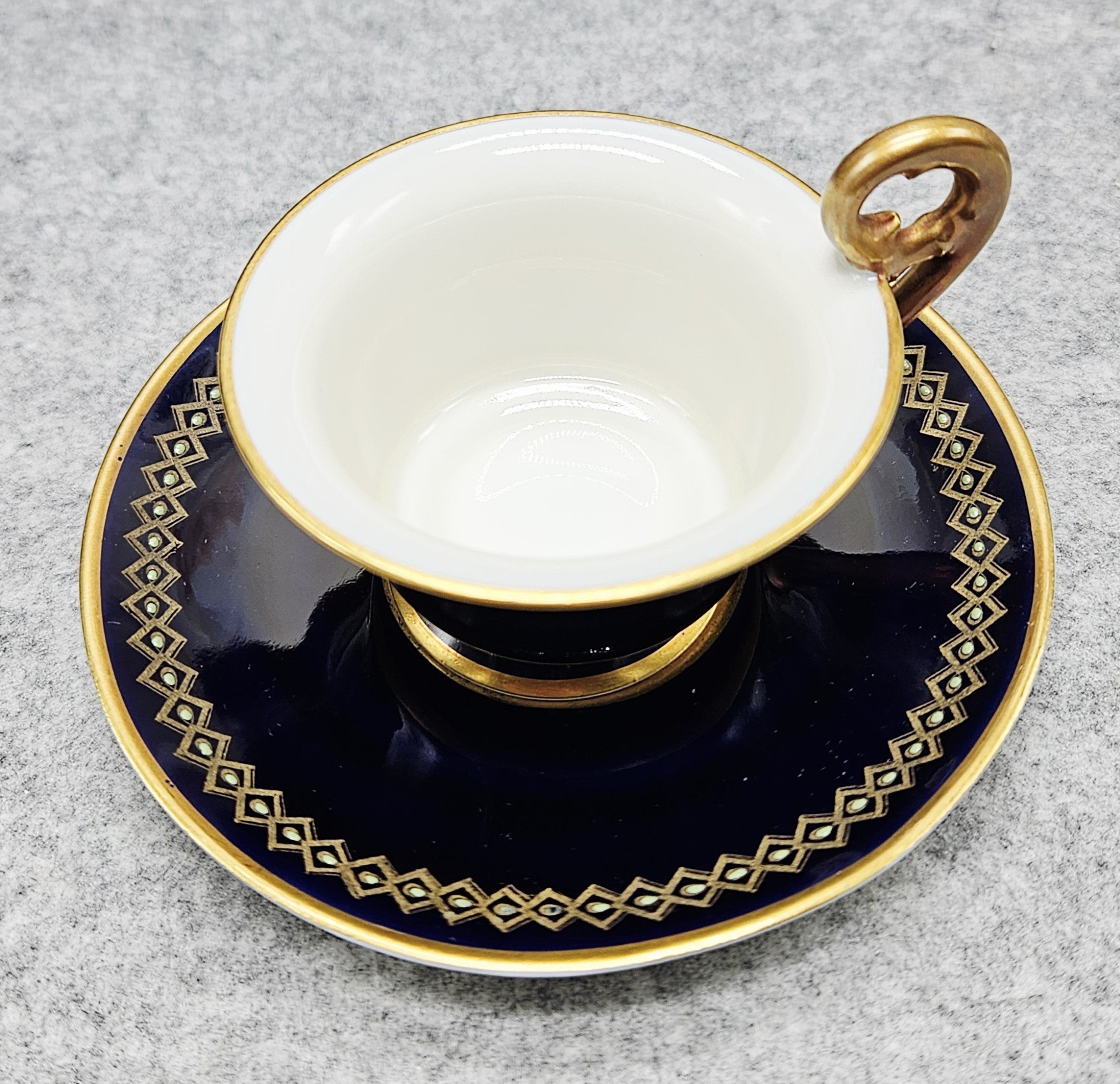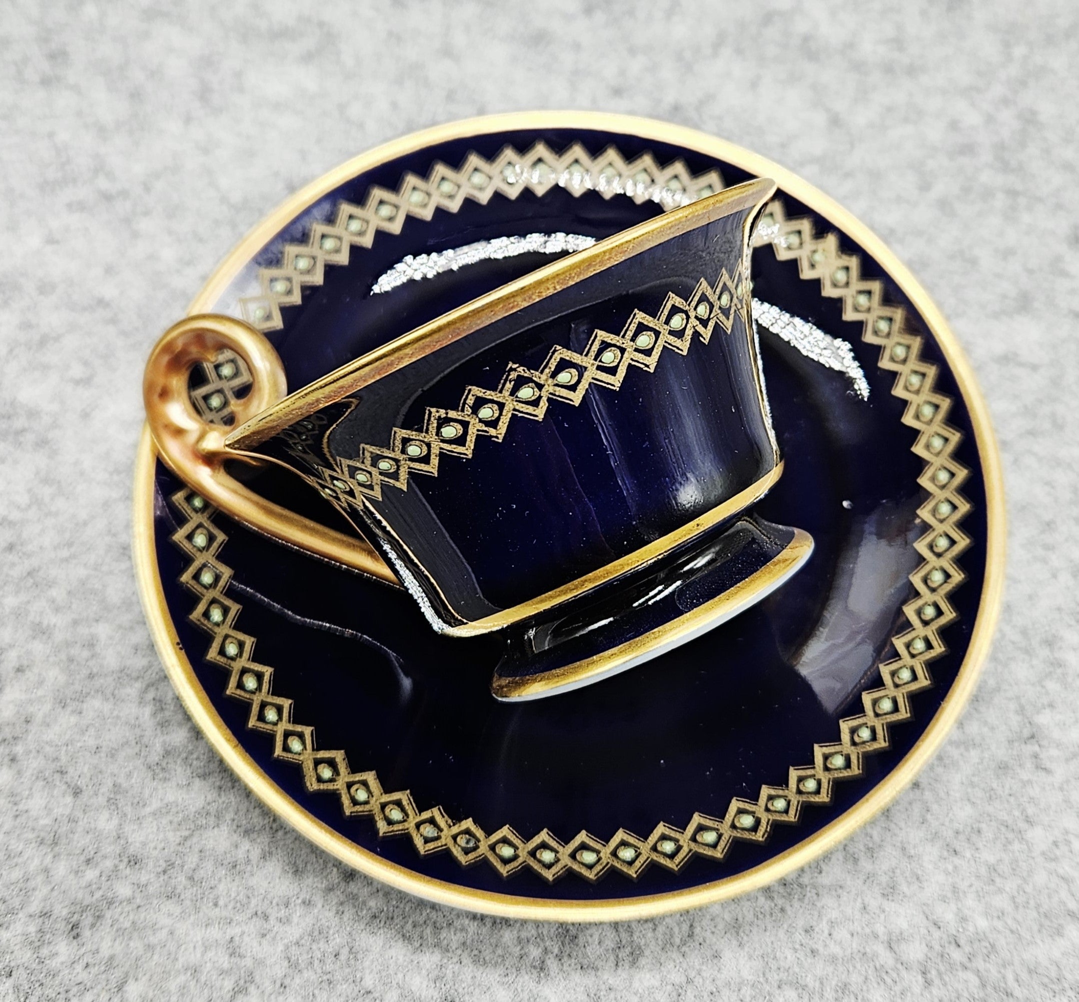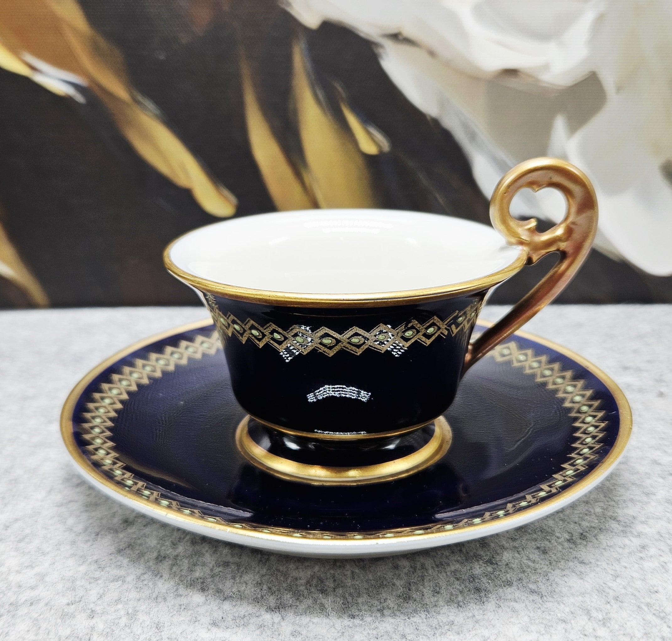 Išskirtinio dizaino Heinrich Baensch in Lettin porceliano puodelis su lėkštute, dekoruotas sodria kobalto mėlyna glazūra ir subtiliu auksiniu geometriniu ornamentu. Spalvų derinys suteikia rinkiniui ypatingo gylio, prabangos ir rafinuotumo įspūdį.