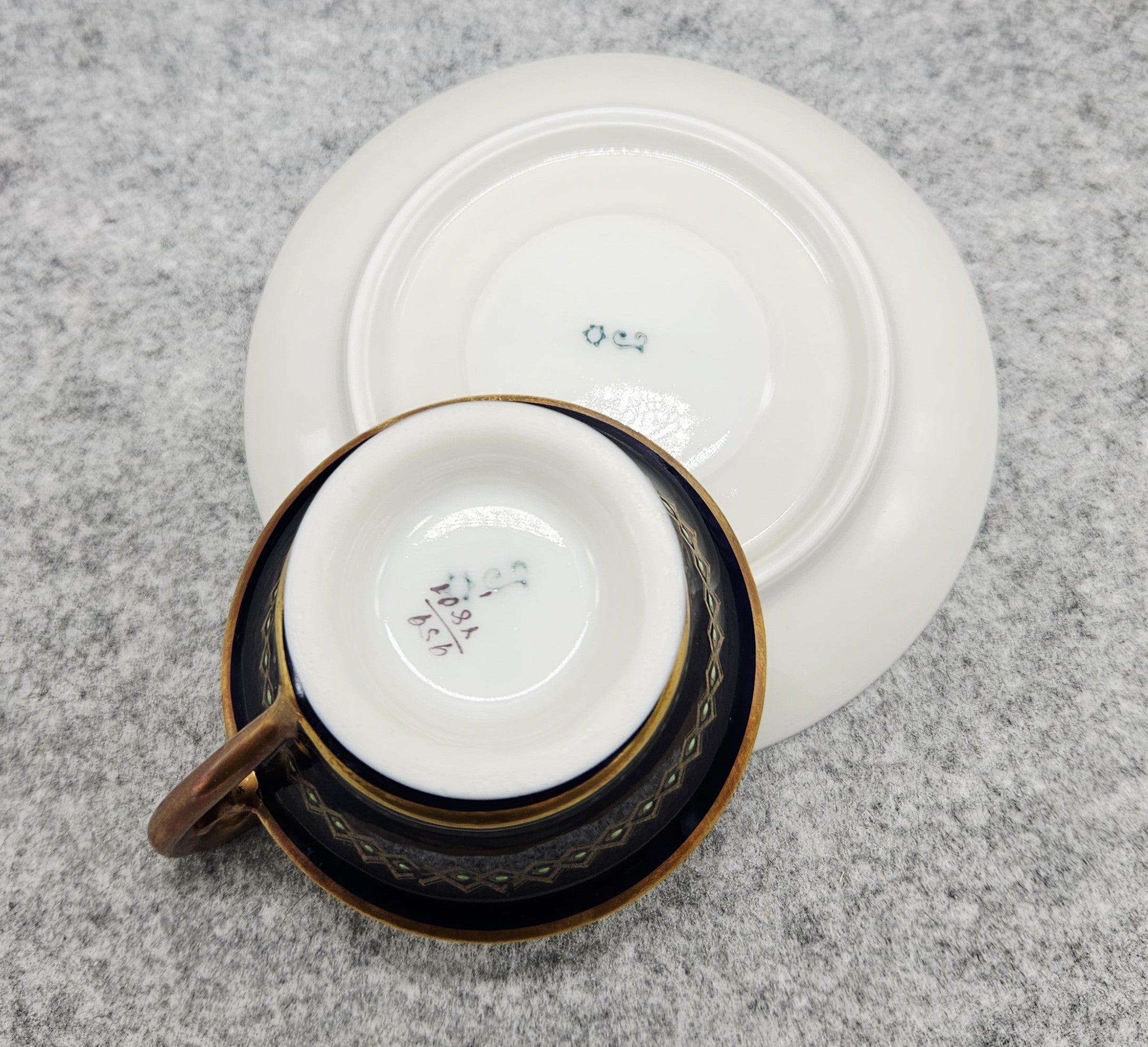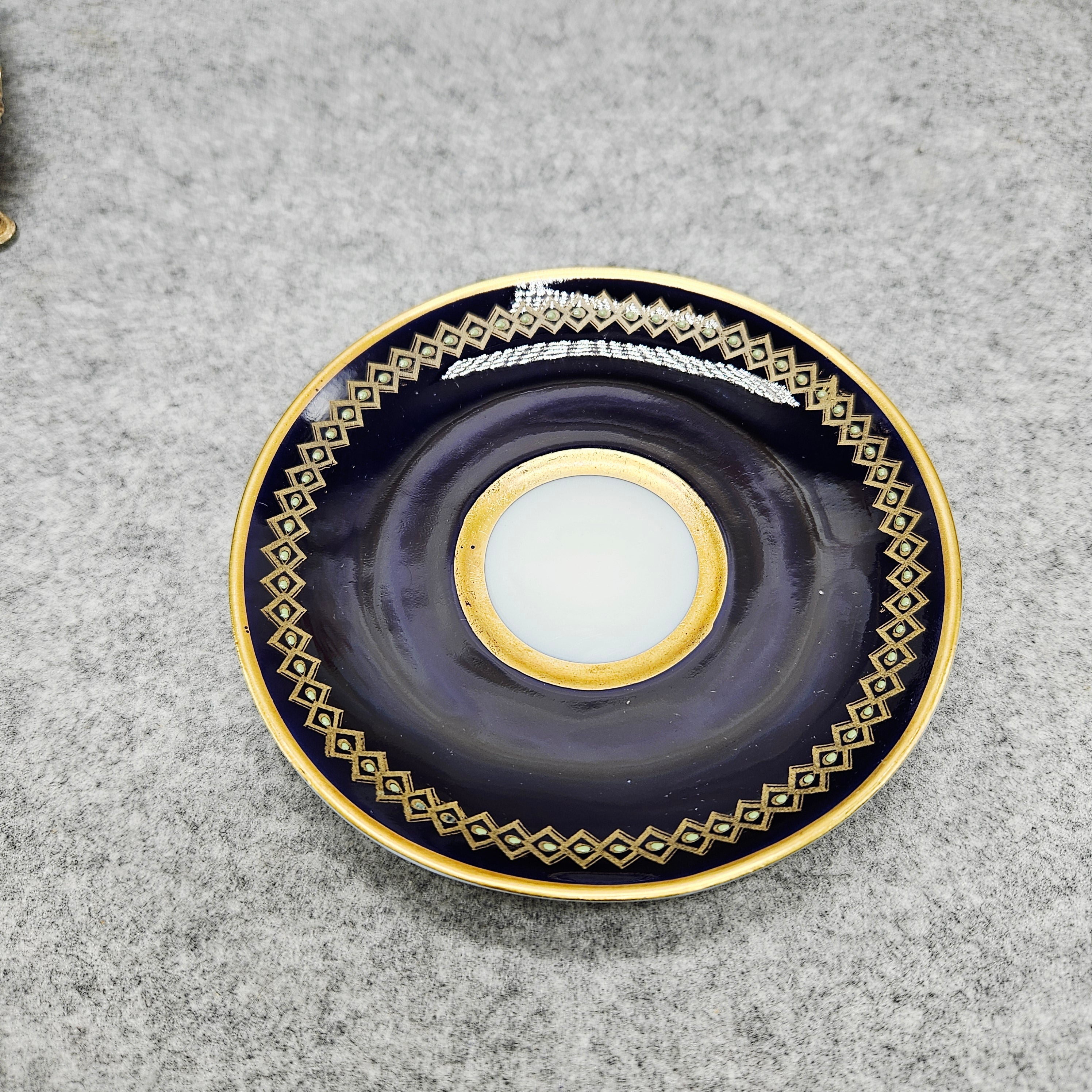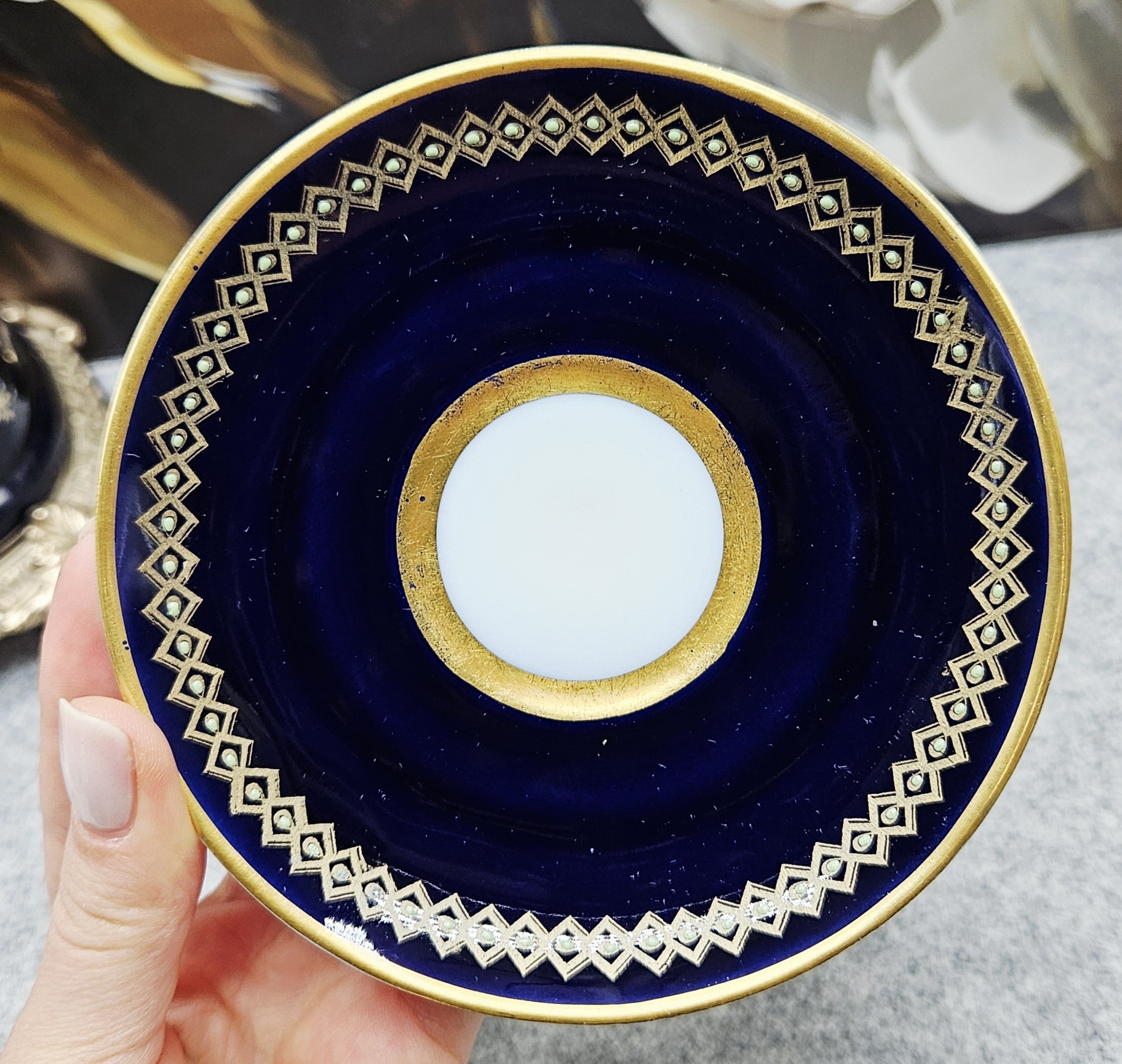 Išskirtinio dizaino Heinrich Baensch in Lettin porceliano puodelis su lėkštute, dekoruotas sodria kobalto mėlyna glazūra ir subtiliu auksiniu geometriniu ornamentu. Spalvų derinys suteikia rinkiniui ypatingo gylio, prabangos ir rafinuotumo įspūdį.
