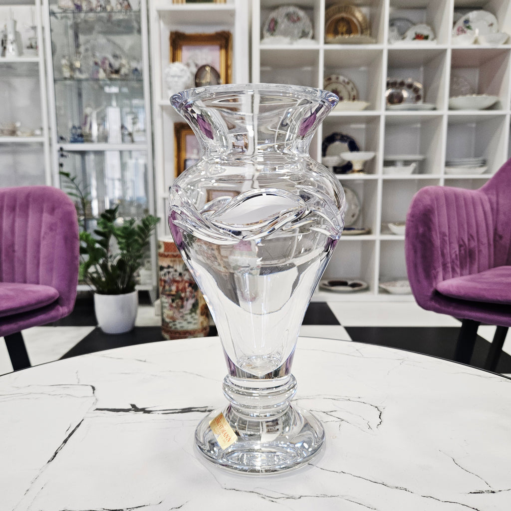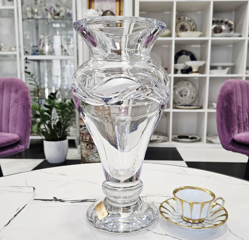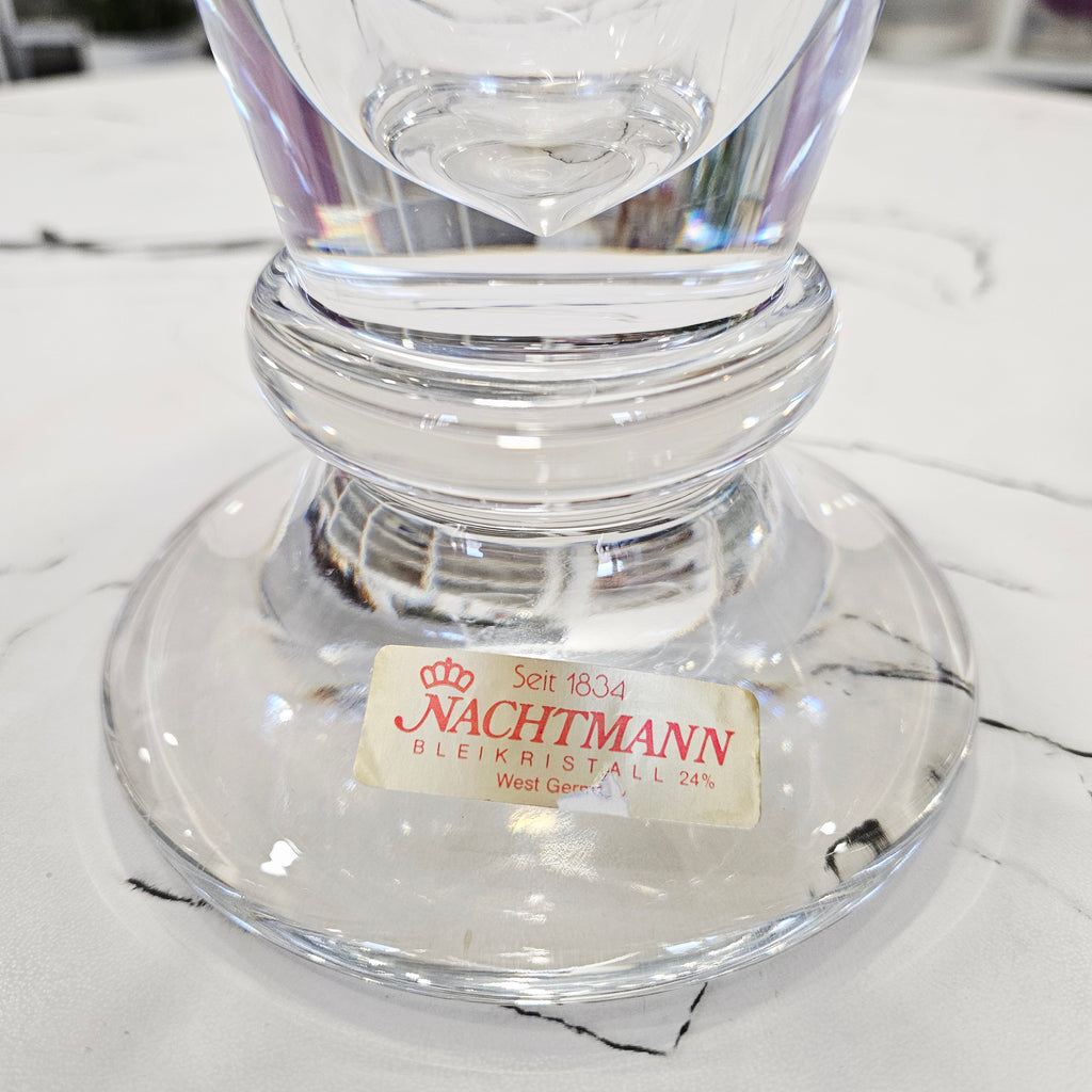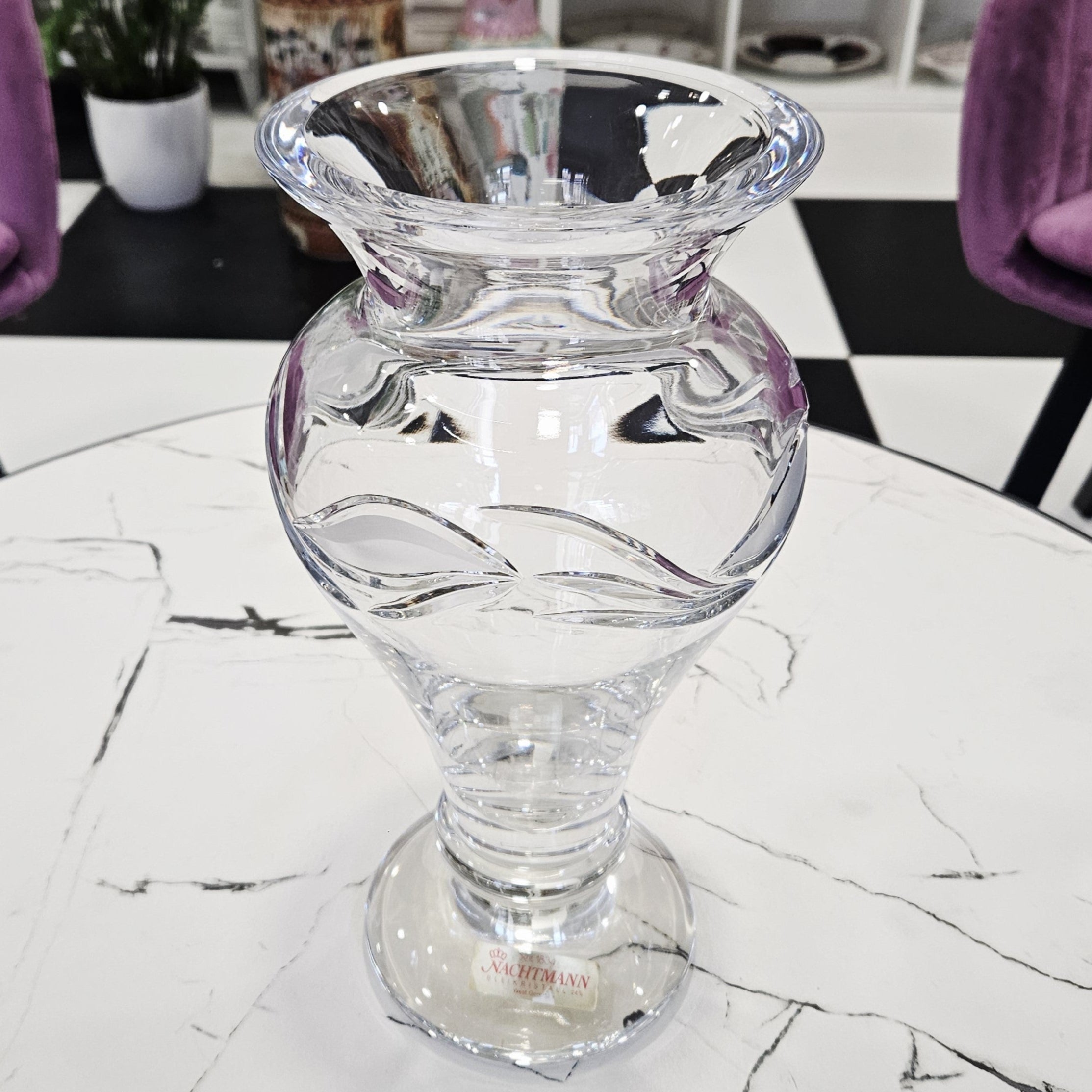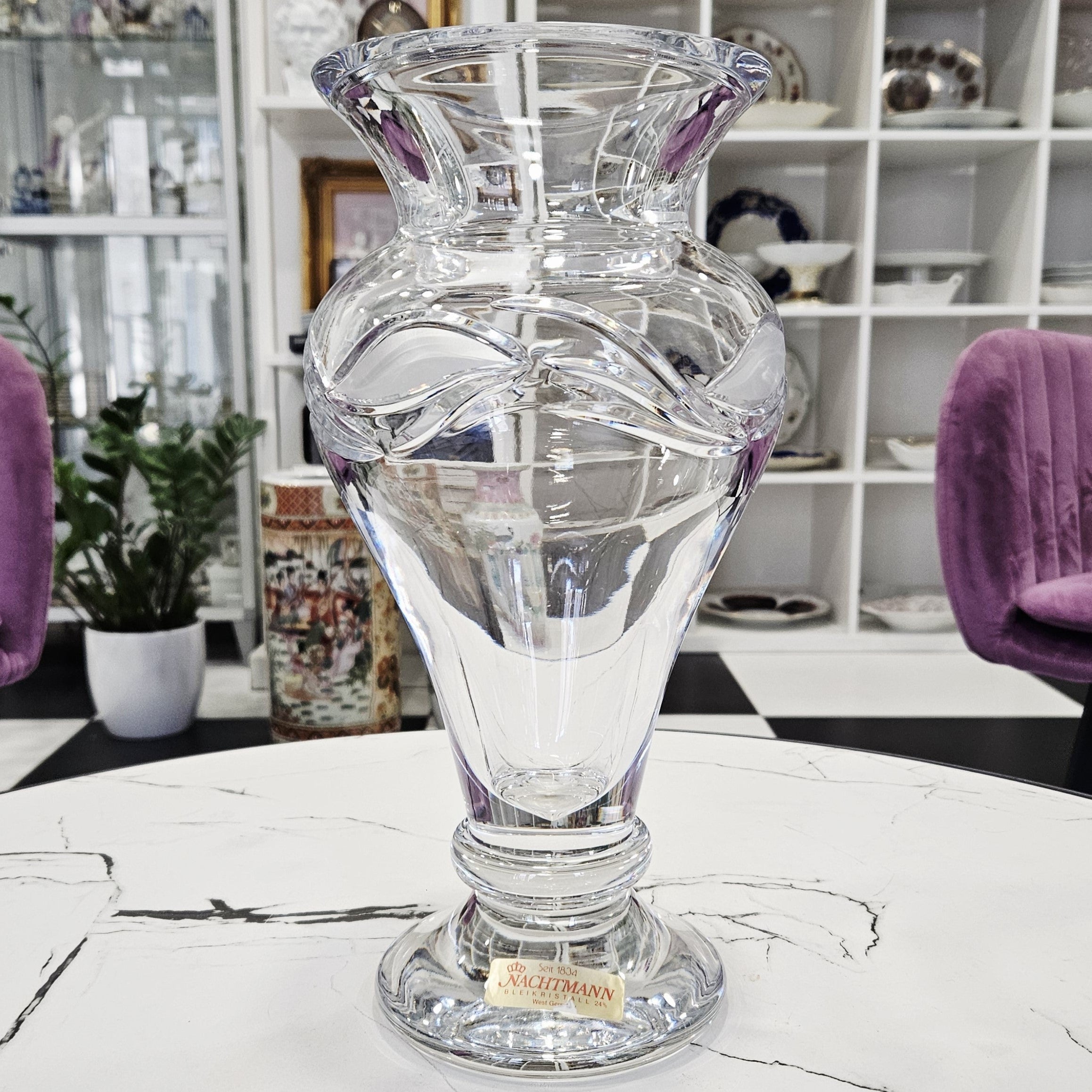 Elegantiška „Nachtmann“ krištolinė vaza, pagaminta iš 24 % švino krištolo („Bleikristall“). Vaza pasižymi išraiškinga, skaidria forma su dekoratyvinėmis reljefinėmis linijomis, kurios subtiliai laužia šviesą ir sukuria žvilgančius atspindžius.