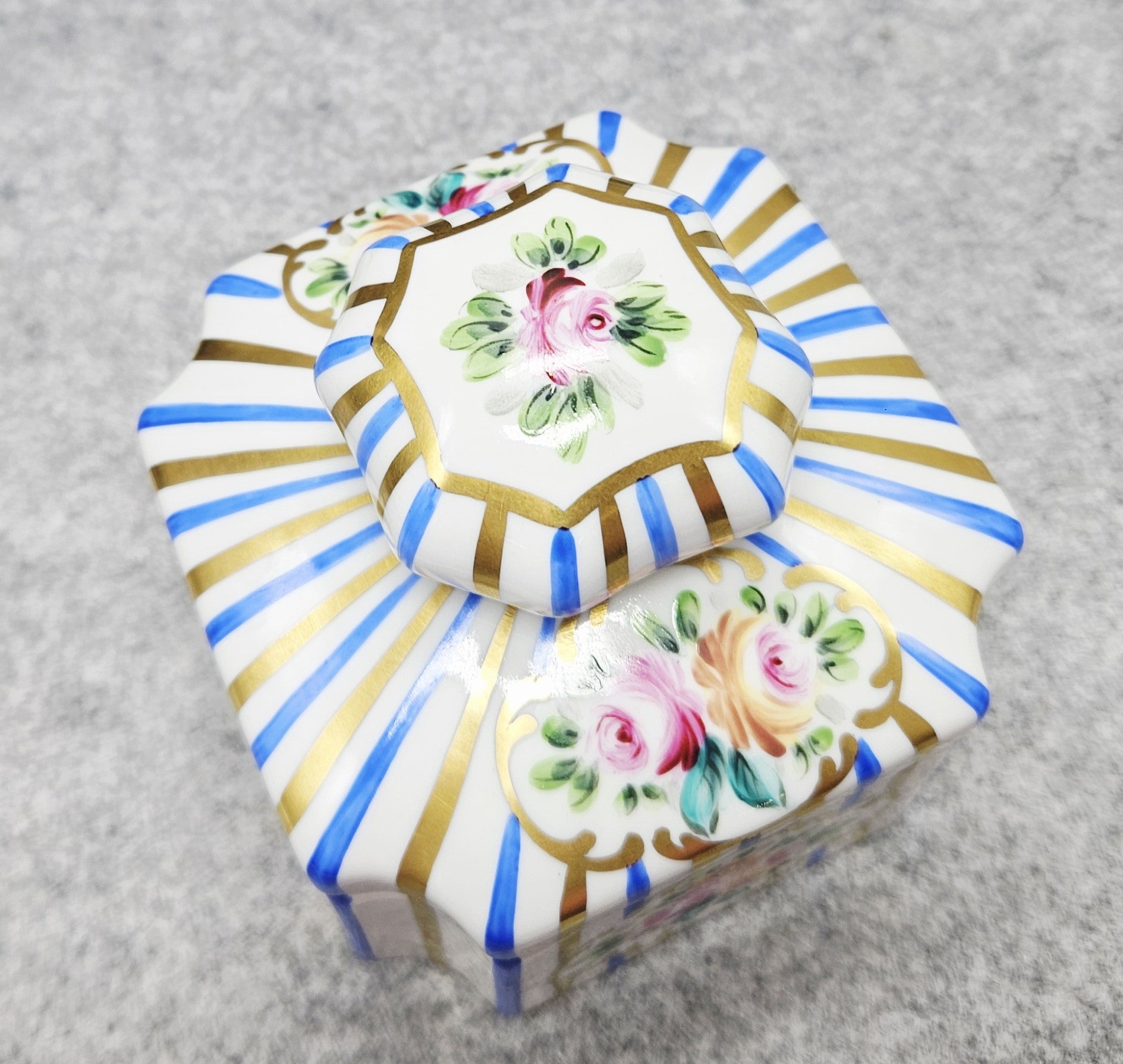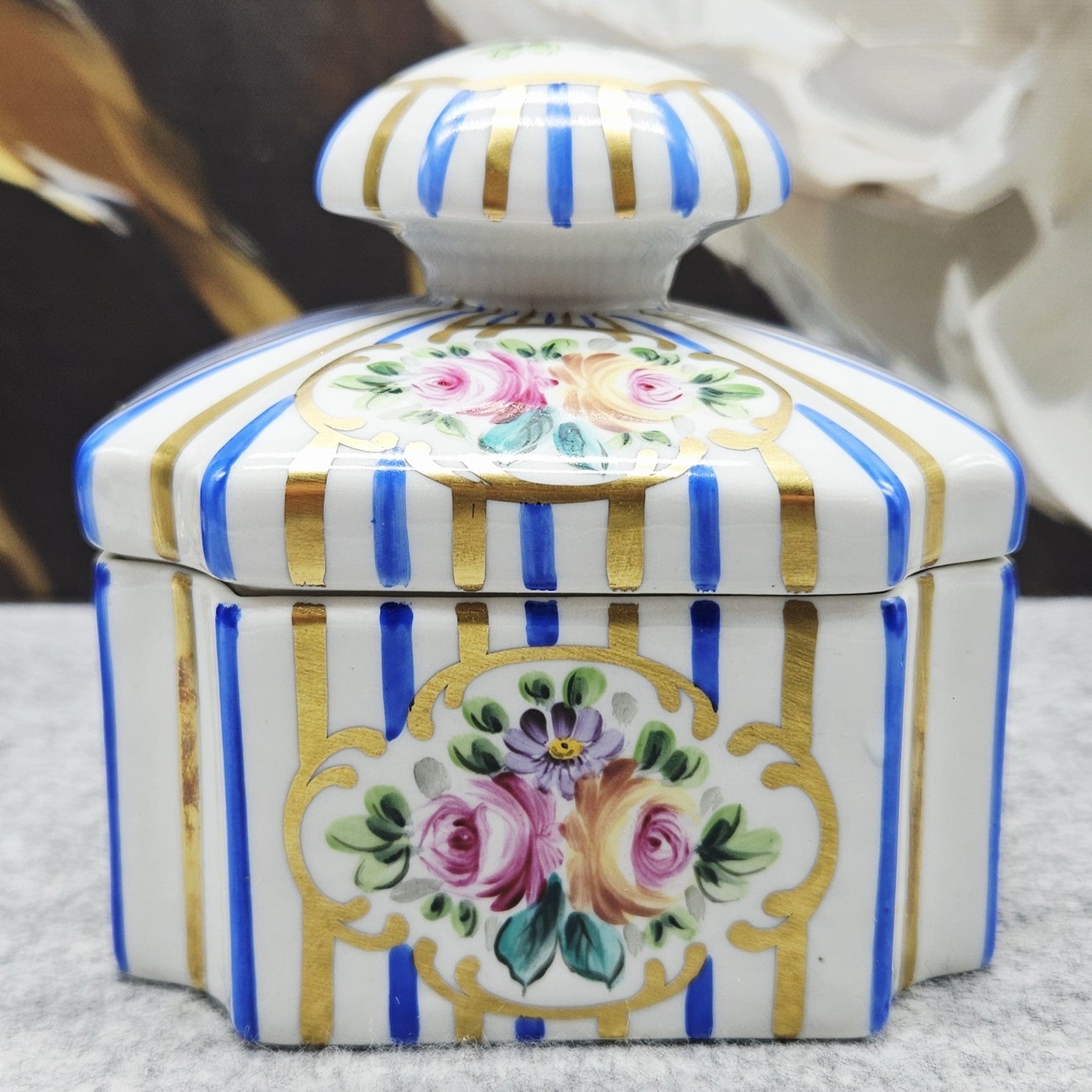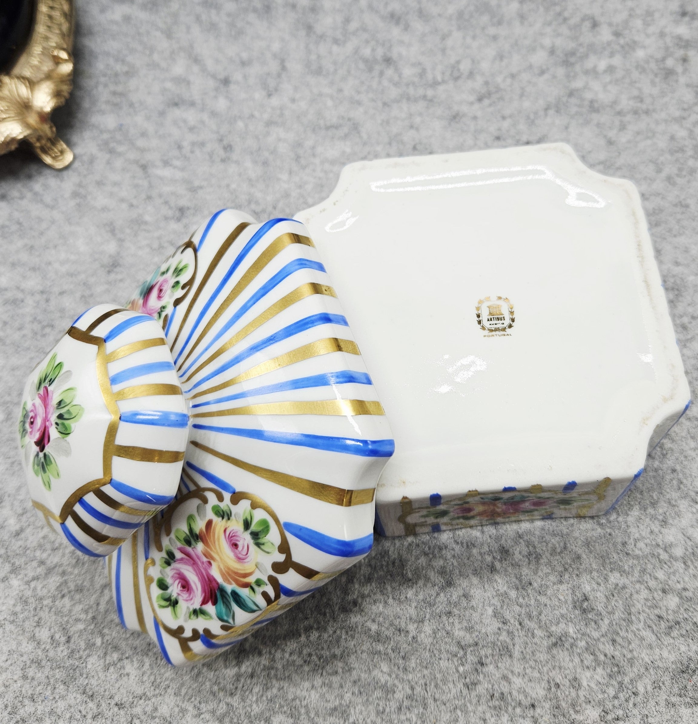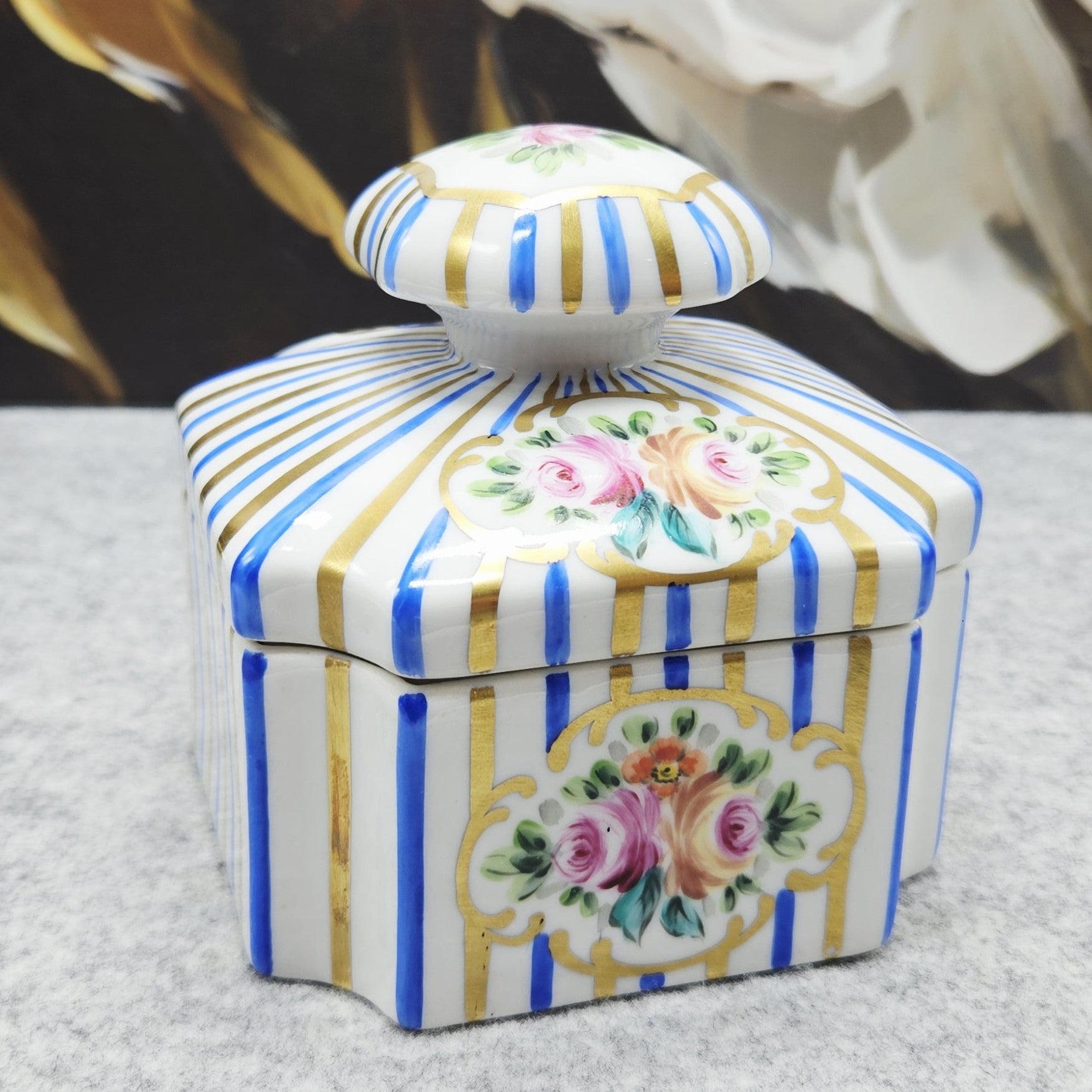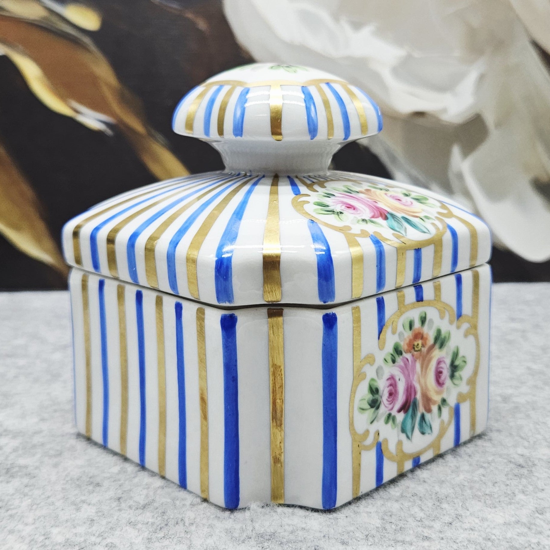Dėžutę puošia rankomis tapyti žiedai, išdėstyti klasikiniuose kartusinės formos ornamentuose, apsupti raiškios tikro kobalto mėlynos ir subtiliai žvilgančių auksinių linijų. Šios spalvos – būdingas Artibus ženklas, pabrėžiantis prabangą ir senovinių Europos porceliano manufaktūrų įtaką.